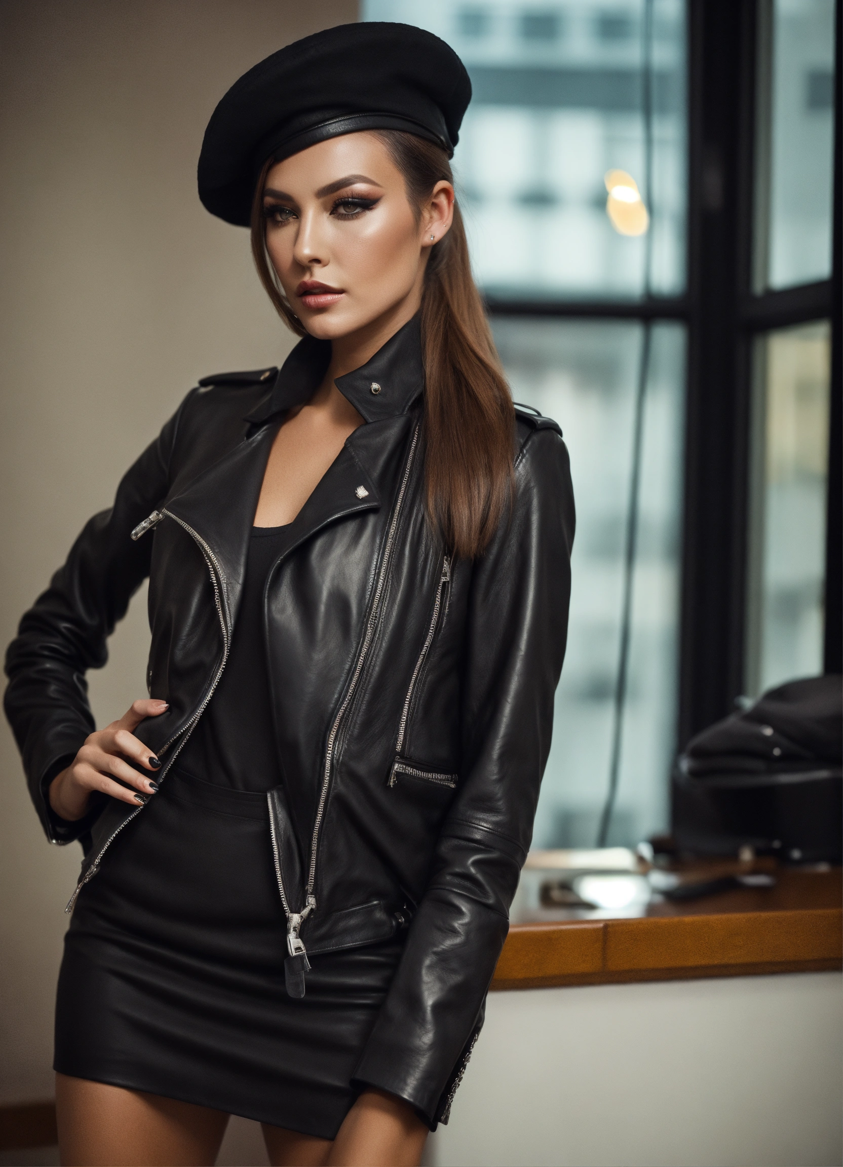 British model, distinctive face, full lips, lela star, wearing business suit, black leather biker jacket and black leather skirt, white office shirt and black necktie, smoky eyes makeup, office room, straight black high ponytail, military leather cap
