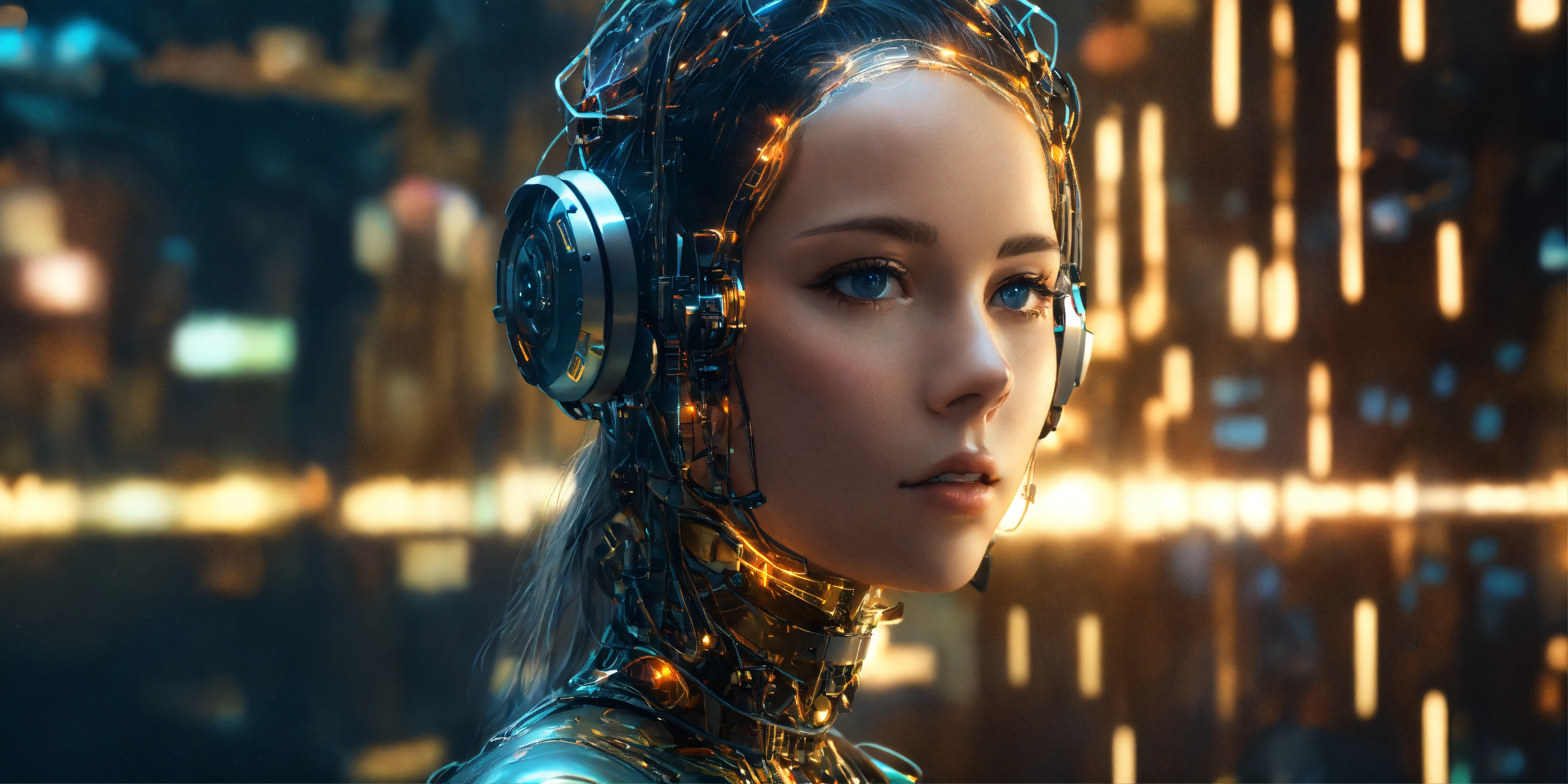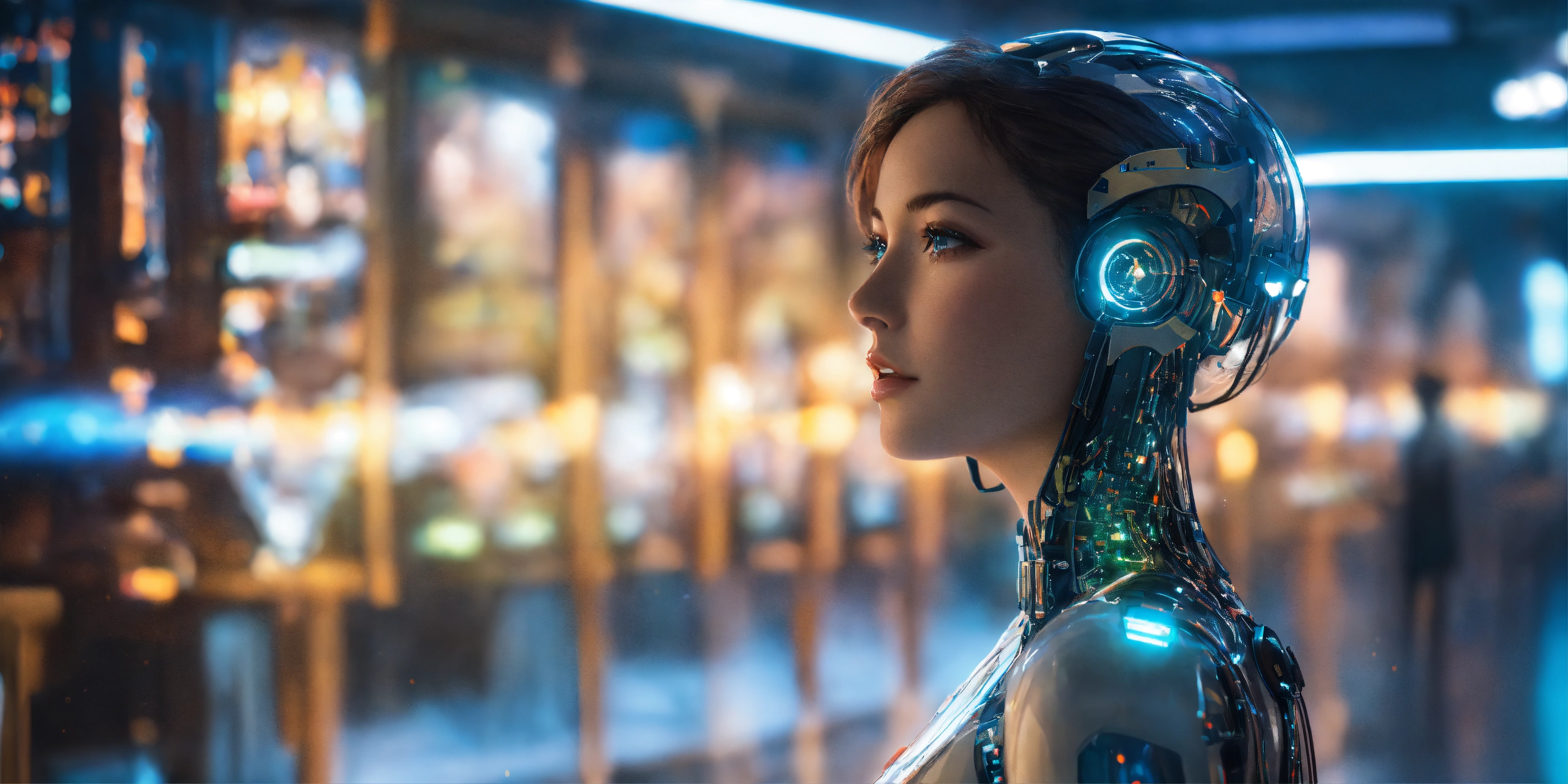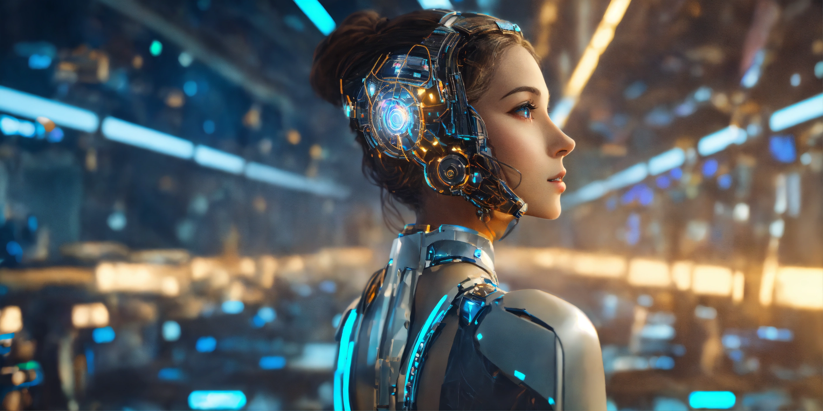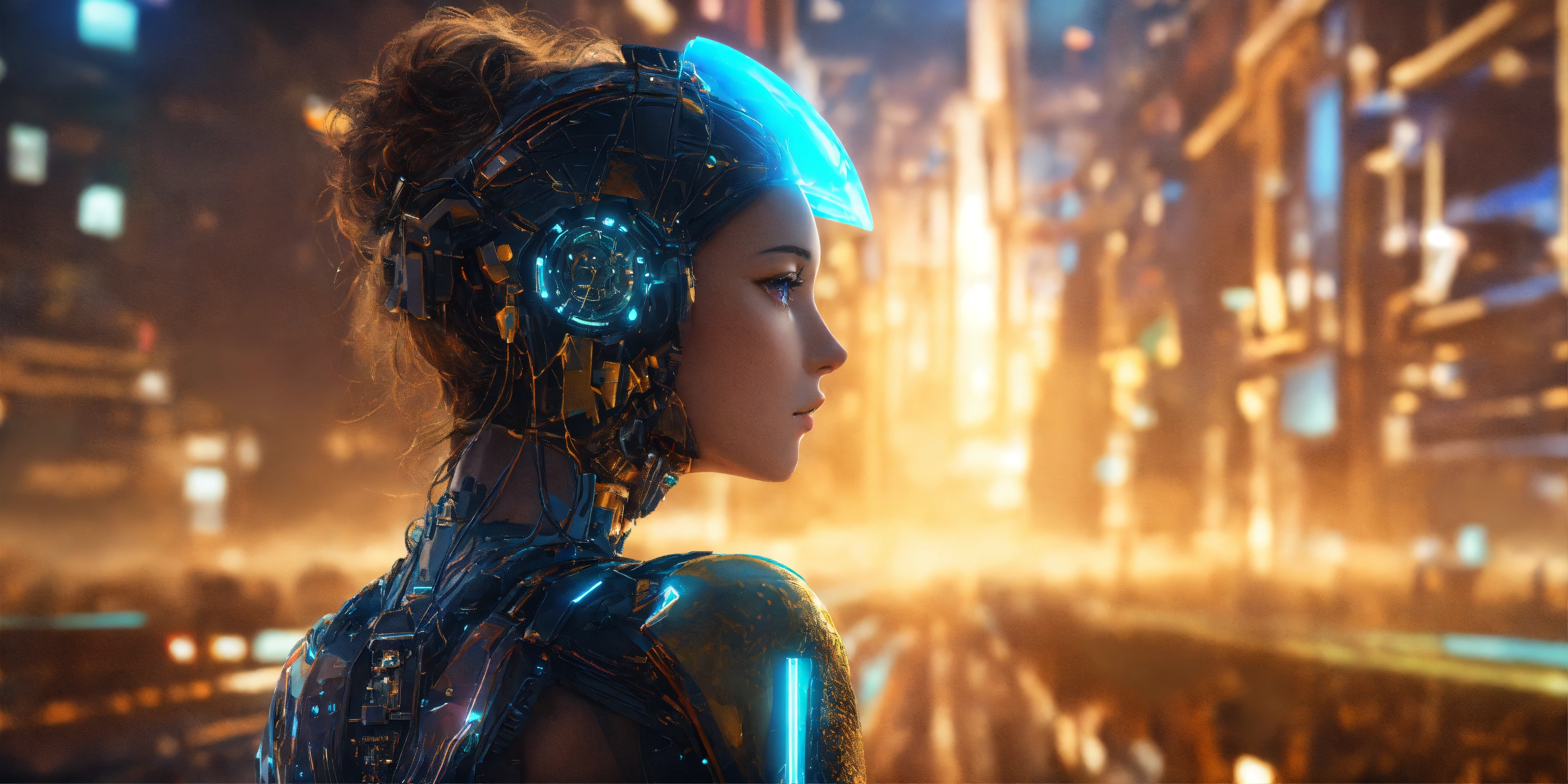 First person perspective point of view from beautiful technologically advanced attractive girl when ai dreams what will humanity look like 4, 000 years from now? beautiful technologically advanced girl with back to us, turned 3/4 gazing into the distant advanced technological future combined singularity, interstellar, god as collective human consciousness, god as singularity in high quality high resolution 4k render, cinematic, atmospheric, vibey, high quality 3d ai art similar to high quality ai art generated by midjourney