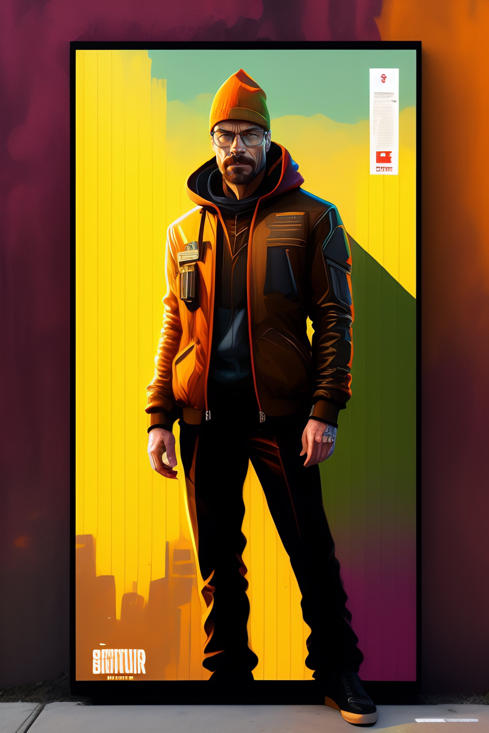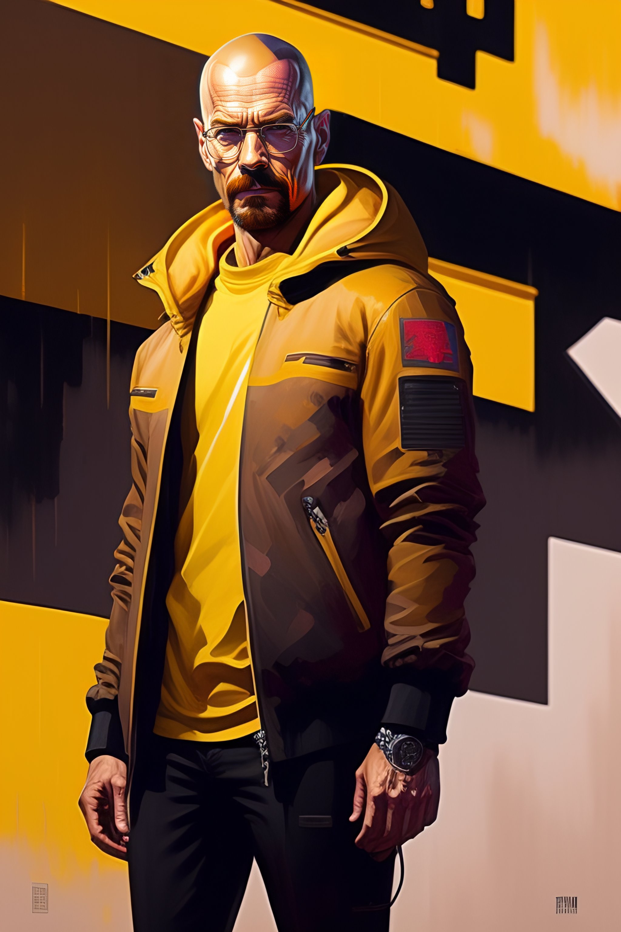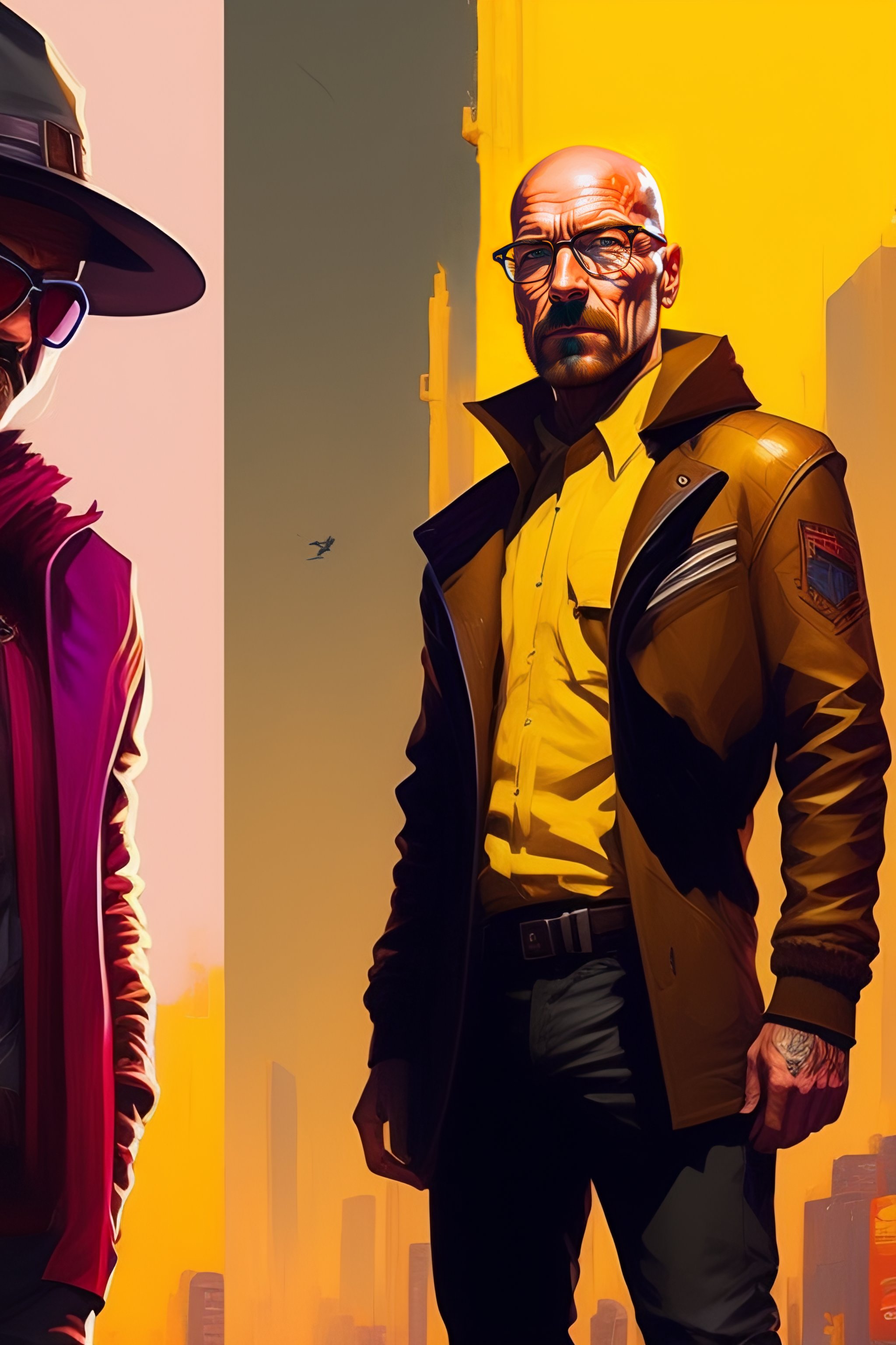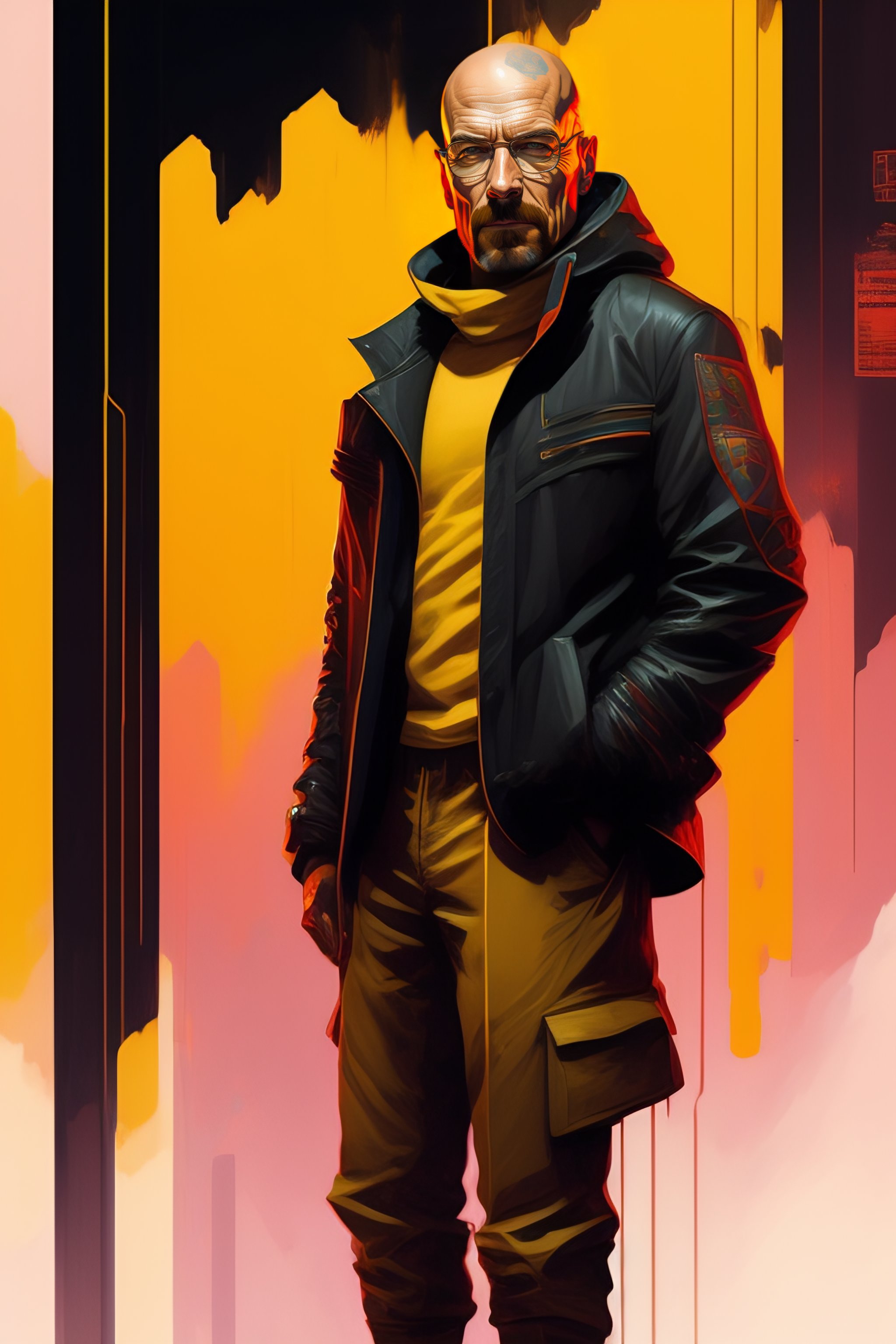 Full body highly detailed portrait of walter white as spiderman, by greg rutkowski, by greg tocchini, by james gilleard, by joe fenton, by kaethe butcher, gradient yellow, black, brown and magenta color scheme, grunge aesthetic!!! graffiti tag wall background