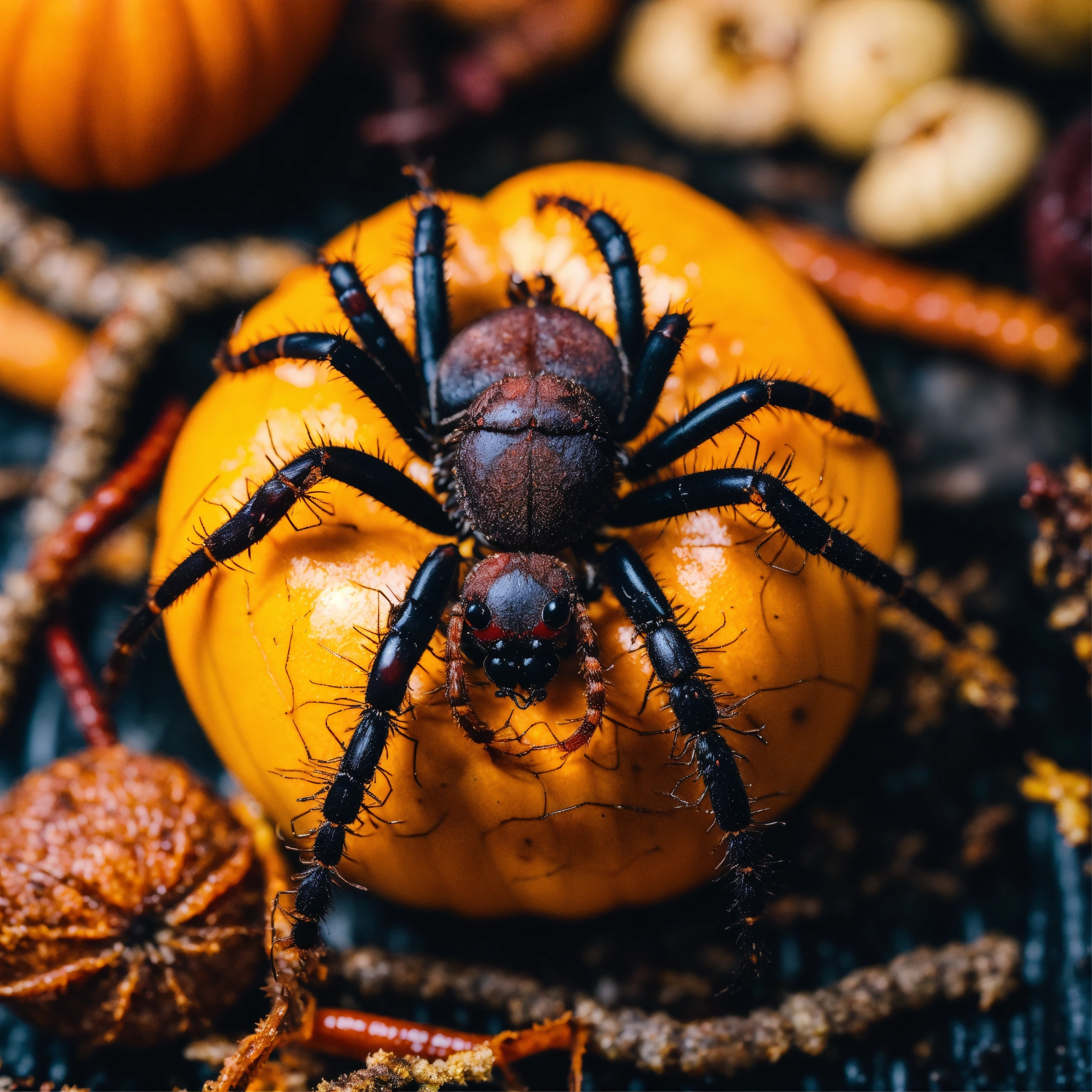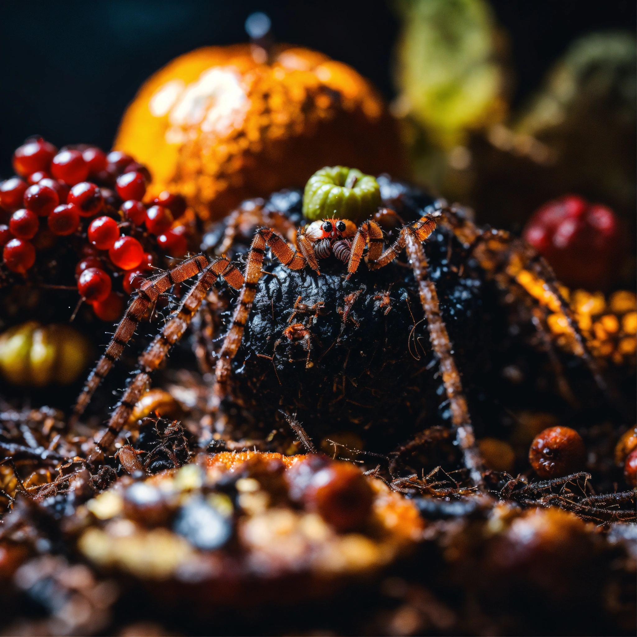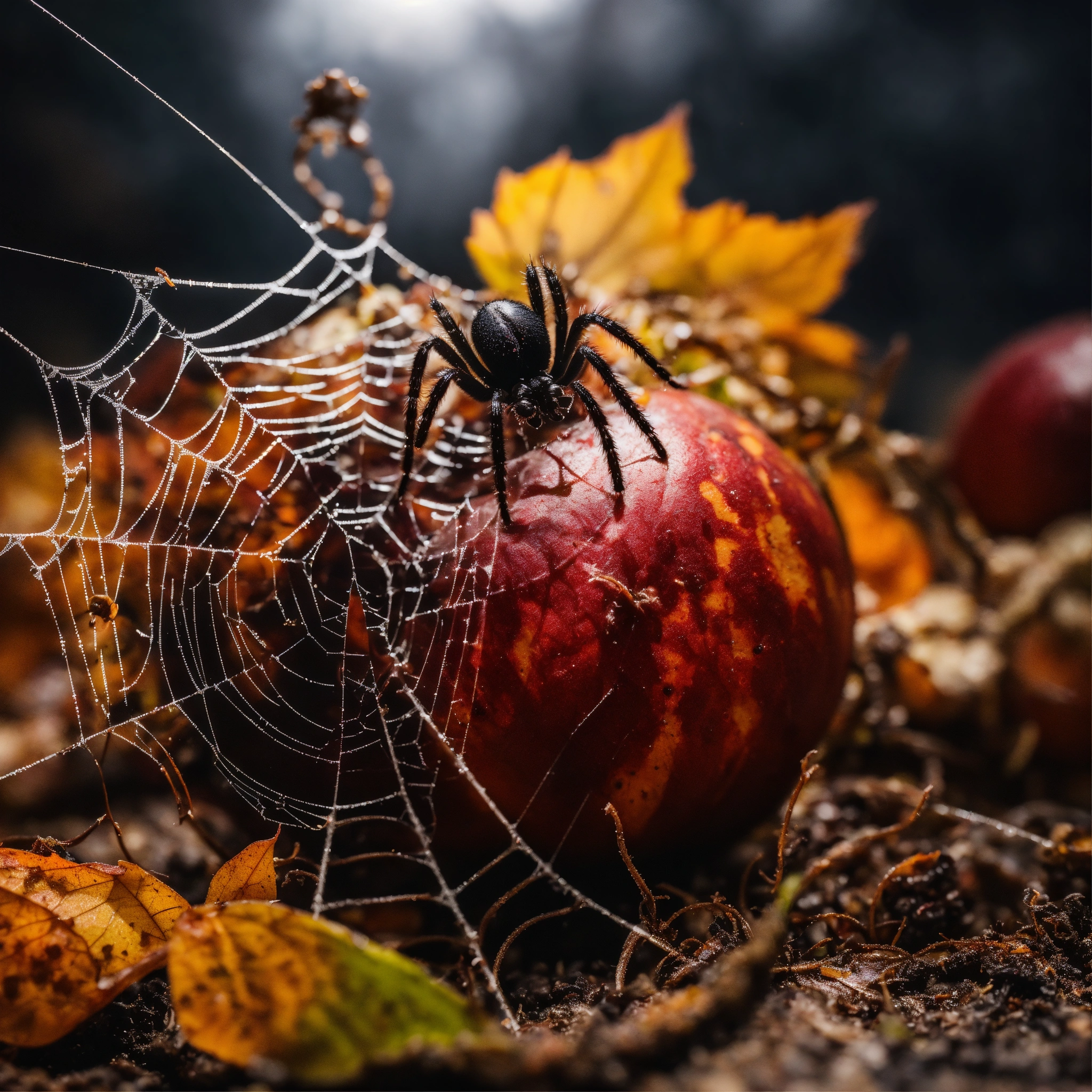 Dark creepy autumn macro photography with spider-web on top of some rotten fruits with worms and centipedes