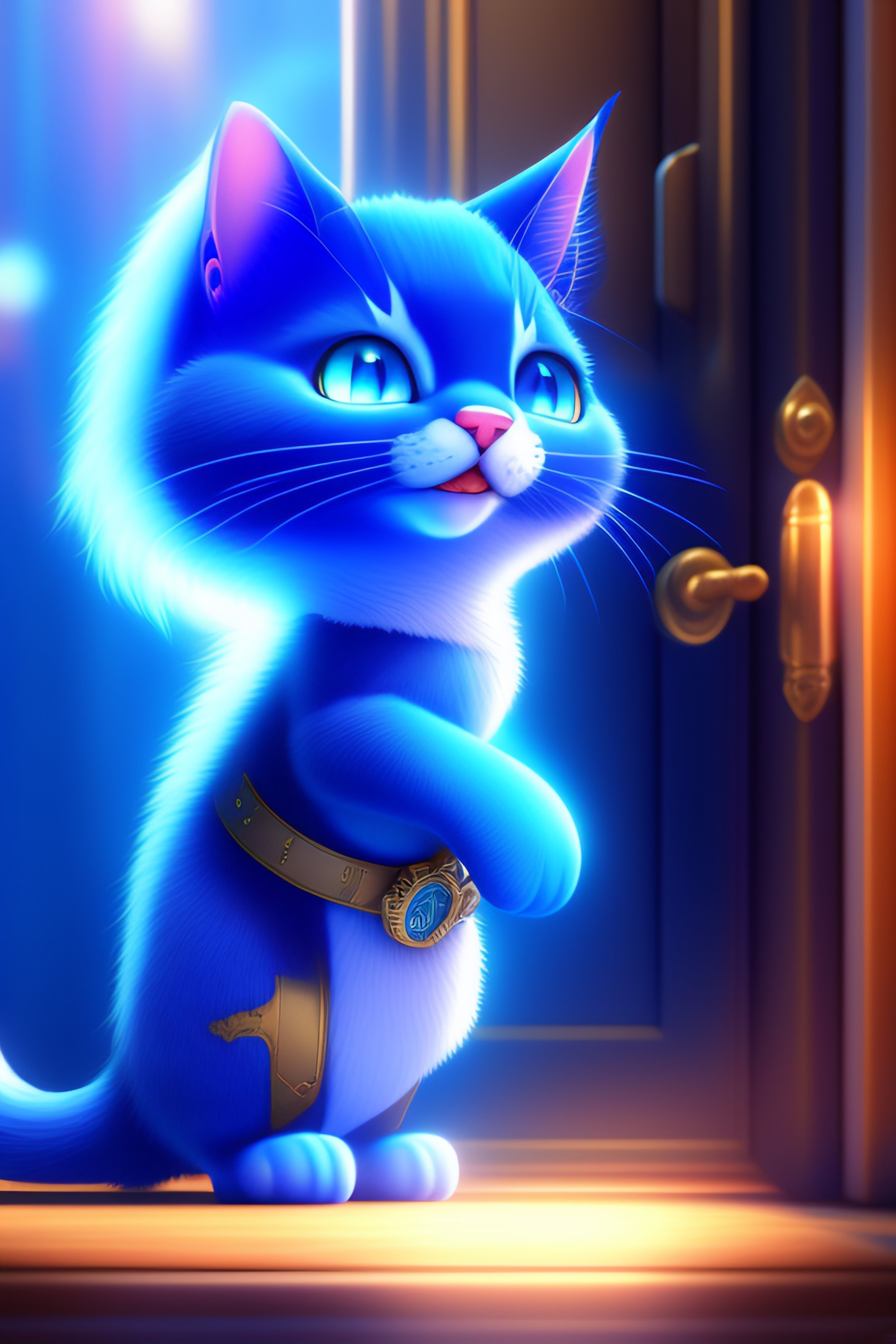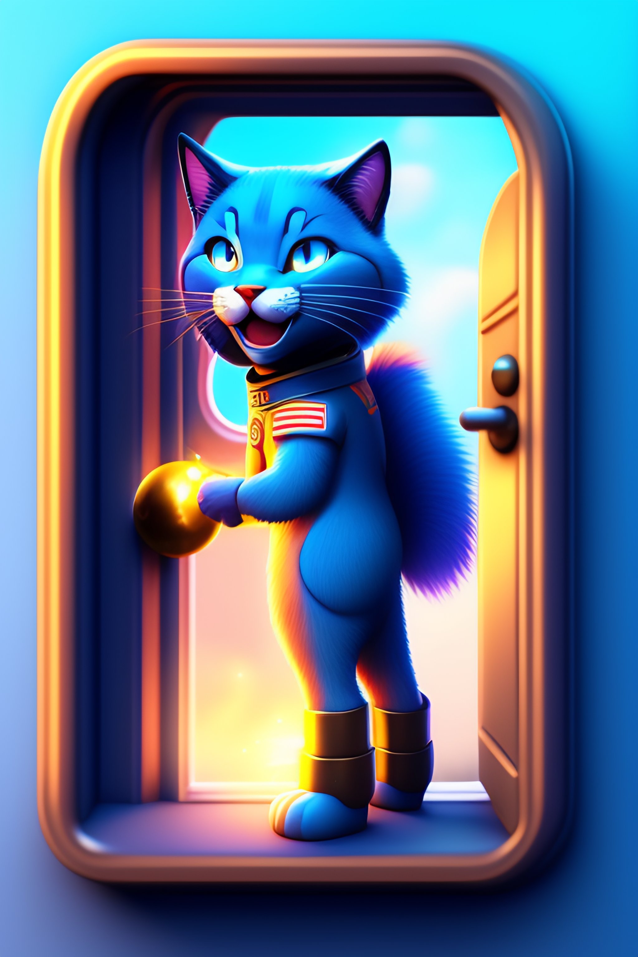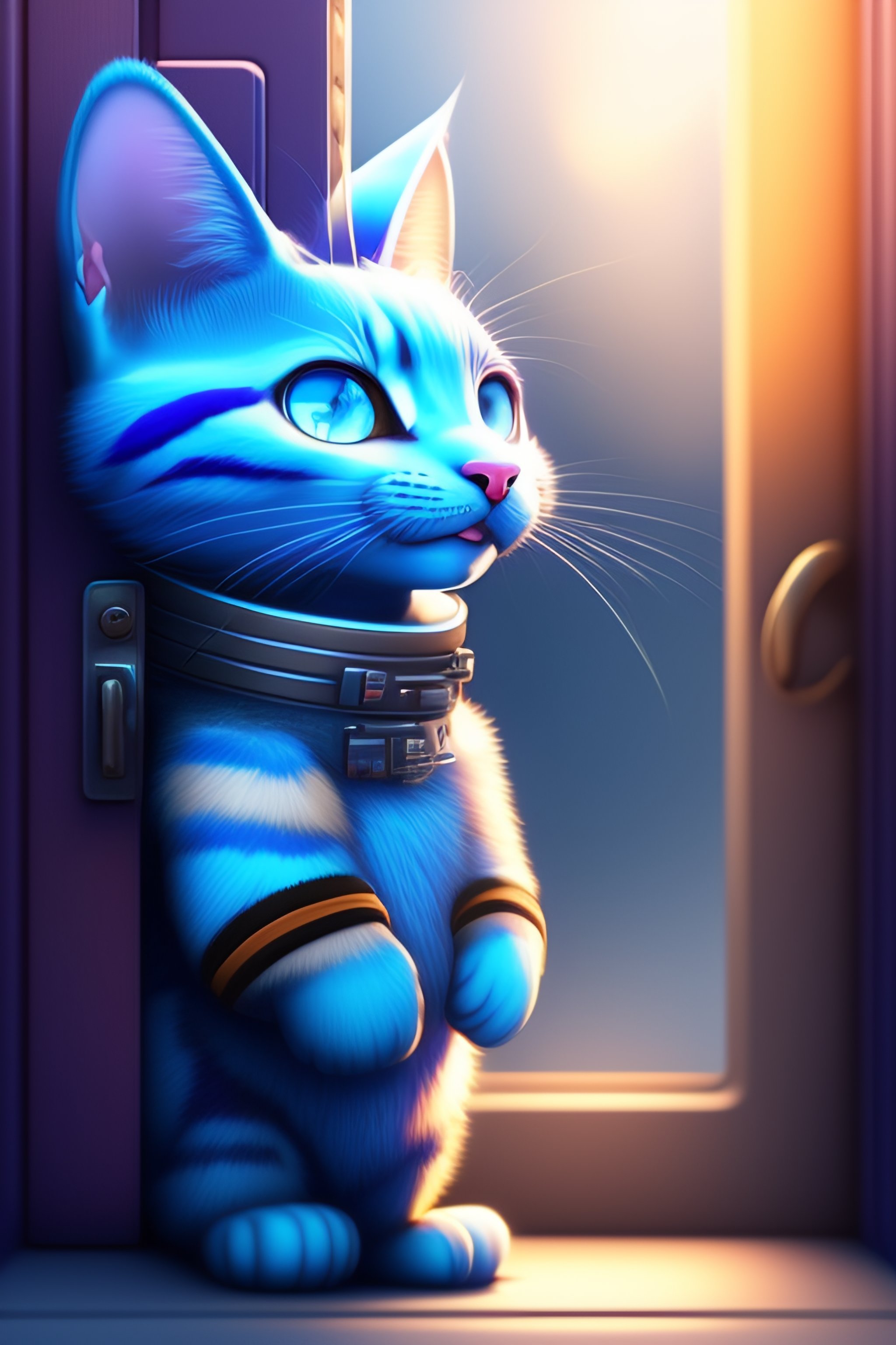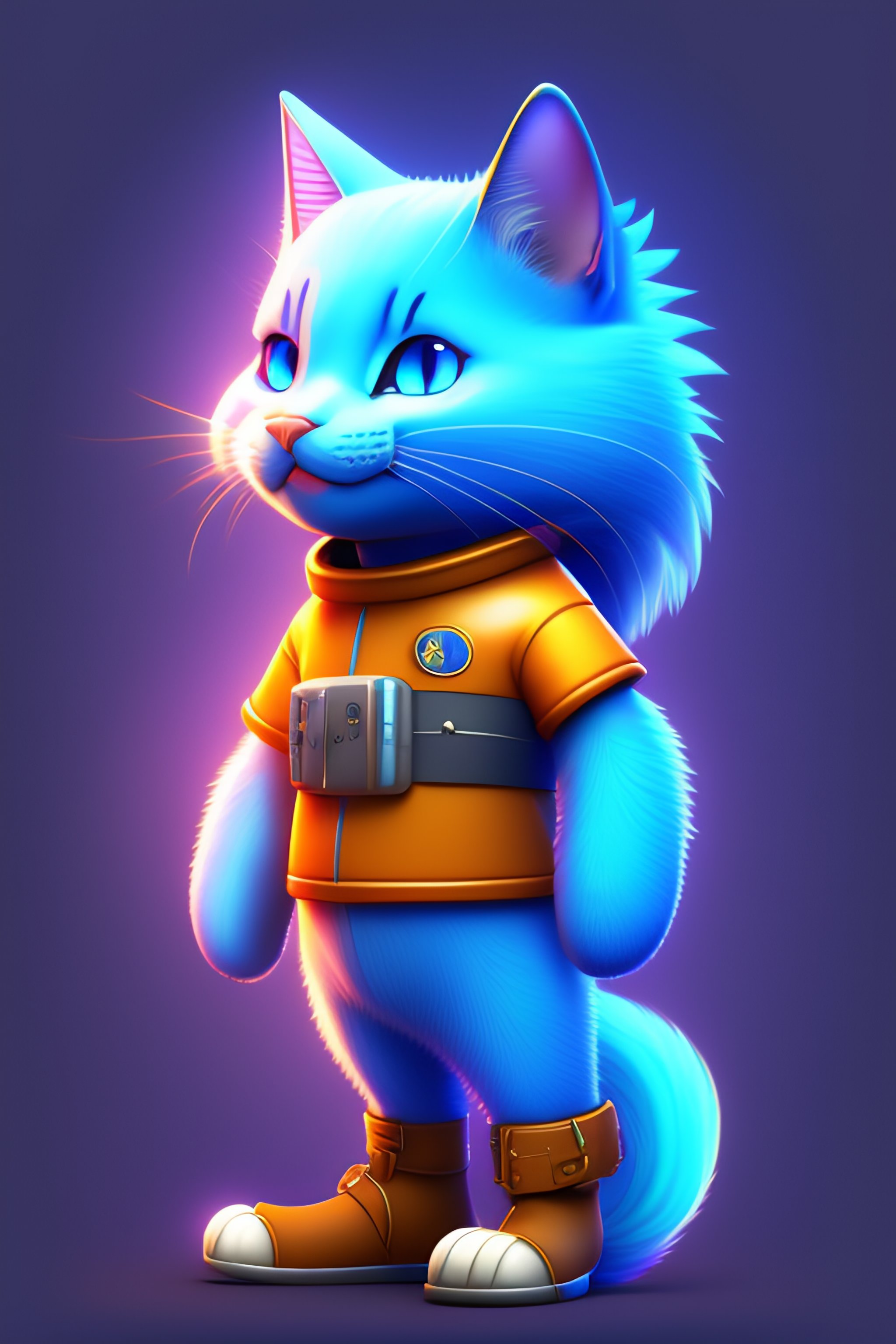 Blue cat, long hair short legs, spirt cartoon style, mor2 cartoon, smile character, an astronaut more like a human bodey, inner lighting, inn door mor cut and simple feature, 2d concept art