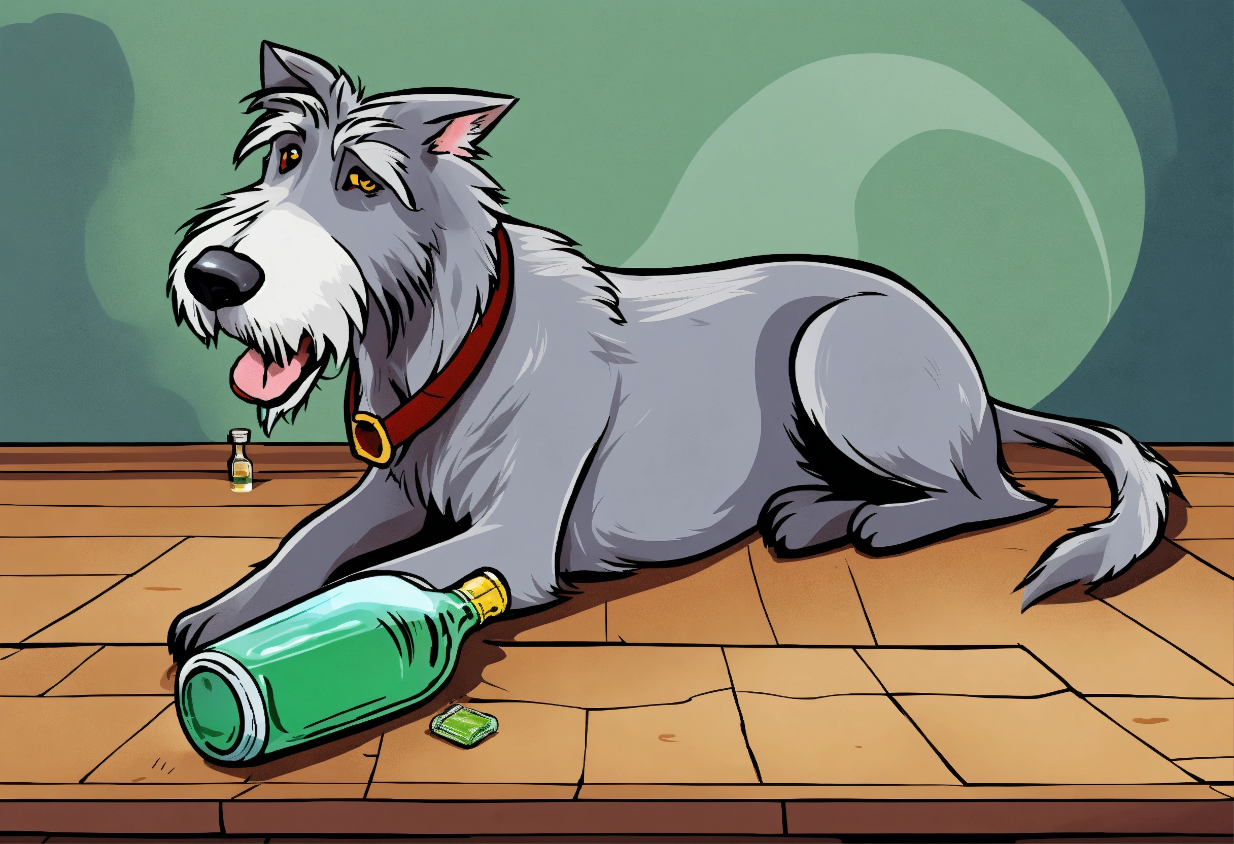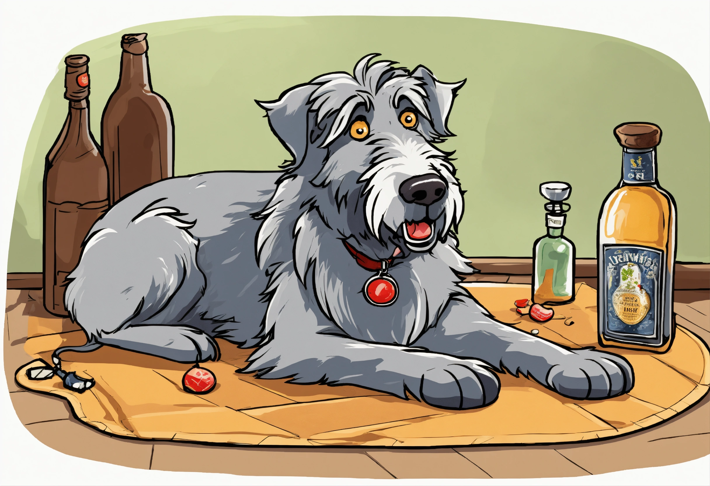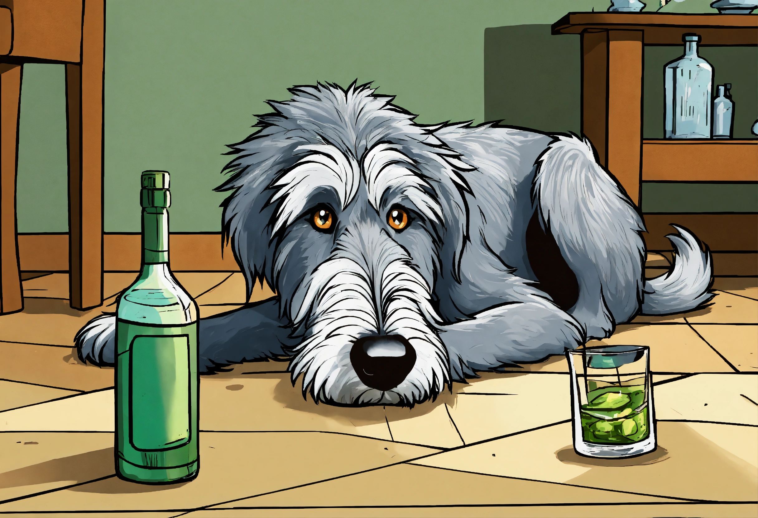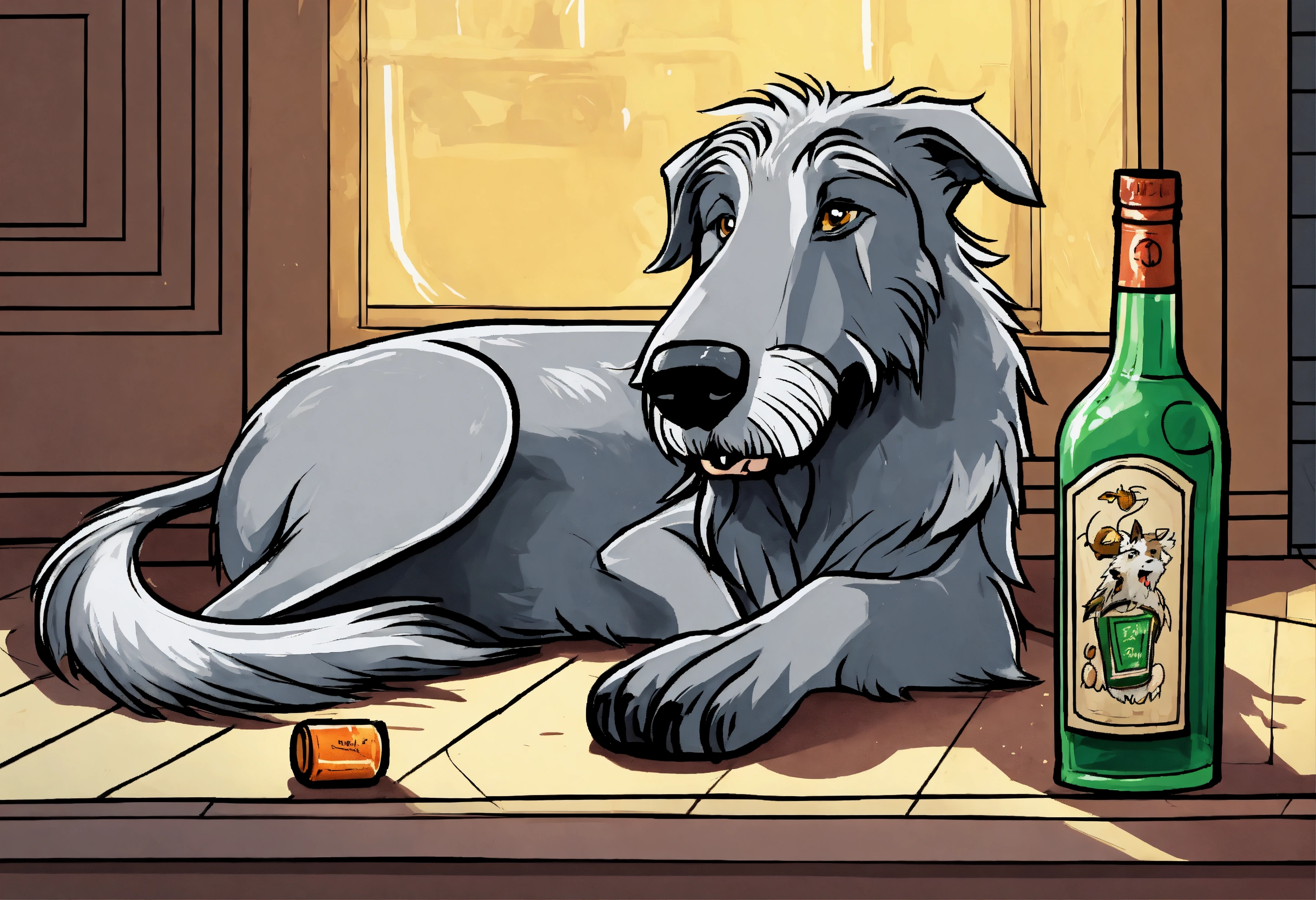 Cartoon style illustration of a drunk grey irish wolfhound lay on floor with bottle of gin beside him, cartoon, fantasy, whimsical