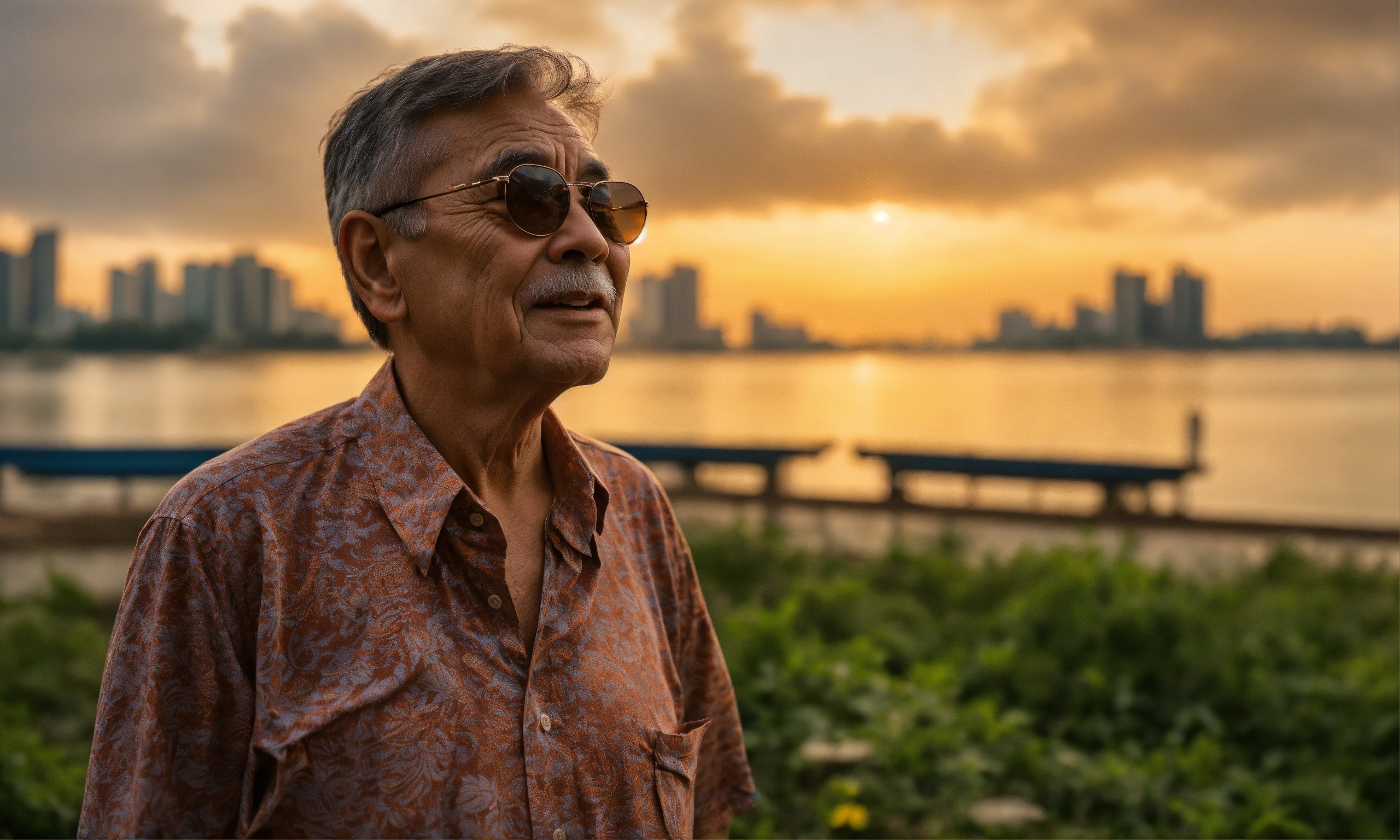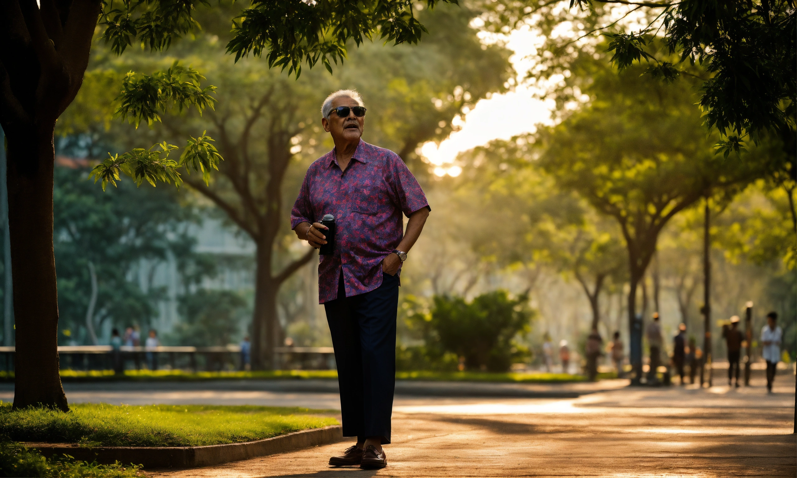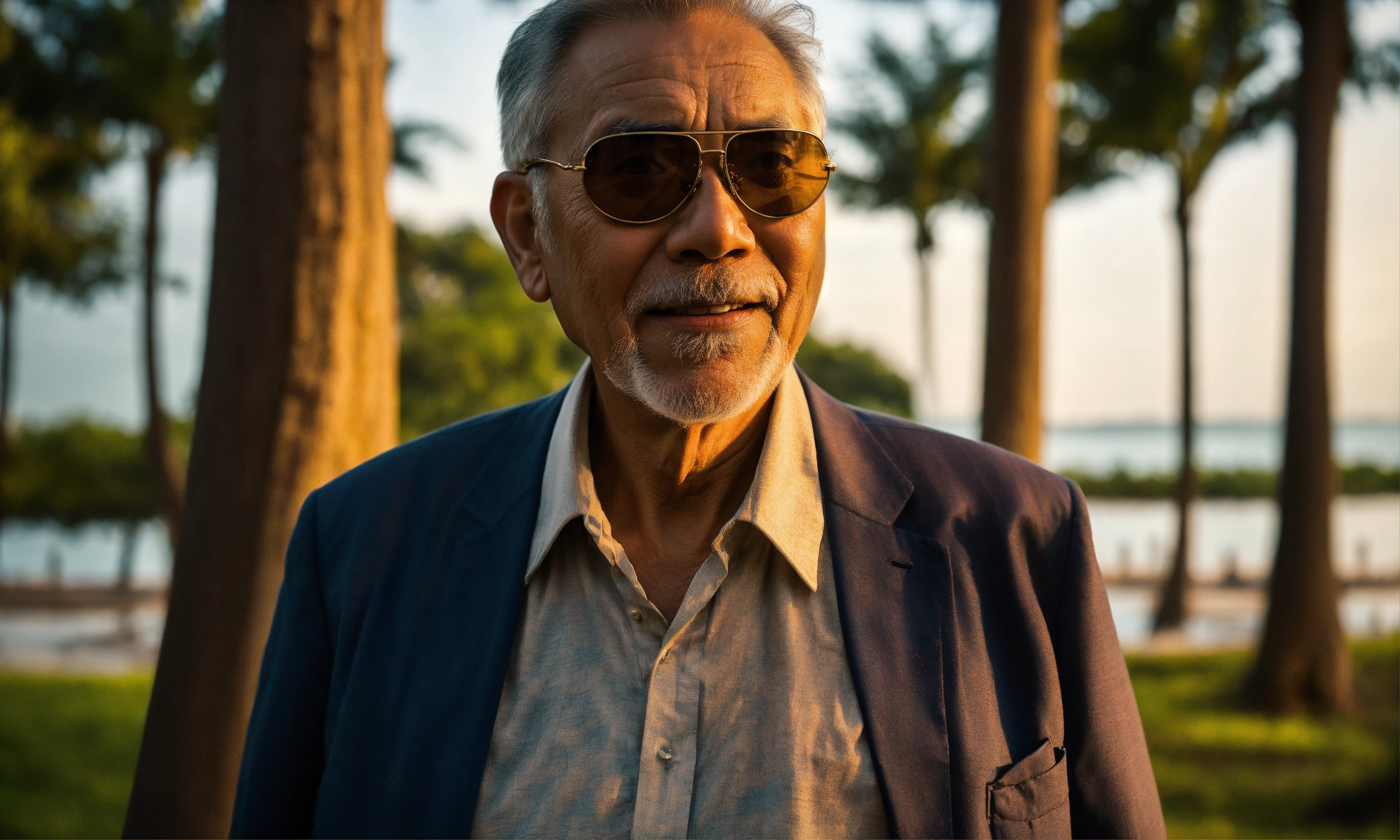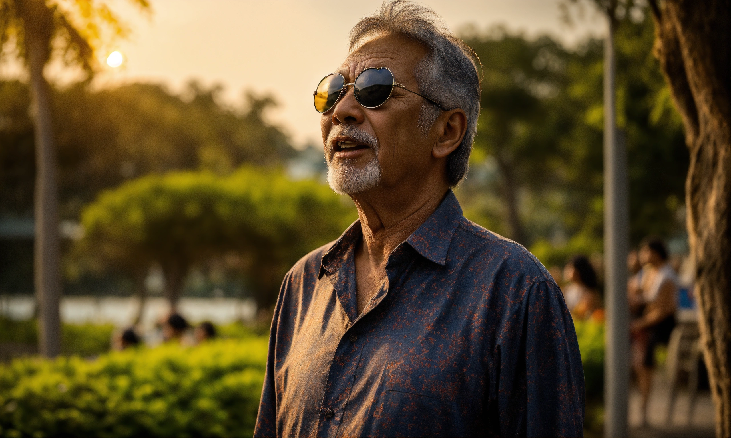 Afternoon sun, ultra-realistic medium photo of a blind 60-year old man standing with confidence and grace, singing a heart felt song, at singapore east coast park, cinematic quality, his face, etched with the wisdom of years, passionate, dressed with a buttoned-up shirt, slacks, and a pair of sunglasses covering his sightless eyes. behind him, the skyline of residential estates rises, a juxtaposition of the urban environment against the serenity of the park, in front, an sizable audience, blurred, themes resilience, the transcendence of music, the merging of urban life with nature's embrace. the image, captured with a lens emphasizing clarity and emotion, uses a film that intensifies the scene's rich contrasts and deep hues, captured with a canon eos r5 using a 24mm f/1.4 lens, the scene emphasizes the complexity of emotions on her face