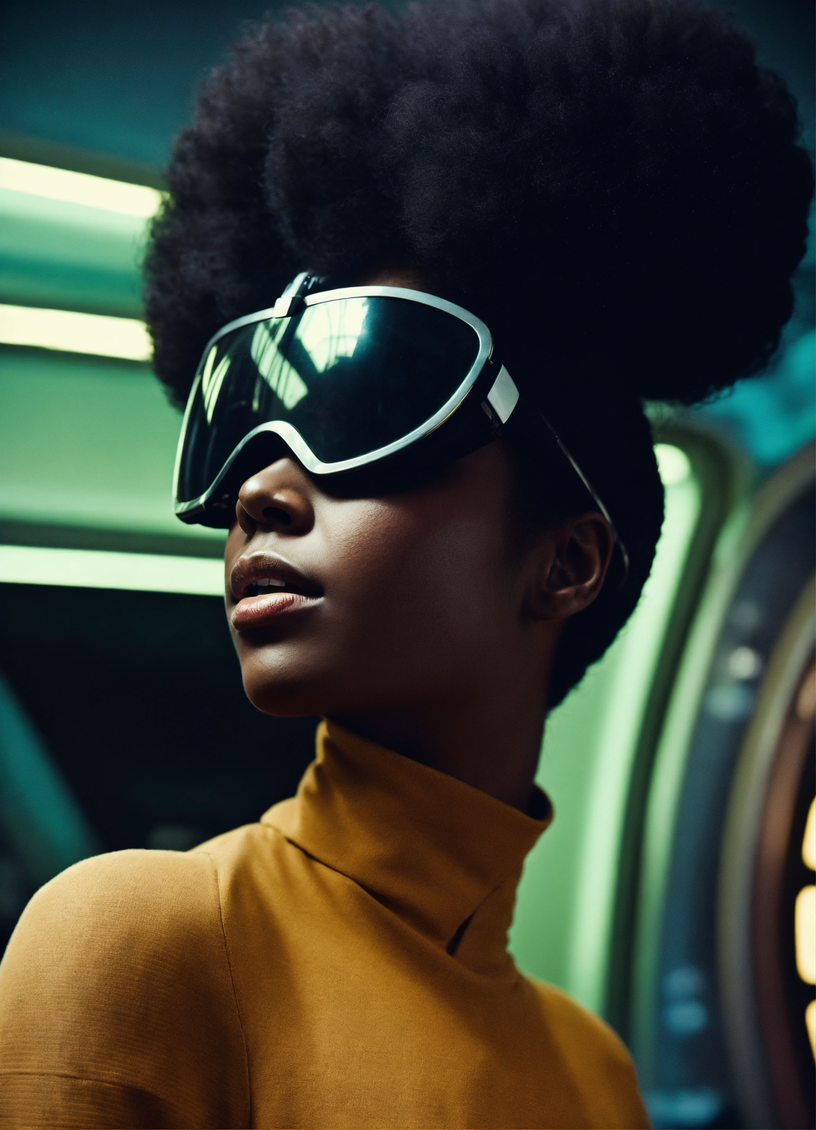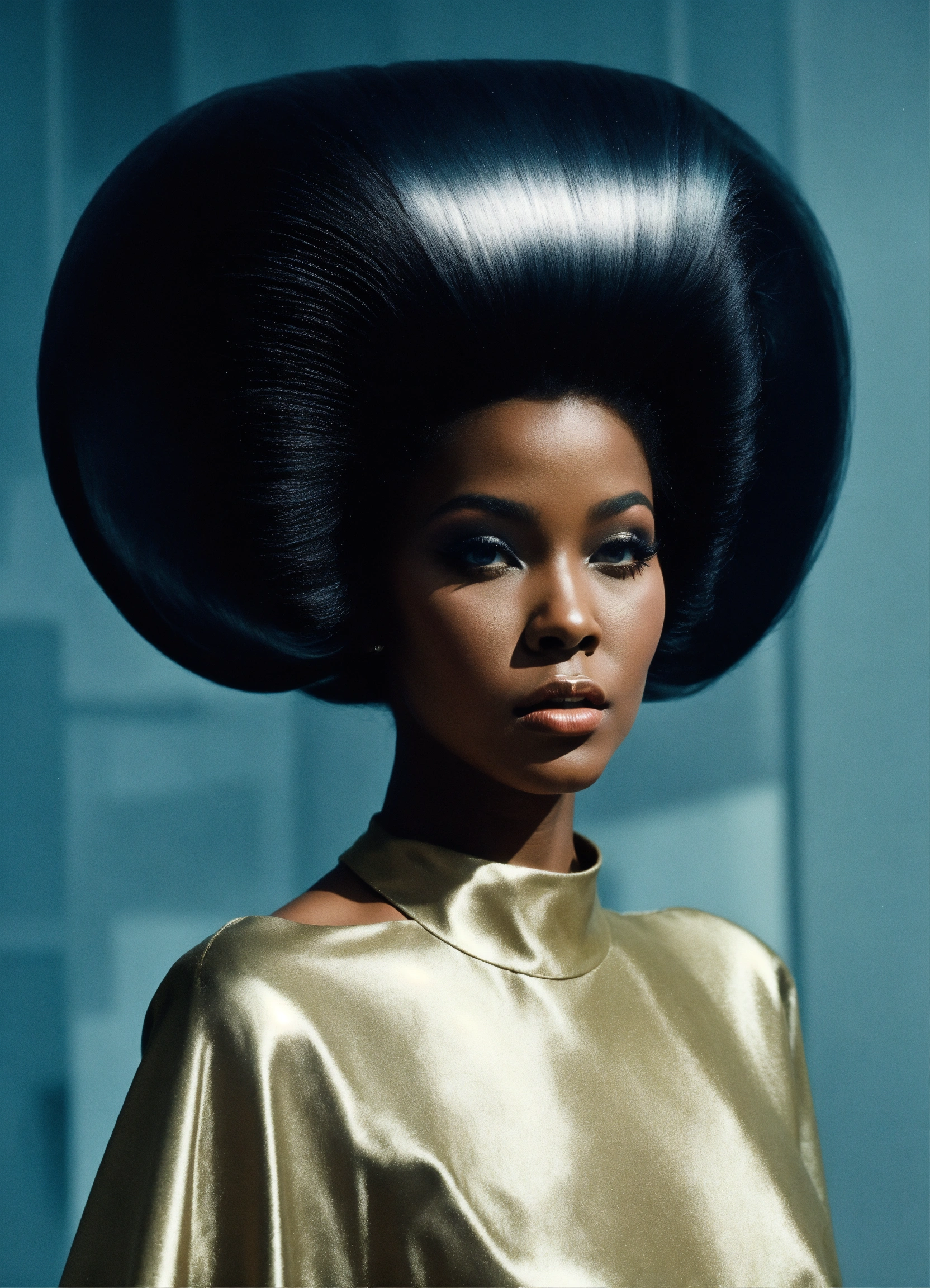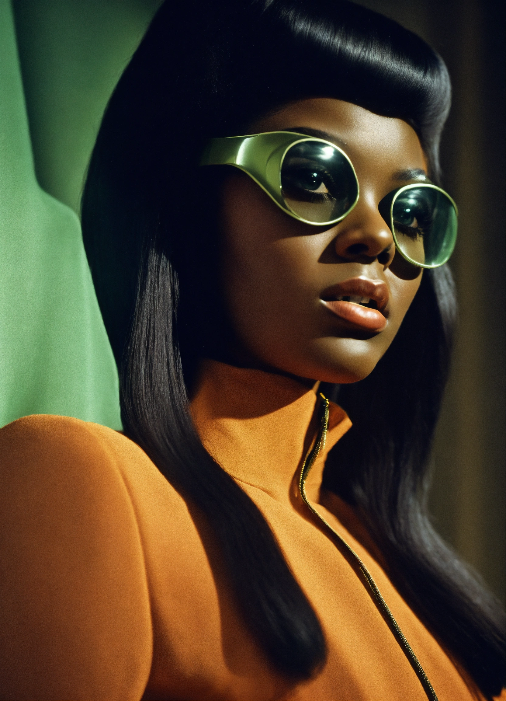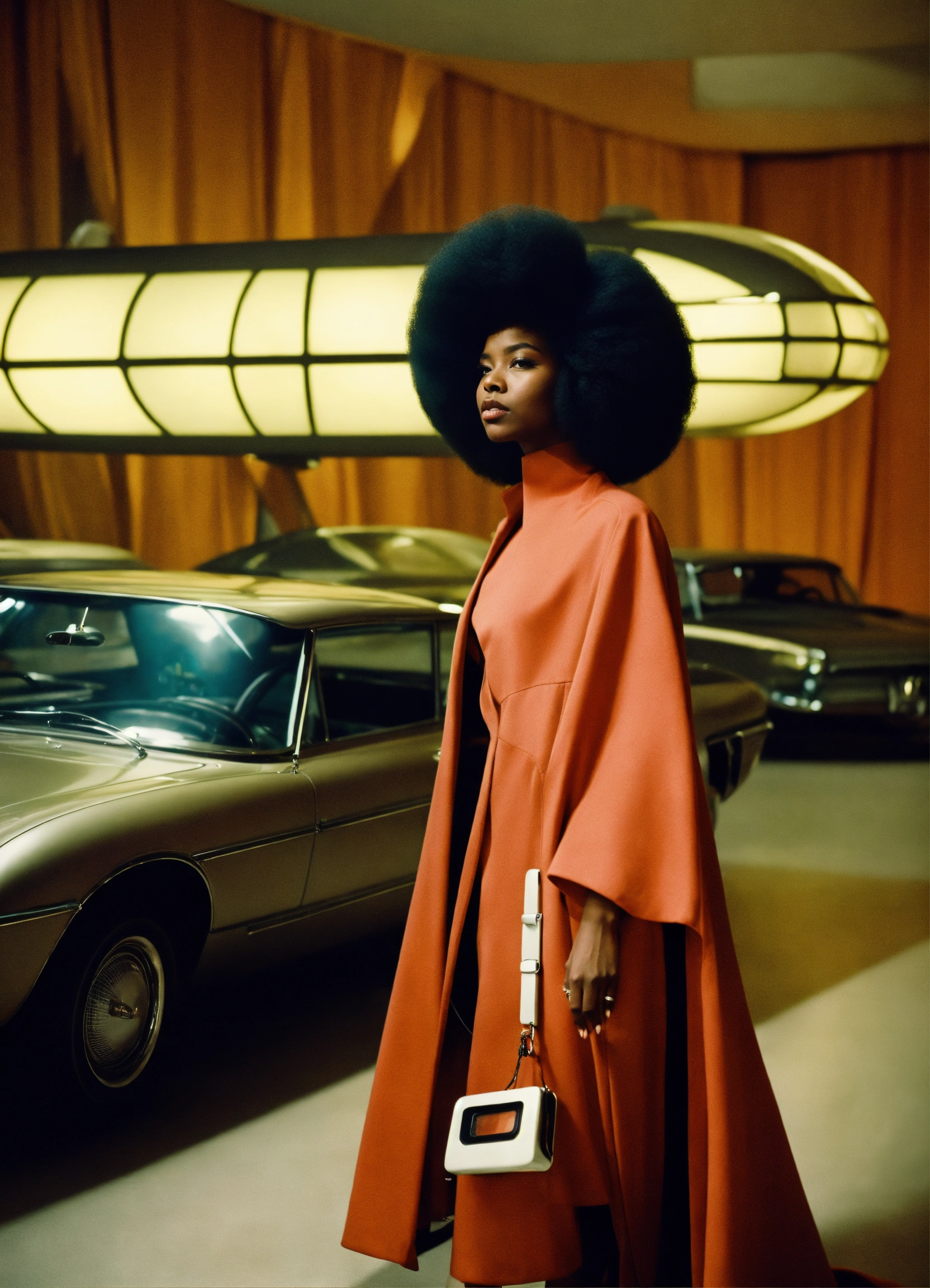 Scene retro future movie from the 1960s sci fi film, black woman, futuristic 60’s mod fashion avant-garde couture photography, sleek oversized flowing hair, minimalism