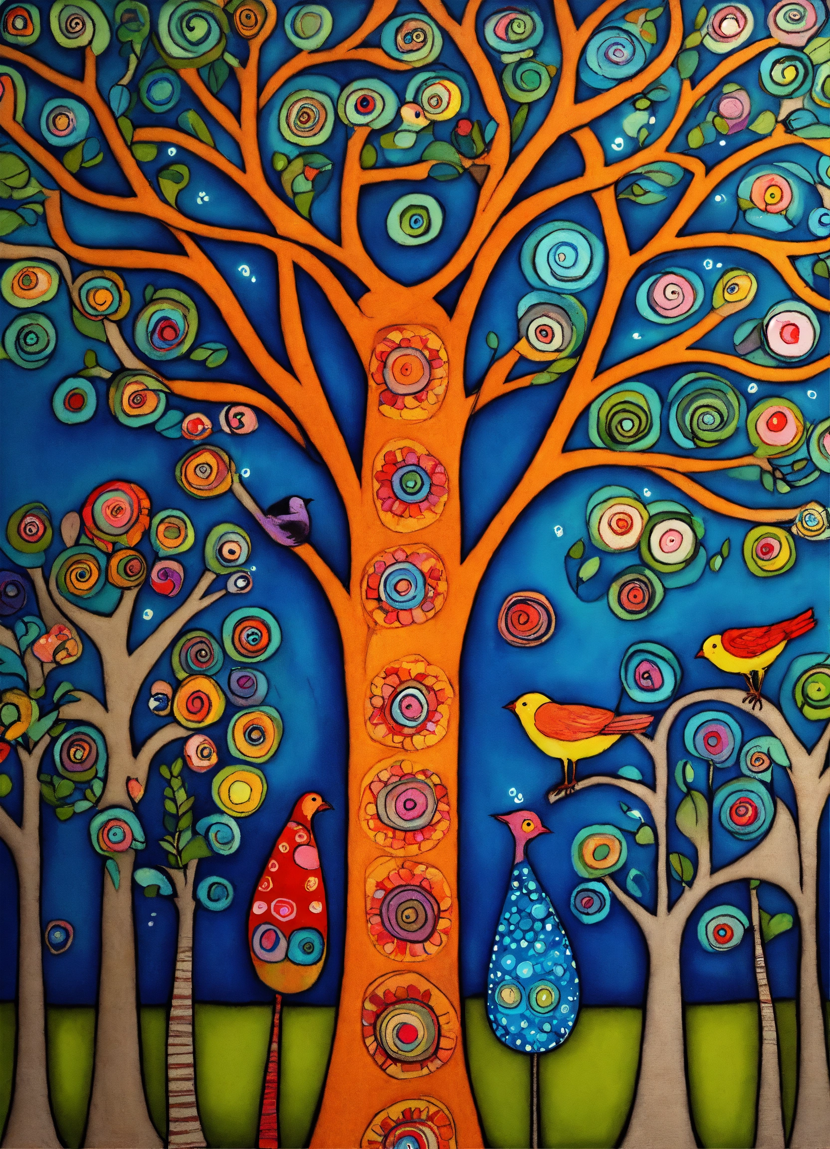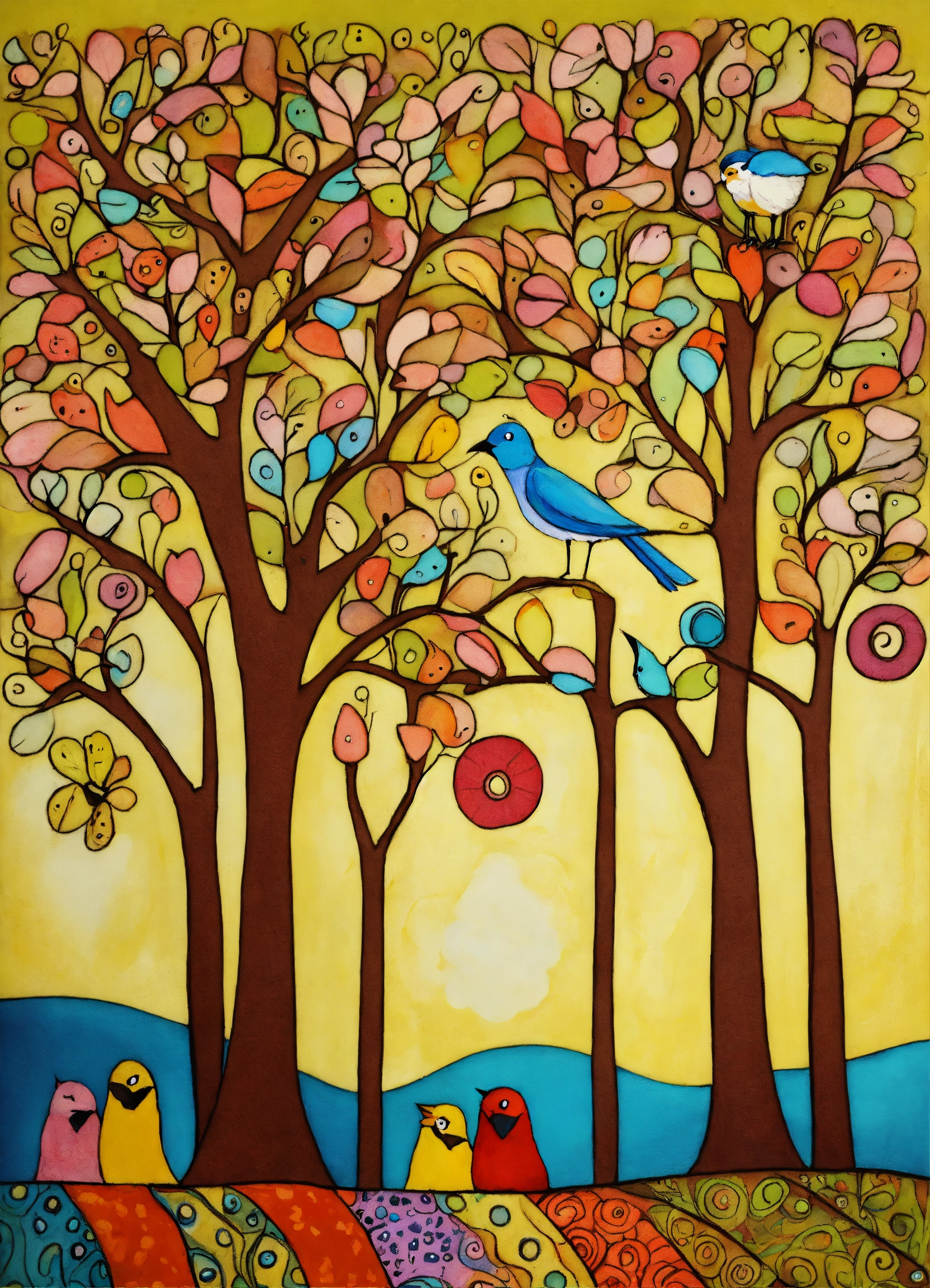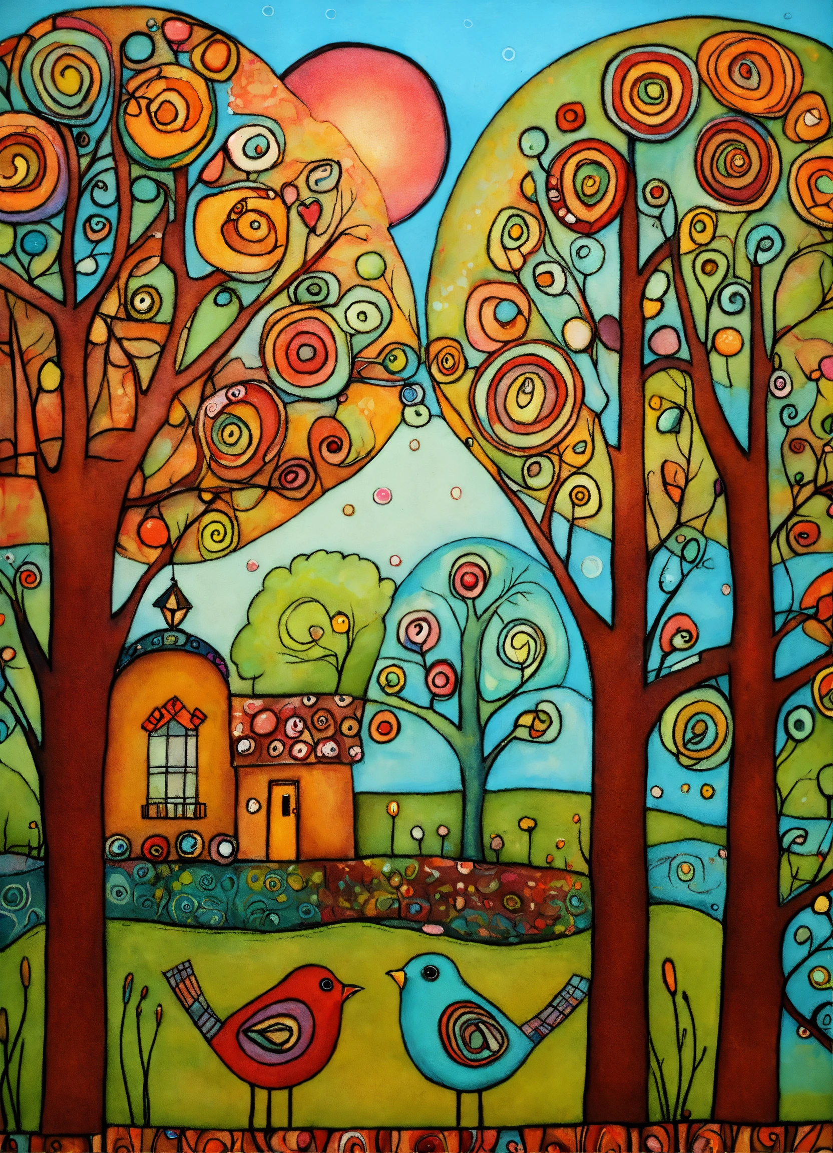 Art drawing trees and birds scene folk art style inspired by karla gerard