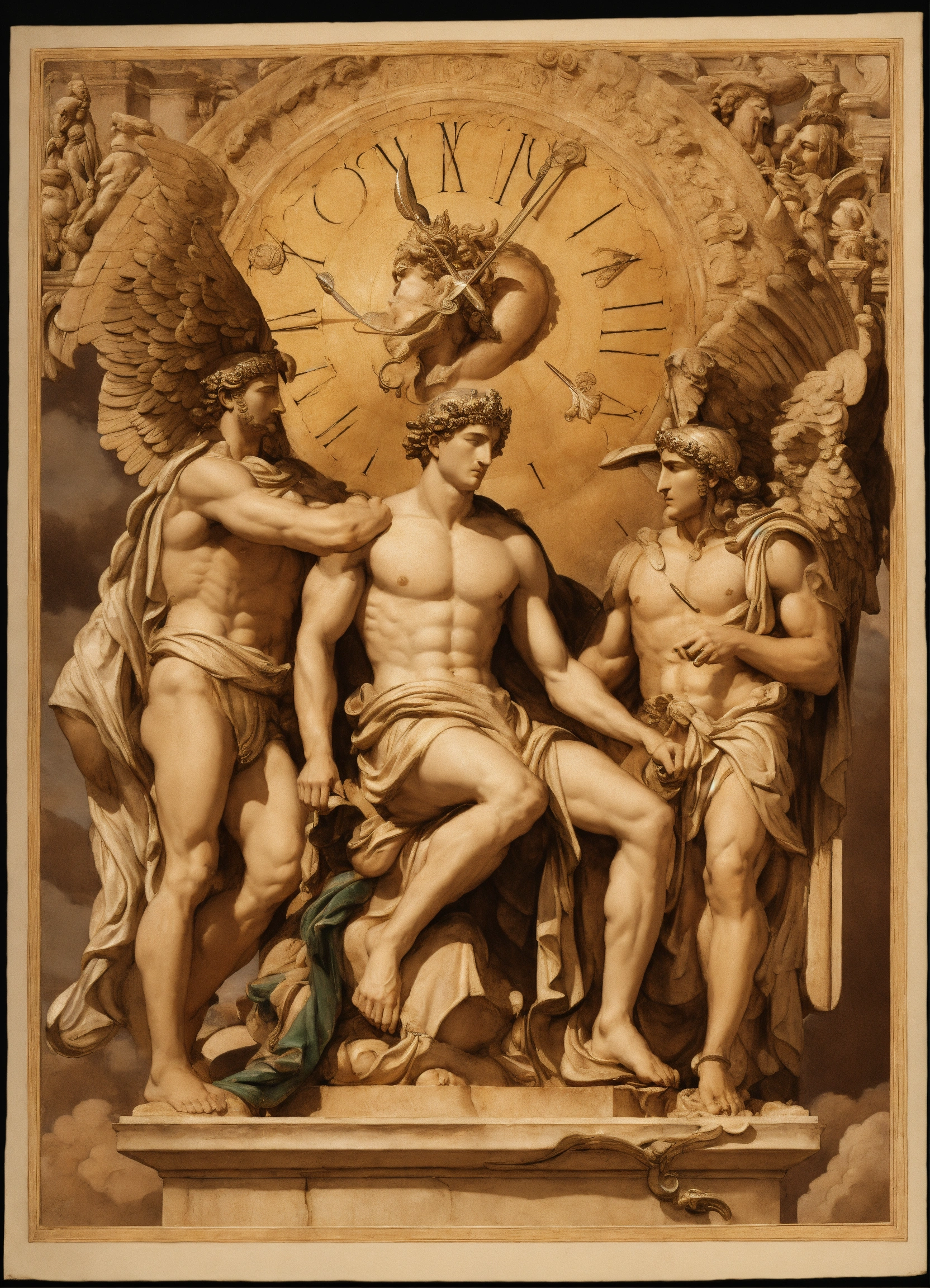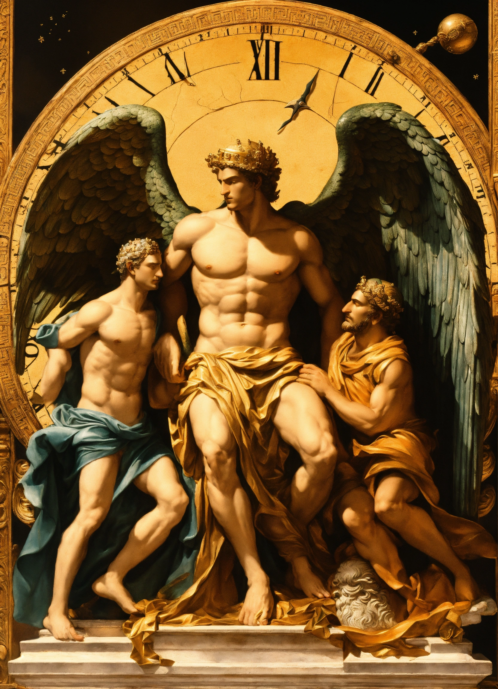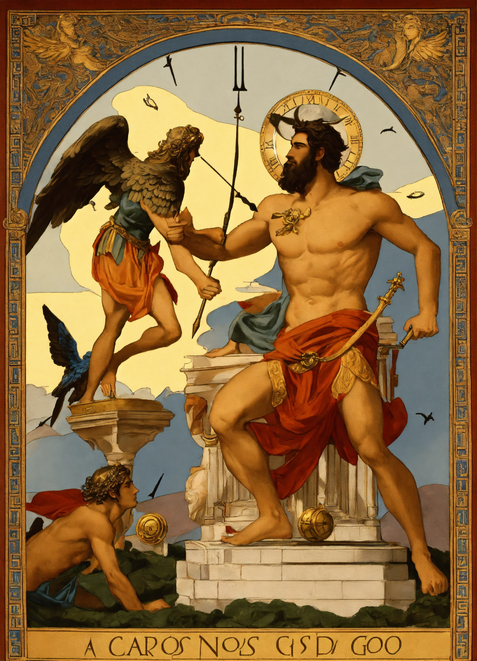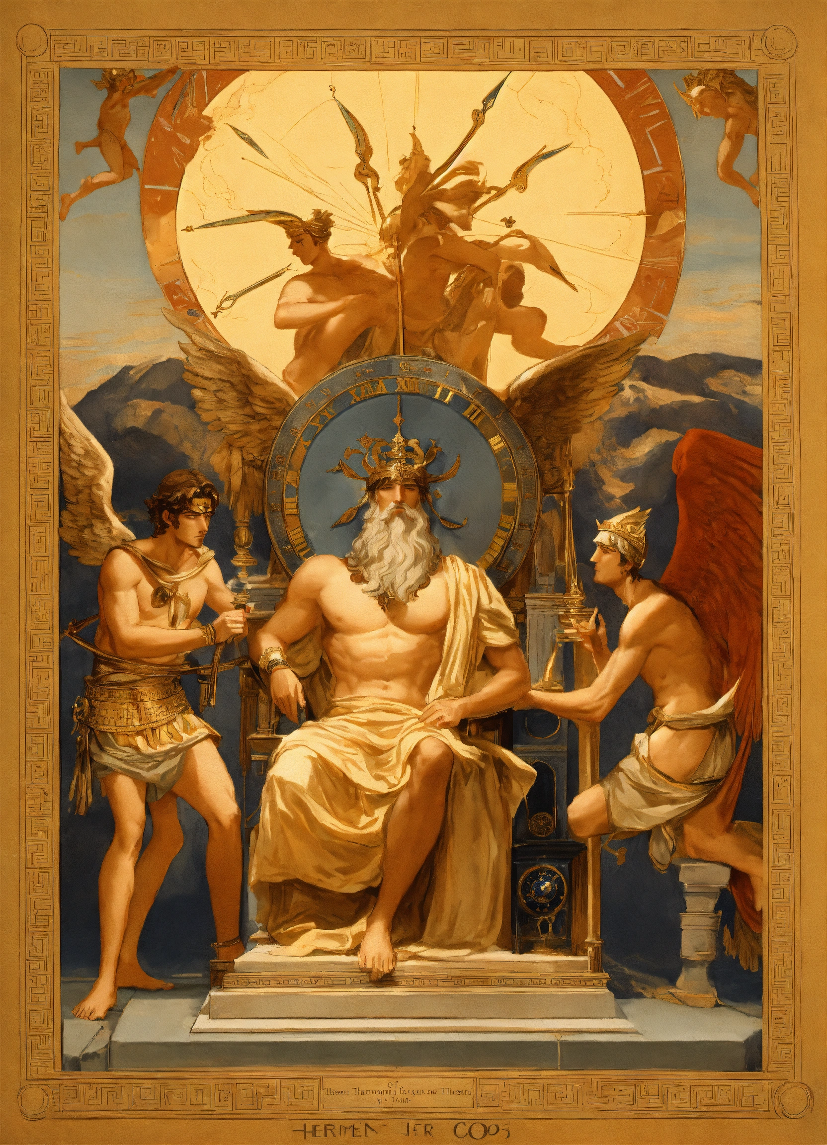2 greek gods facing off hermes the winged god bows and honors cronos the very old god of time (without wings), who sits in his clock-like throne