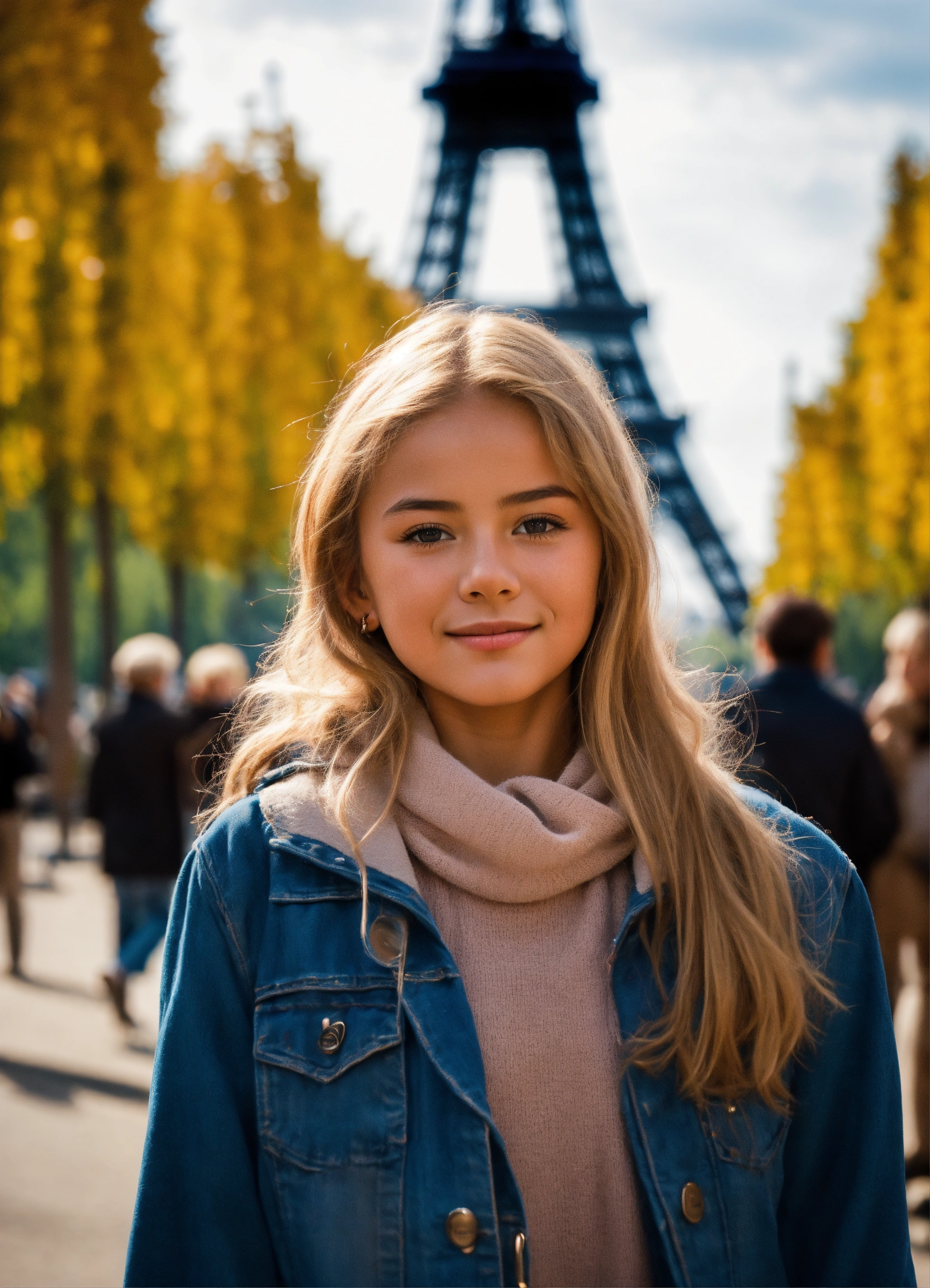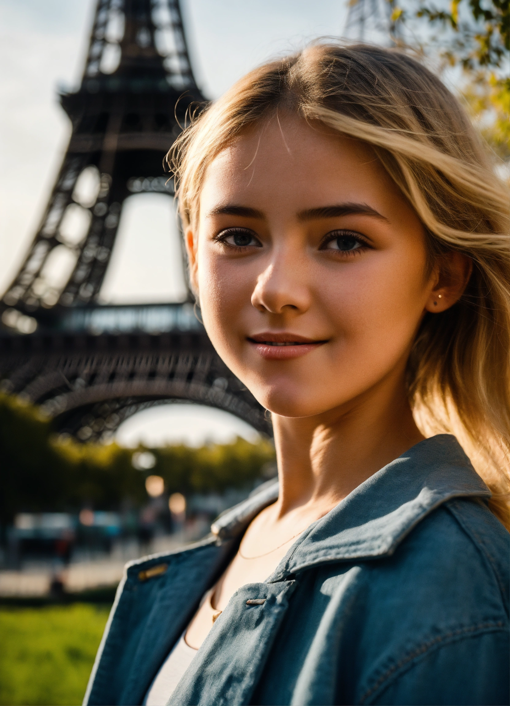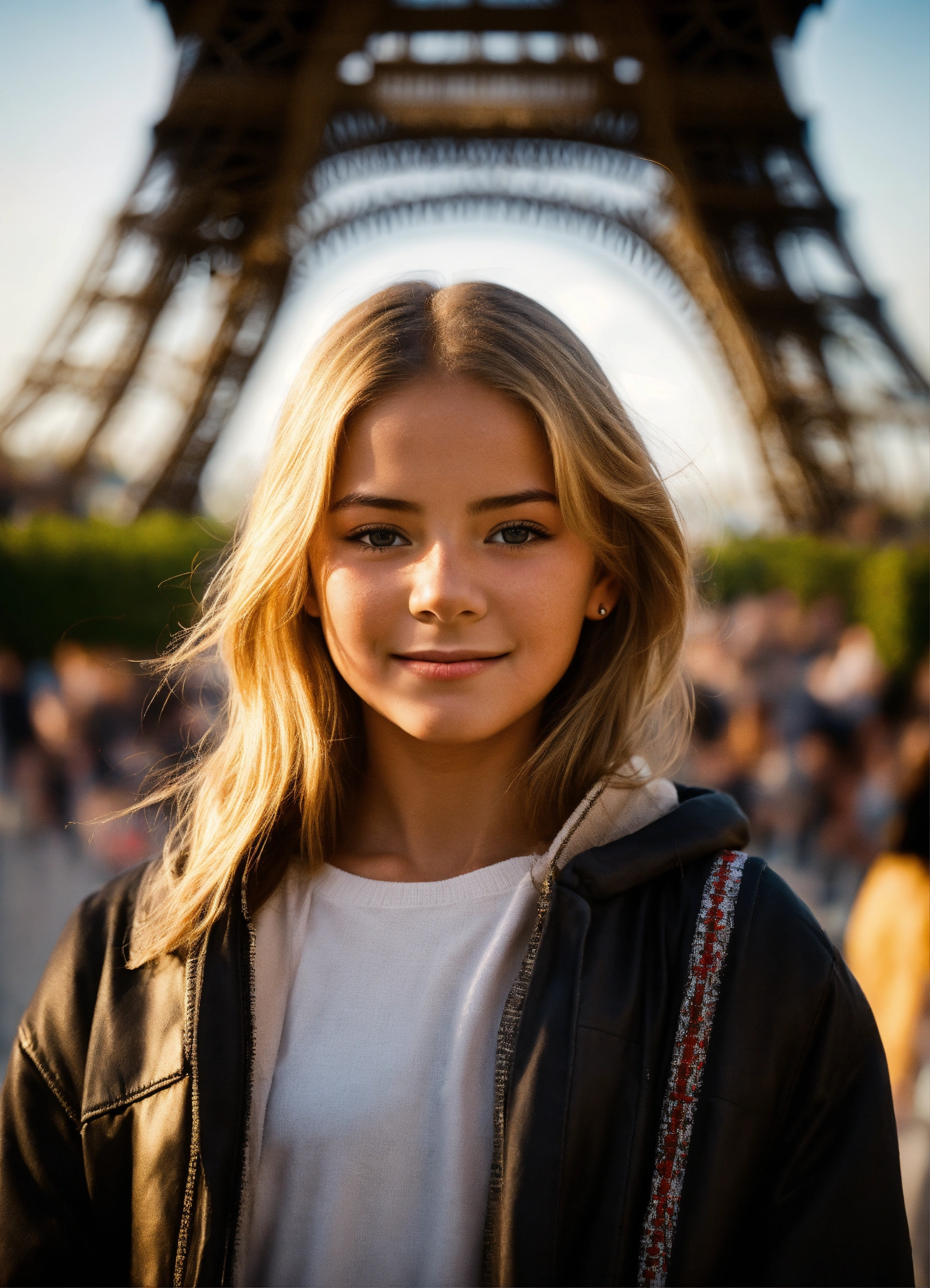 A 12yo blonde latin girl, happy posing for a photo in front of the eiffel tower, camera in front blur (thriller, cinematic film)