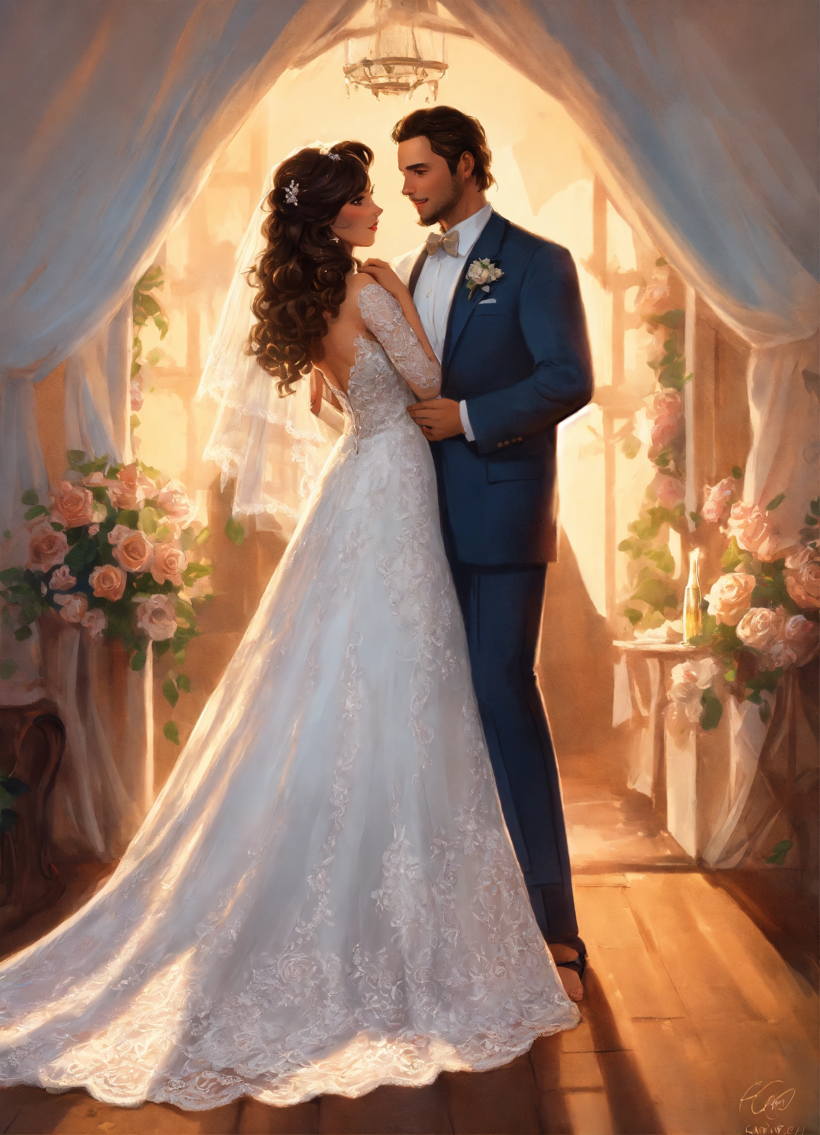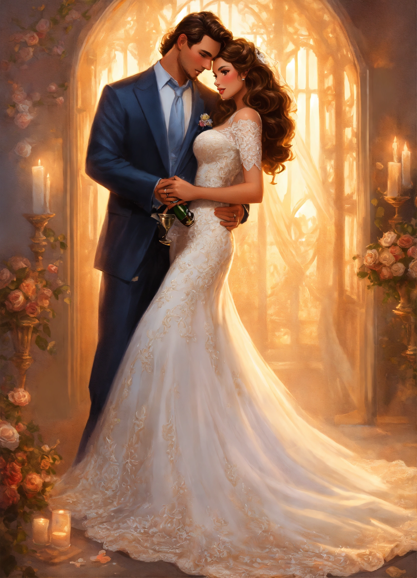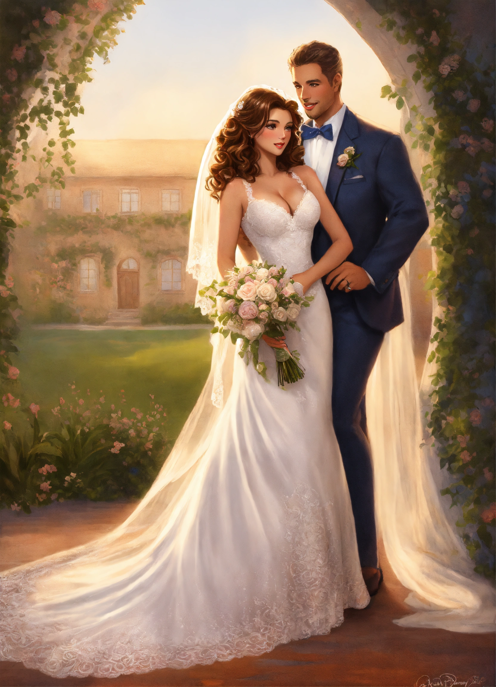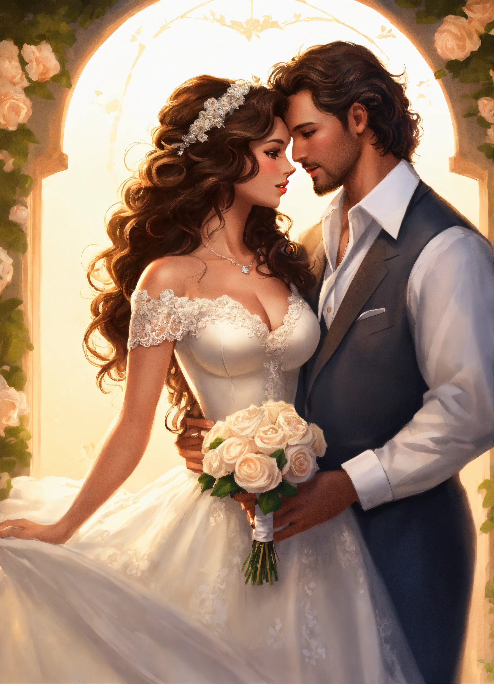 Full body, keith garvey style, married couple of 20 years, pinup, romantic, long curly brown hair and large hazel eyes, light skin, wedding dress with a veil with champagne-colored lace, barefoot, lively but very realistic, realistic illustration, white background, disney