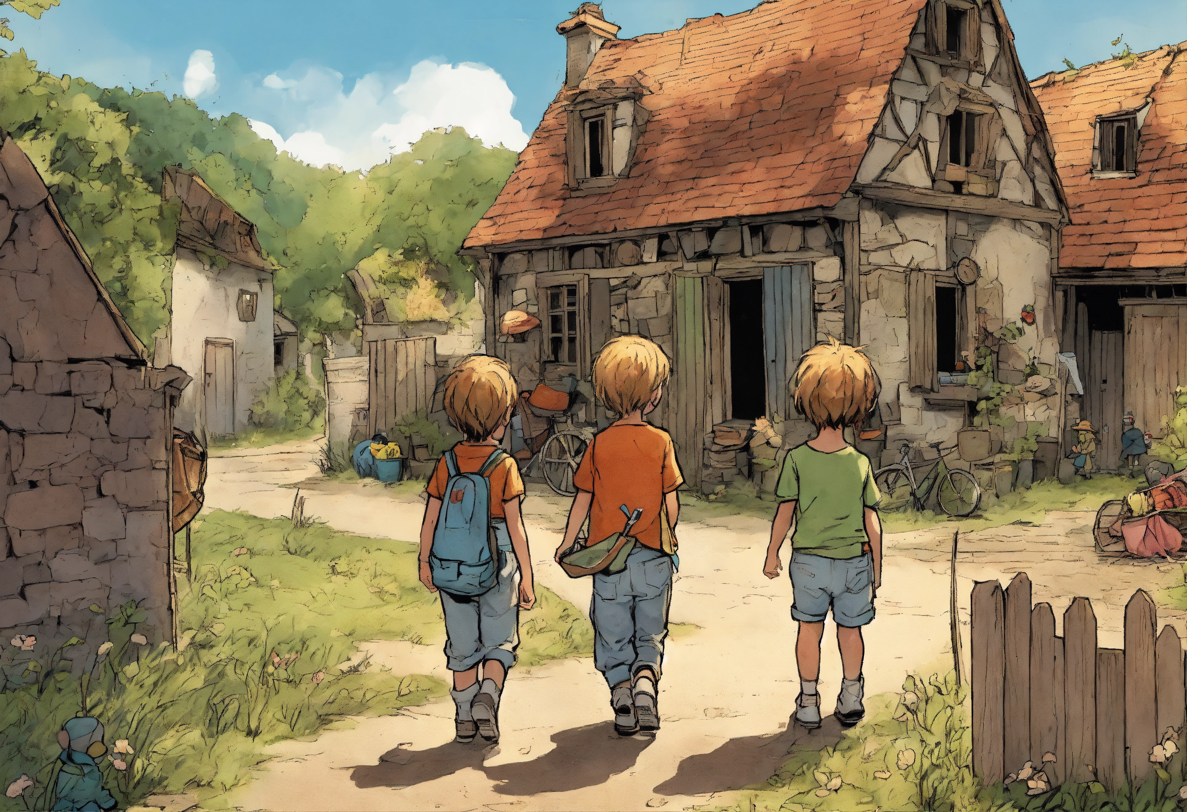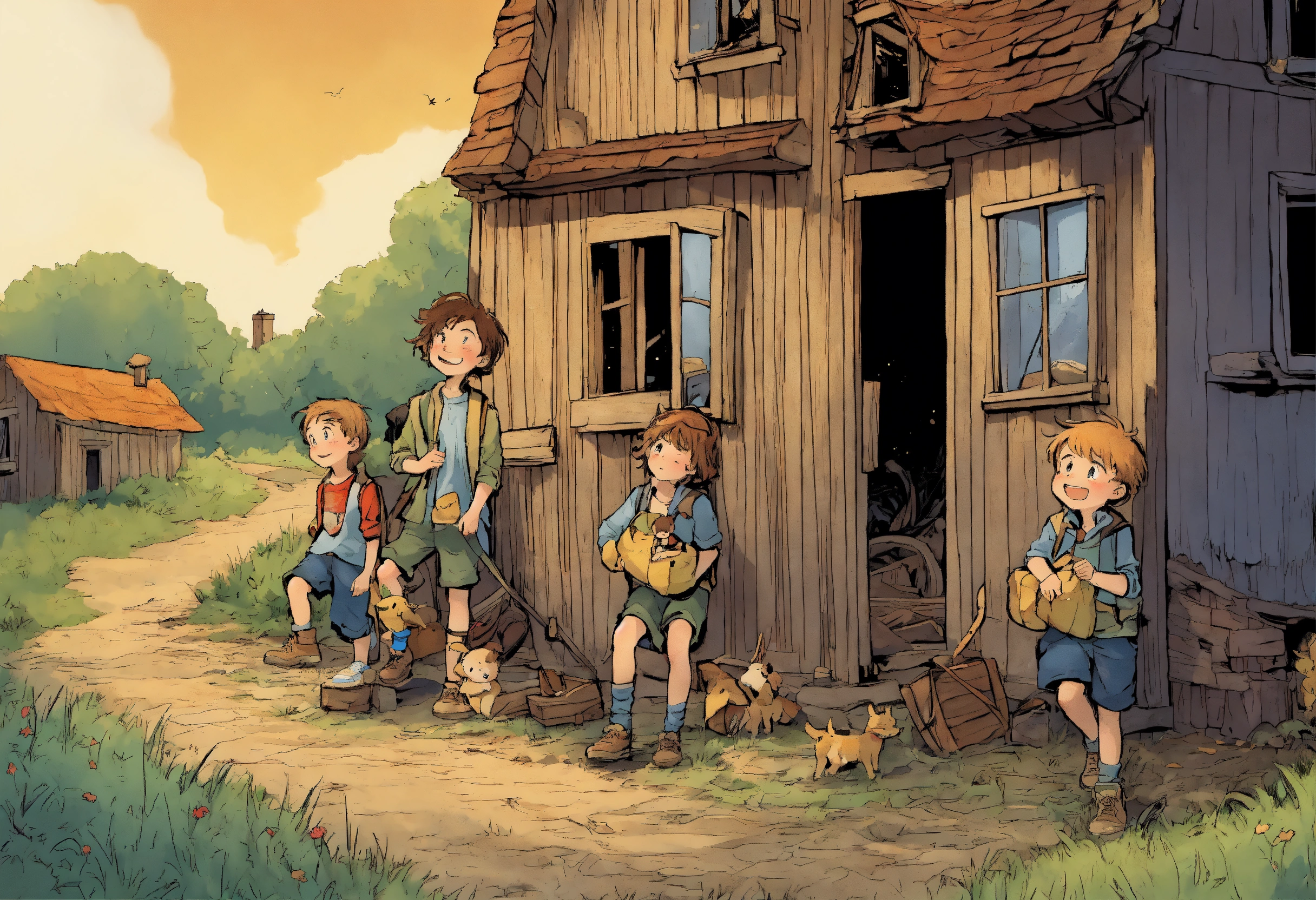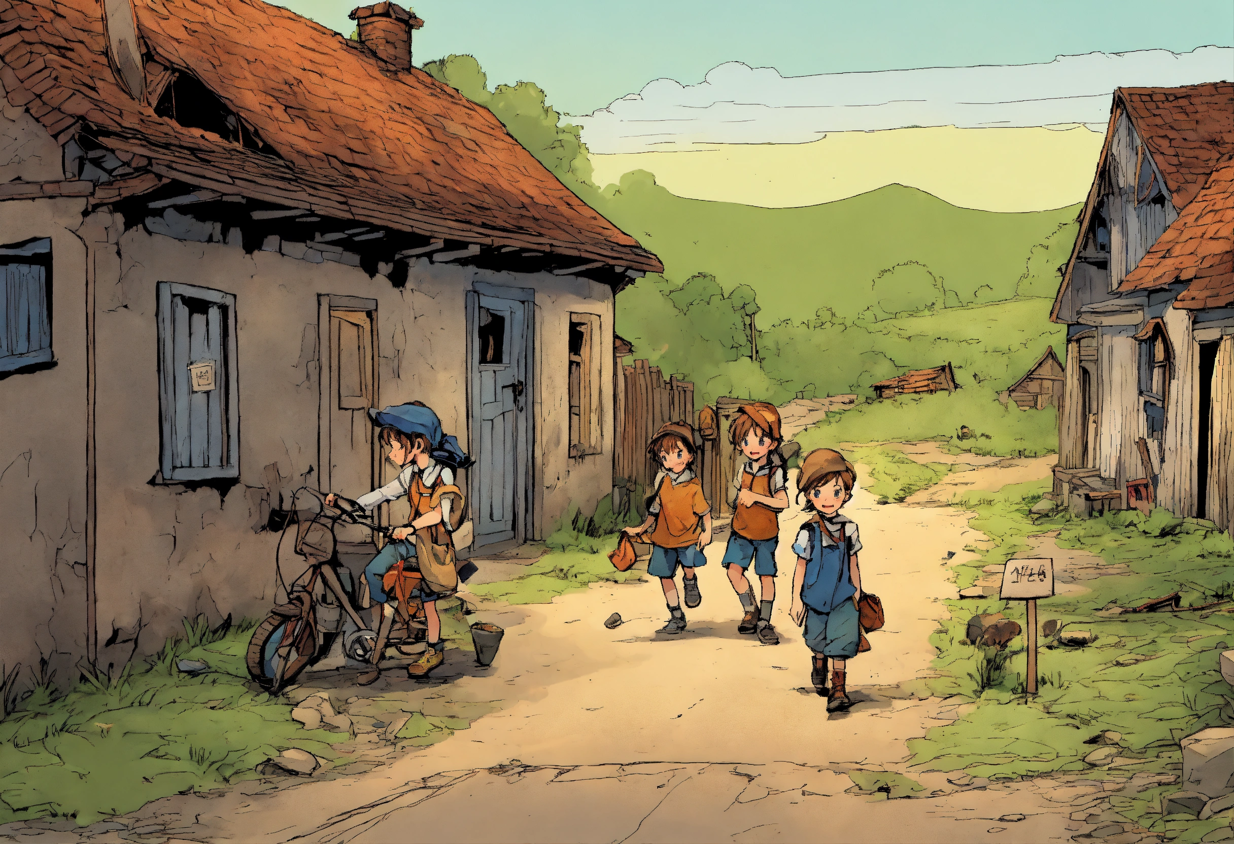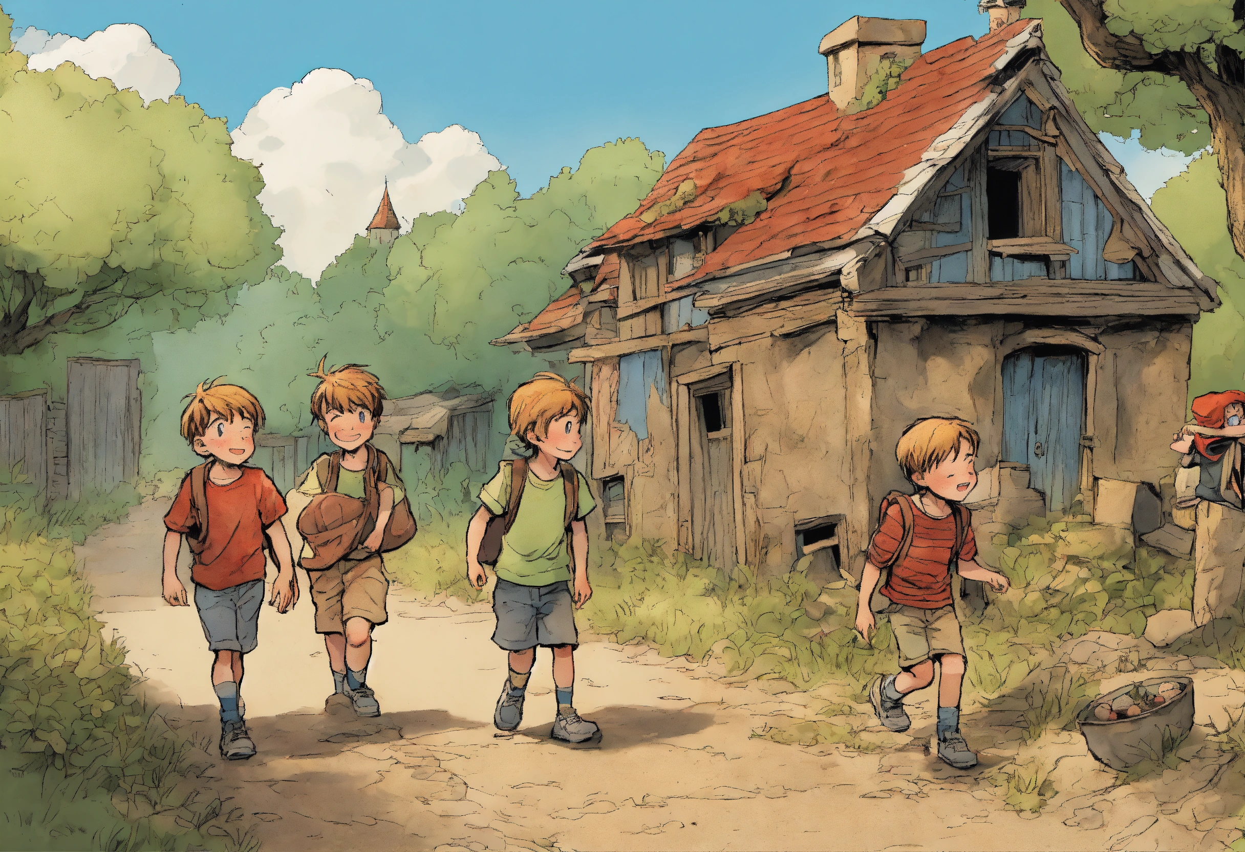 4 enfants sont dans un village abandonné, partent à rechercher des trésors de l'imaginaire avec leurs 4 amis. comic strip.