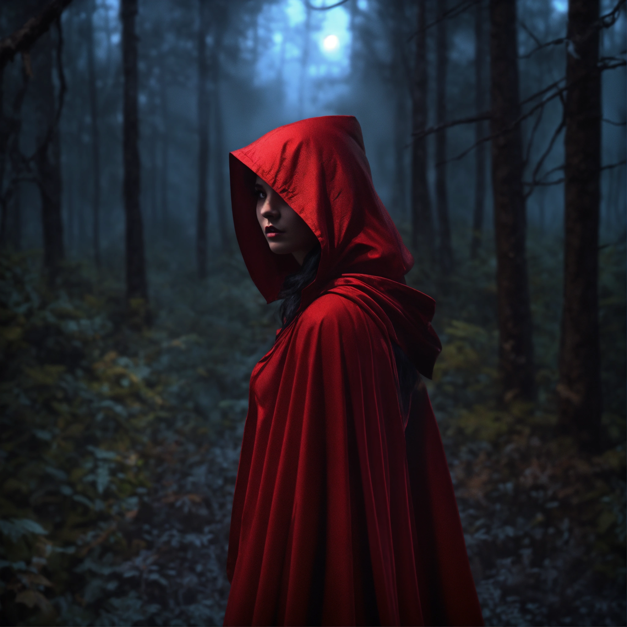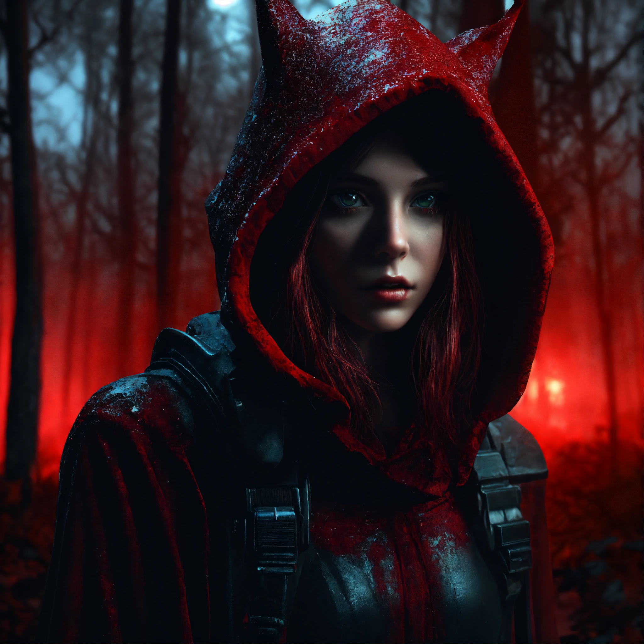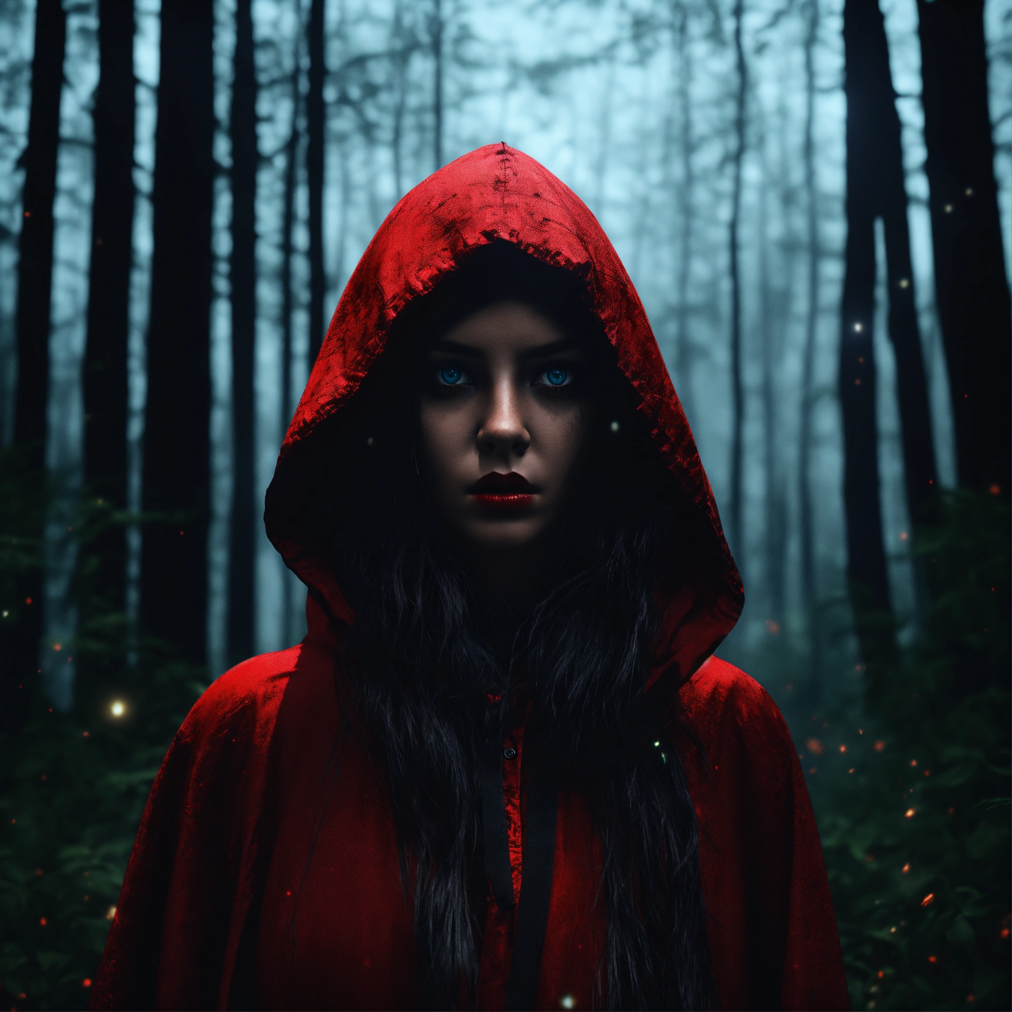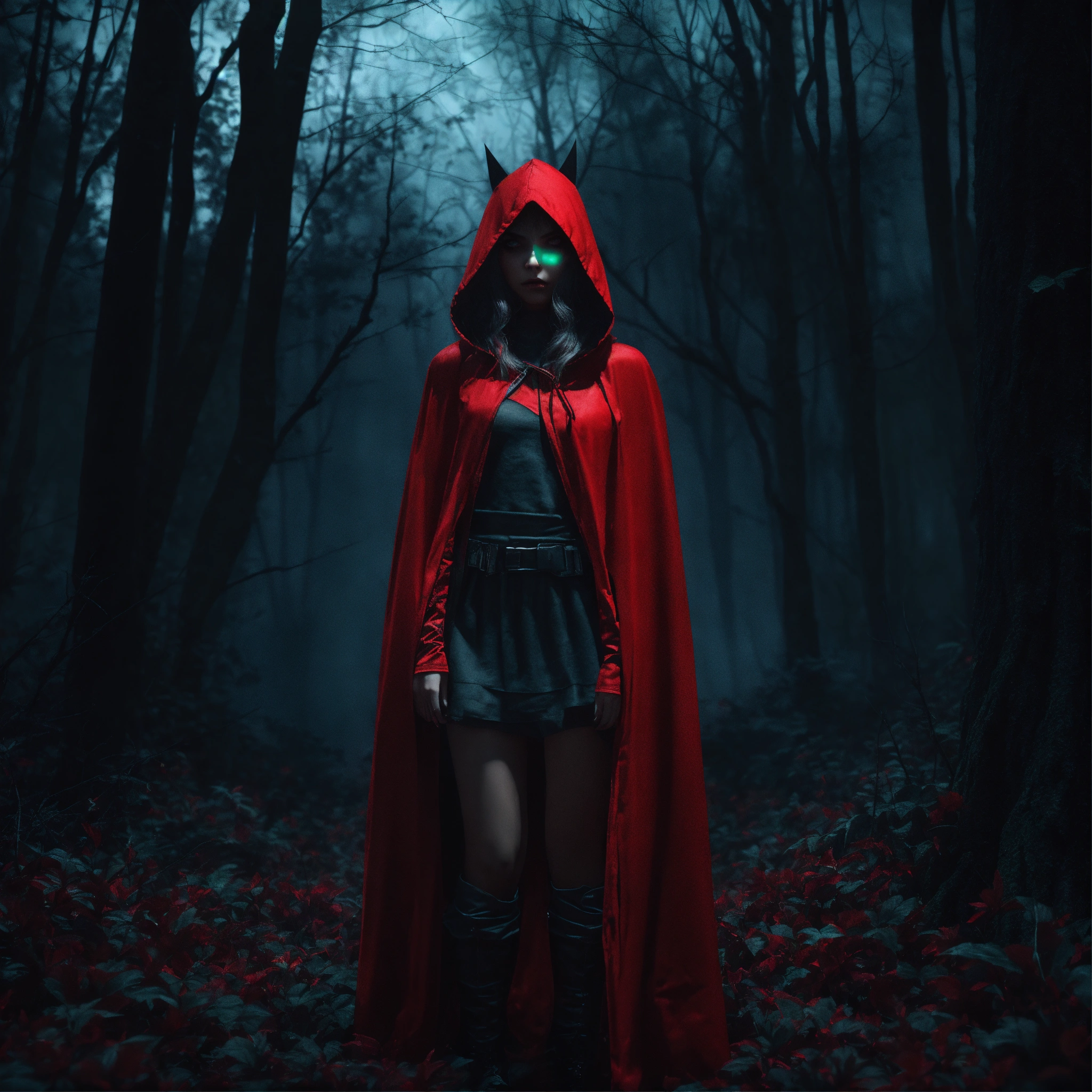 Eerie girl in a hero-like red hood, pitch black bat-like eyes, in a deep dark forest, pitch black night, night vision shot, scary uncanny atmosphere, 3d model, digital art, 4k