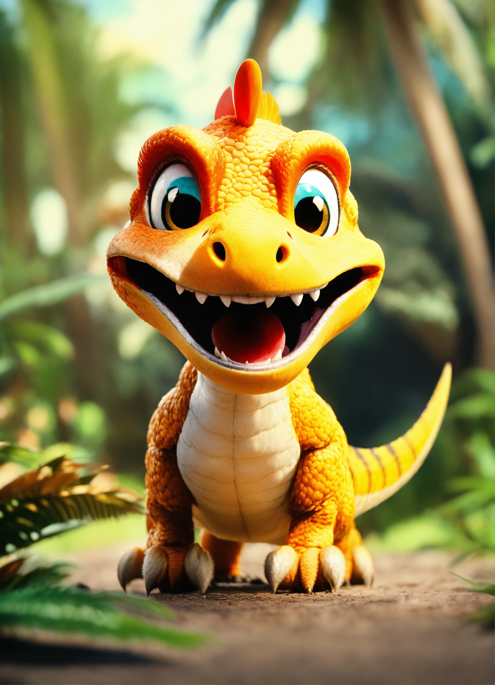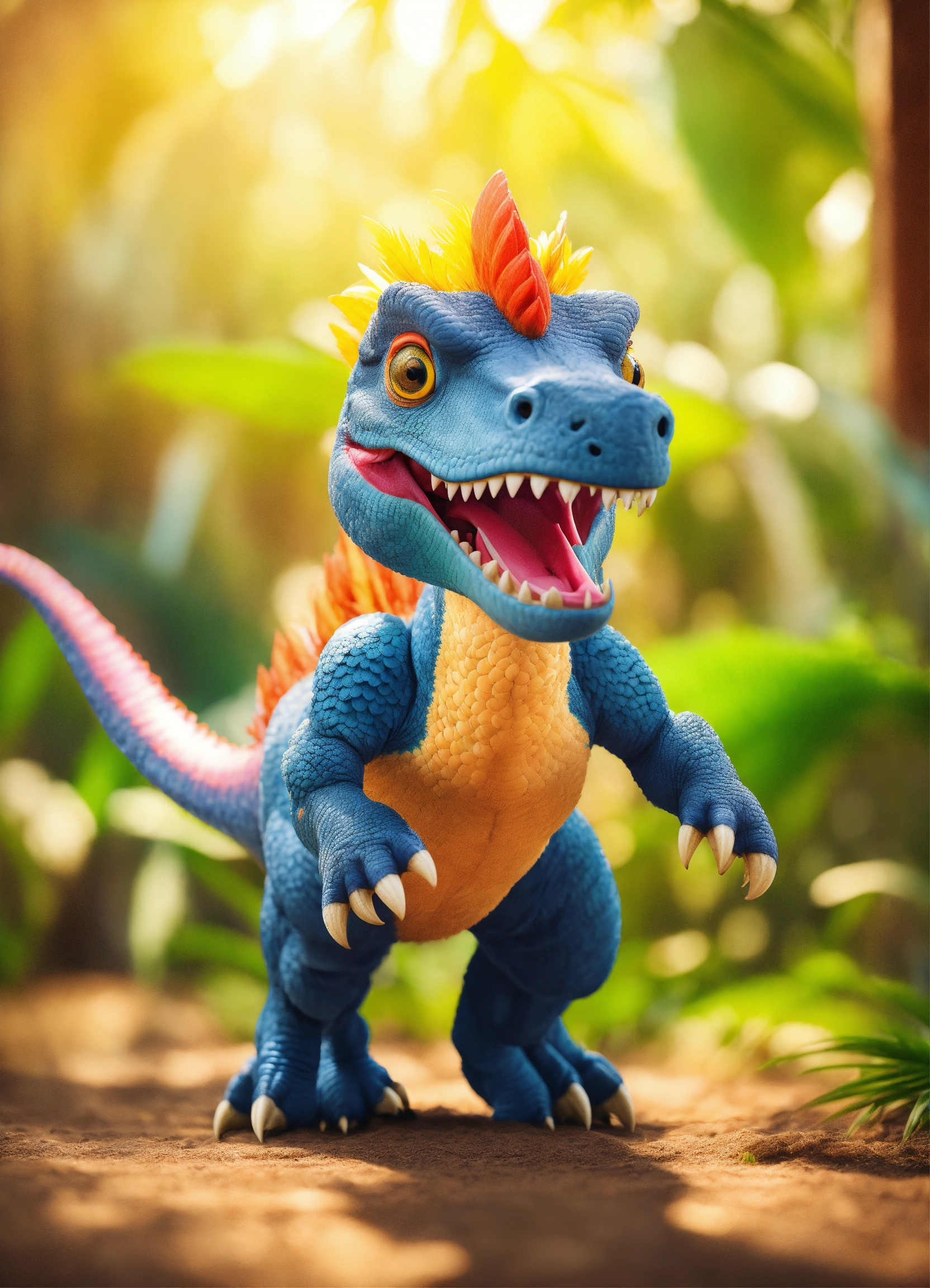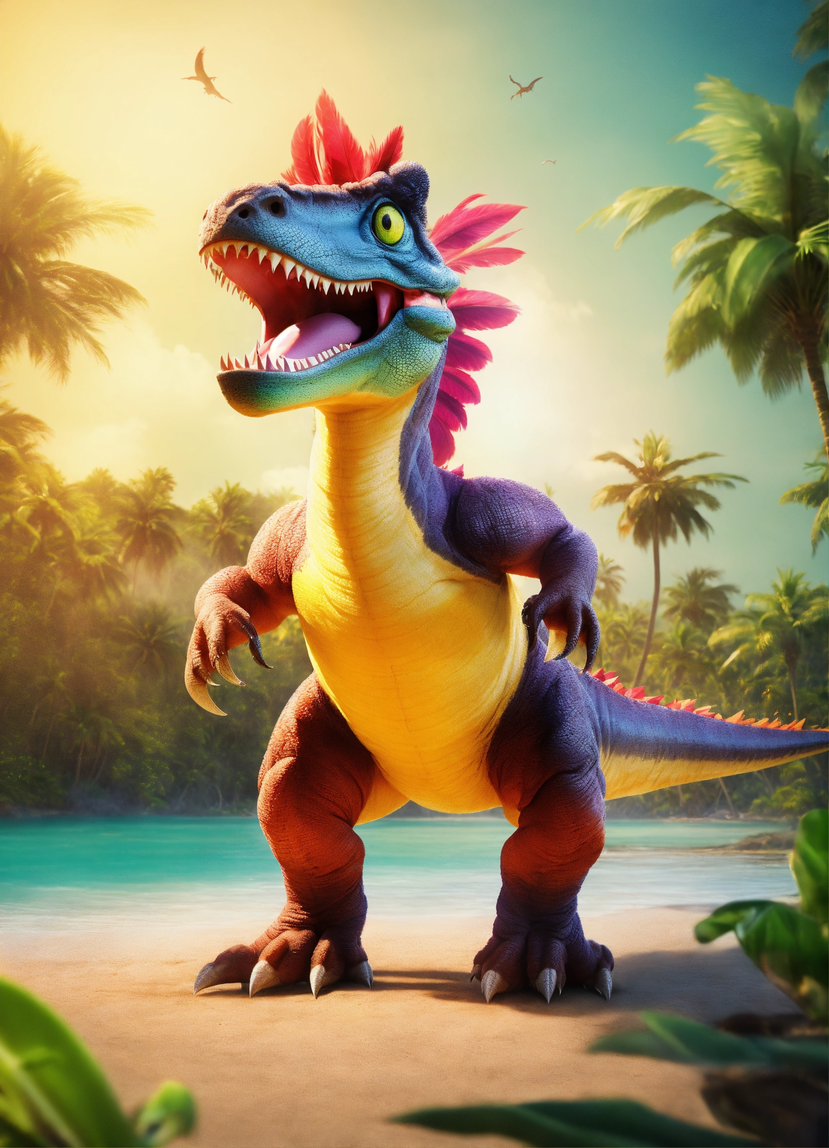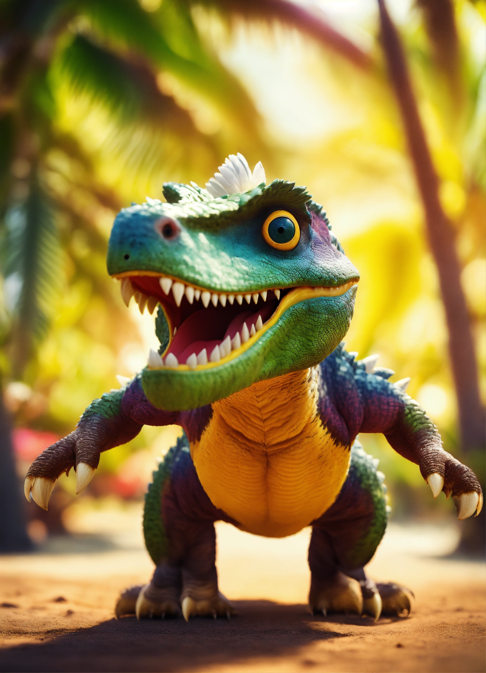 An adorable and fluffy tyrannosaur dinosaur with big color eyes and big and huge ears, in action and moving modus, big and huge head, look cool and little angry, with soft feathers and wings, tropical island, multicolor skin with stripes, tusks, smiling and happy, sunny, palm trees, banana plant, with blur background, high quality, 8k