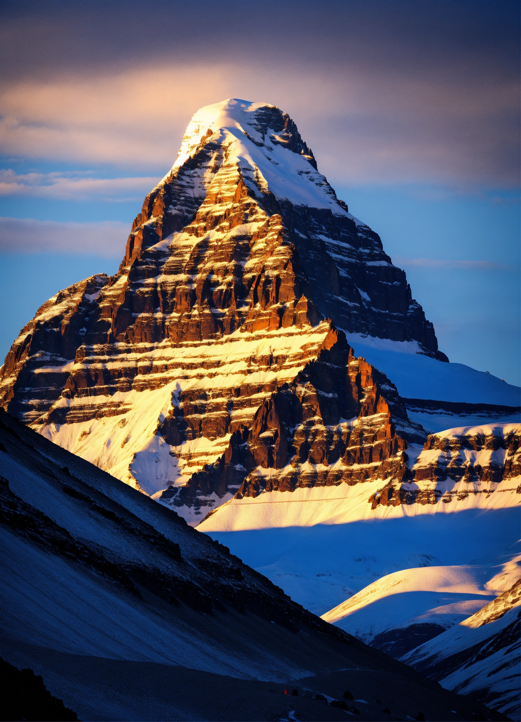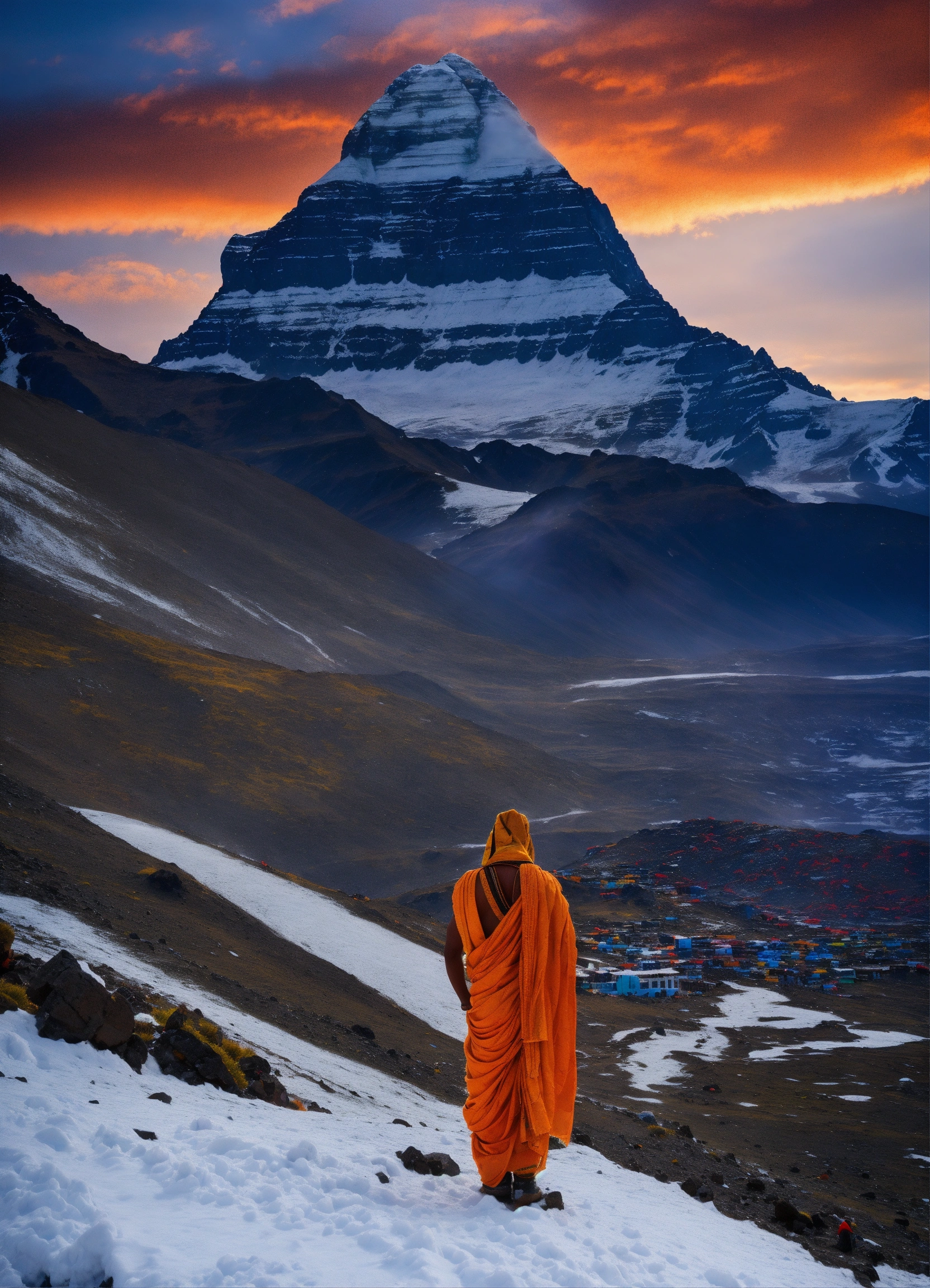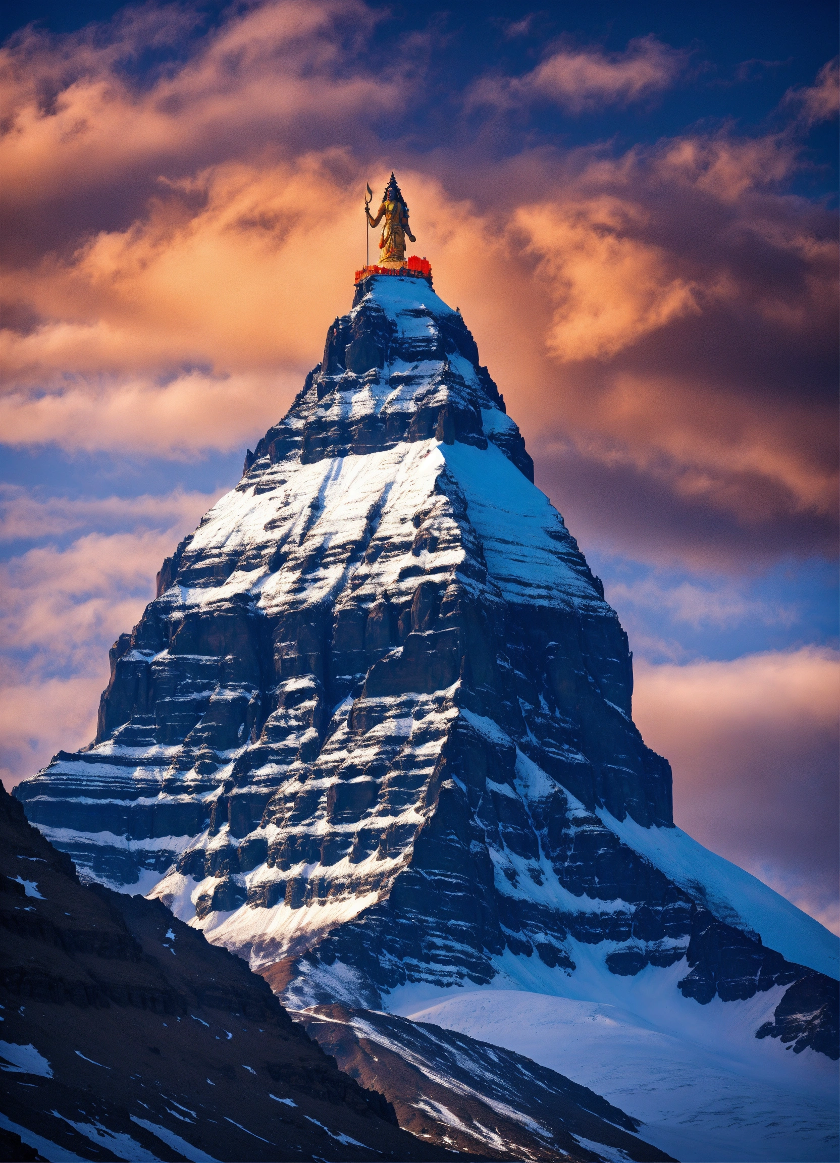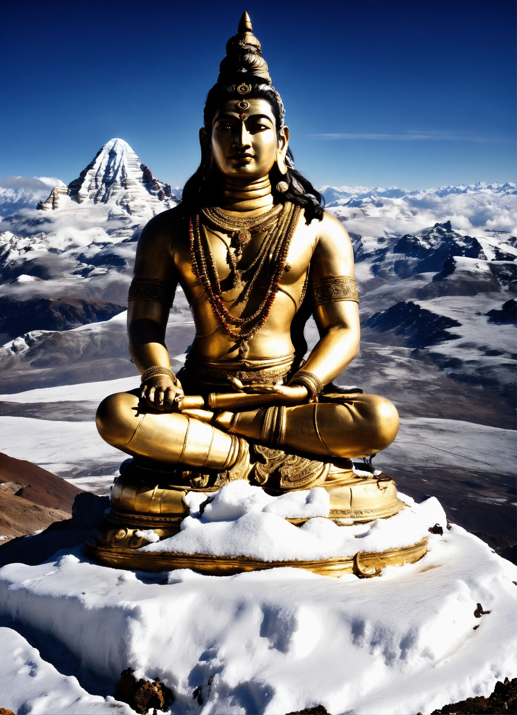A human form of lord shiva on mount kailash, ultra real, great quality. mount kailash has snow all over it. other mountains can be seen from mount kailash.