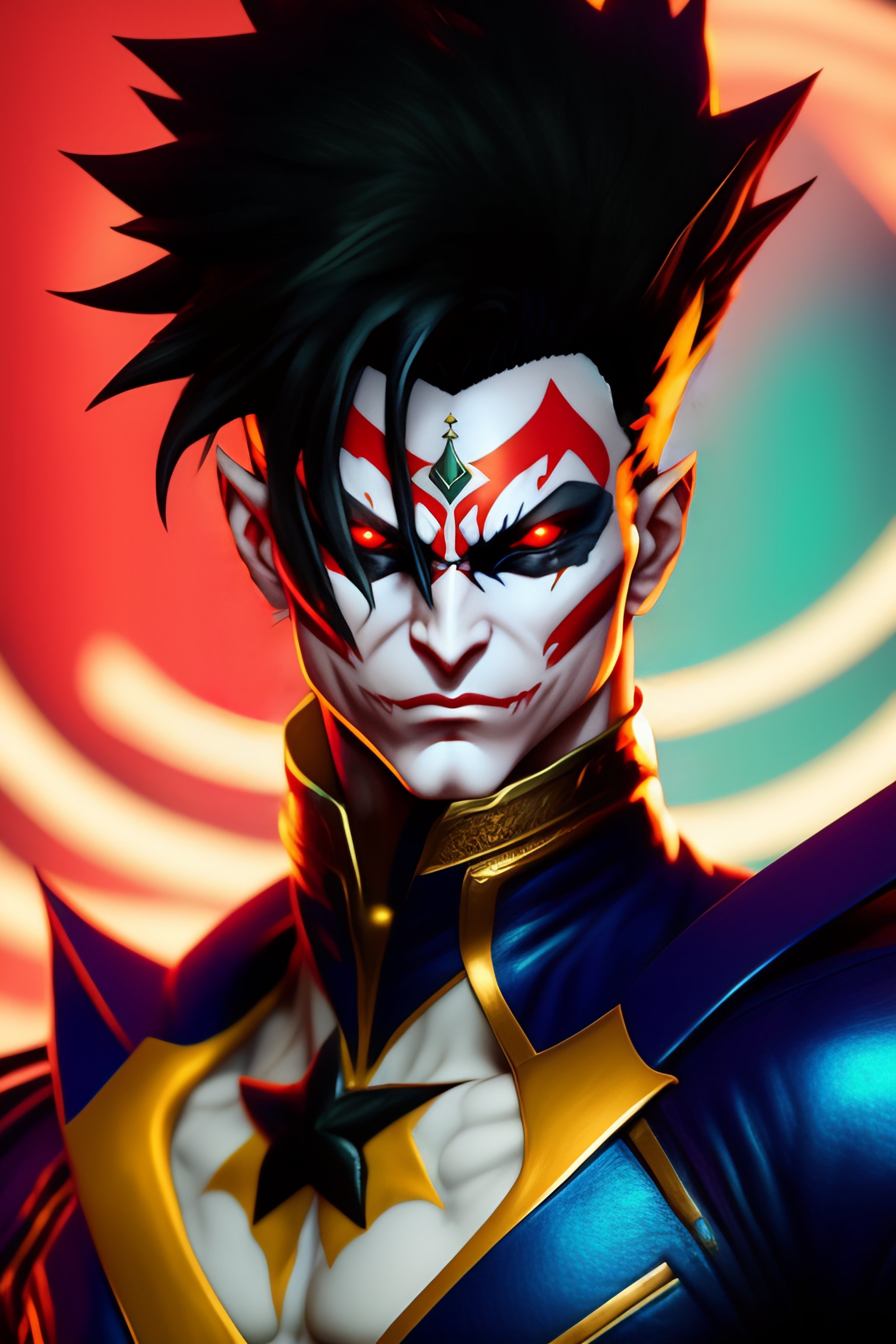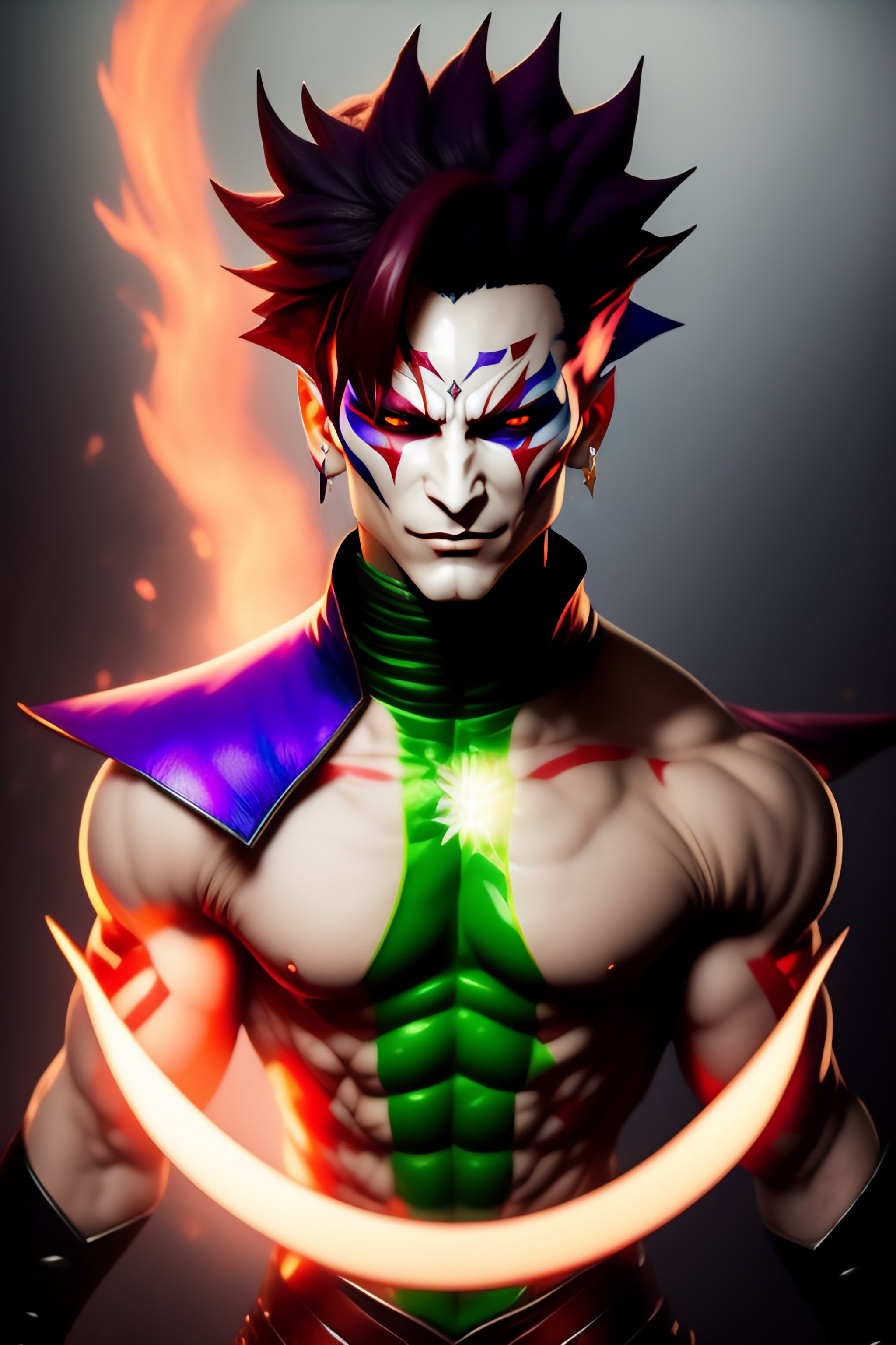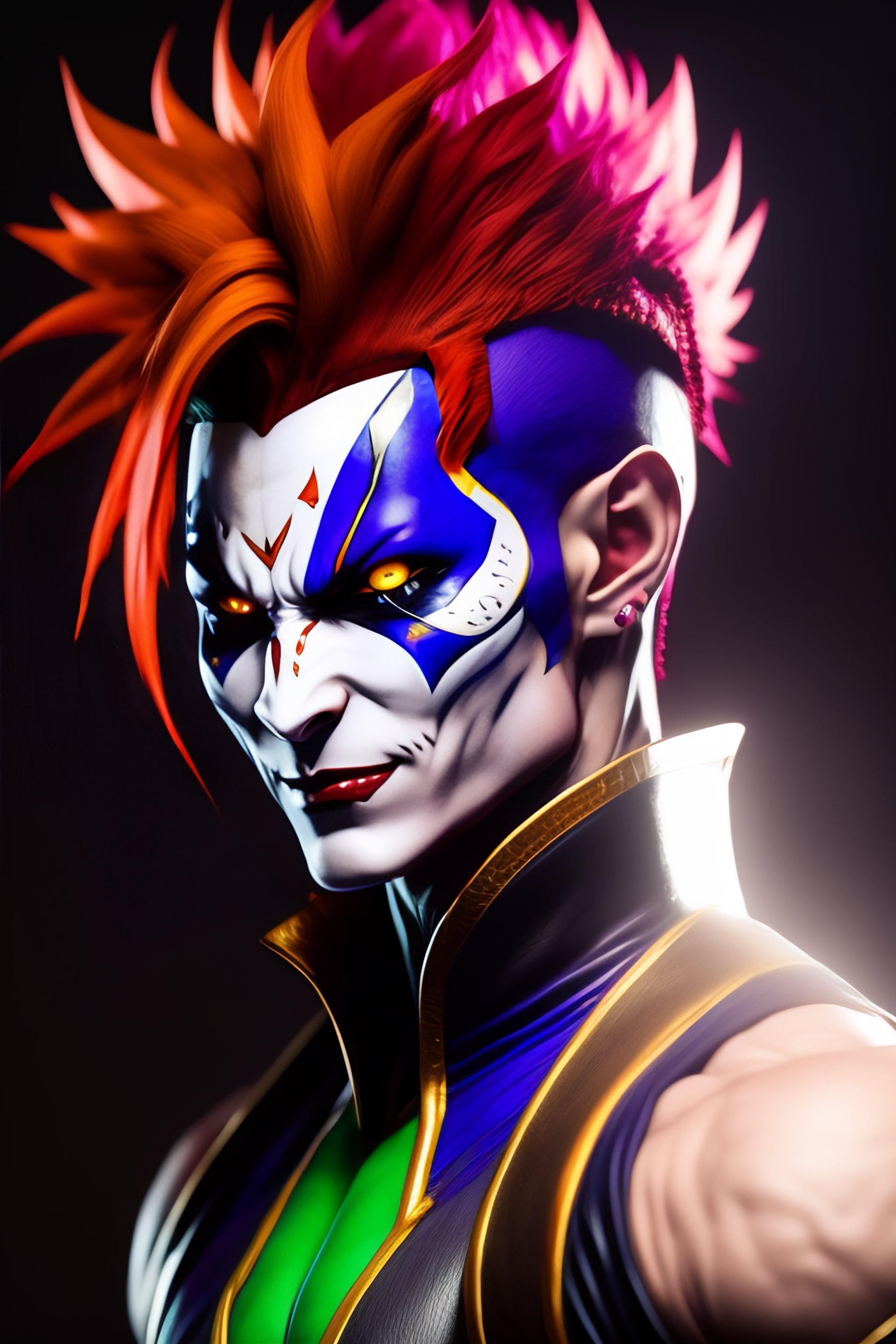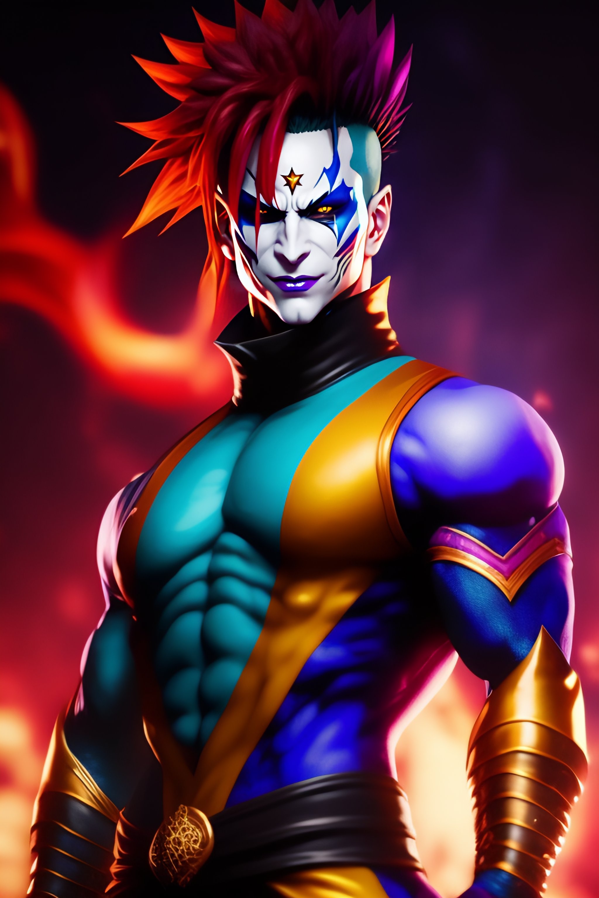 Realistic hisoka from hunter x hunter as a mortal kombat character with his classic teardrop and star face paint, dynamic pose, holding joker cards, dark aura