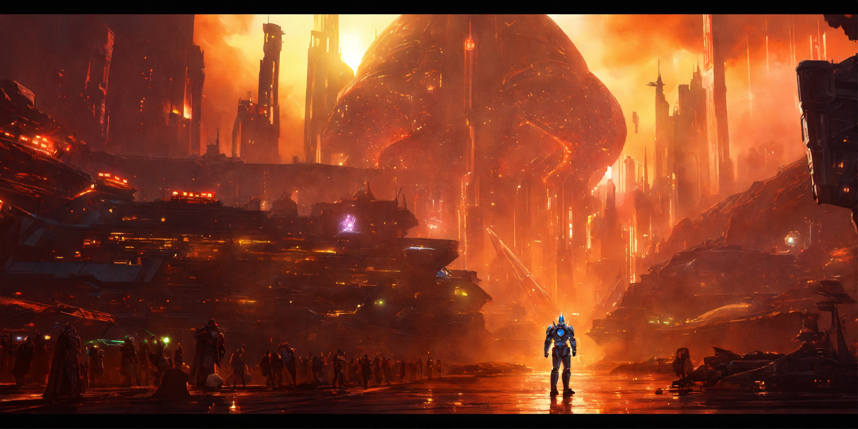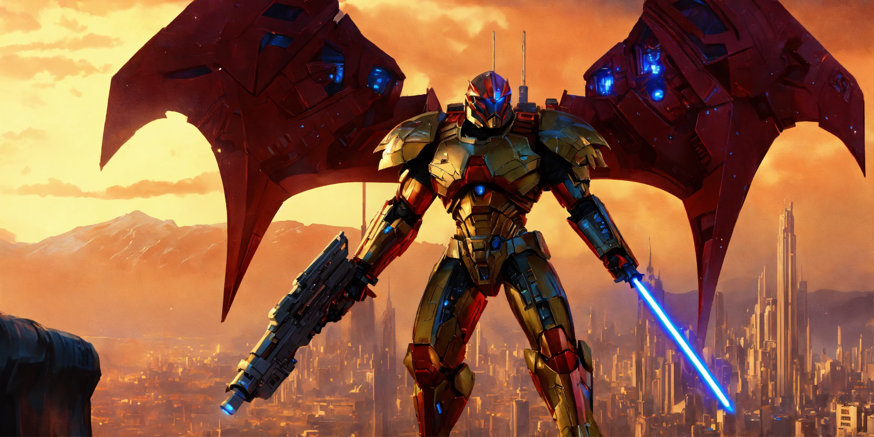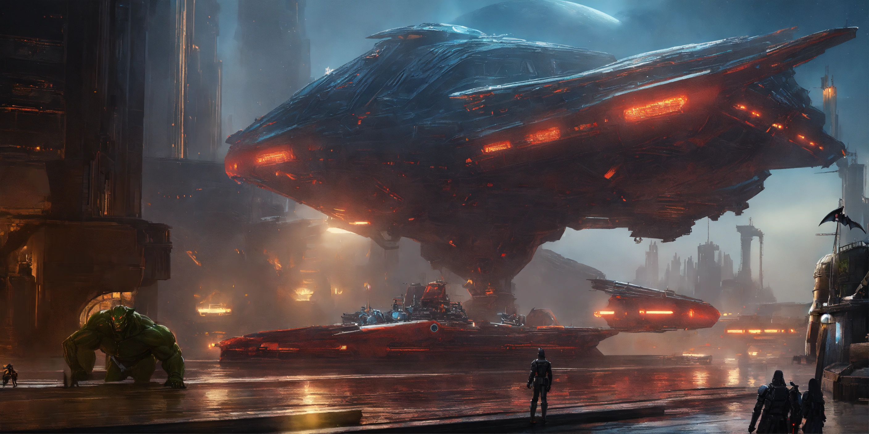 CGI, ghosts, Human-Piasa Bird, Hellbat Armored Knightfall Batman, Kang The Conqueror, Star craft, Odin, Osiris, Raven, Werewolf, Vampires, Cyberdyne Skeletal Skynet Cybernetics, Space station, royal neck guard, kitsch, oversaturated, 90 billion years from 5965 A.D., shiny cinematic 8K resolution, peak anatomy, articulated CGI scenes, H. R. Giger, God Of War smoking Laser Blasters & Plasma Canons, Chromatic Legions, Purple Metallic, Mat-finished accents, Boston Dynamics, Flowing Plasma-Capes, articulate claws, Traffic, Majestic Hover Trains, electricity charged magnetic wings, malformed claw hands, focused musculature, Wolverine, X-7 cybernetic metallic extended claws, Godzilla, Gothic rendering, midnight starlit skies, blue skylines, glowing sci-fi city, Future Advanced Backlit Mega Gotham City, Catalhoyuk, Floating Corinth Cyber-Scape, Hovering Metropolis, New York, New Roman Empire, mutilated exhausts, futuristic, star trek advanced futuristic alien golems, populated water worlds