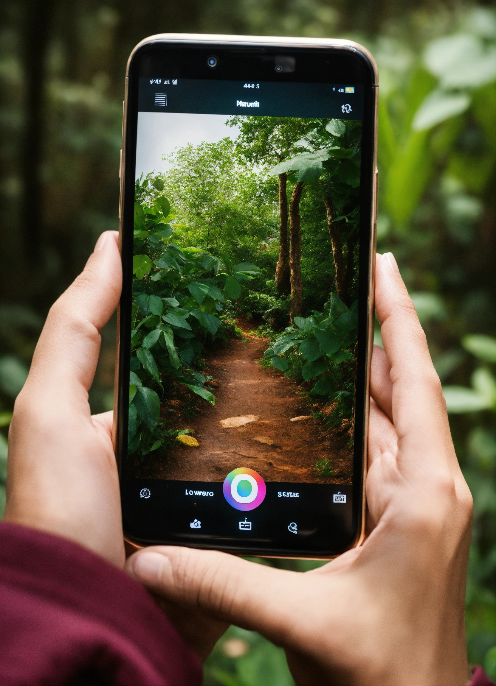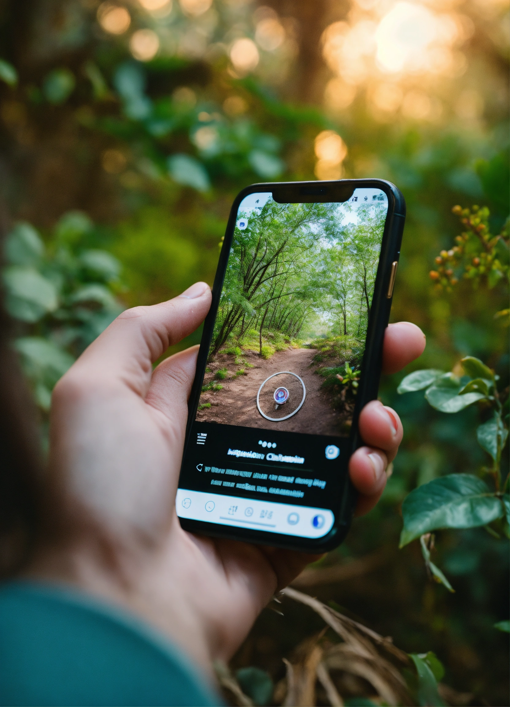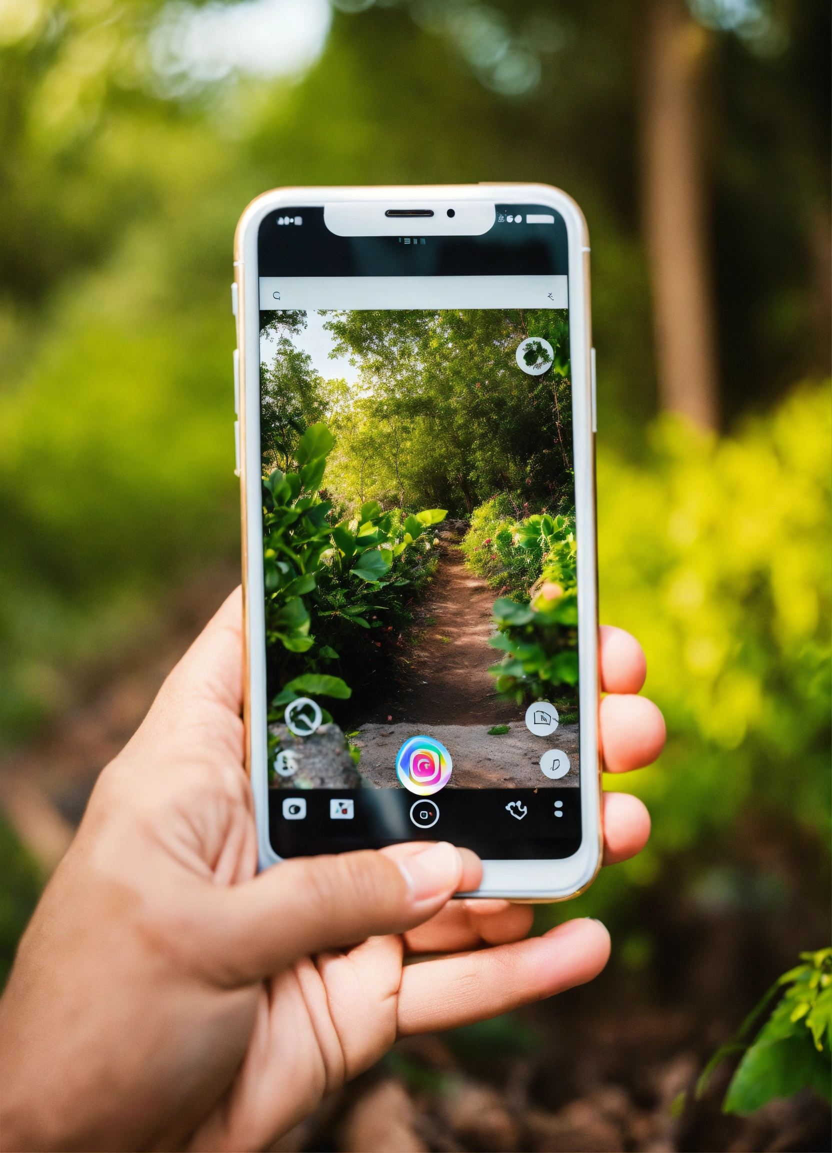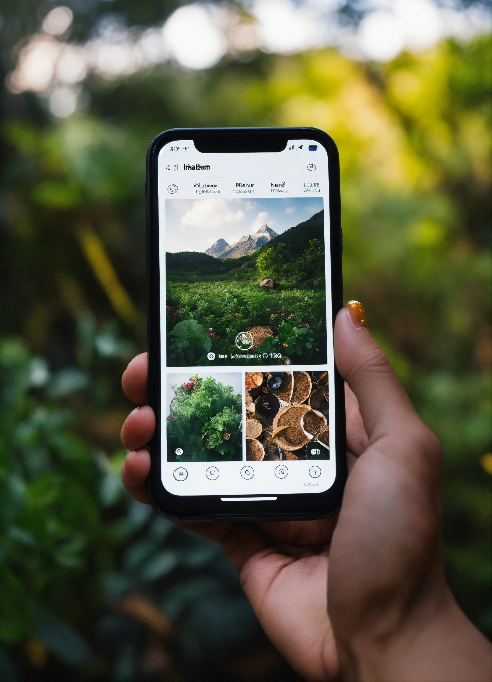 Image of a hand clicking on the instagram, on the smartphone. background natural materials, light colours, vegetation