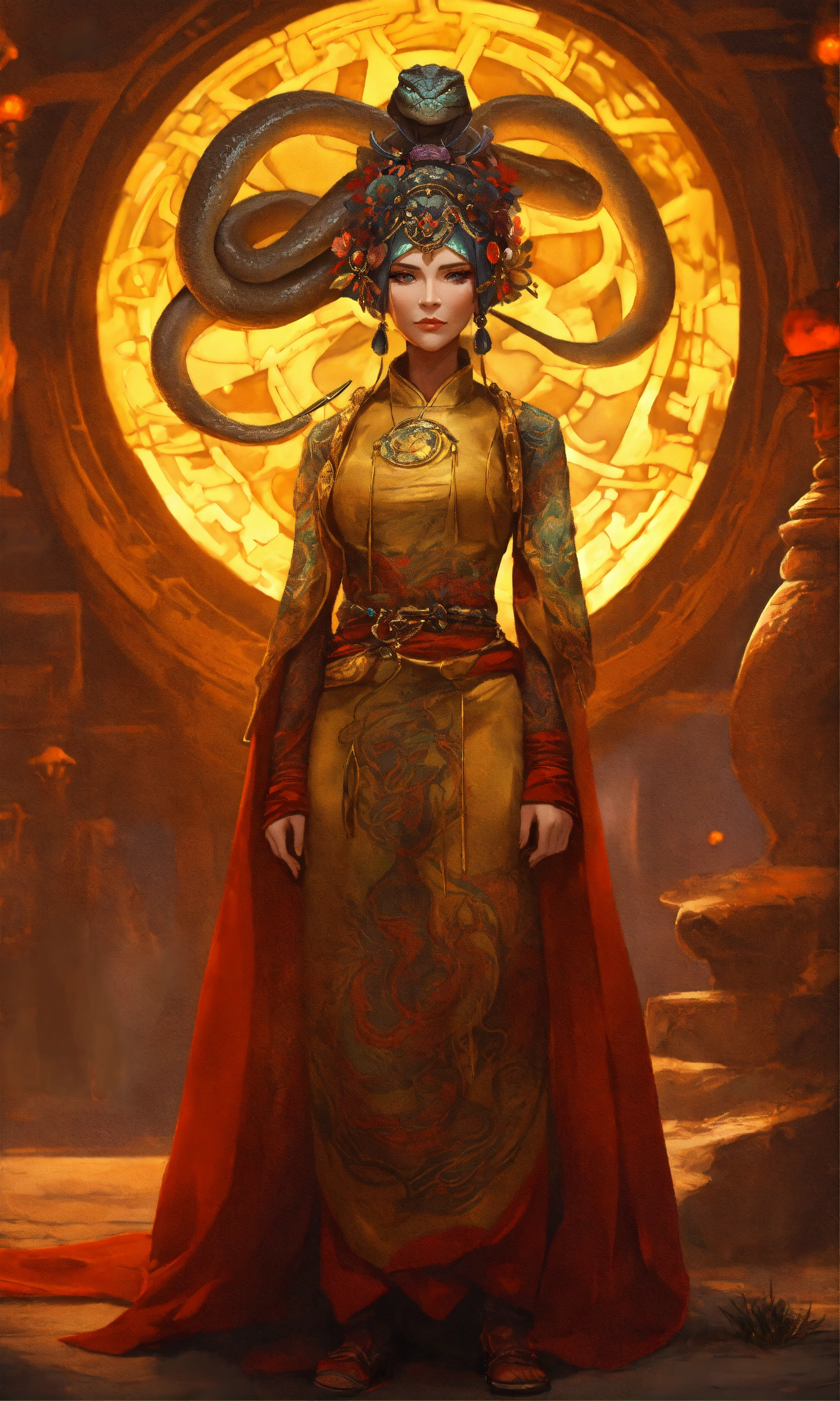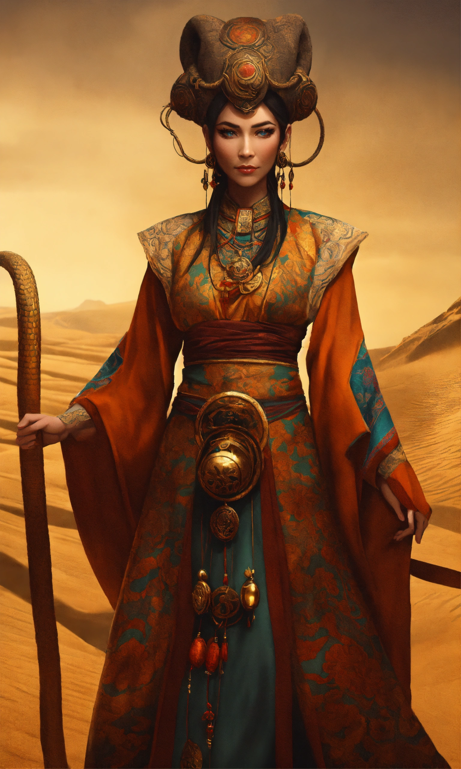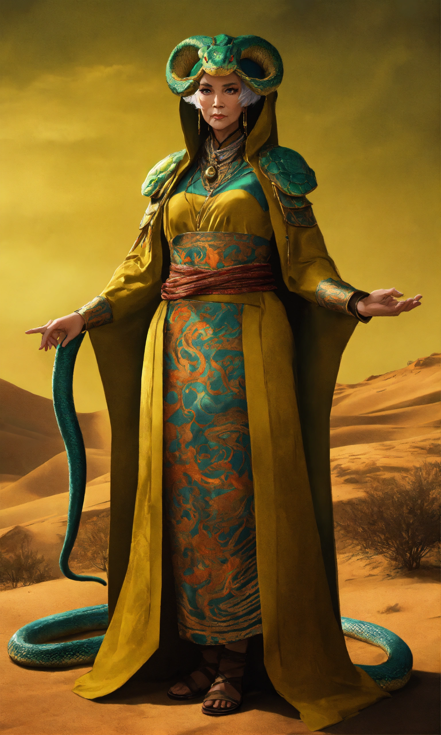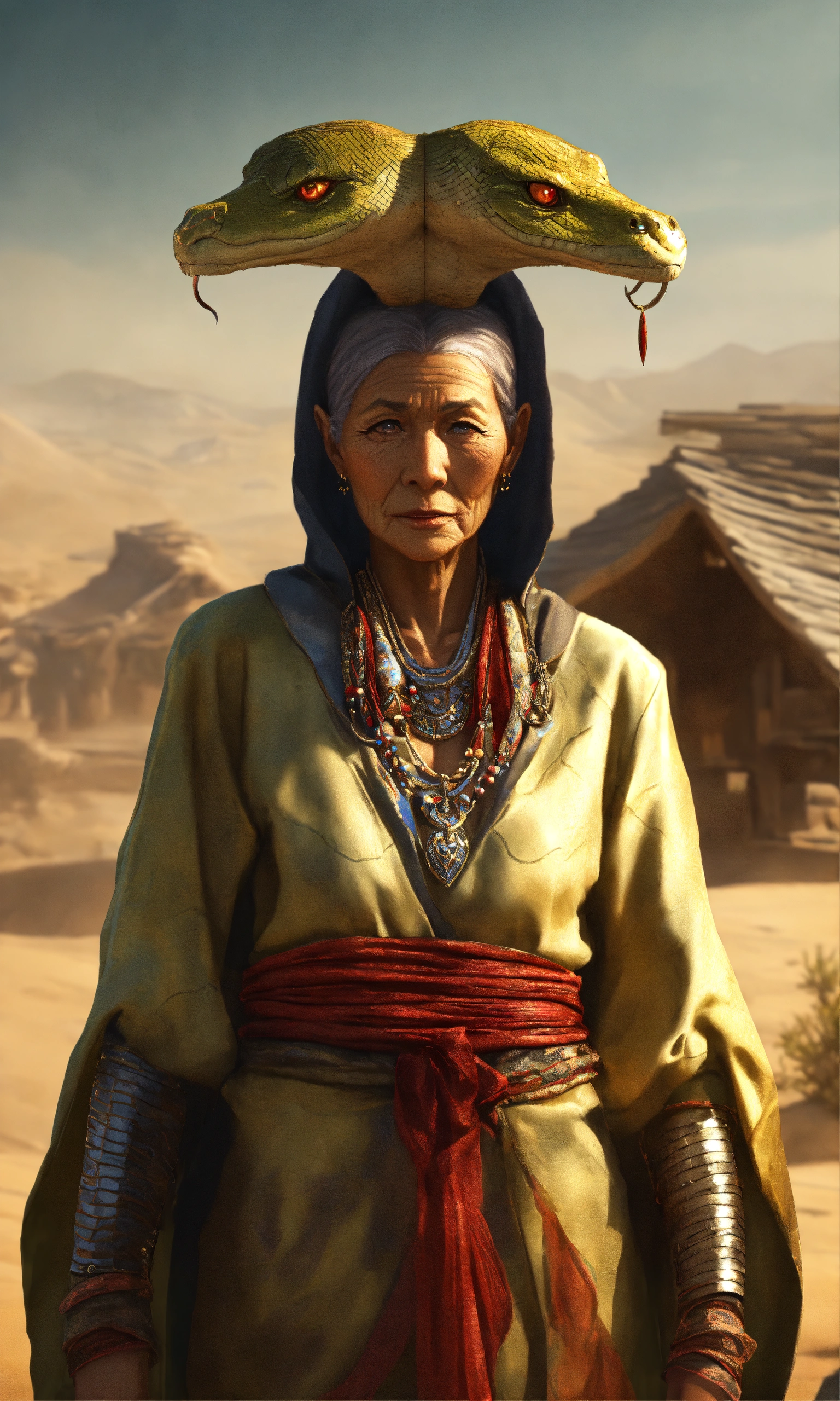 Draw an elderly yuan-ti woman who embodies both the menacing aura of a snake and the cunning intelligence of a humanoid. her eyes should be hypnotic, and her attire should look like it's made for arcane rituals. her skin should be scaled like a reptile. standing in a desert village, golden ratio, smooth, highly detailed, sharp focus, cinematic, 4k
