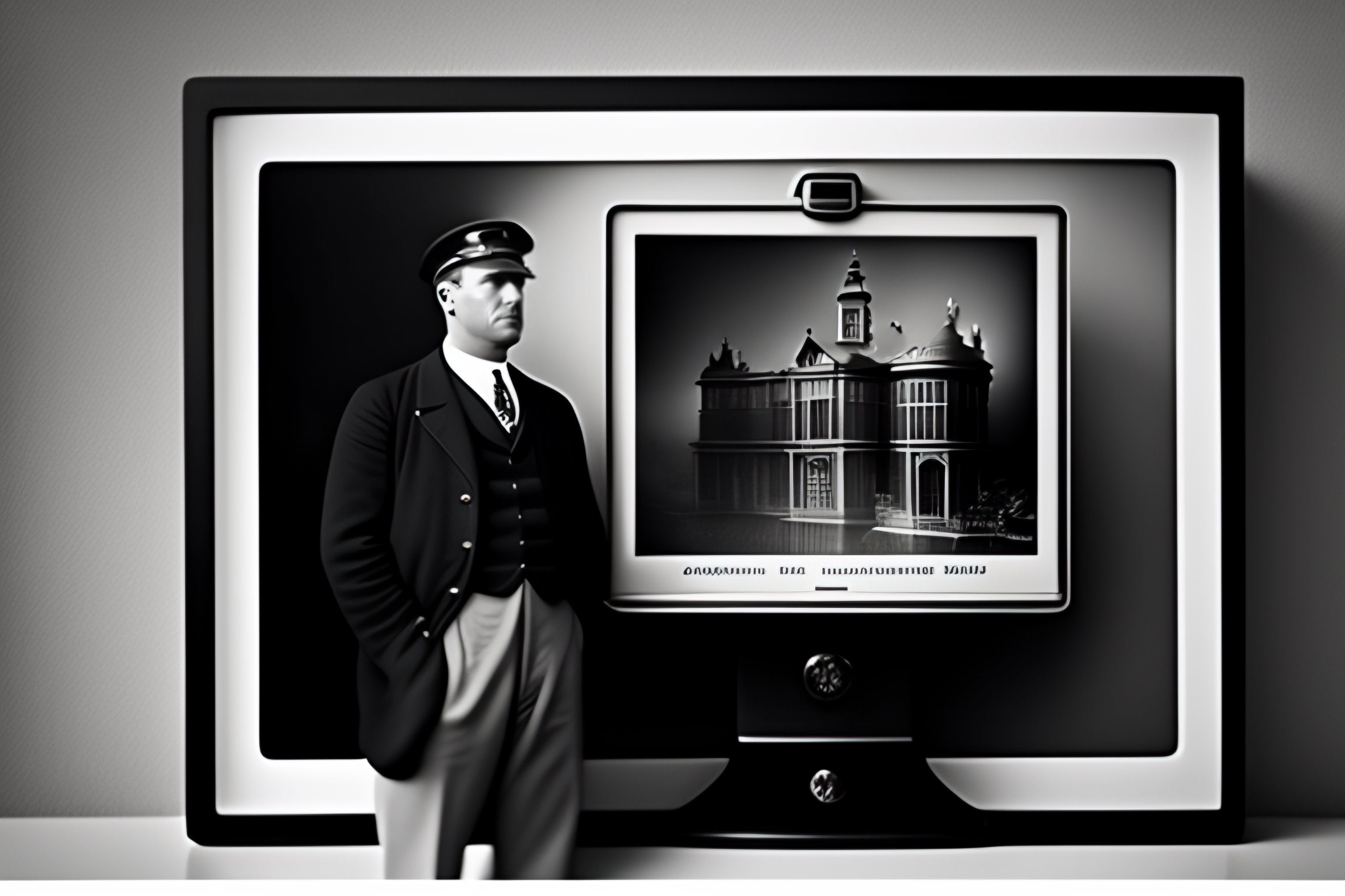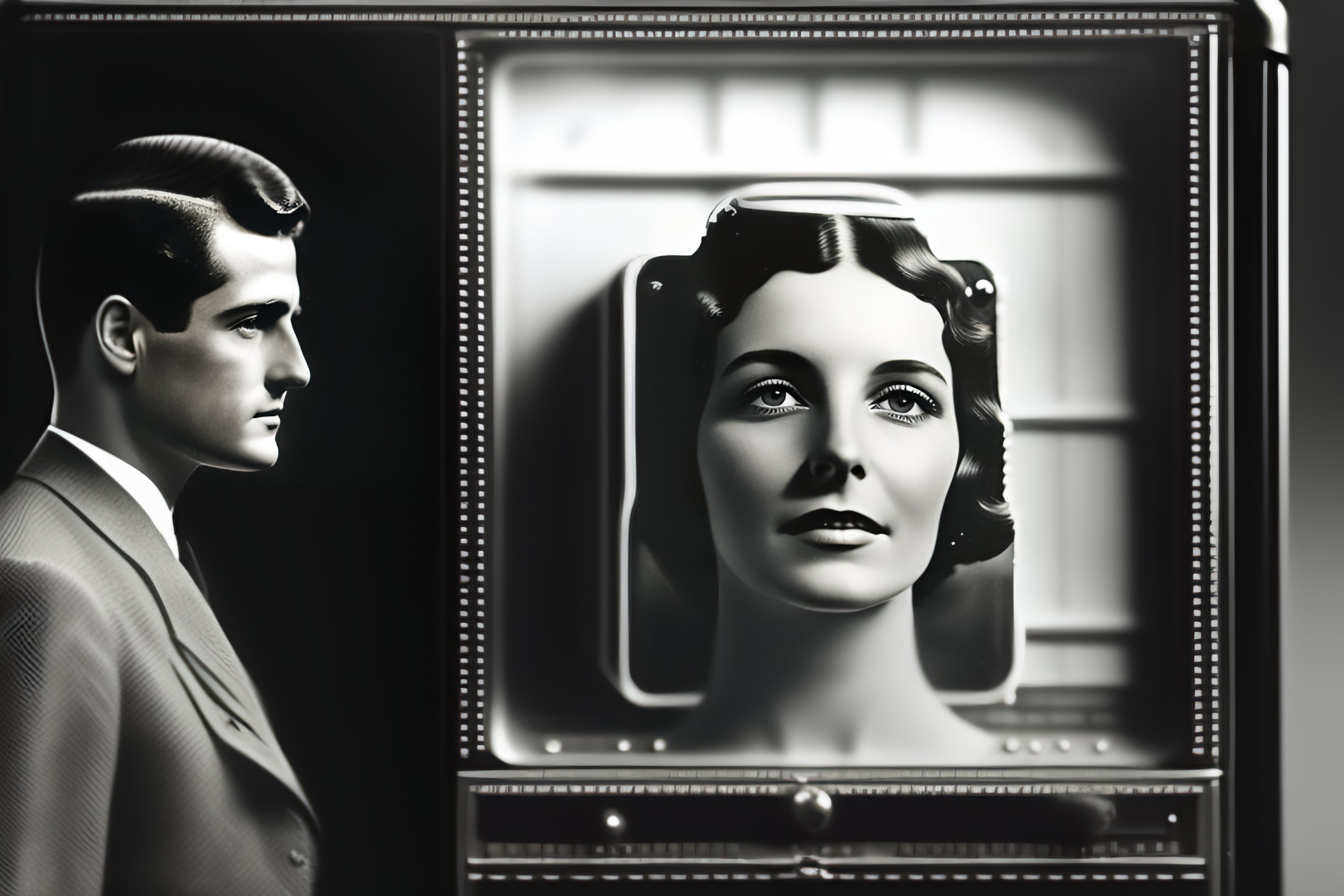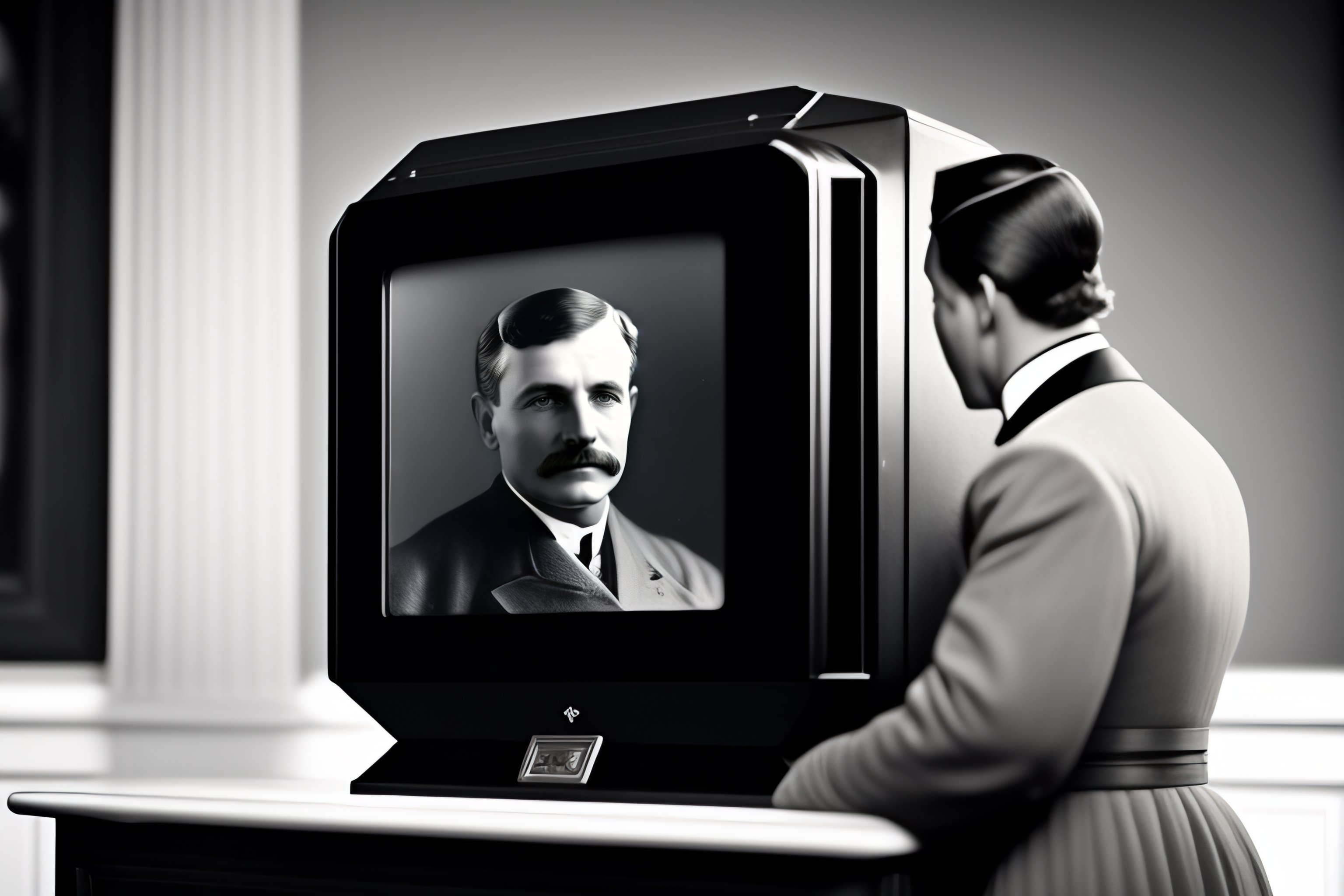 Old time photo, photo realistic photo of a modern day computer in the 1800s black and white damaged photo with person standing next to it presenting in portrait