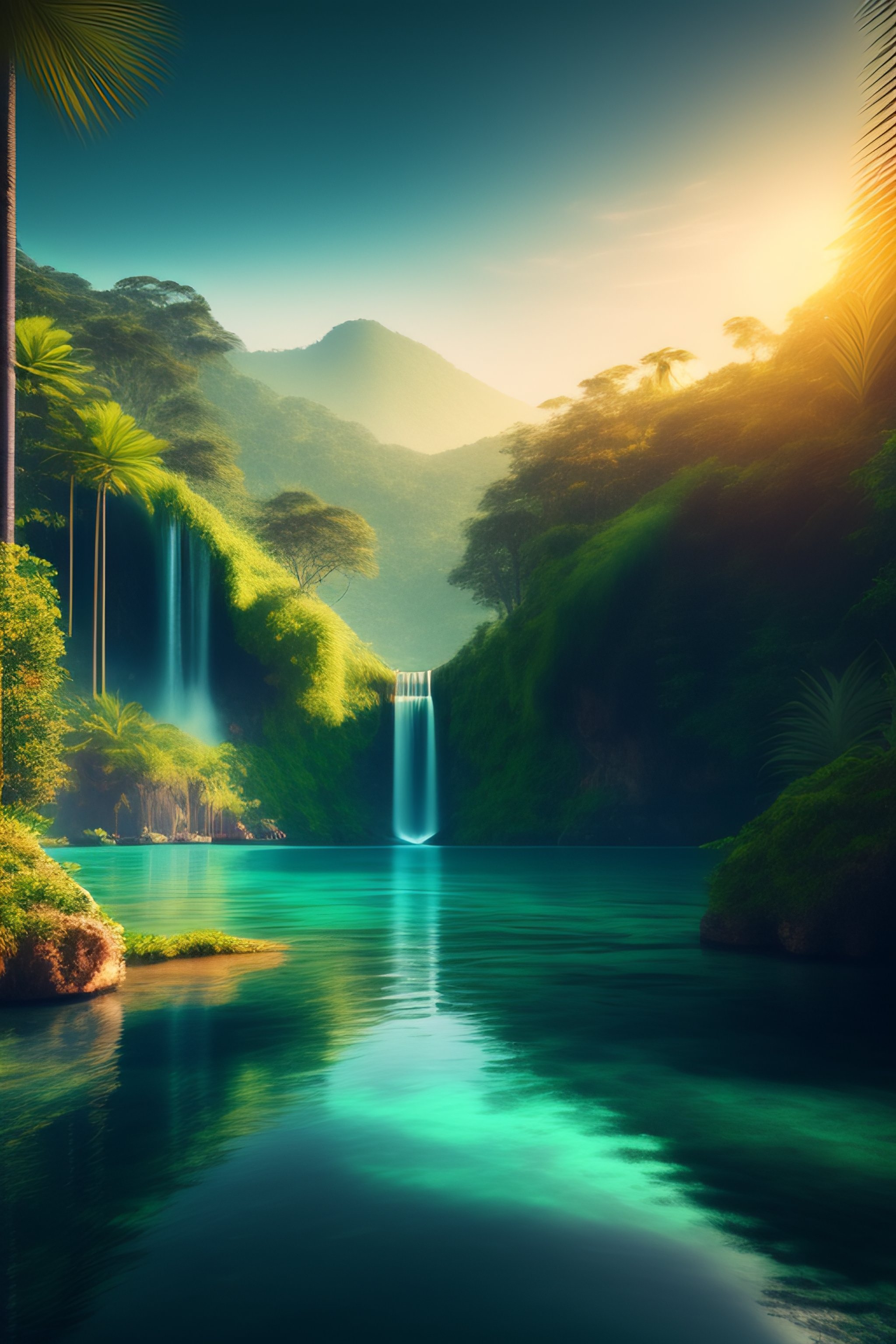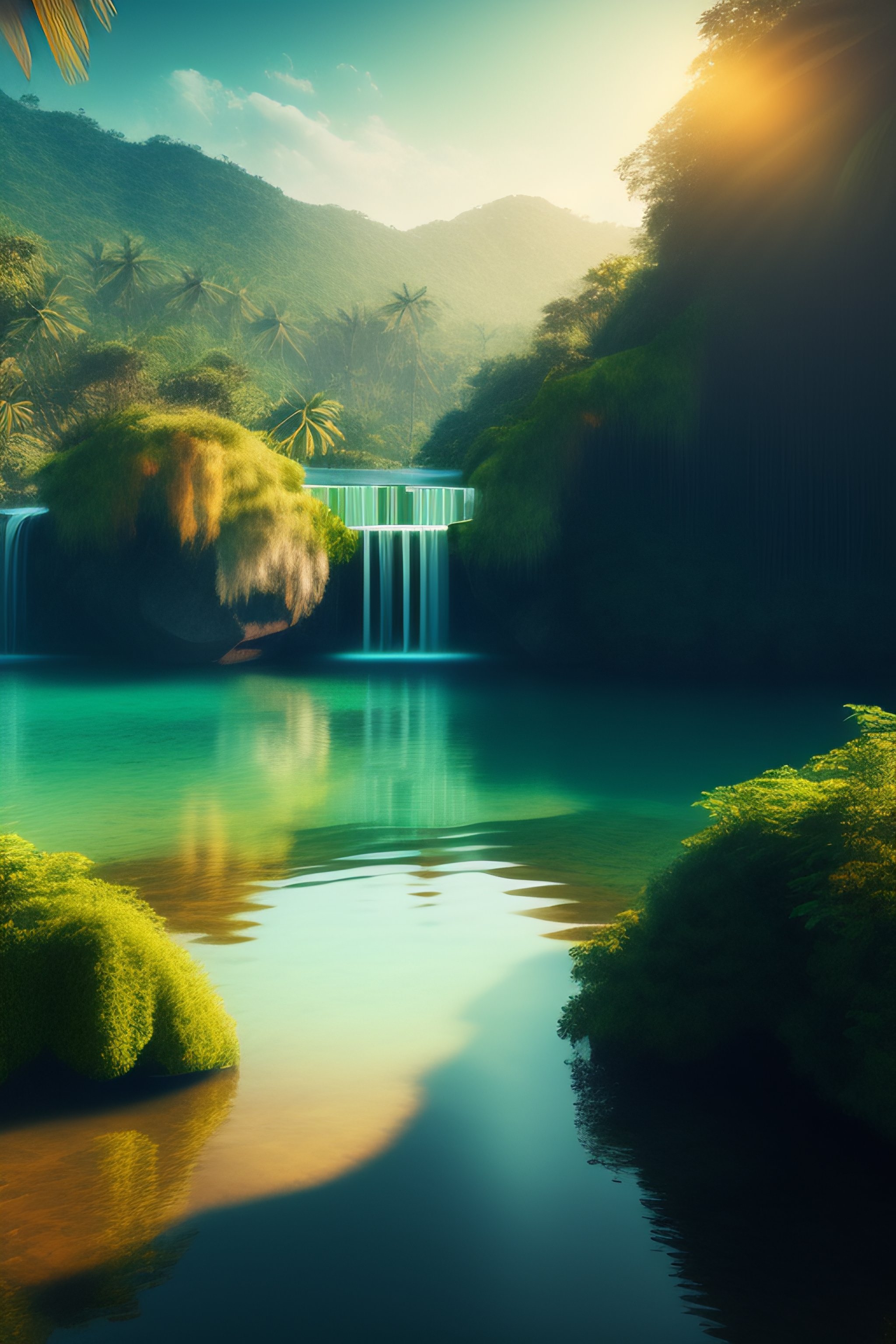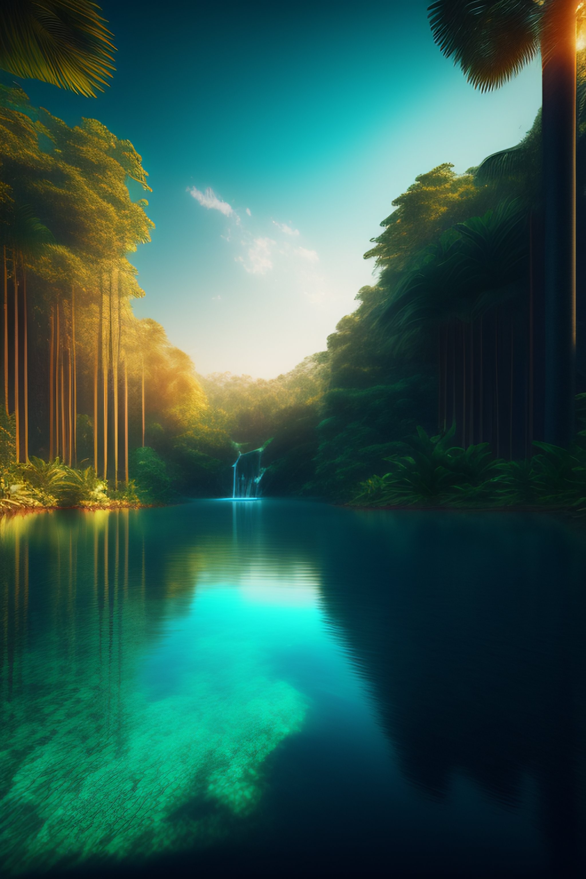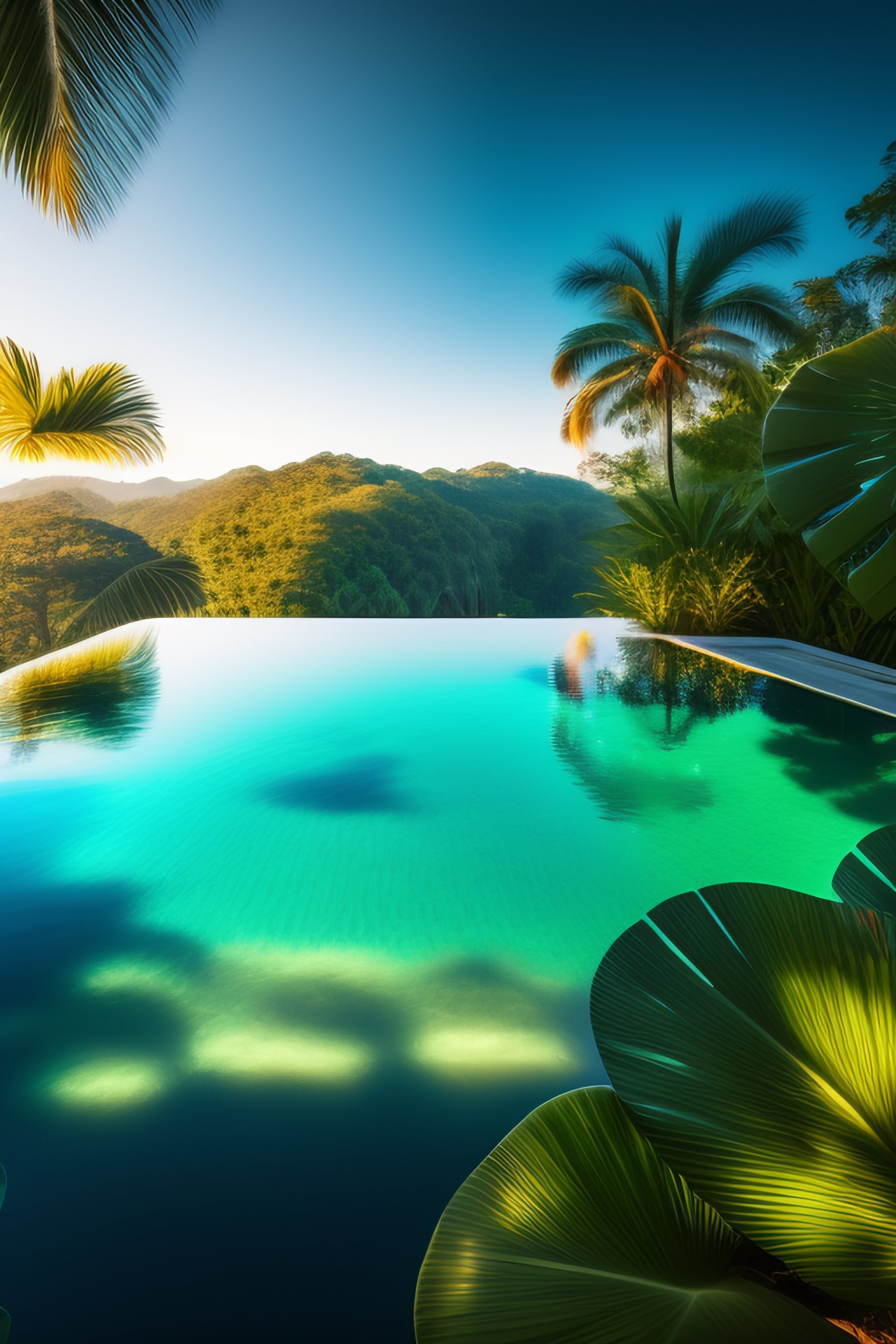 Infinity pool with a tropical forest in the background, high resolution, detail, 8 k, dslr, good lighting, ray tracing, realistic