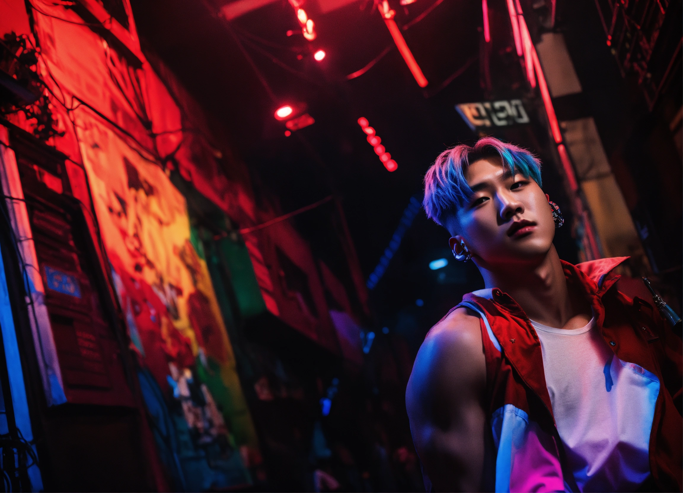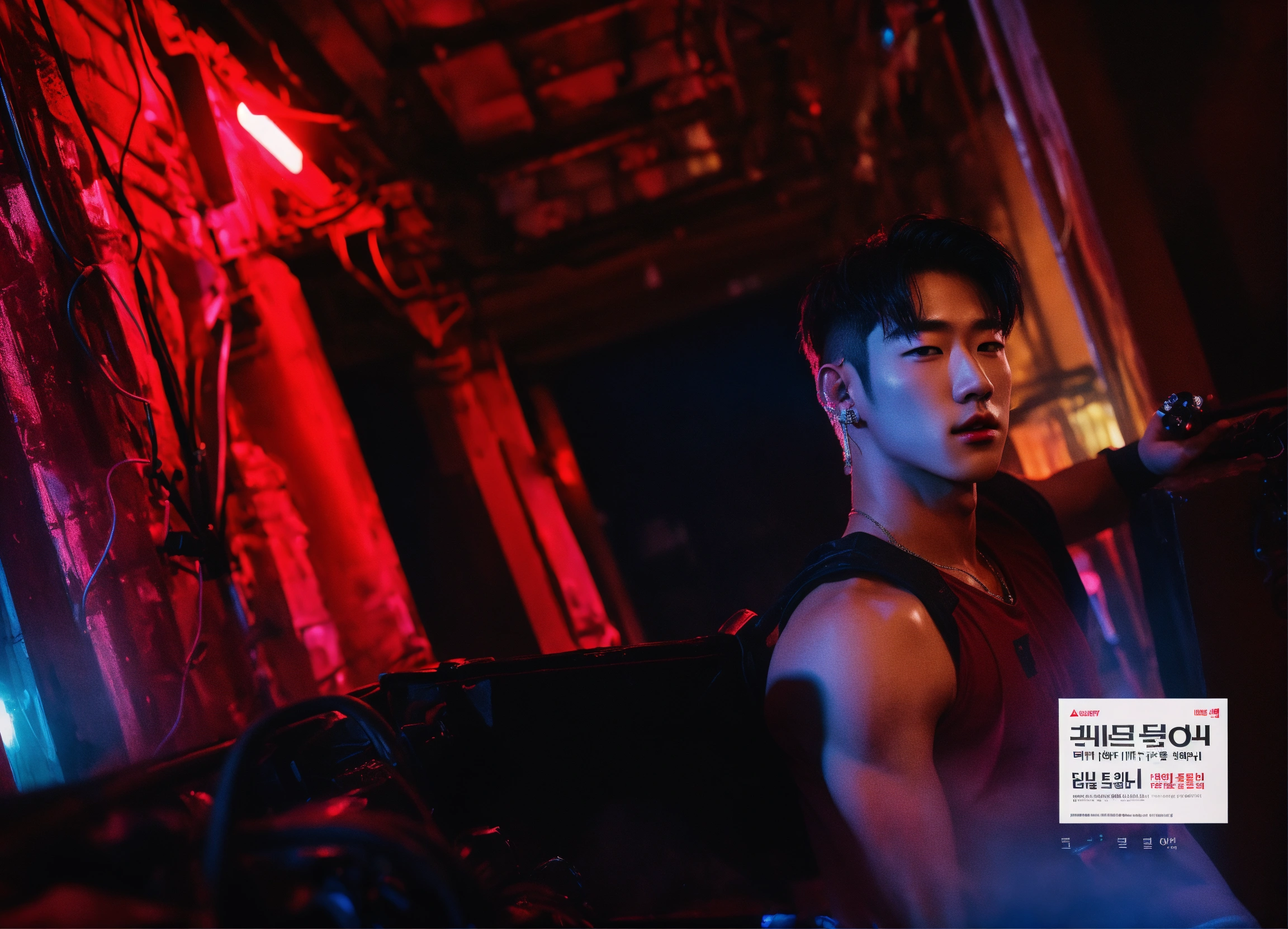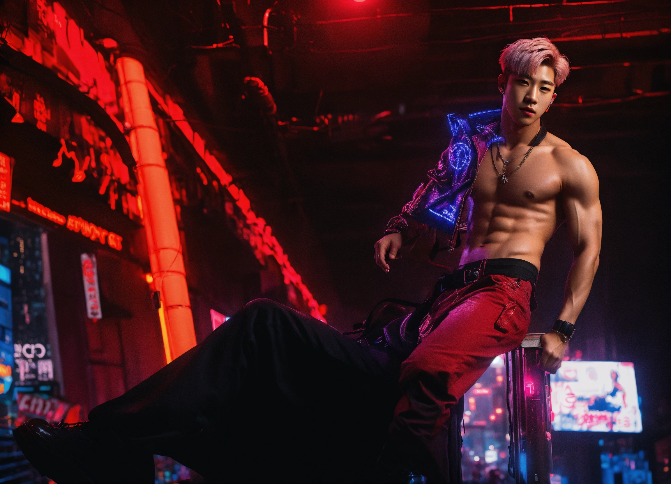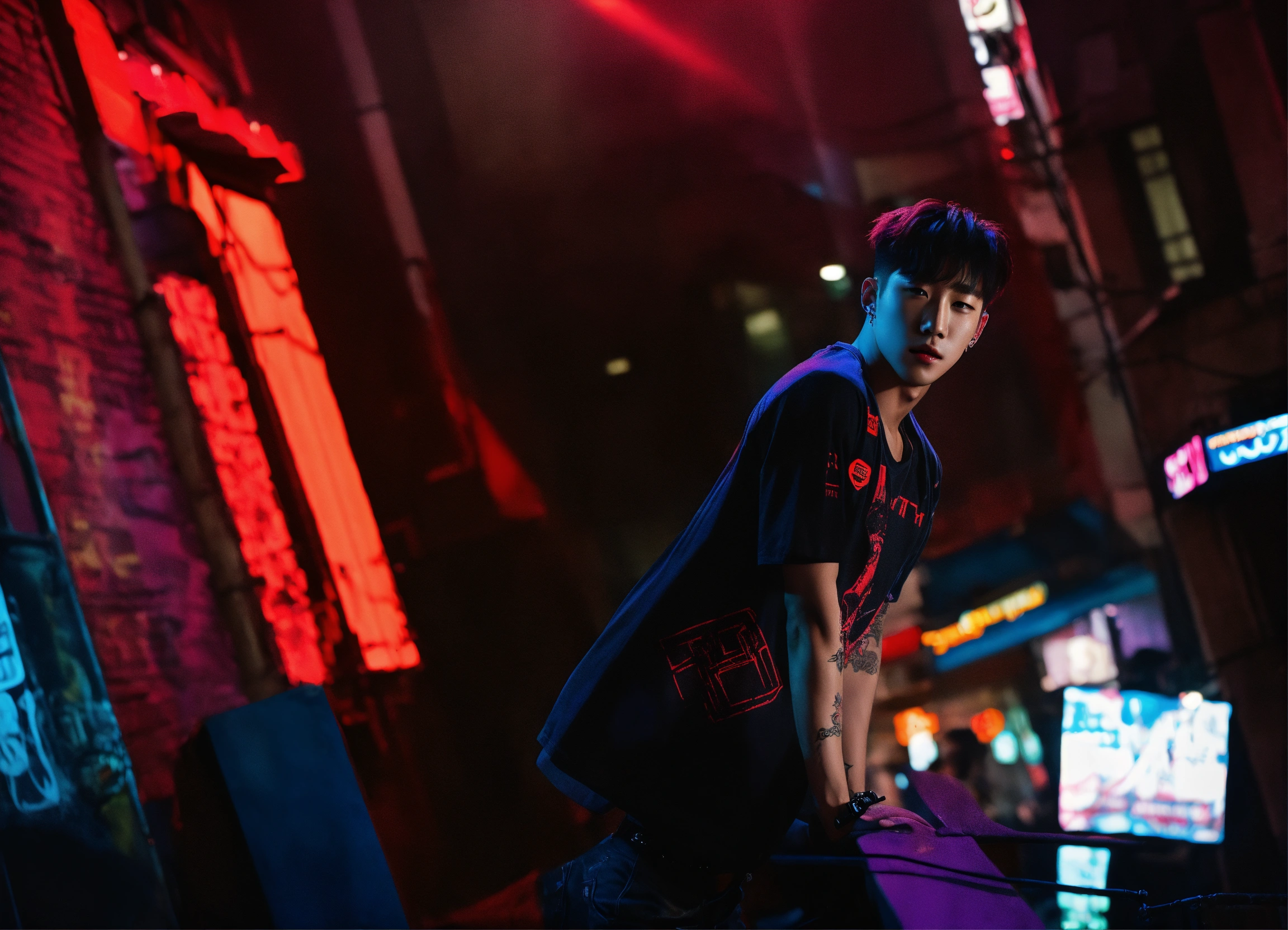 Pin-up poster of fit south korean male idol wonho wearing a blank red t-shirt in a cyberpunk cityscape, dark fantasy steamy atmosphere, dramatic lighting, colorful neon
