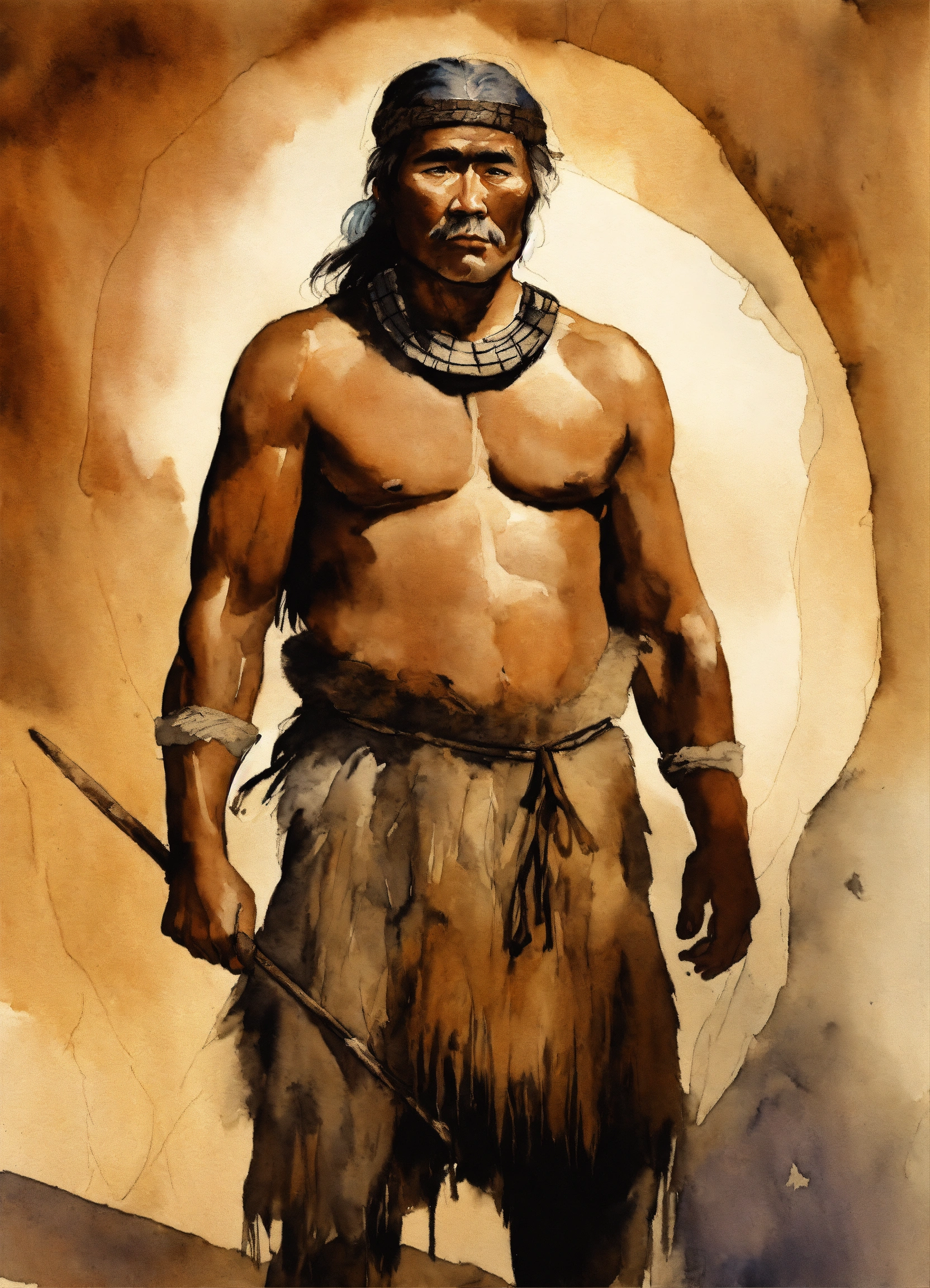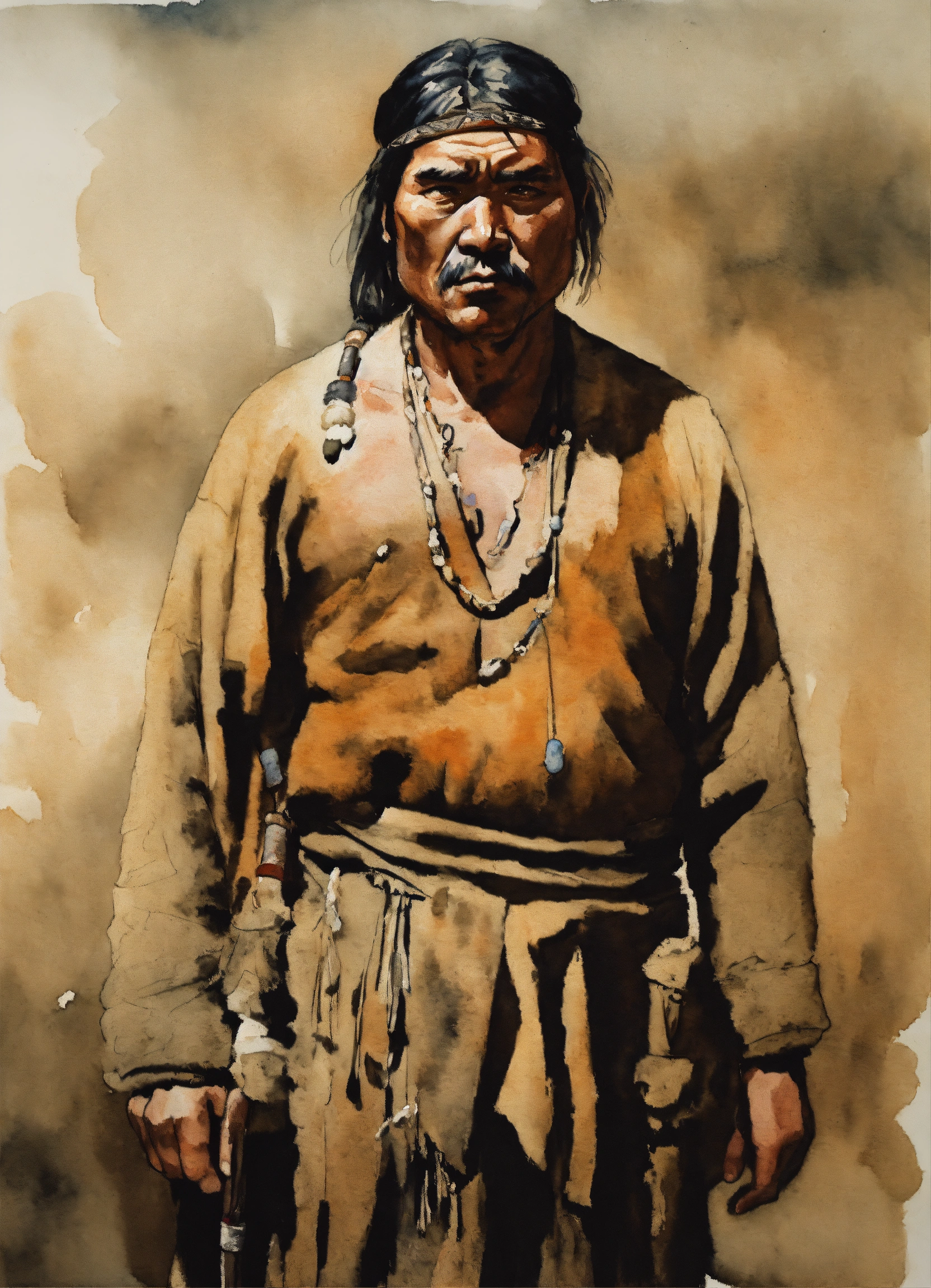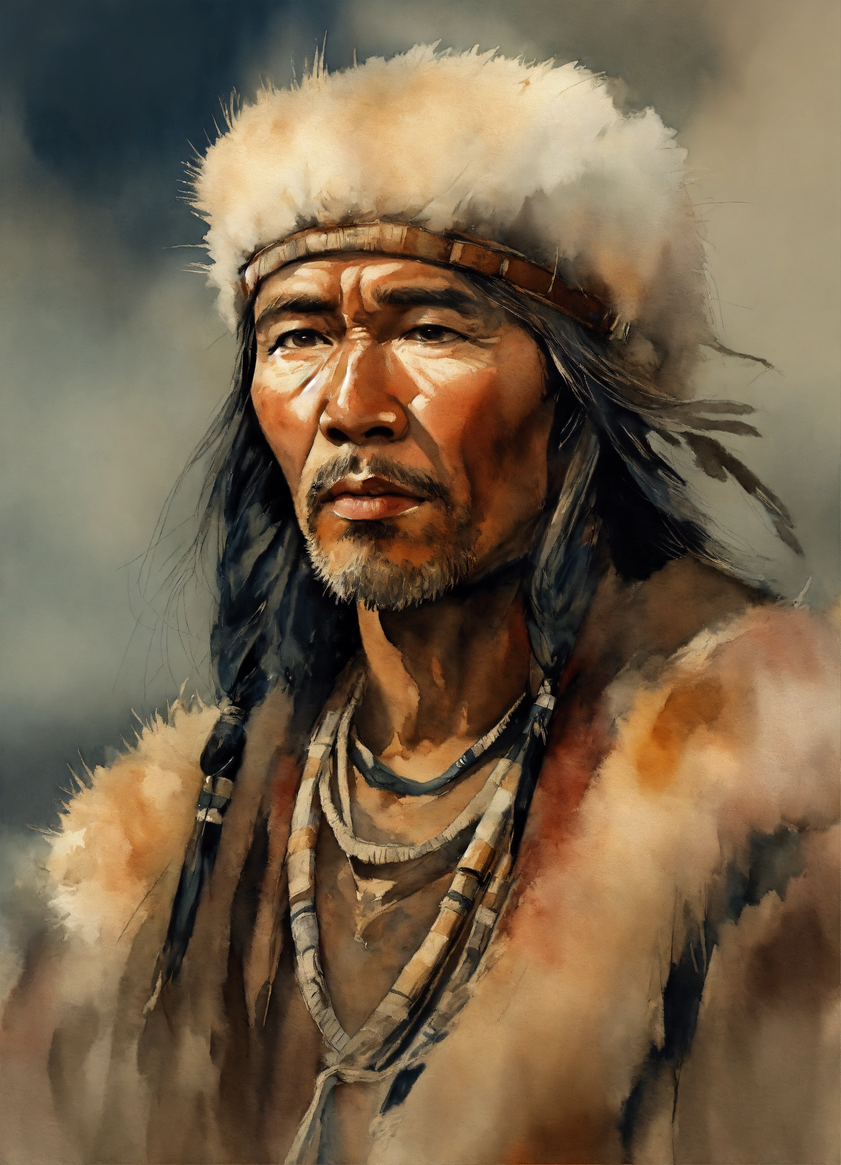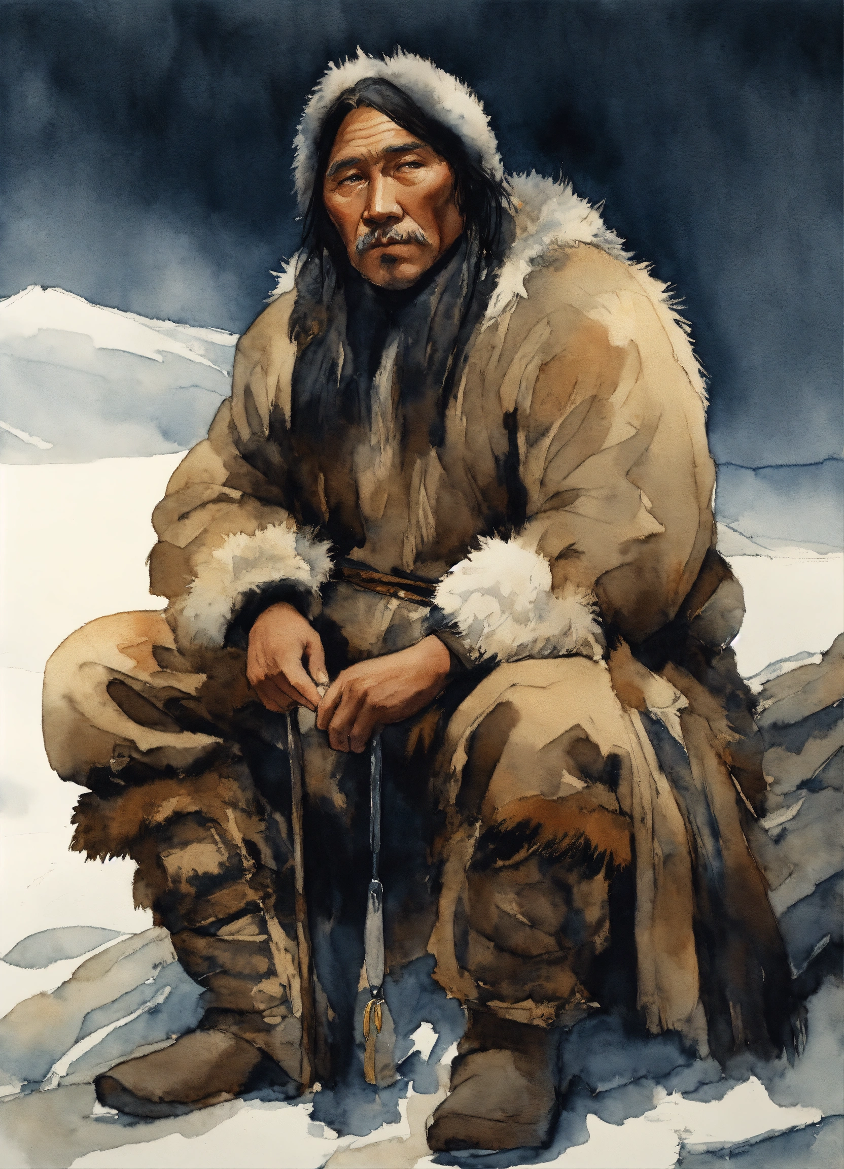 Illustration by tom björklund of a siberian "aboriginal" middle age man wearing arctic paleolithic clothing. he has asian phenotype. watercolor tracing by tom björklund, dark hues, gloomy and depressing, masterpiece.
