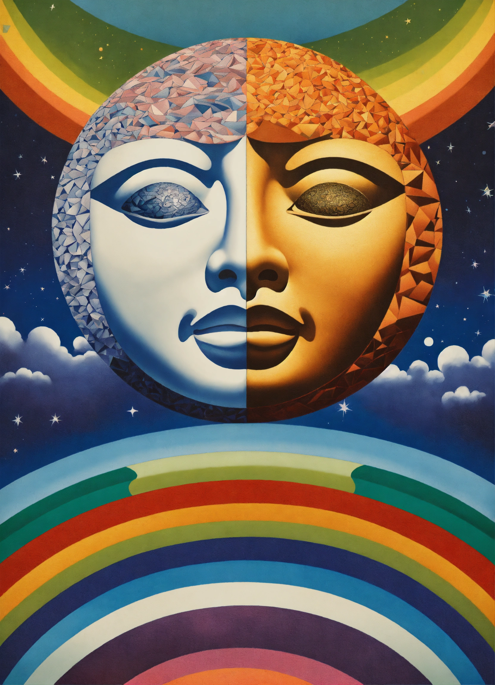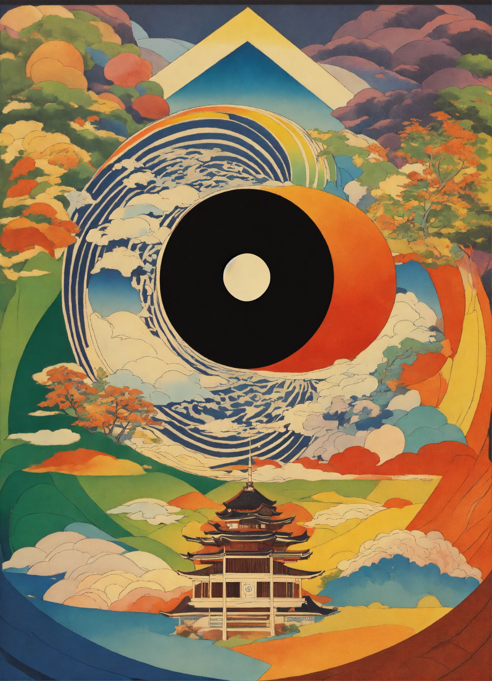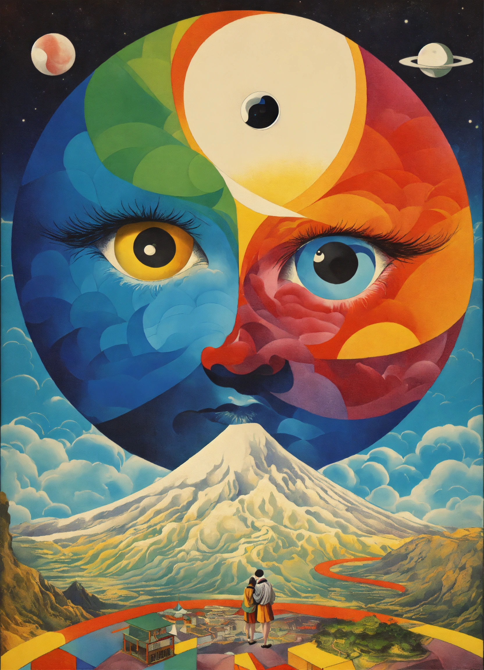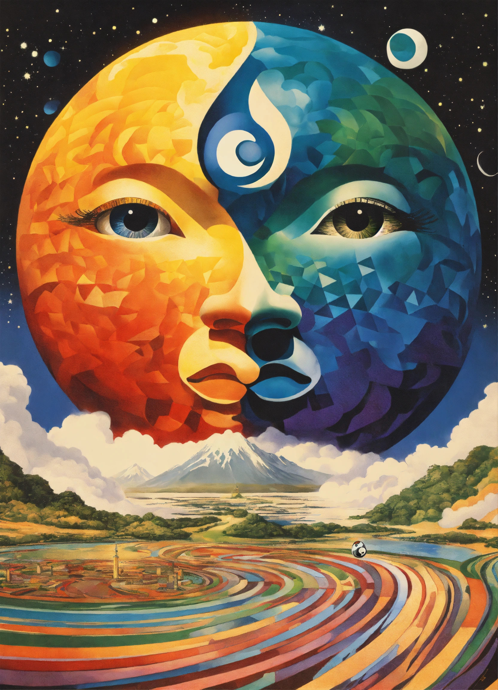 Japanese vintage poster, ying yang head merging into another ying yang head, dream dimension, geometric background, rainbow abstract cosmos meets earth by maurits cornelis escher