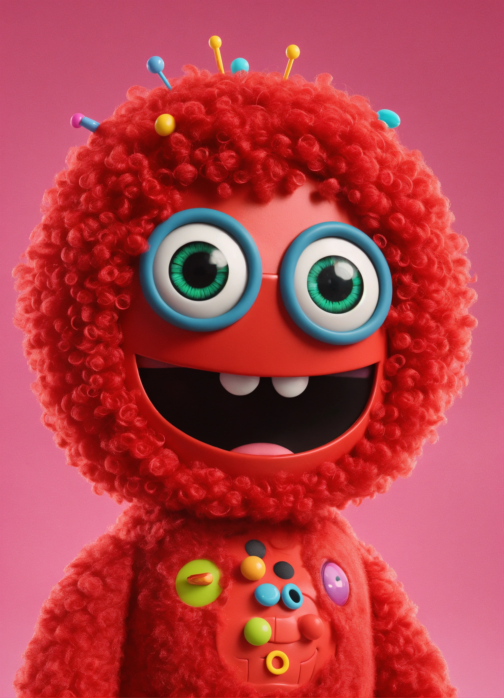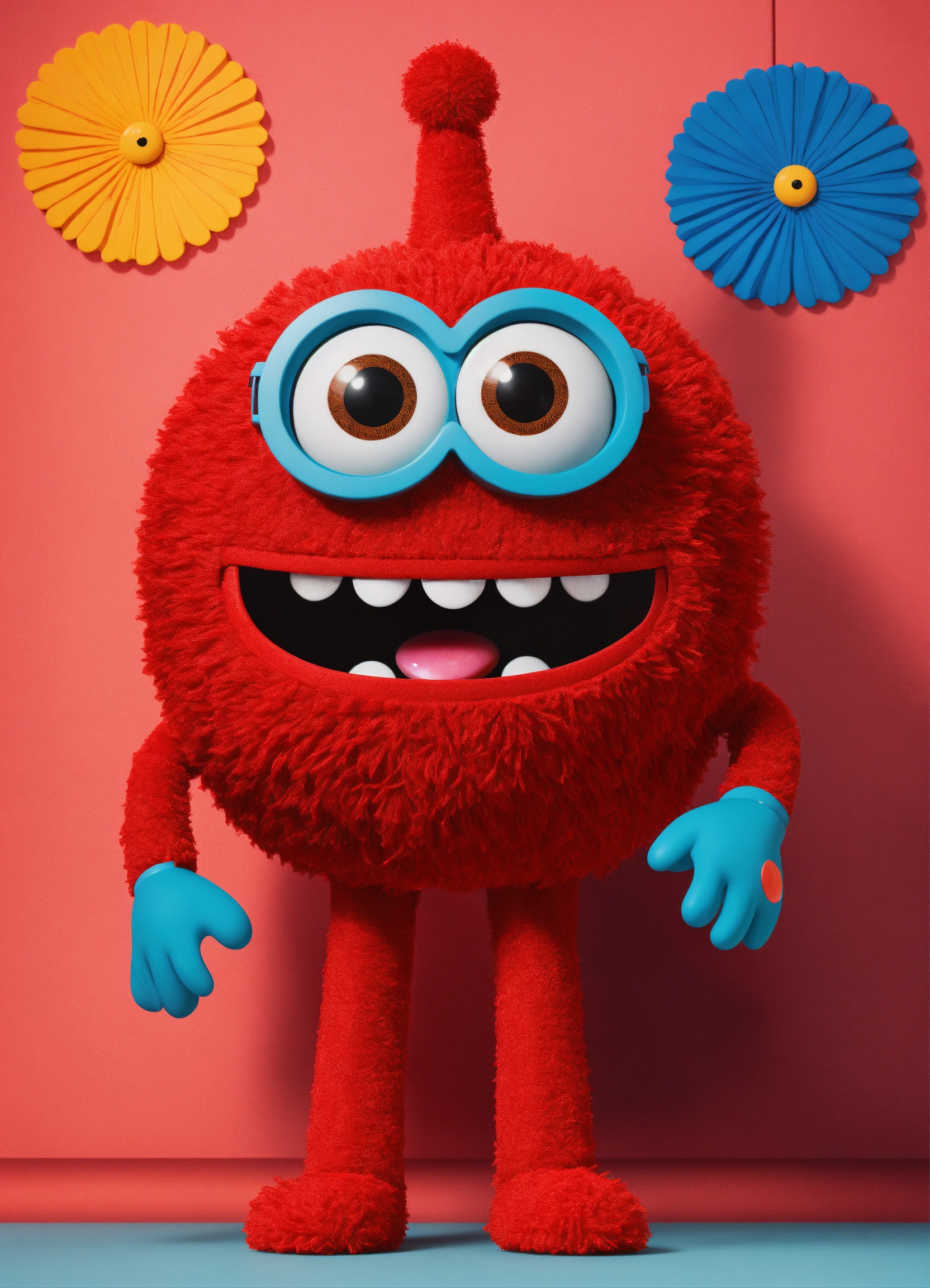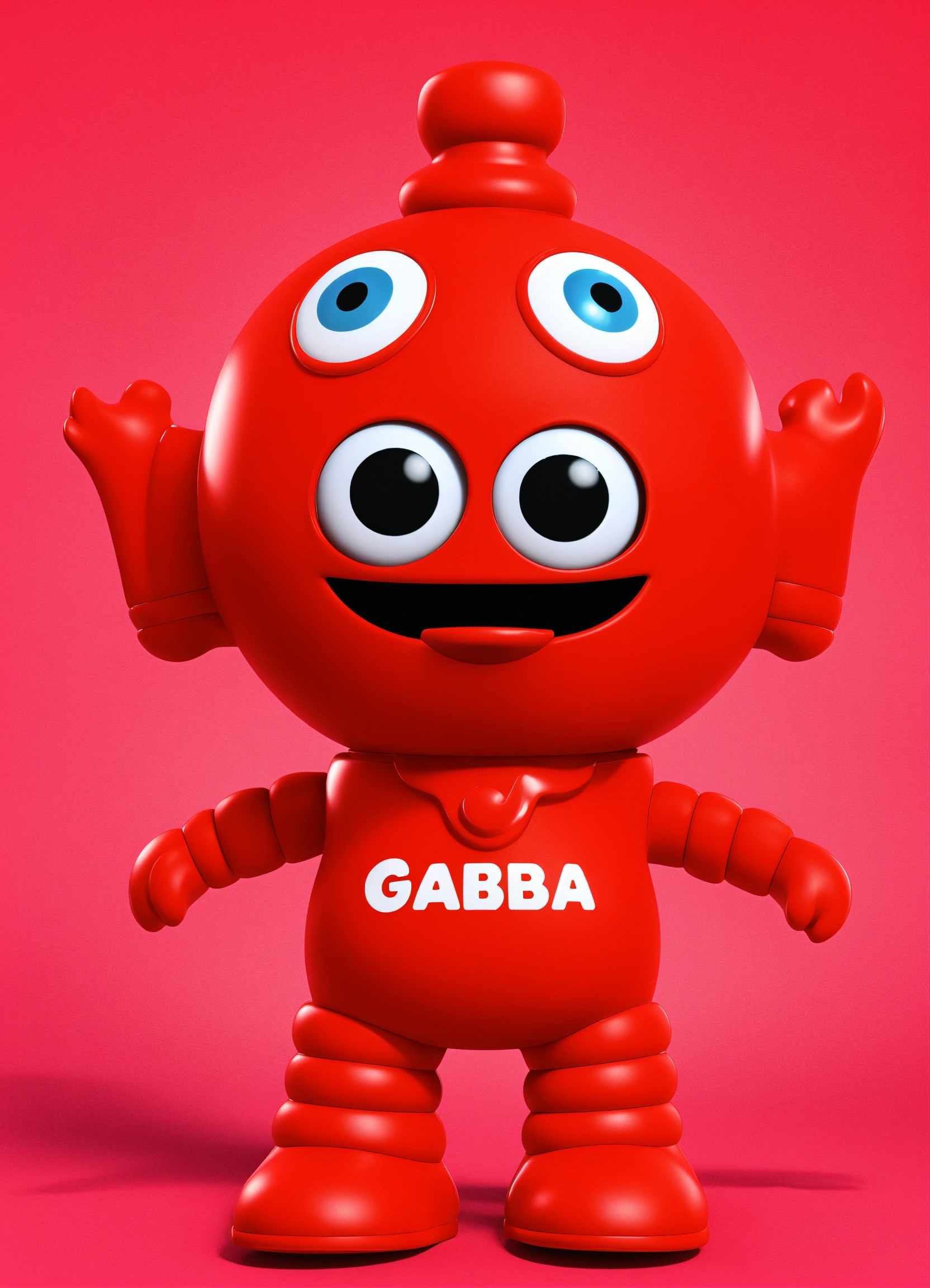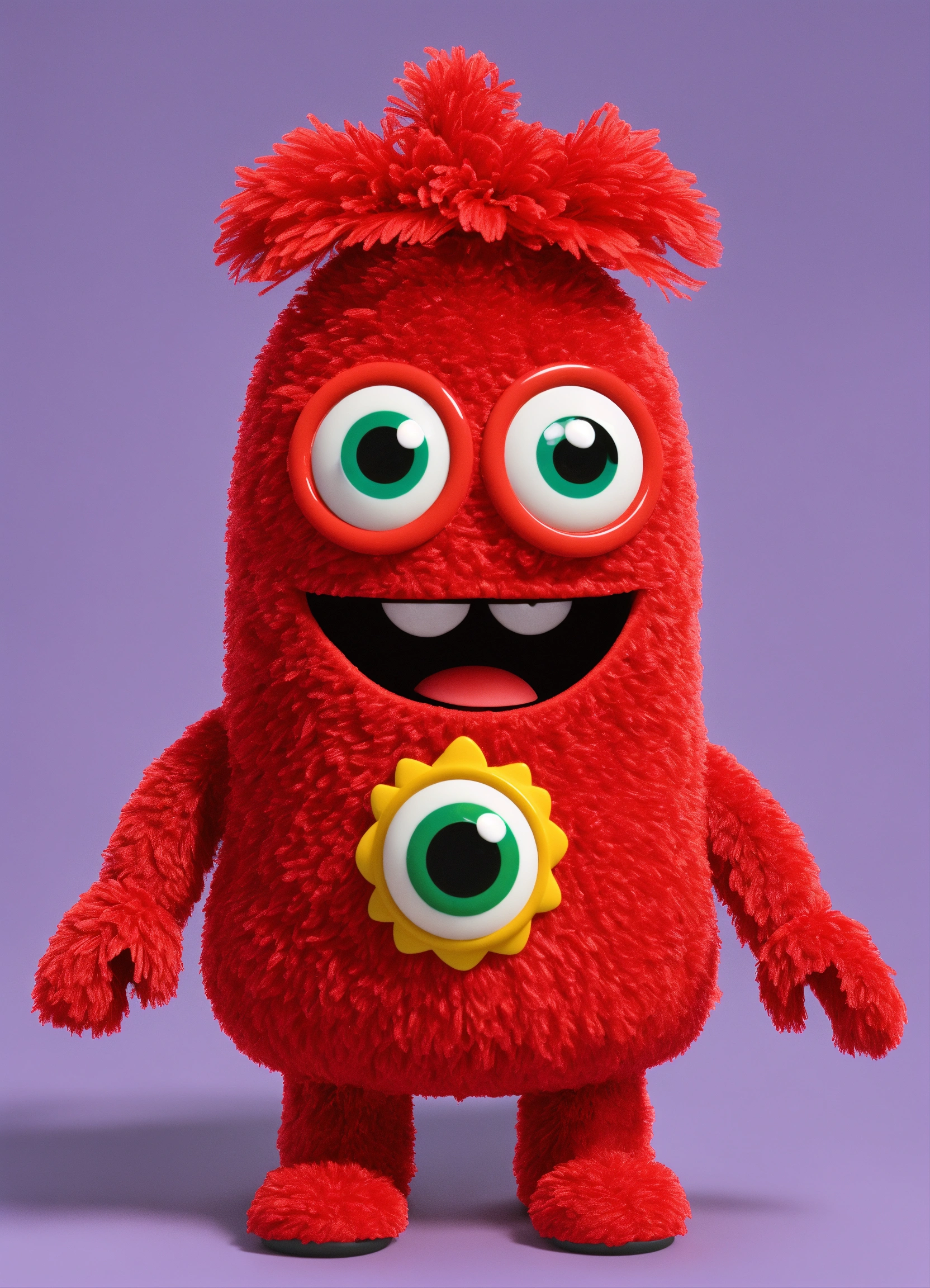 Create a cute yo gabba gabba red female character with cute eyes, playful looking in front of the camera and smiling in 3d
