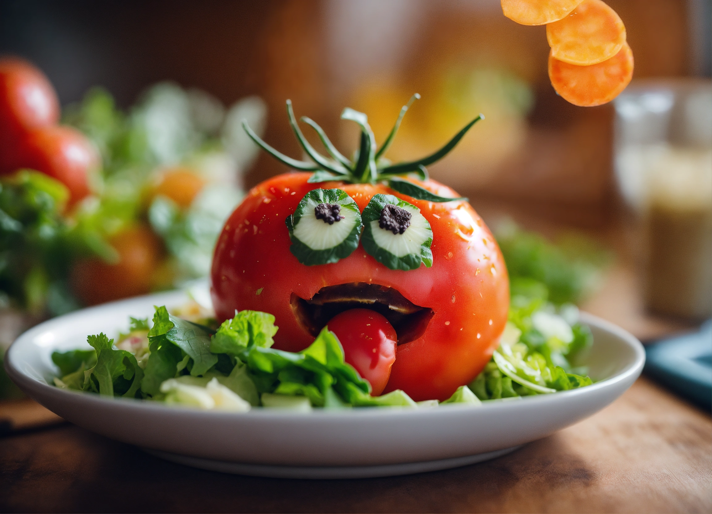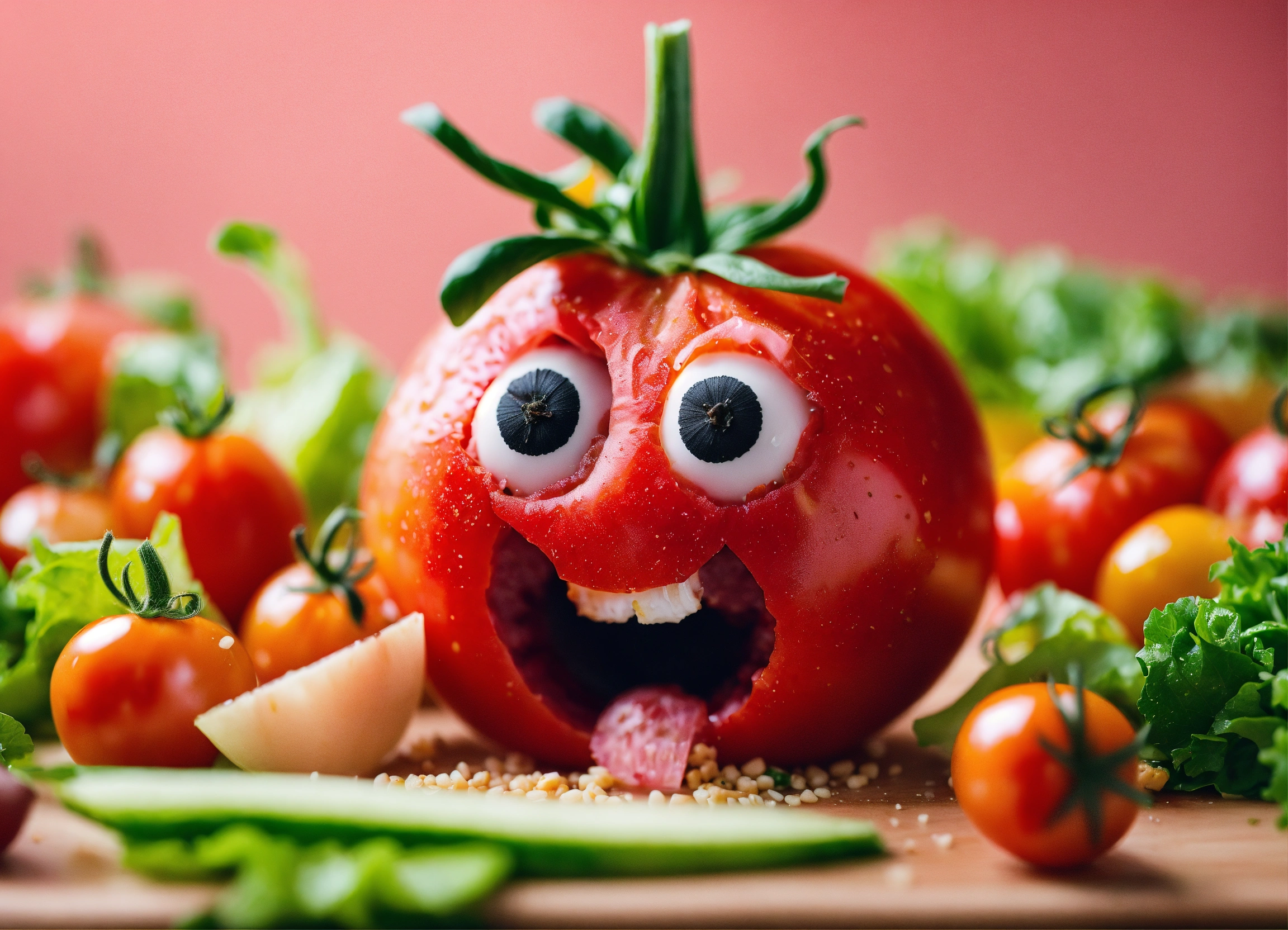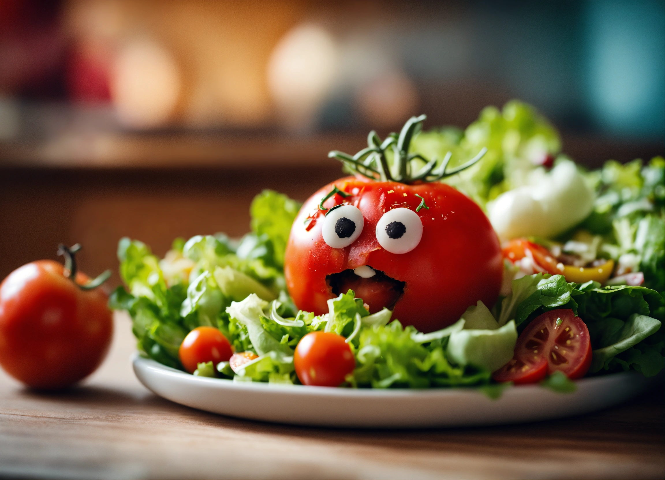 Tilt shift photography, 8k resolution. create a humorous image of a blushing tomato looking surprised and embarrassed while peeking at a salad bowl with various veggies and dressing.