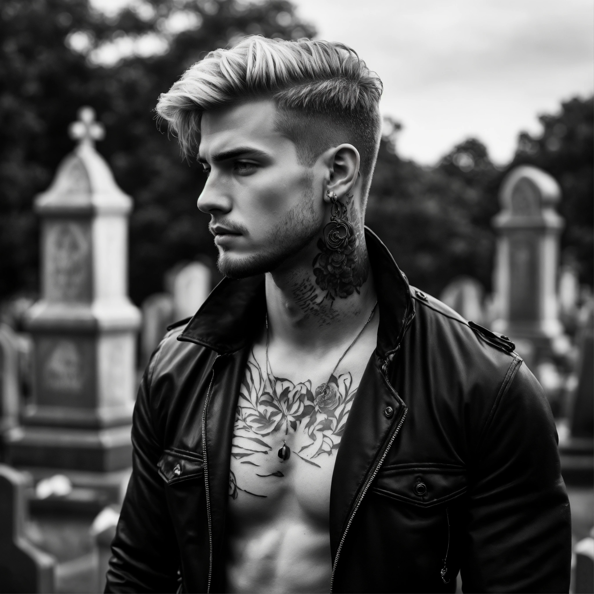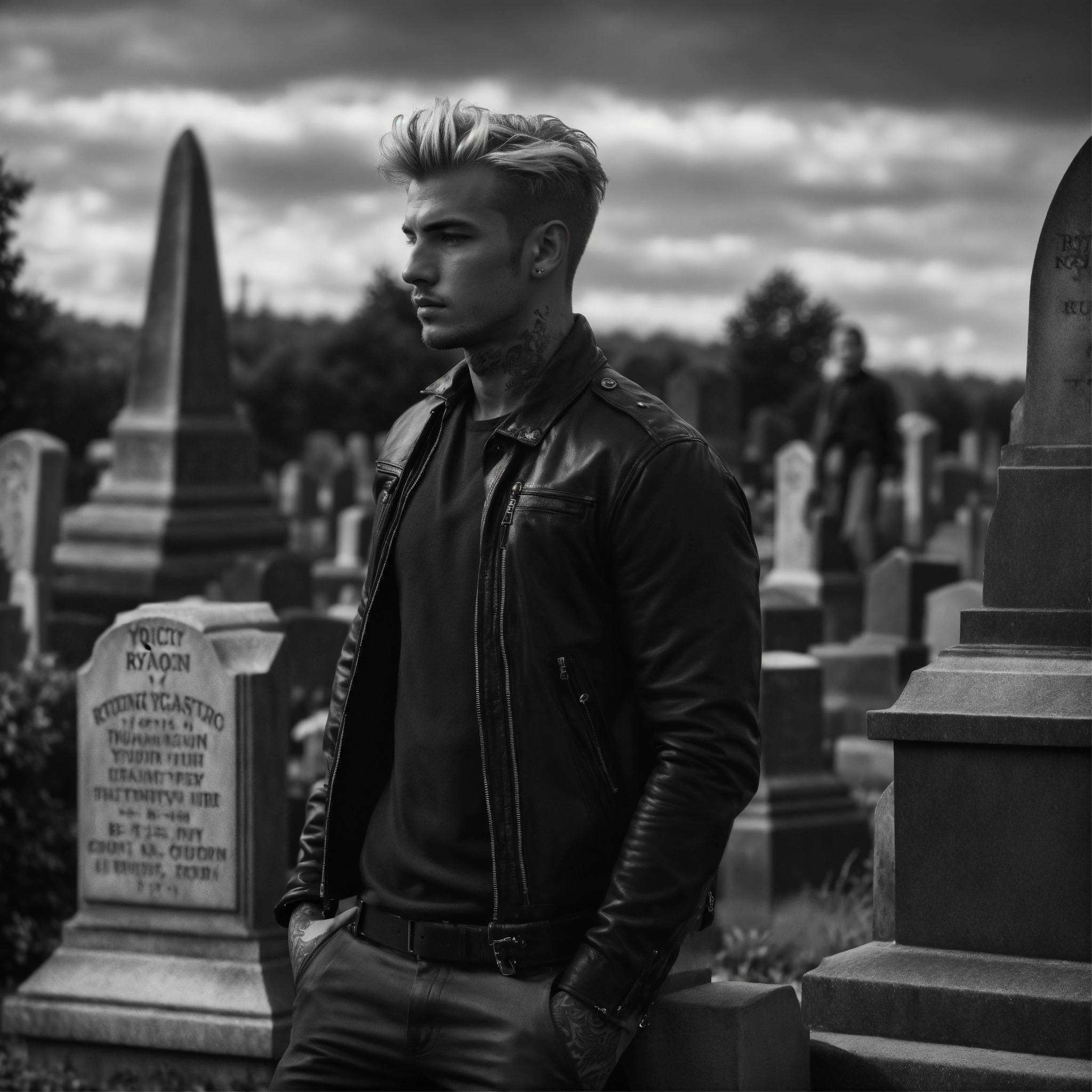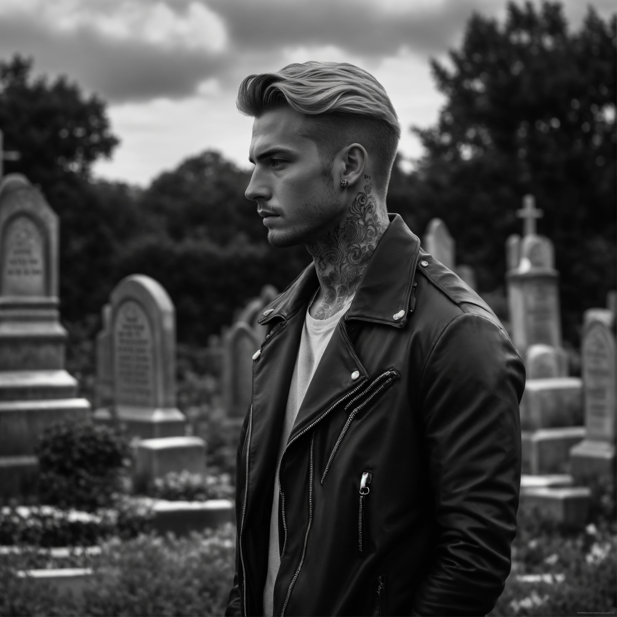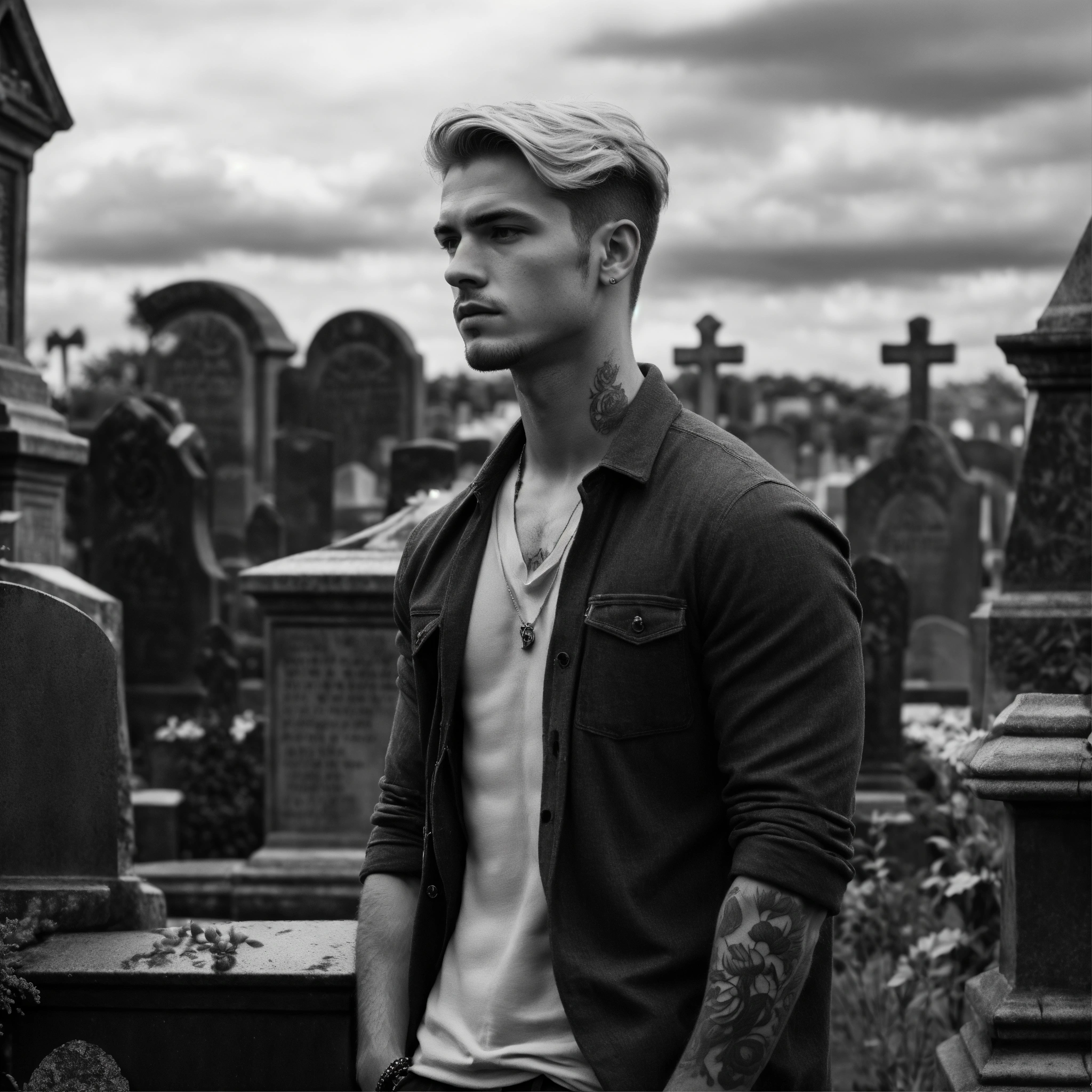 Photorealistic, b&w, mute shades, closup, young handsome man standing a graveyard, in thoughts, rocky style, tatooed, blond hair, thinkful, sad, watching the camera, detailed, 8k, q2