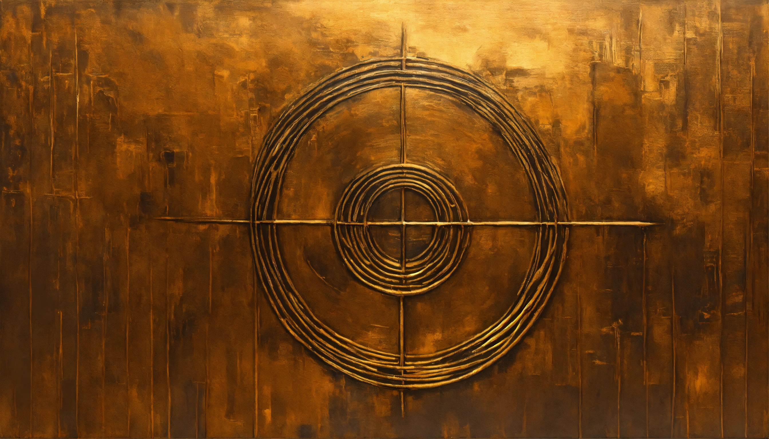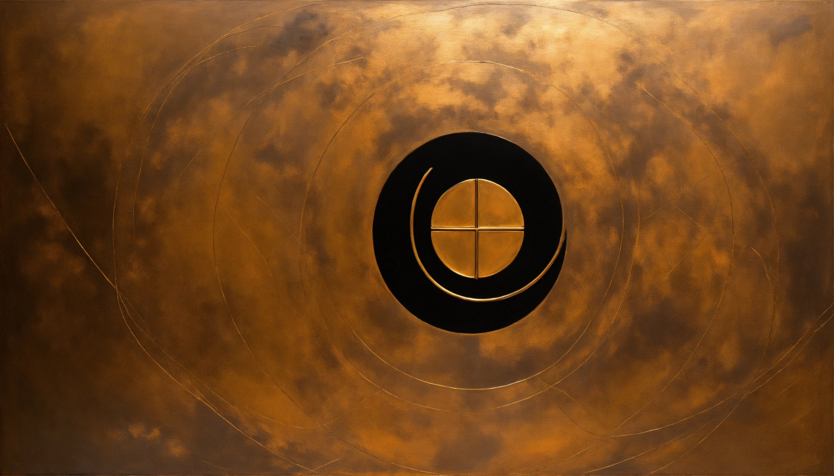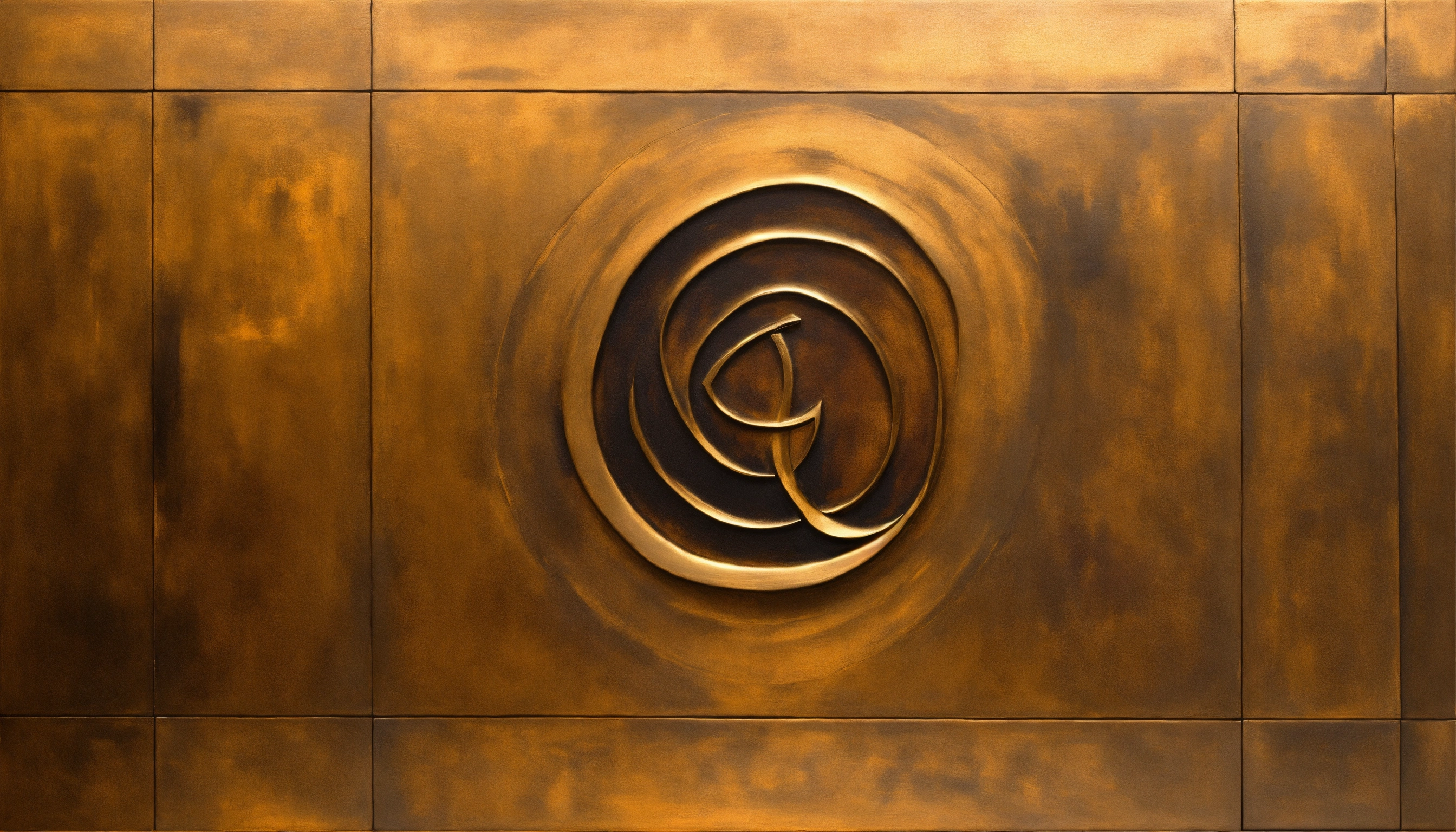 Minimalist, elegant, discret, abstract, enigmatic, sophisticated, modern original painting with original infinite symbol in bronze with high resolution