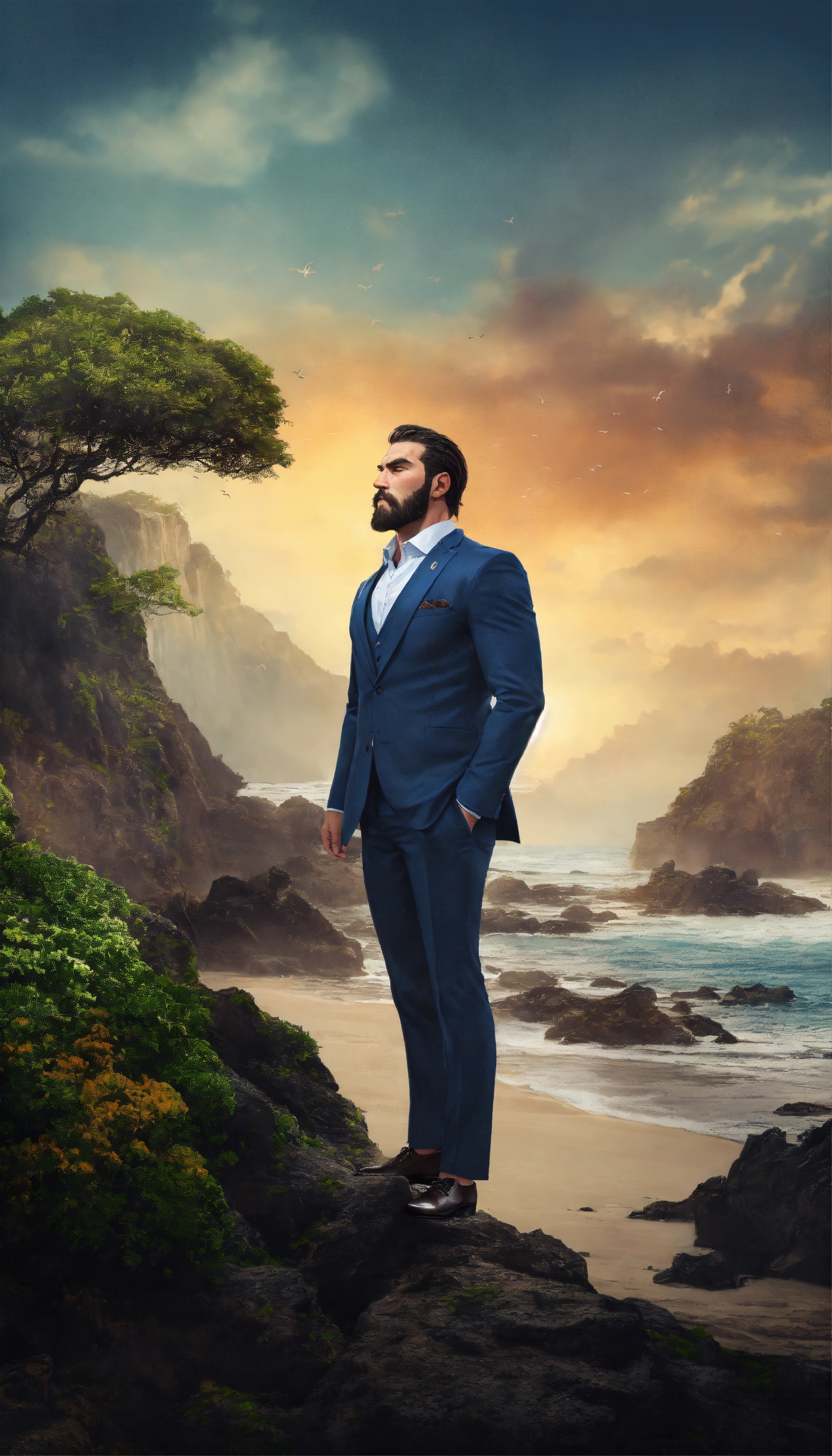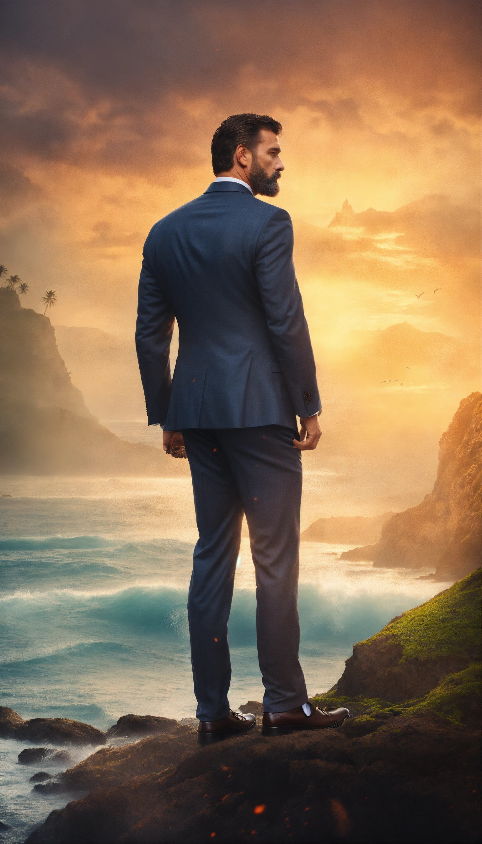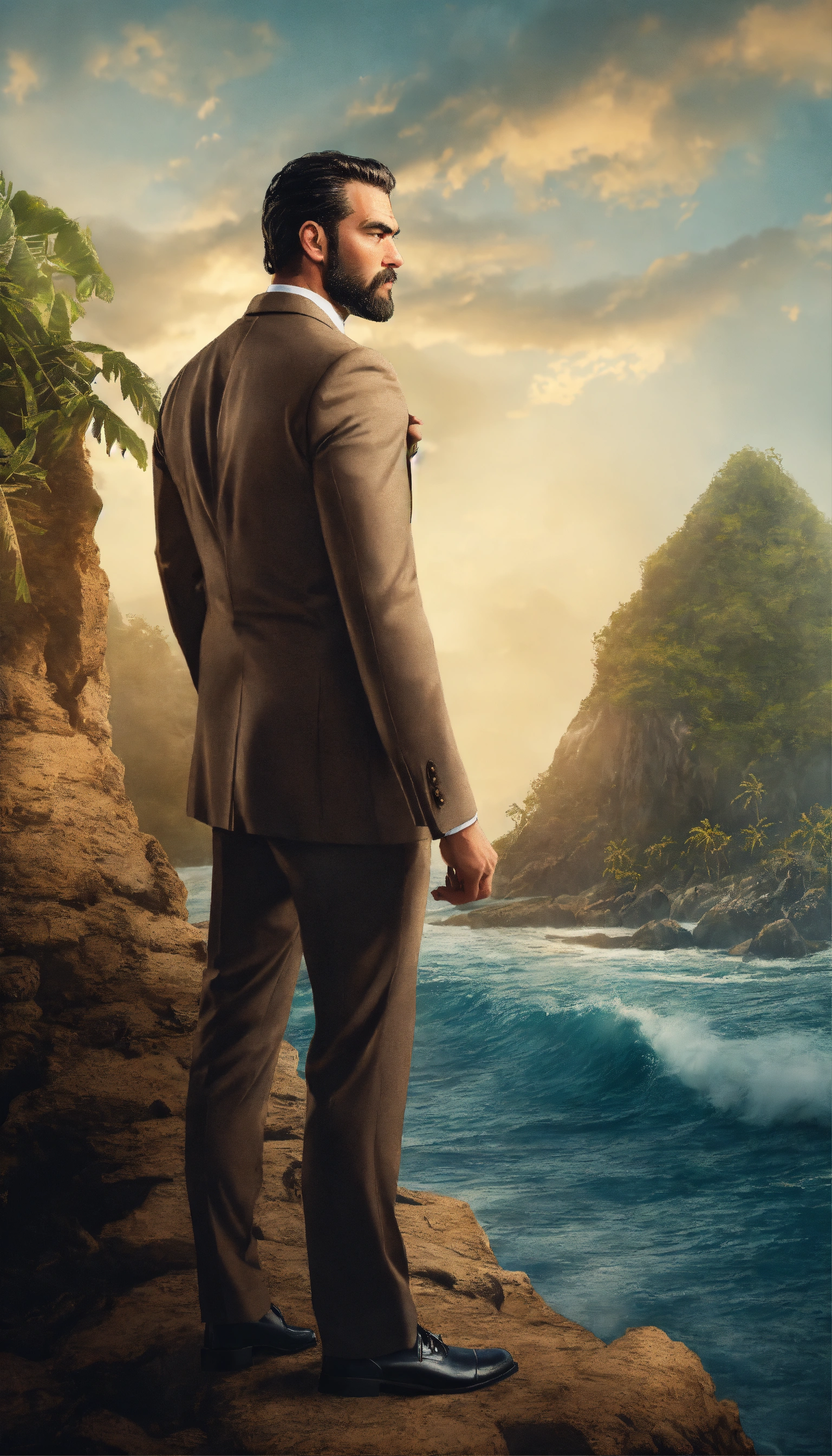 Design a compelling image, rugged and strong man, side profile, dressed in a suit, mystical island that represents empowerment and self-belief. no text added.