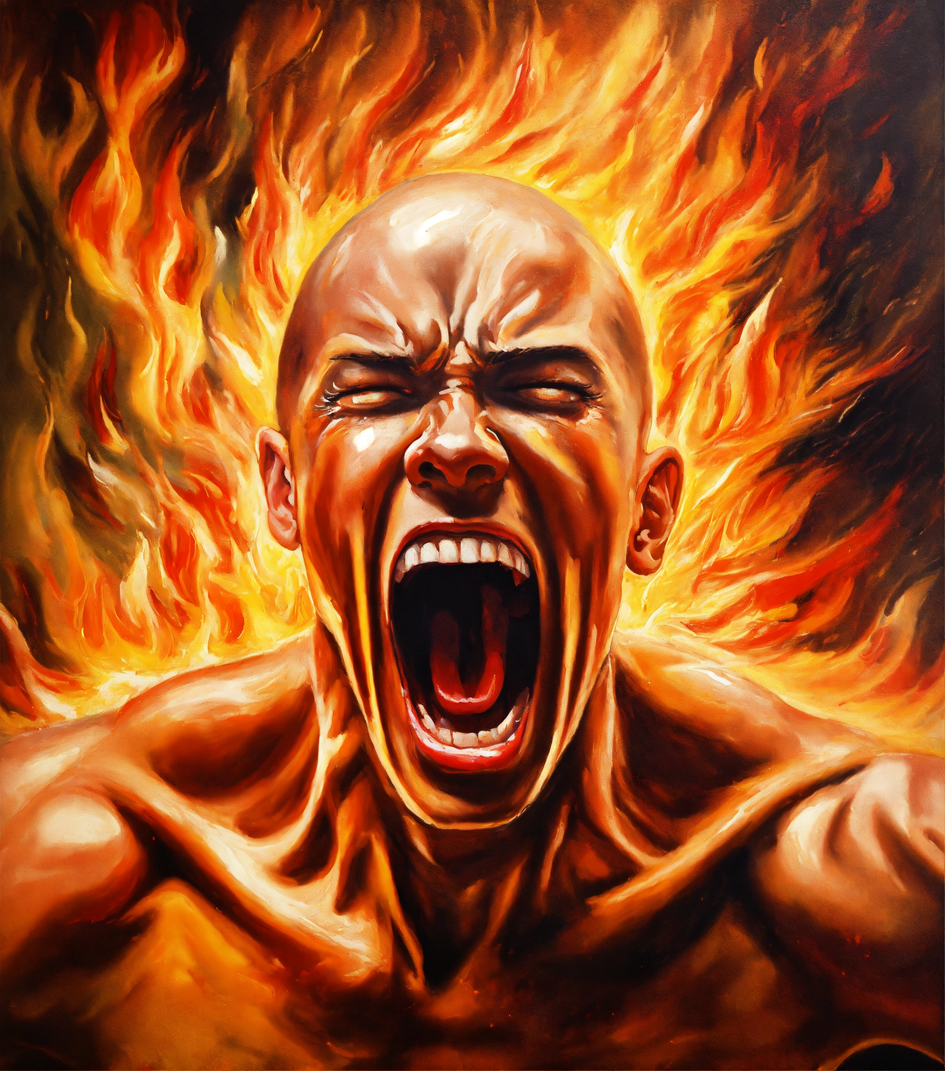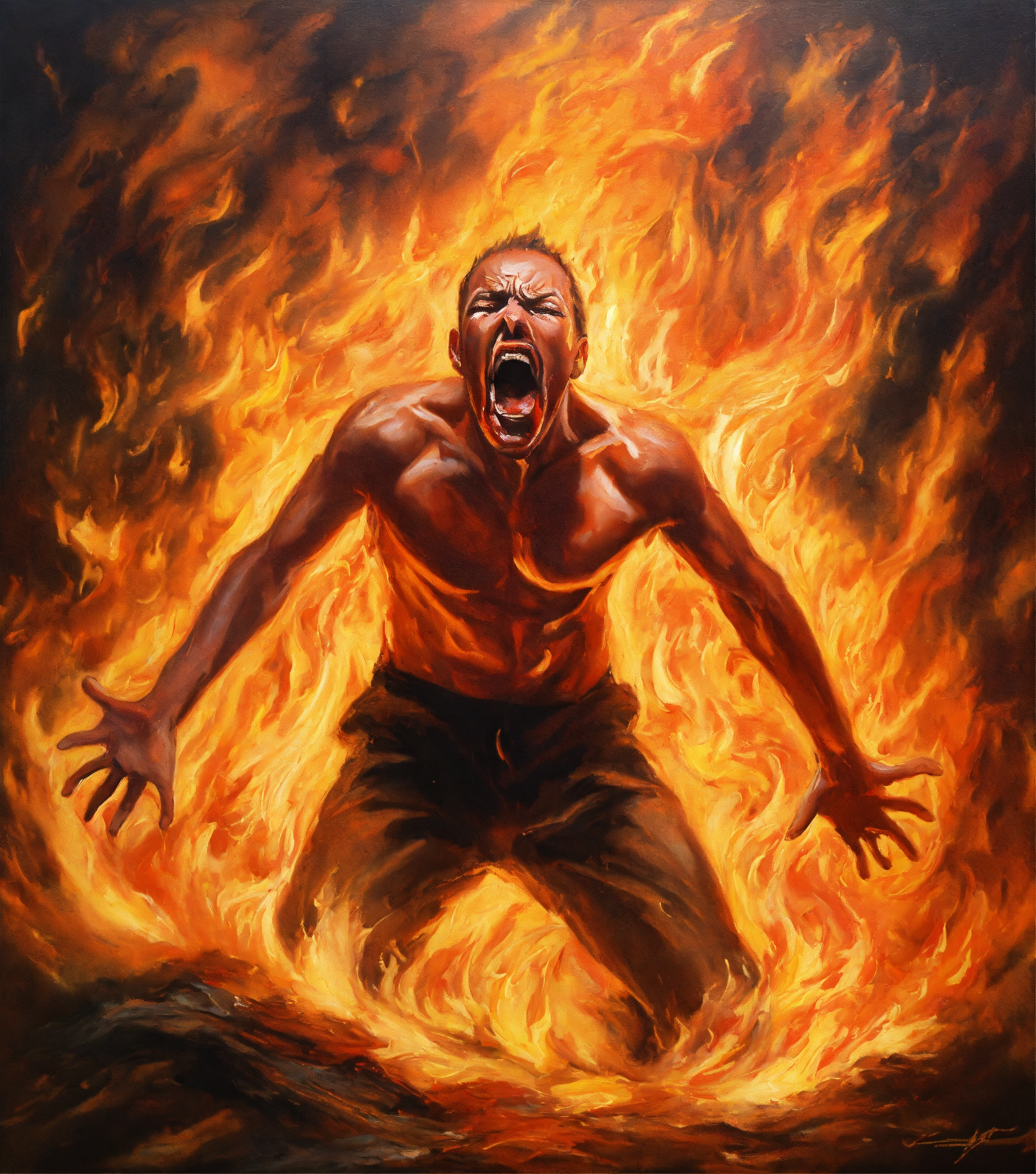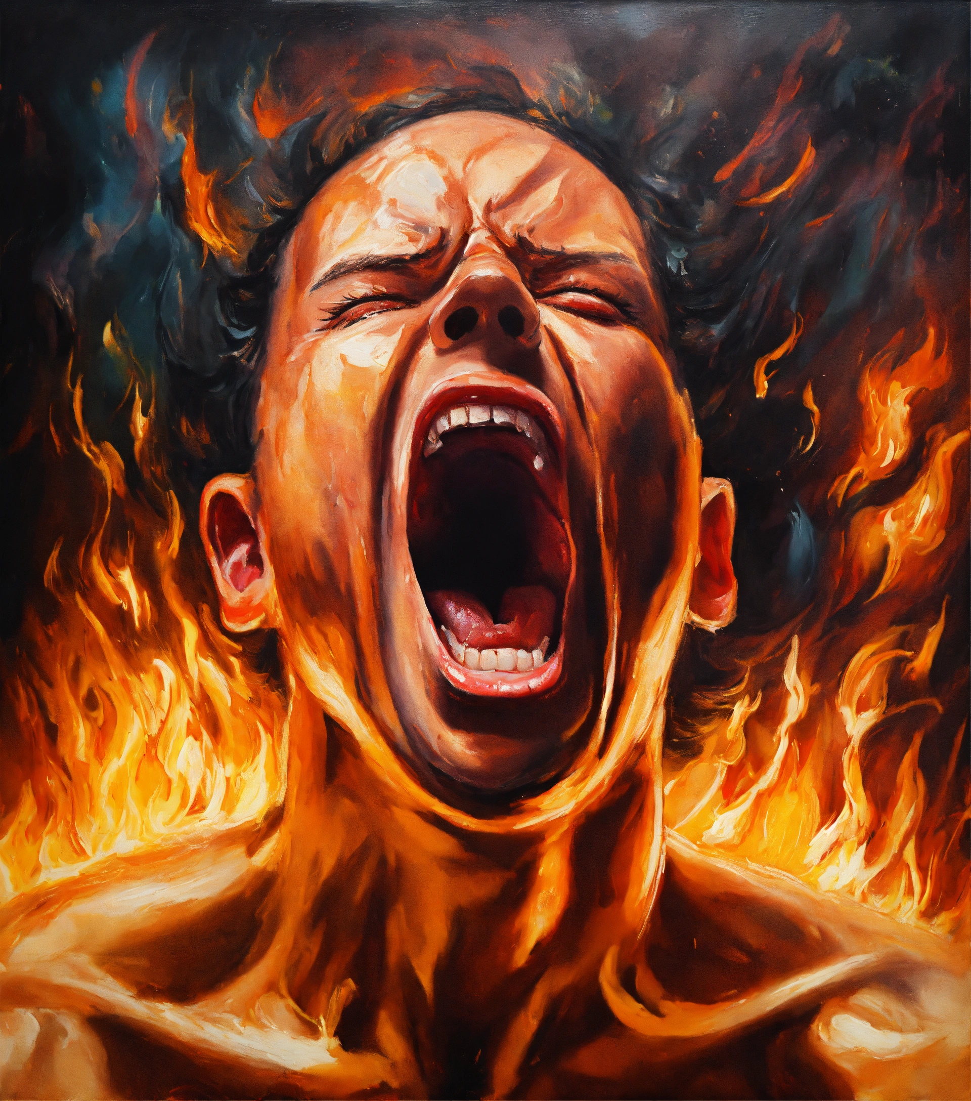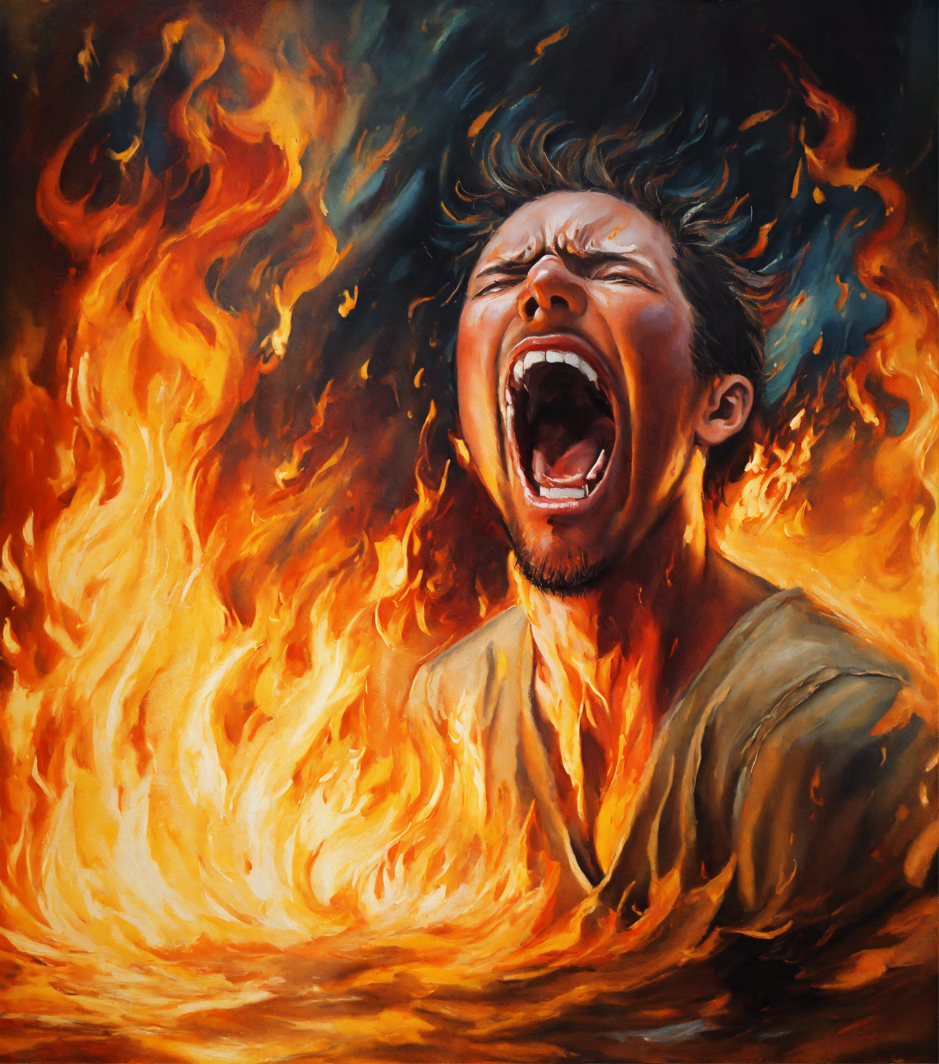 Oil painting of a disturbed person screaming in agony inside flames, highly detailed, oil painting style, brush strokes, 8k