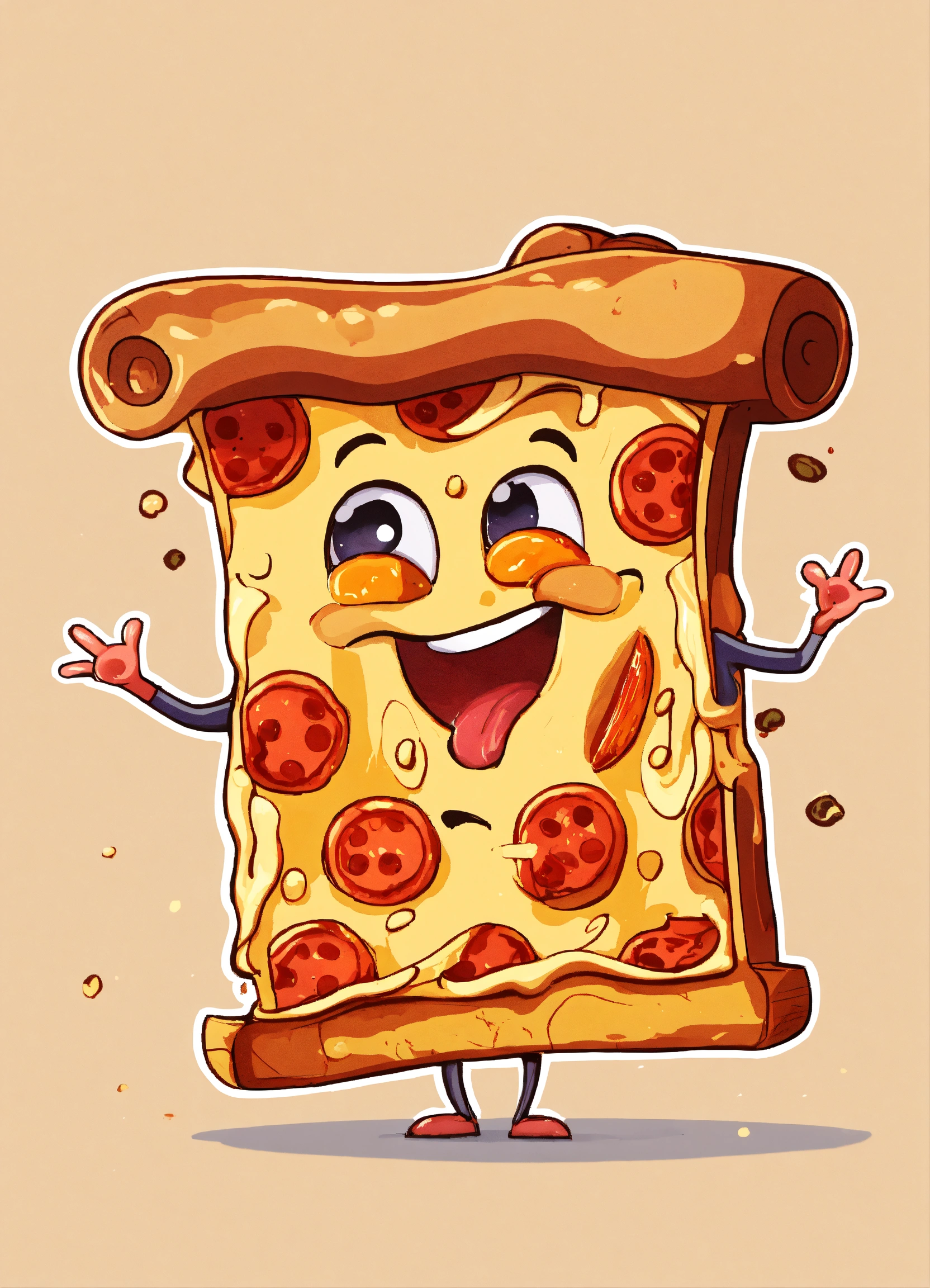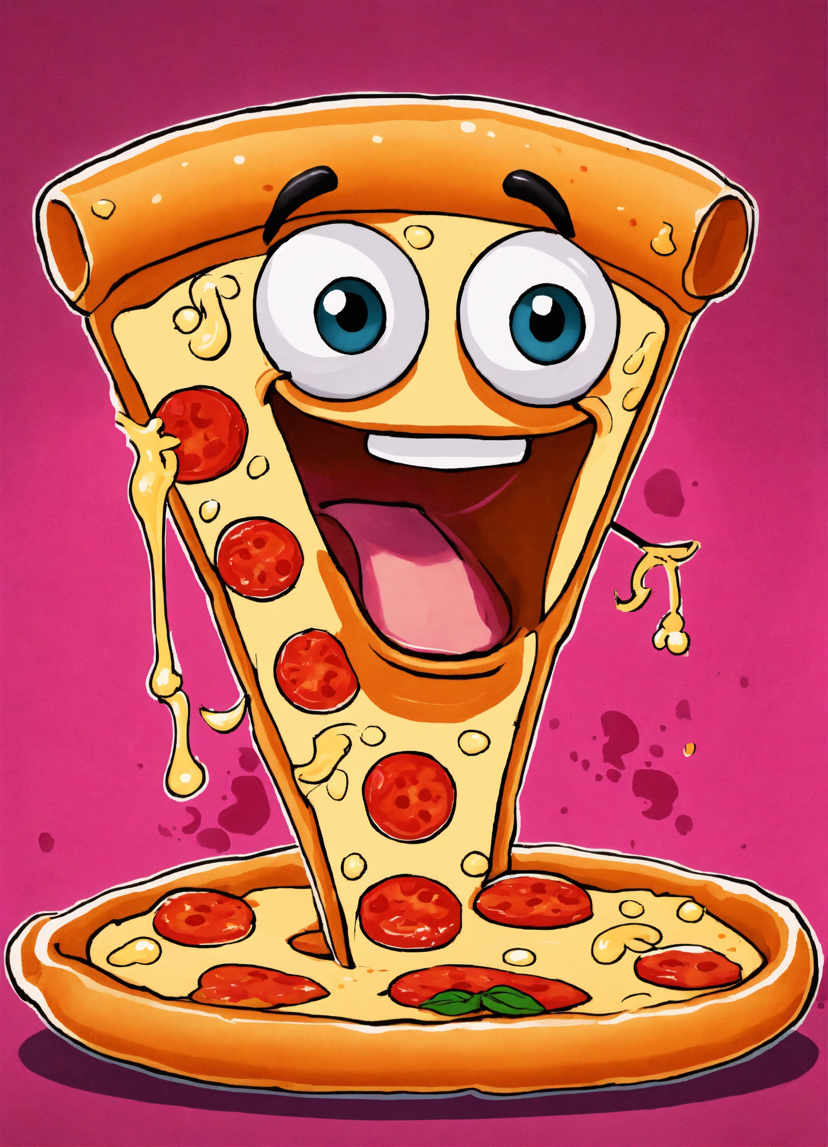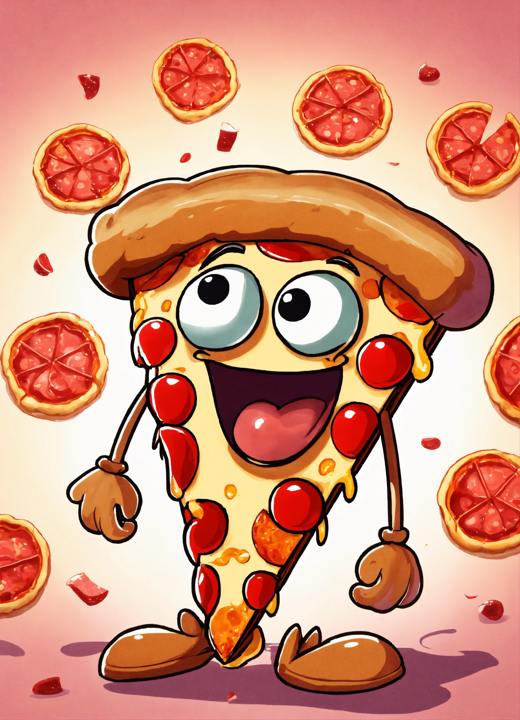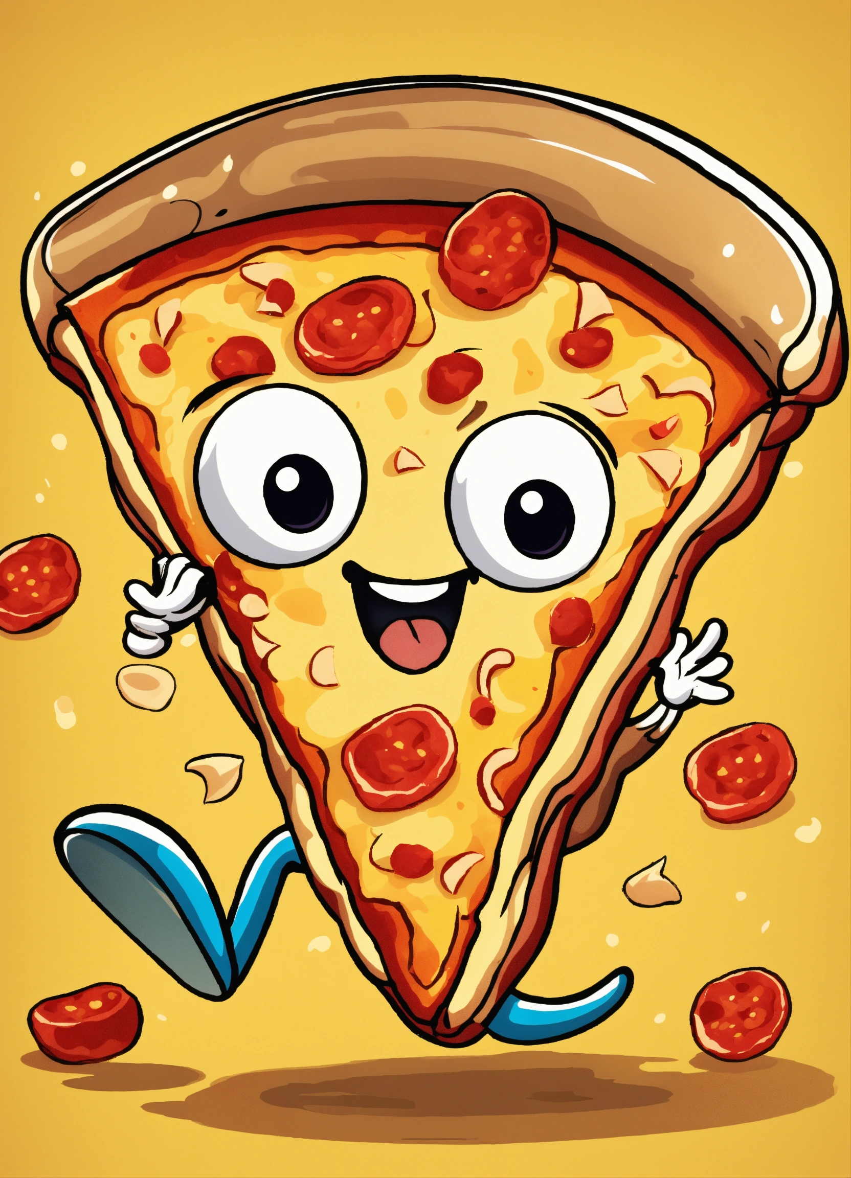 Slice of cartoon style animated pizza that looks pretty and with a nice face (not creepy, not terrify), delicious with melted cheese, that is animated type with animated face two eyes, one mouth, one nose, two legs and two hands, dancing pose, it looks like a cartoon, amazing 4k quality colors, white background, image with well-cast shadows where they have to go, let it be pepperoni pizza that is dancing, white background
