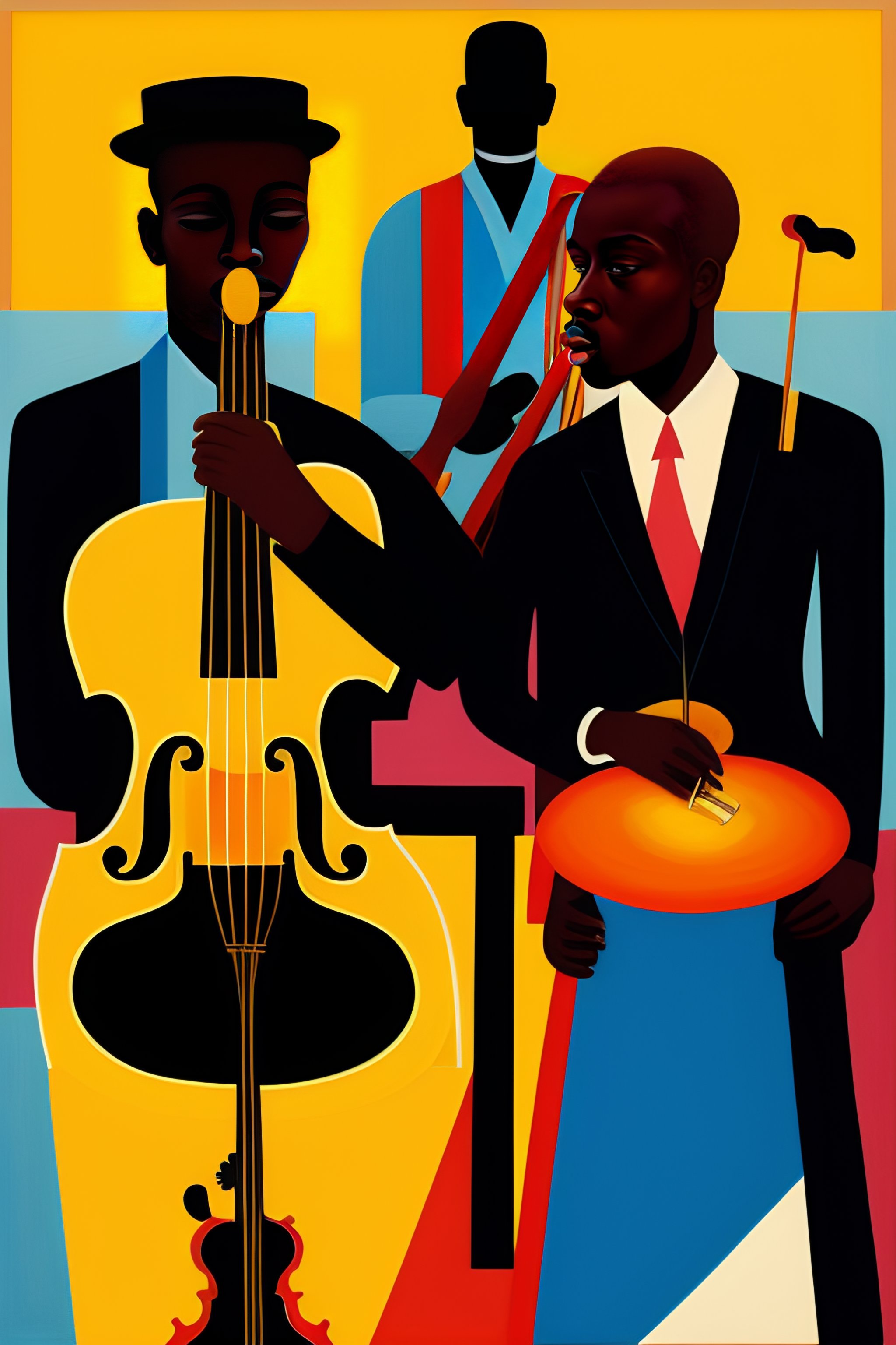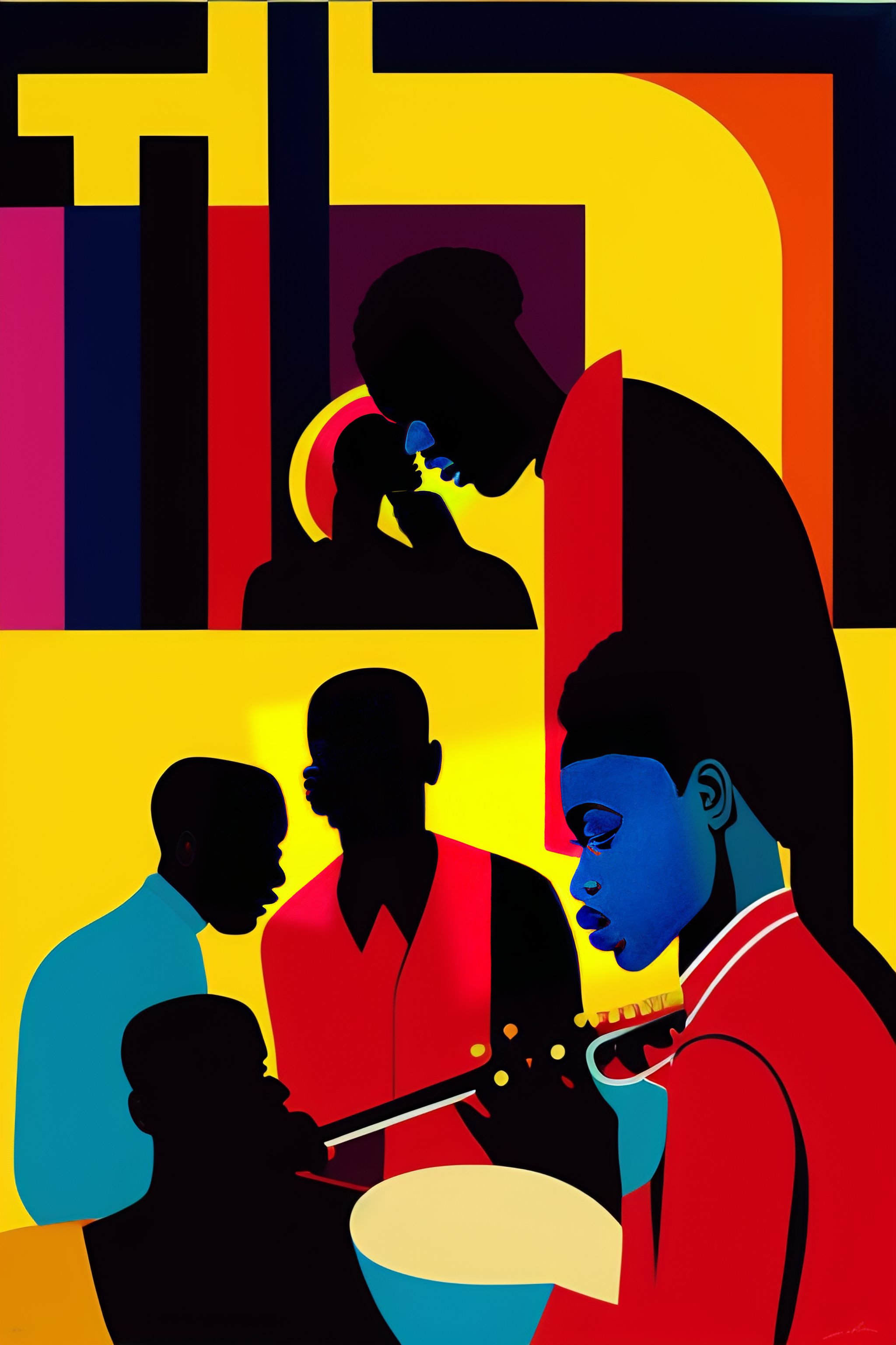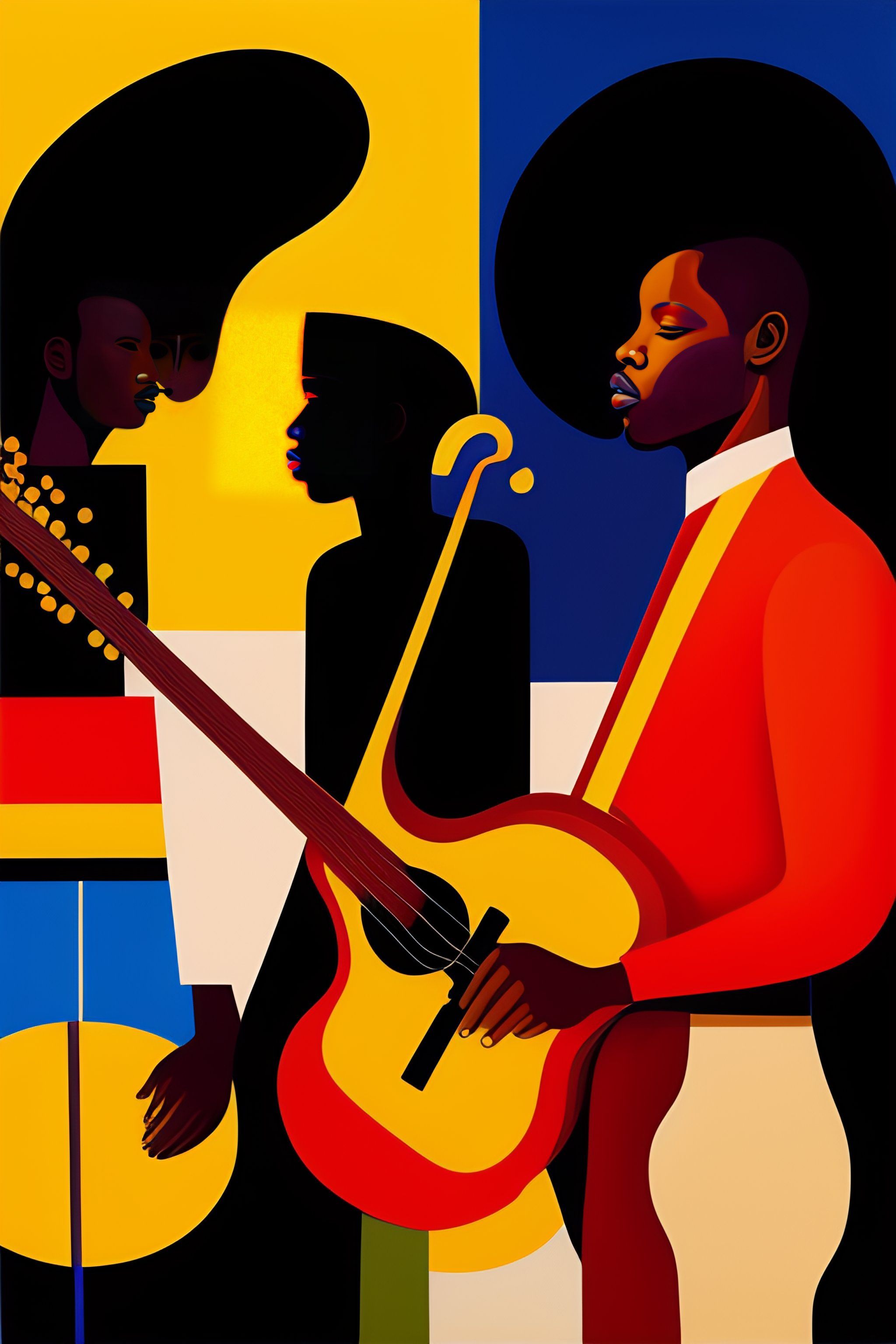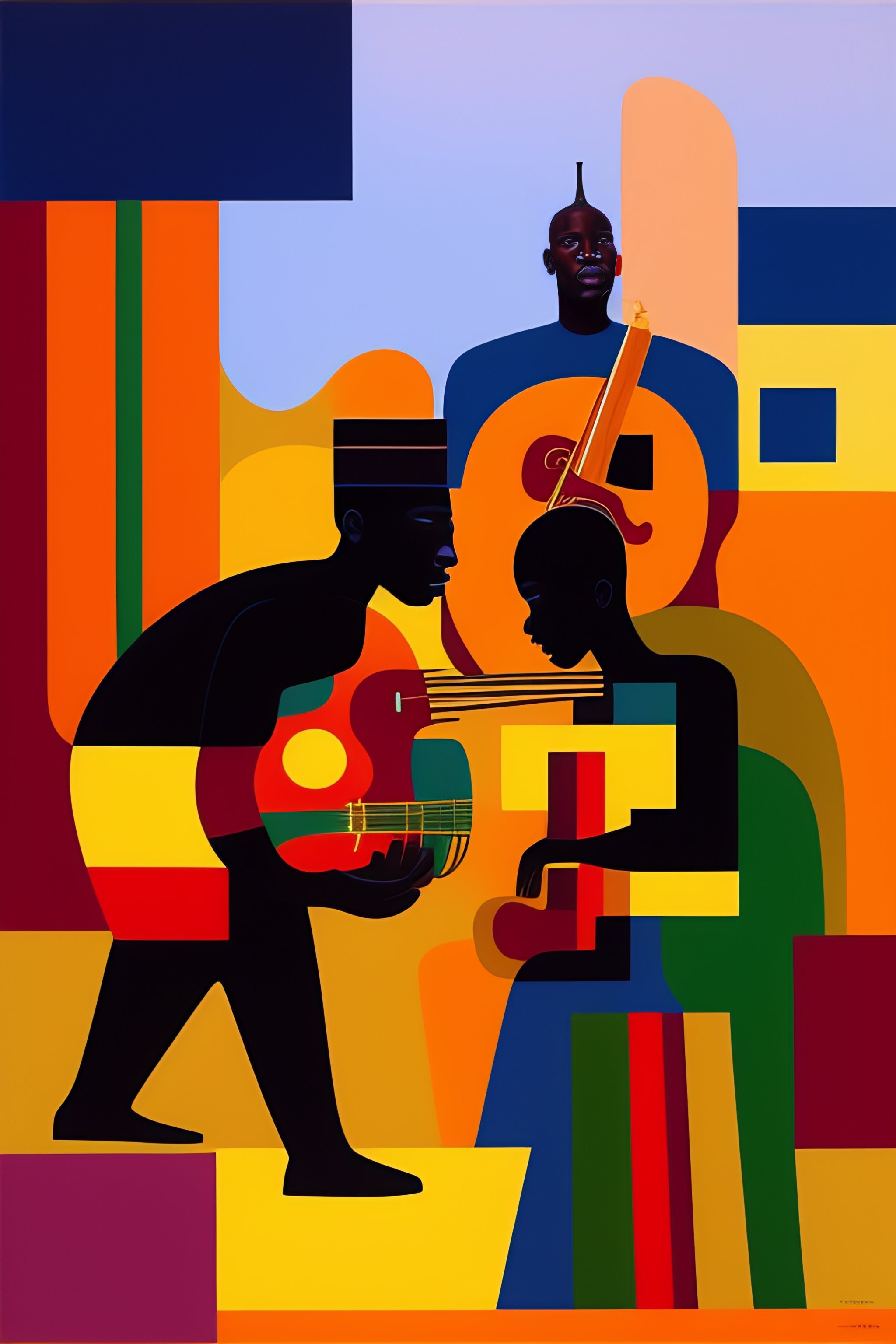 A painting of a group of men playing instruments, a band in africa, an ultrafine detailed painting by romare bearden, behance, claes oldenburg, black arts movement, artwork, fauvism, academic art
