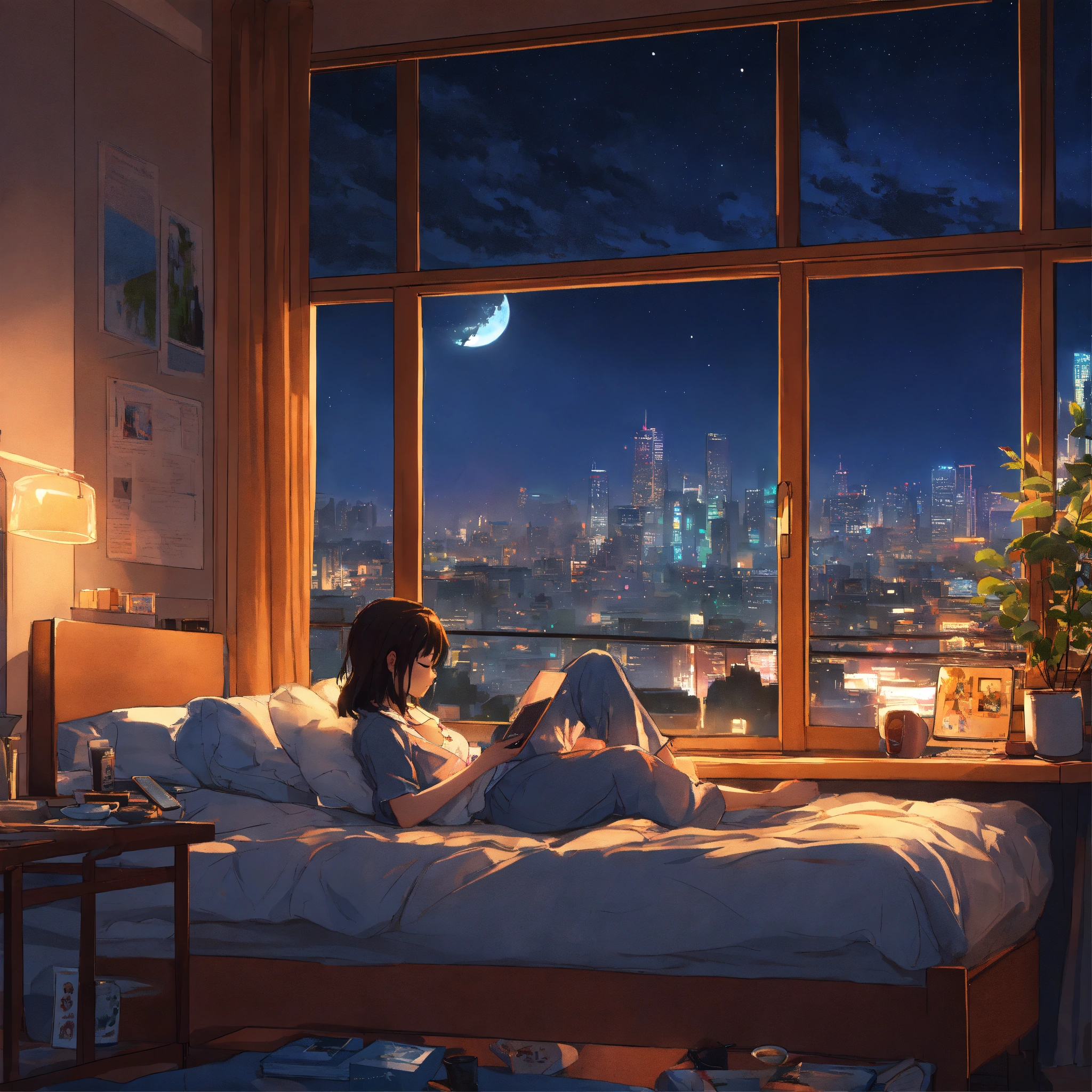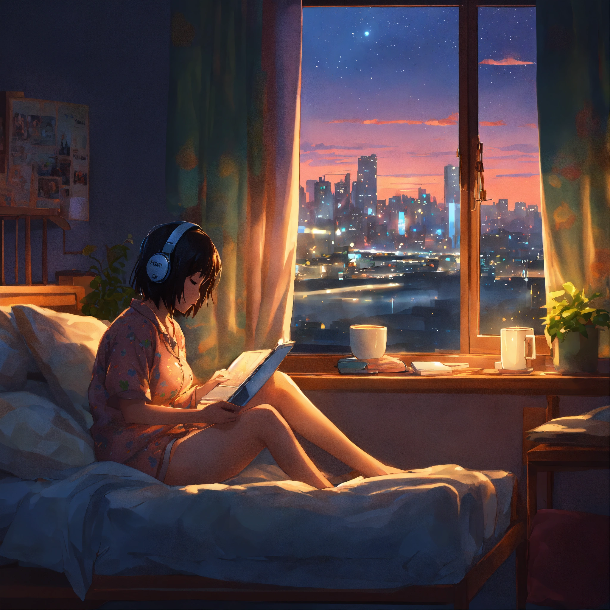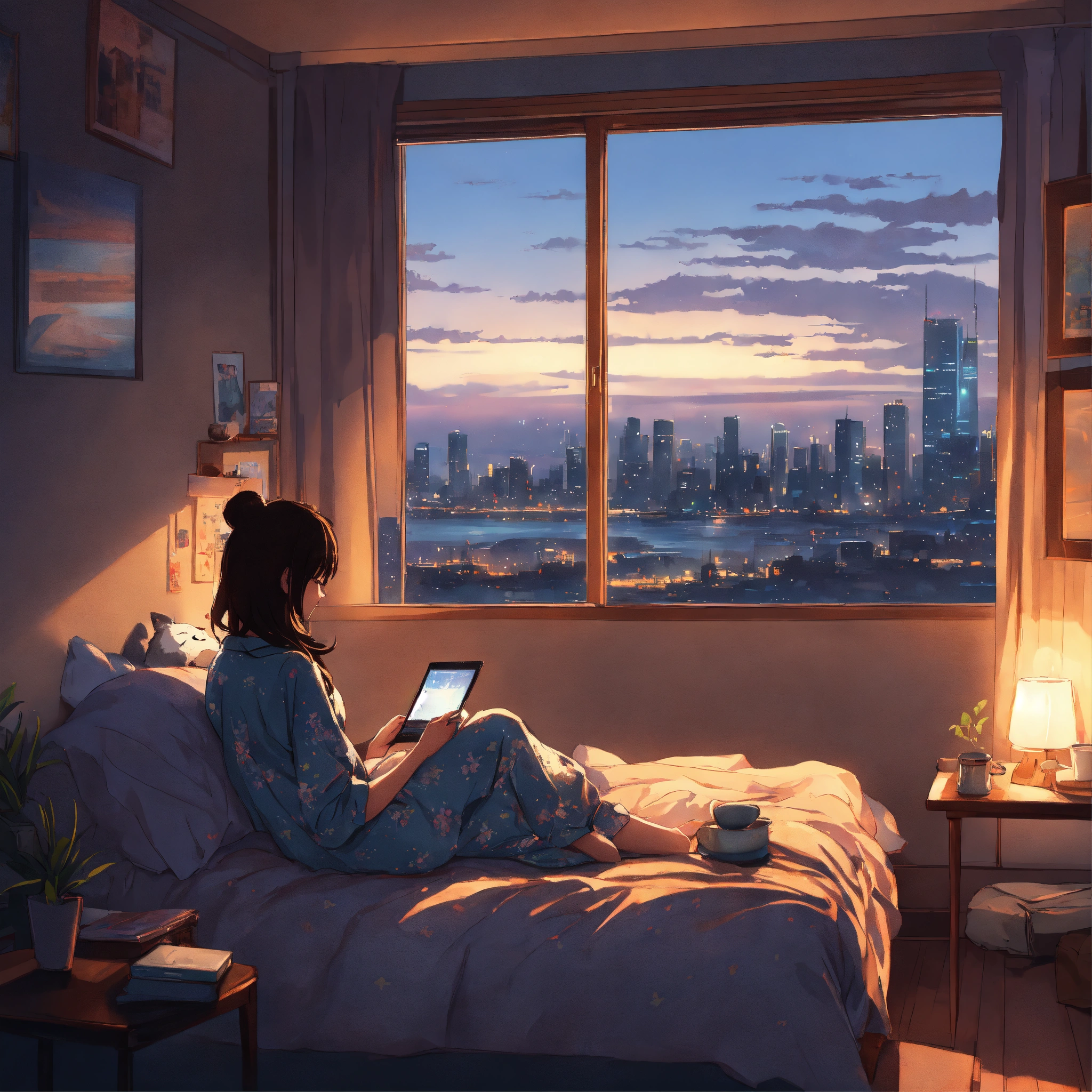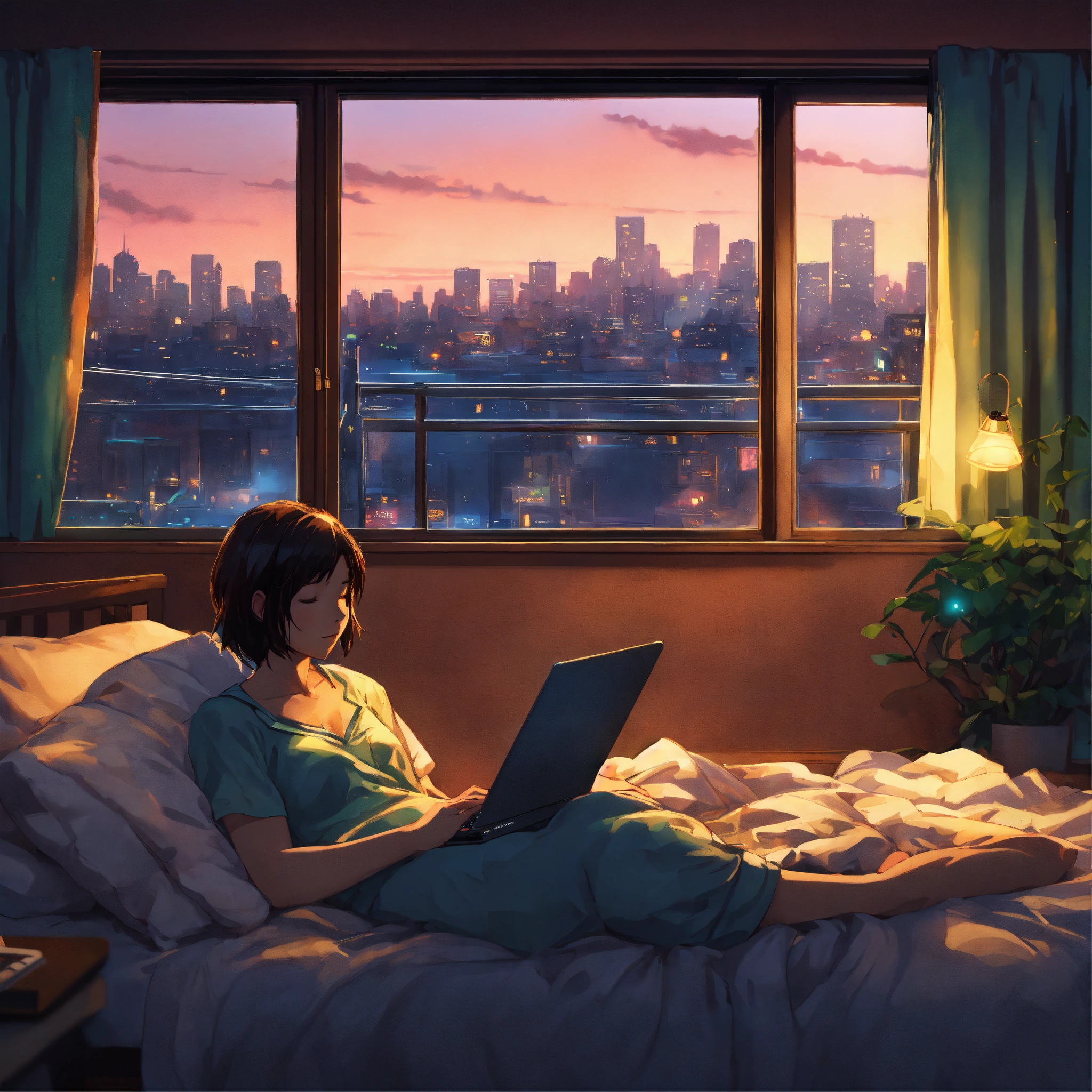 A woman in pajamas, bedroom, on her bed reading, cityscape, greg rutkowski and makoto shinkai, night sky, rgb lights, downtown, hot pants, coffeecup, lit laptop in table, bed room furniture, cozy, calm, looking out of the window, dim light in room, realistic limbs, raccoon sleeping next to her