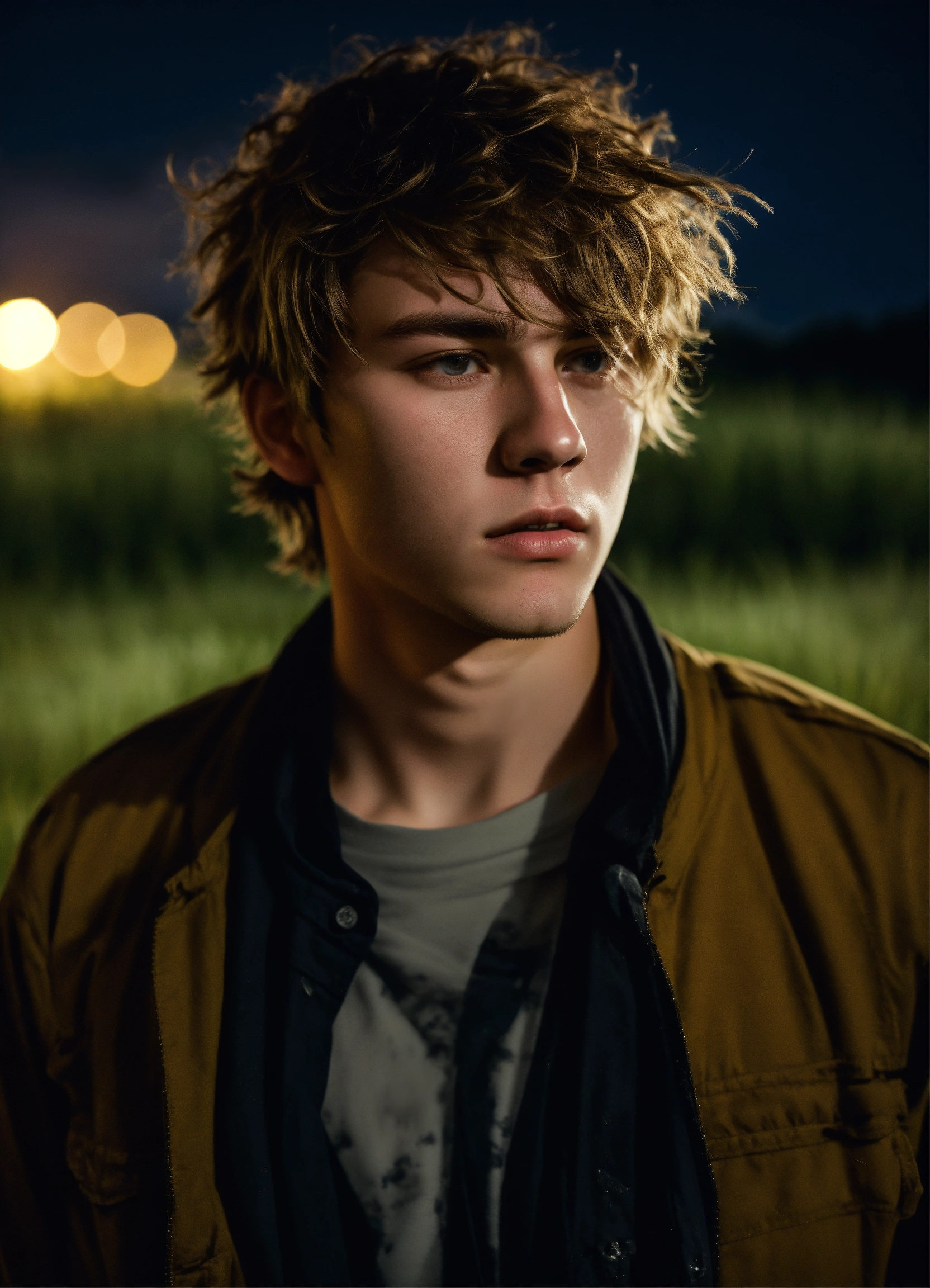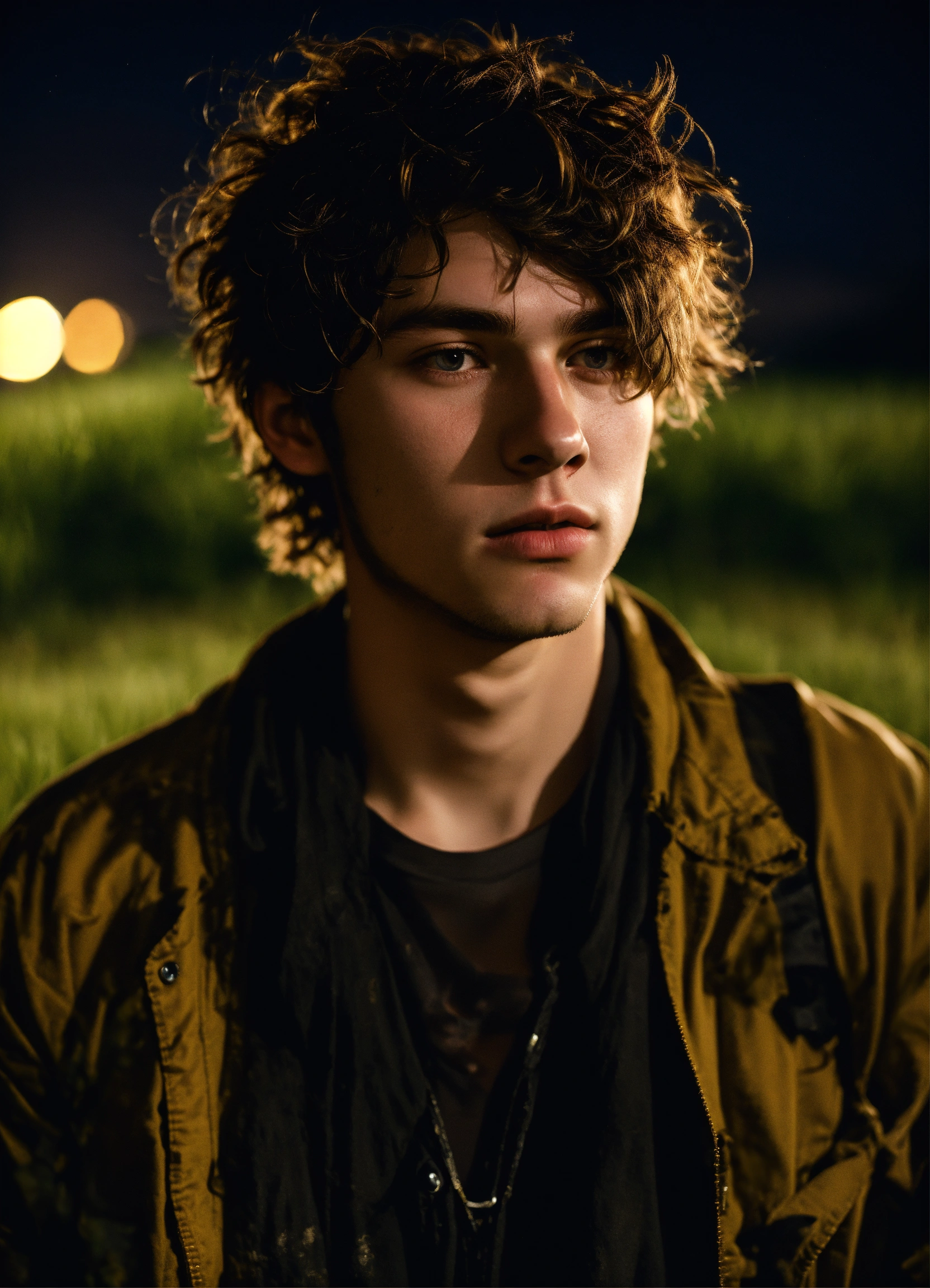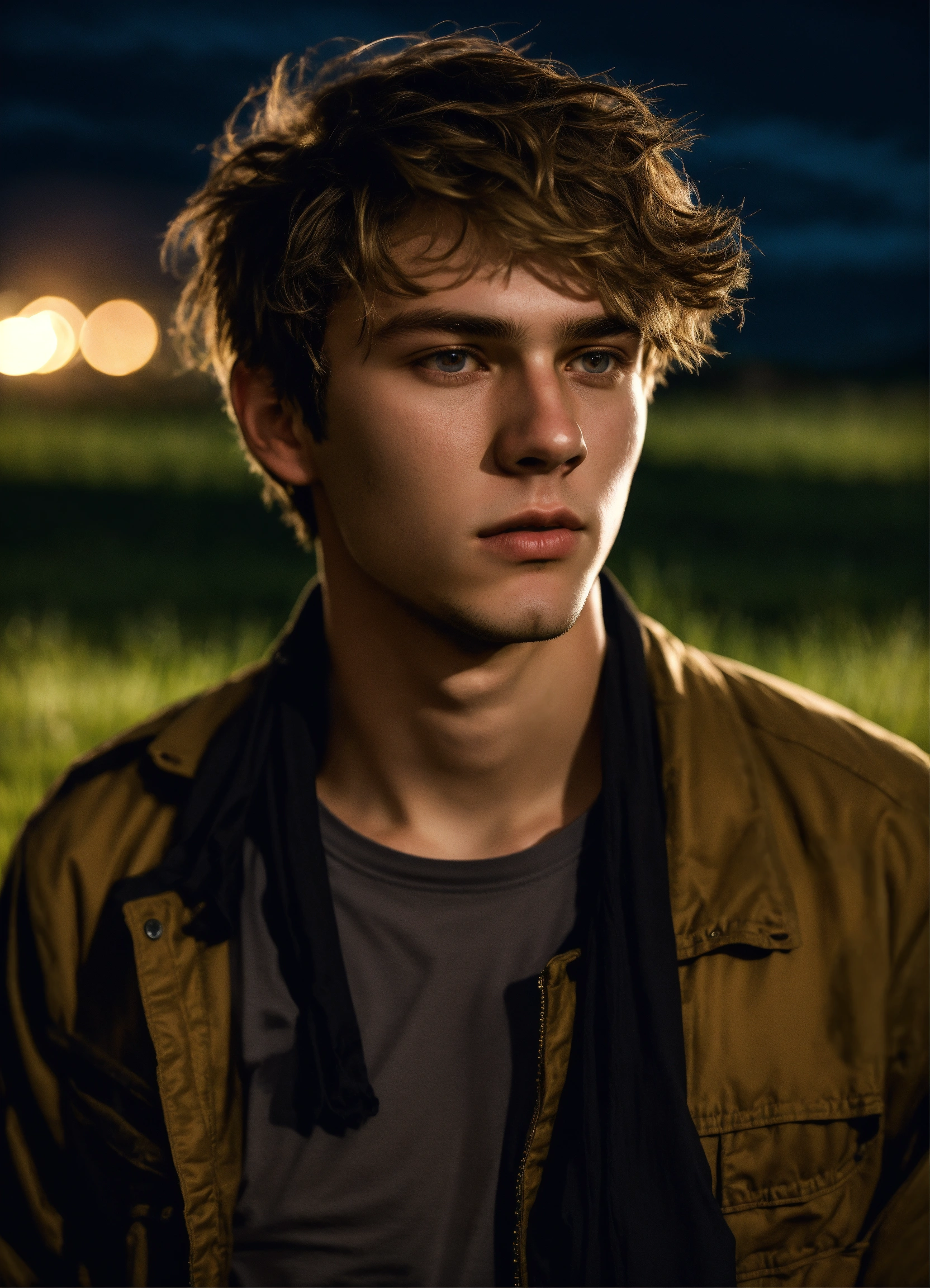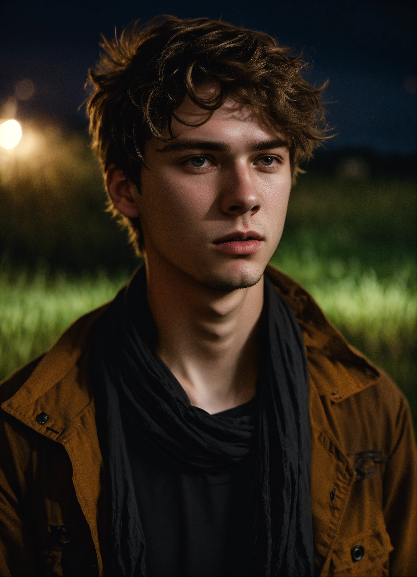 A highly realistic night dark photograph of a white 21 years old boy, with dirty face, thin lips, dark blonde hair, slanted brown eyes, messy hair, white skin, sad expression, strong body, wearing black t-shirt with a scarf and a jacket, in a meadow at night, romantic aura, in the background, hyperrealistic, hyperdetailed, 4k