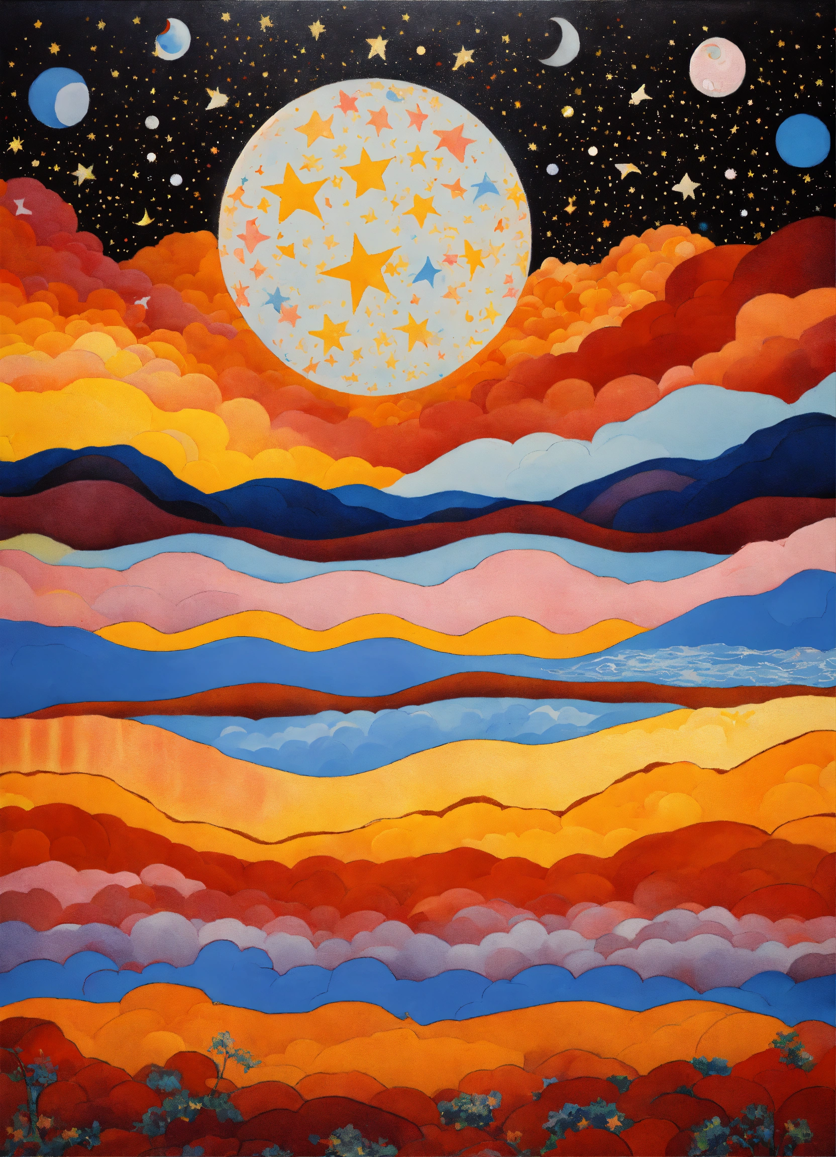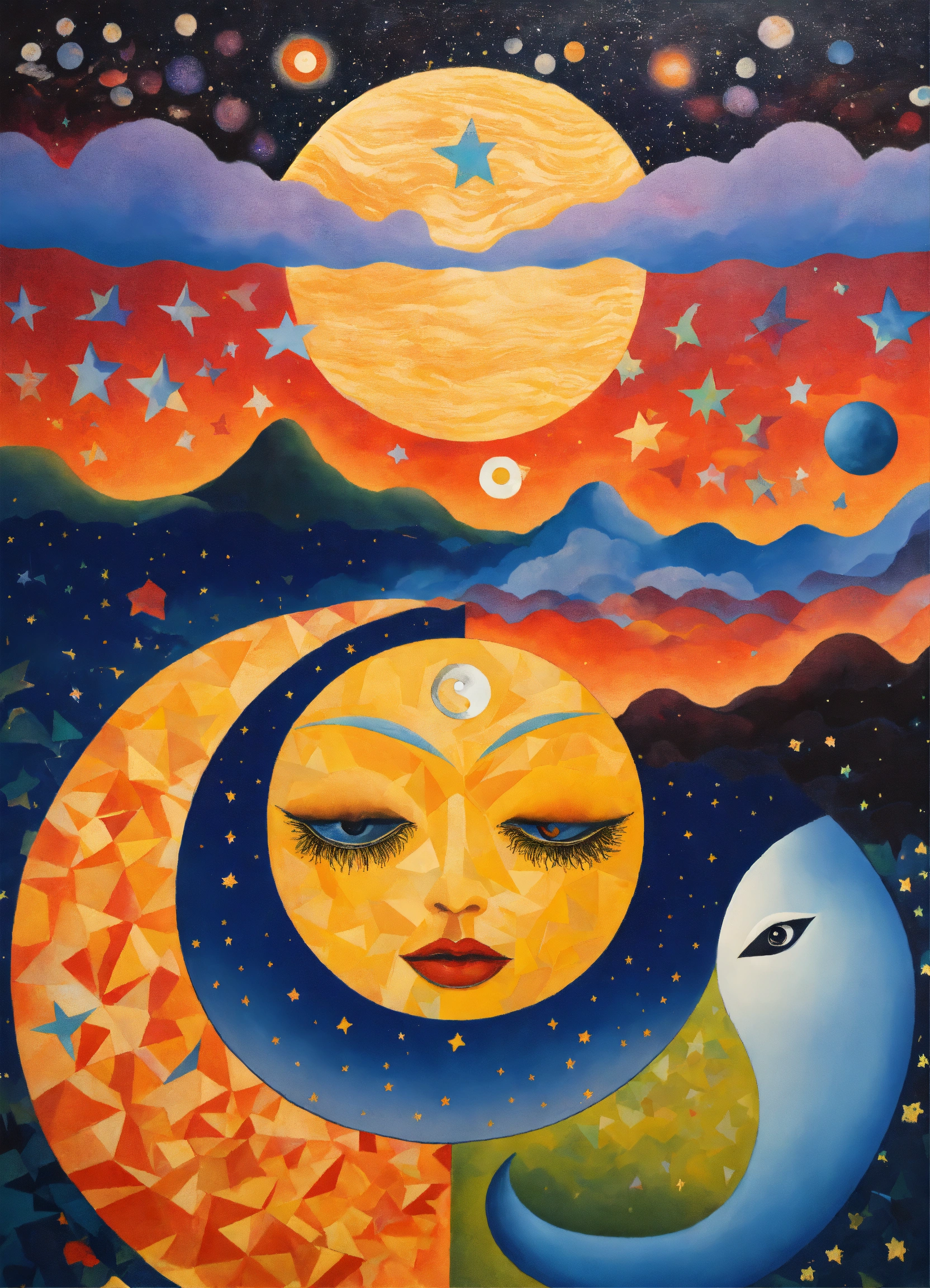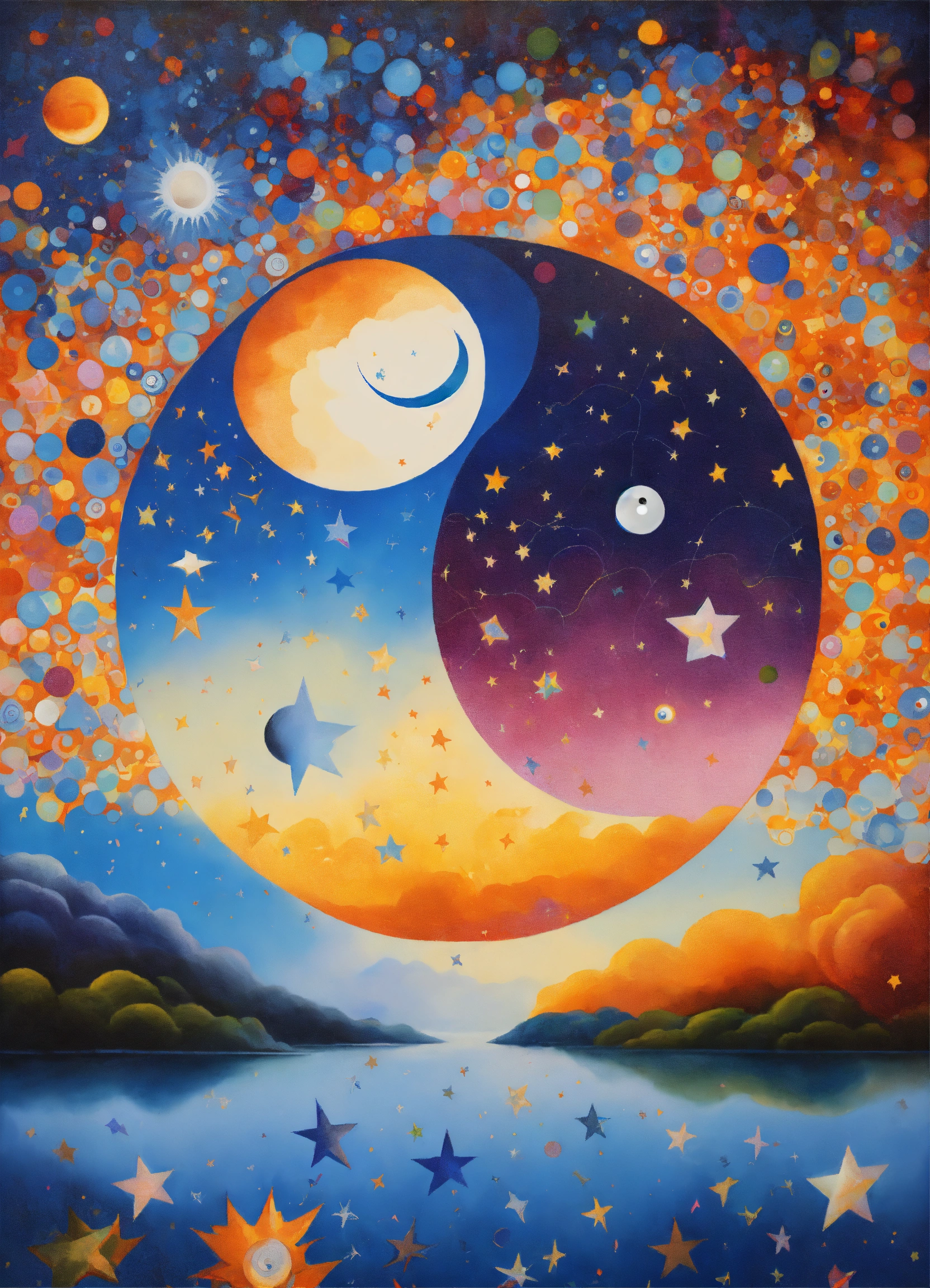 Dream dimension, ying yang, stars painted rene margritte, stars and psychedelic abstract patterns, night day, sun and moon