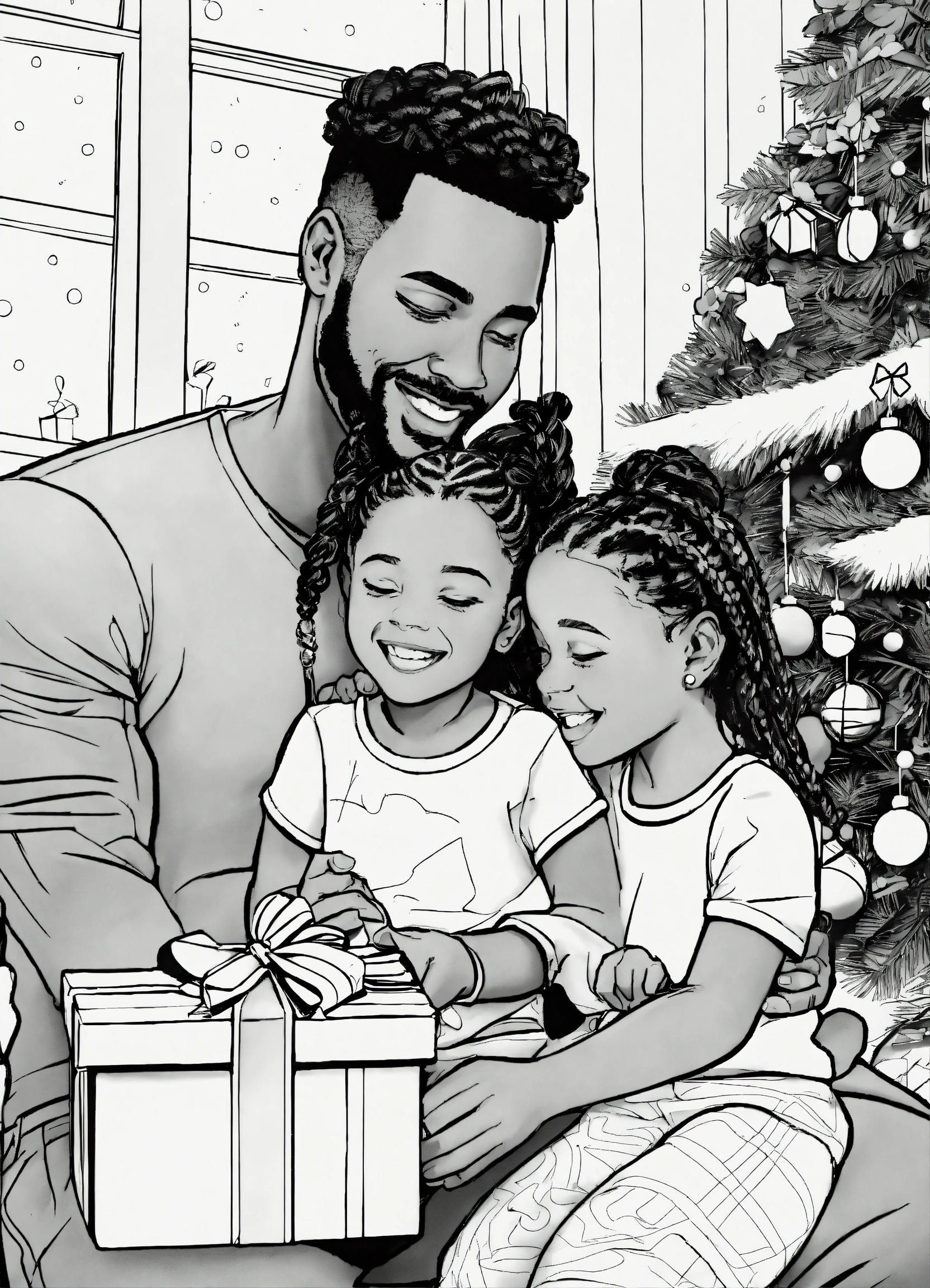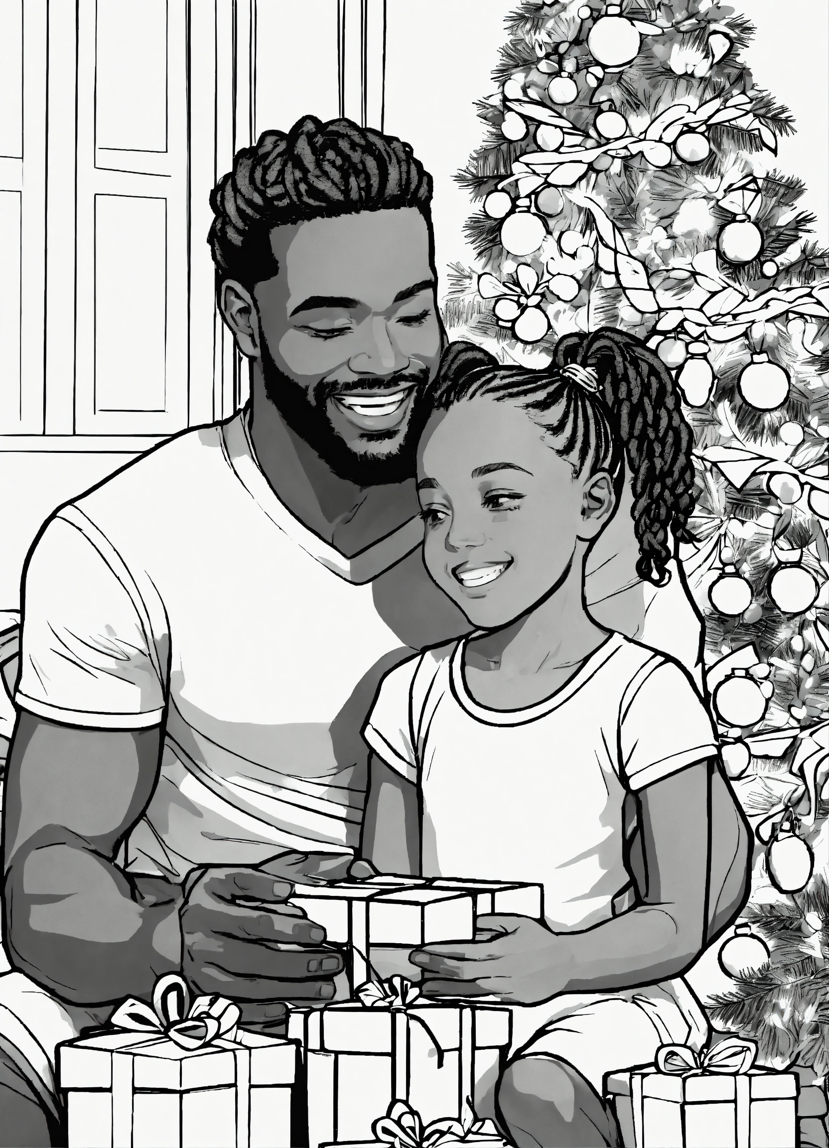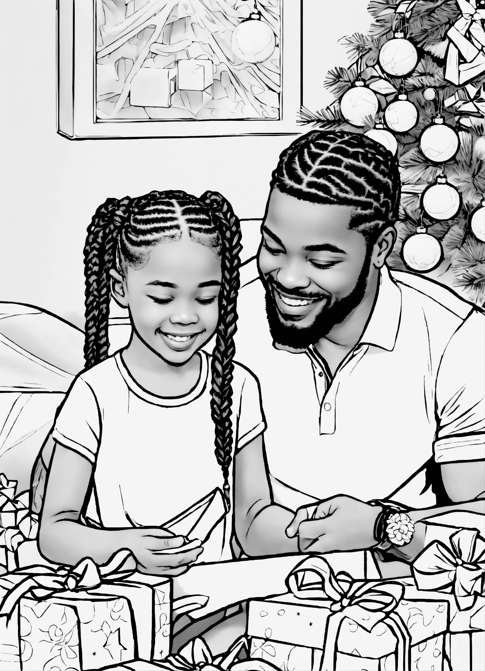 Black and white coloring pages of young african american daddy with braids as hairstyle, and daughter with braids opening gifts by the christmas tree while smiling