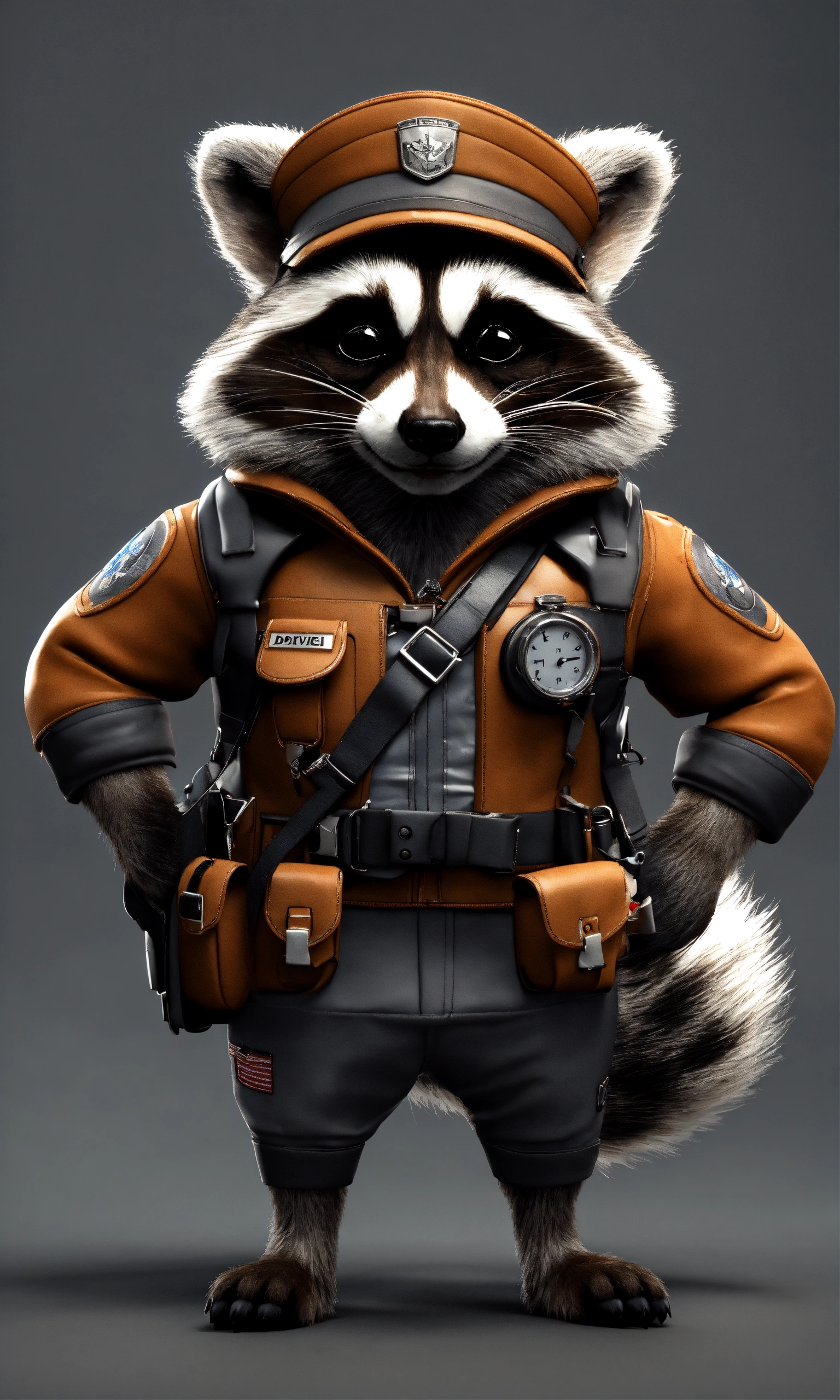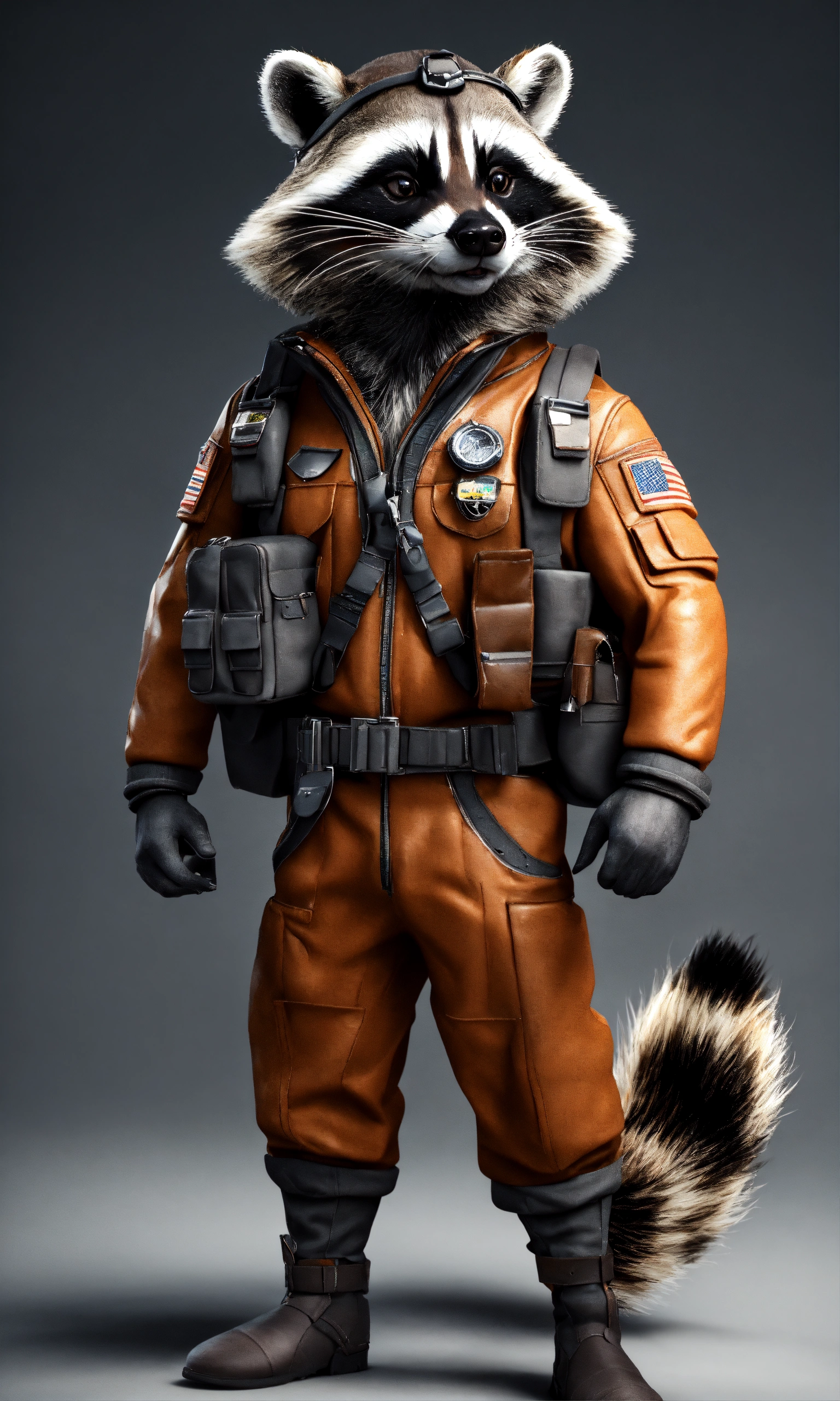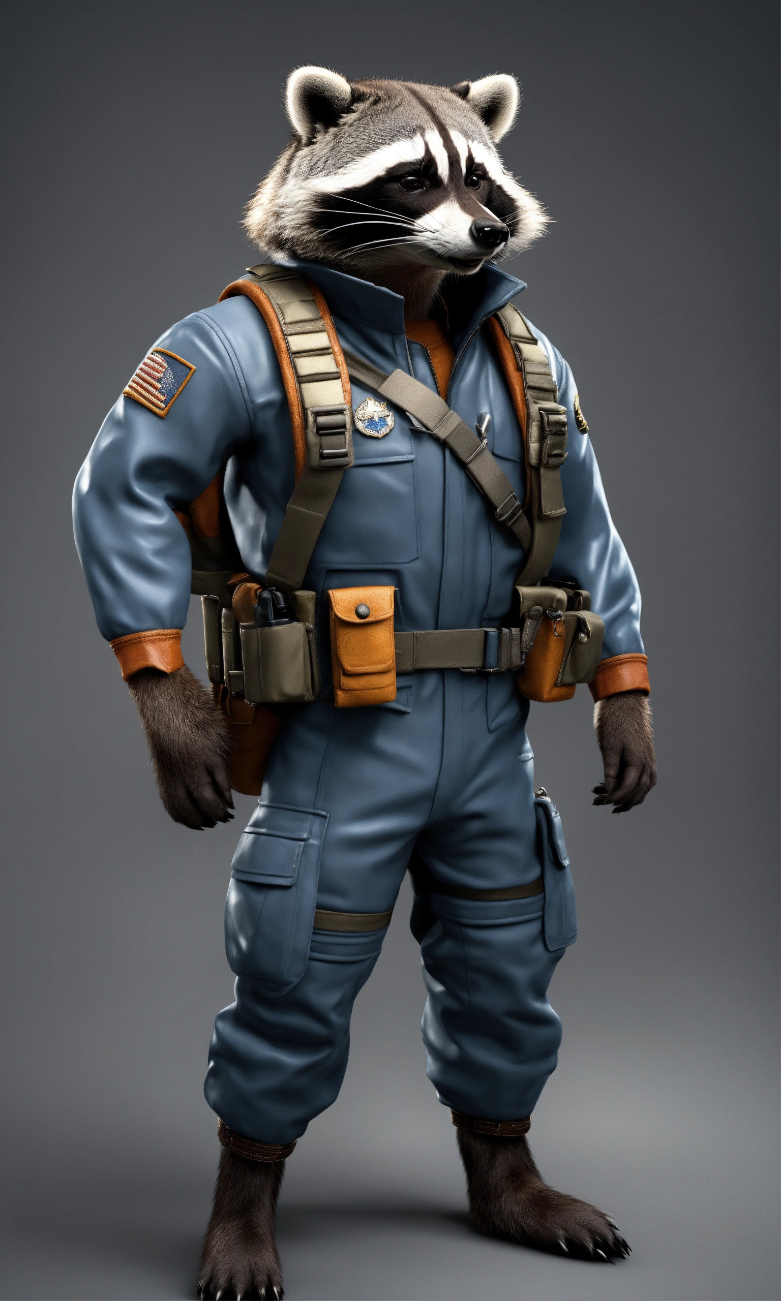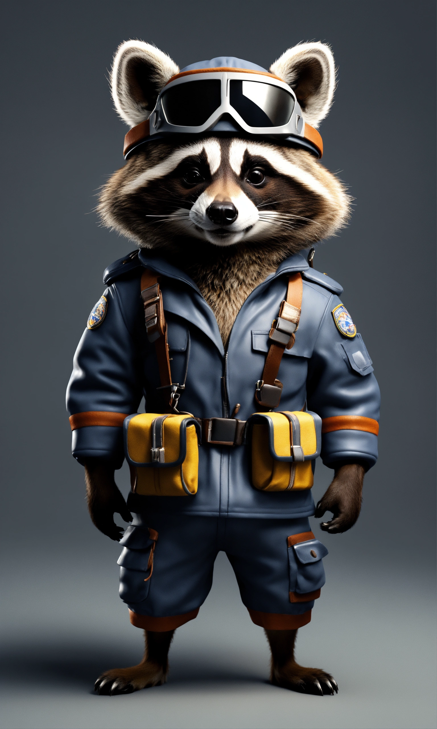 Very high detailed, ultra realistic, character, 3d illustration, grey background, muscular raccoon in pilot costume