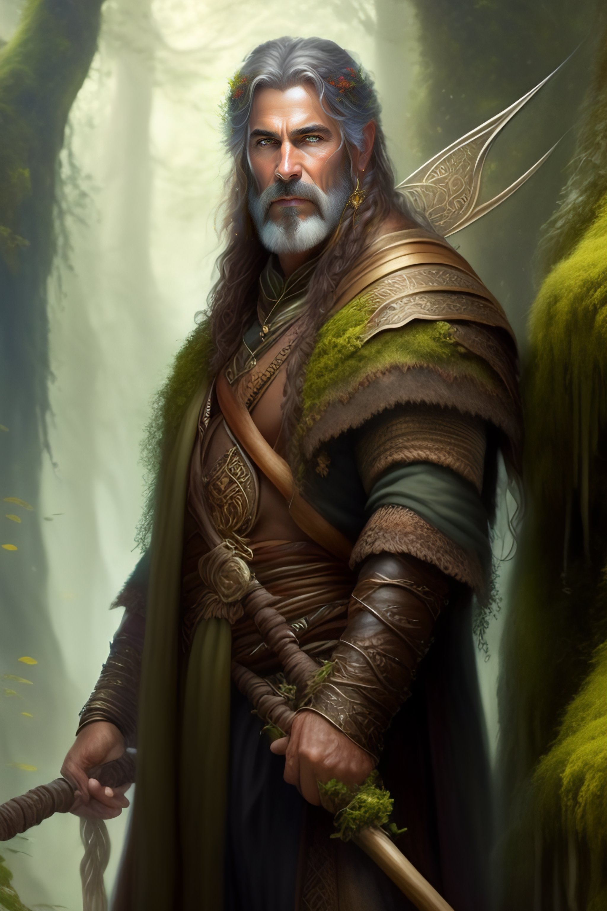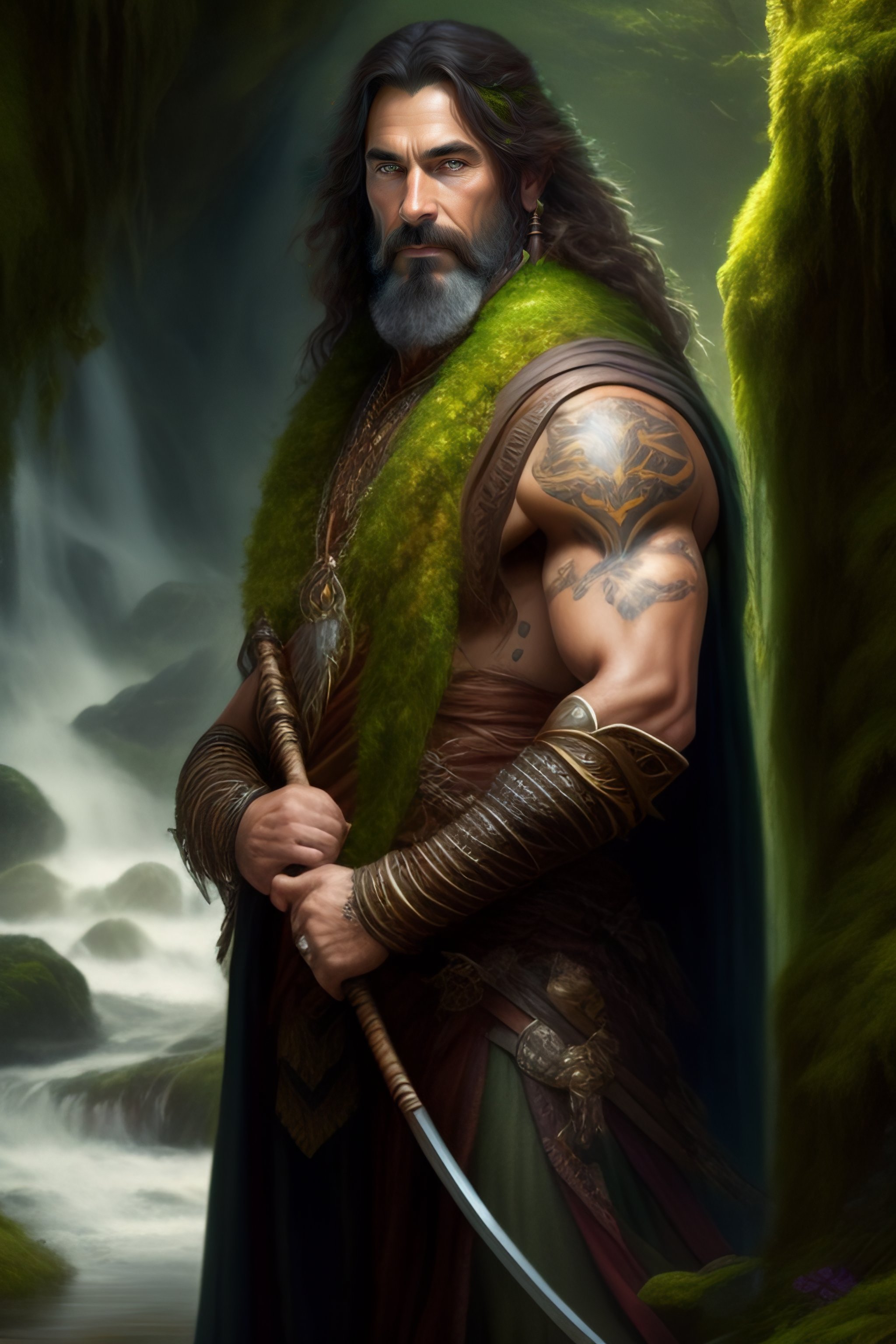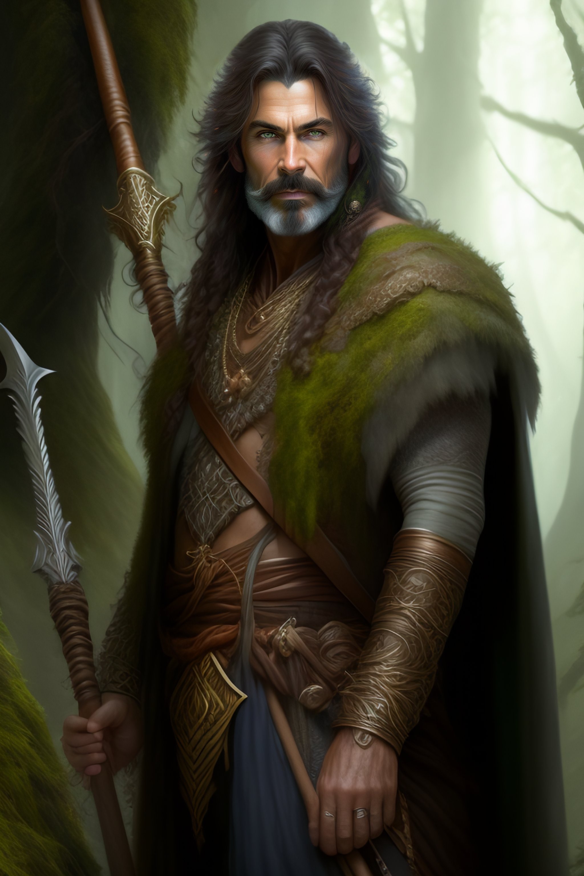 A relaxed male middle aged druid in a sleeveless west, short brown hair, stringy, wielding a long staff which is covered in moss, full body, 8 k, hyperrealistic, hyperdetailed, fantasy portrait by laura sava