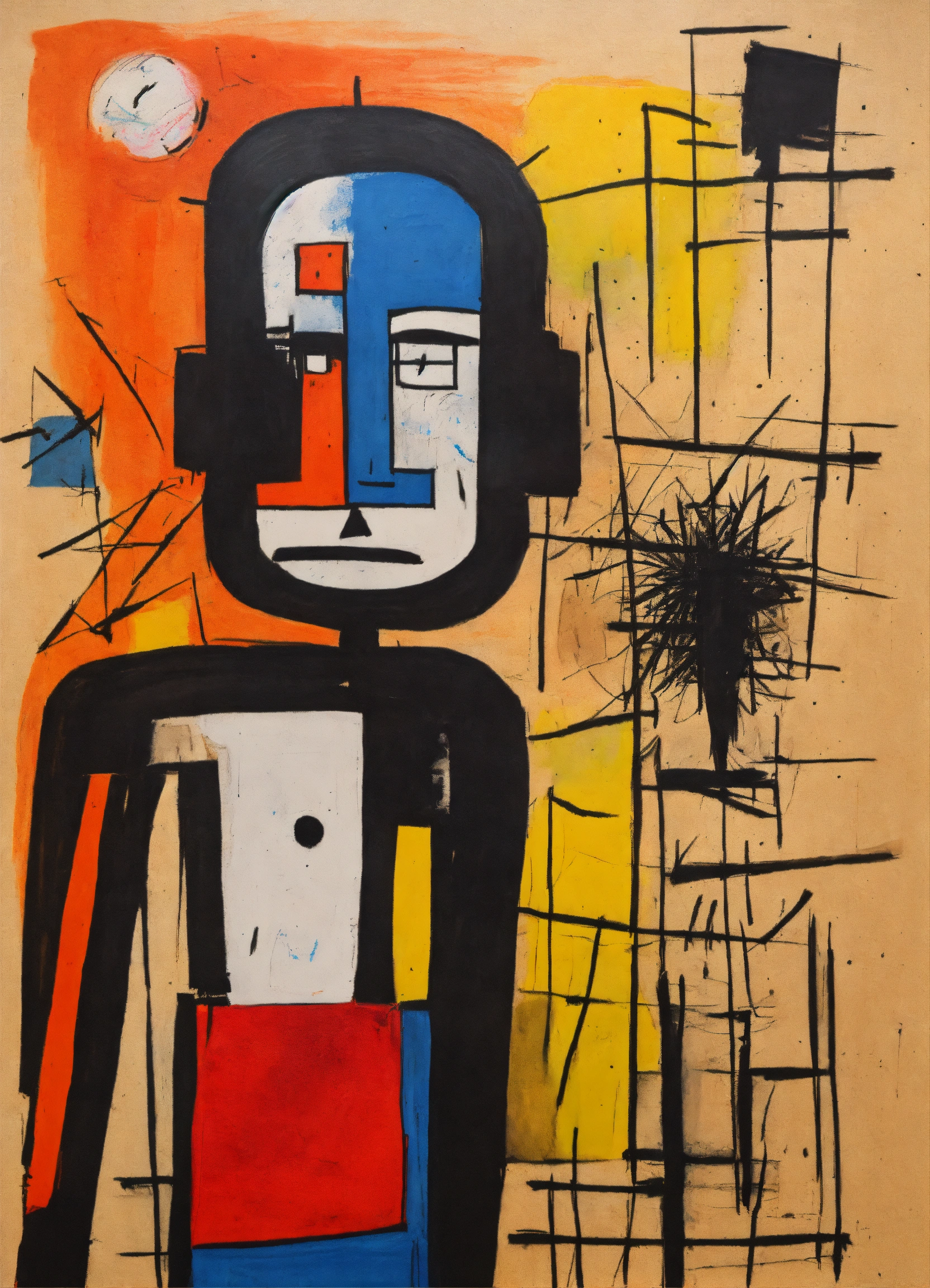 Draw an abstract marker doodle of a man asiatic and black features combined, in the style of a 4 year old and basquiat suprematism poster style