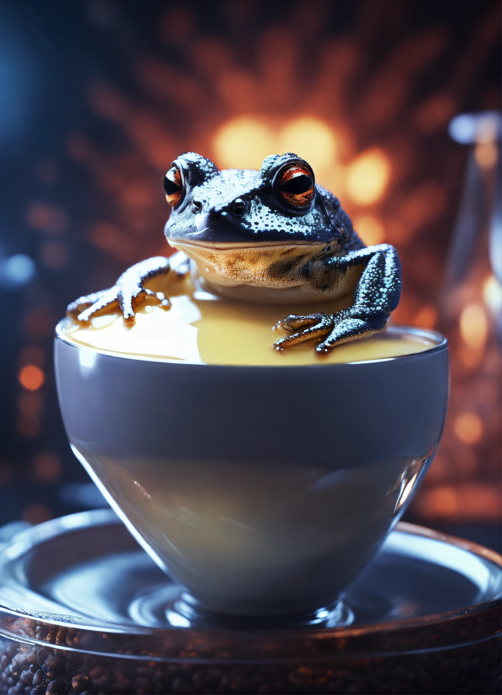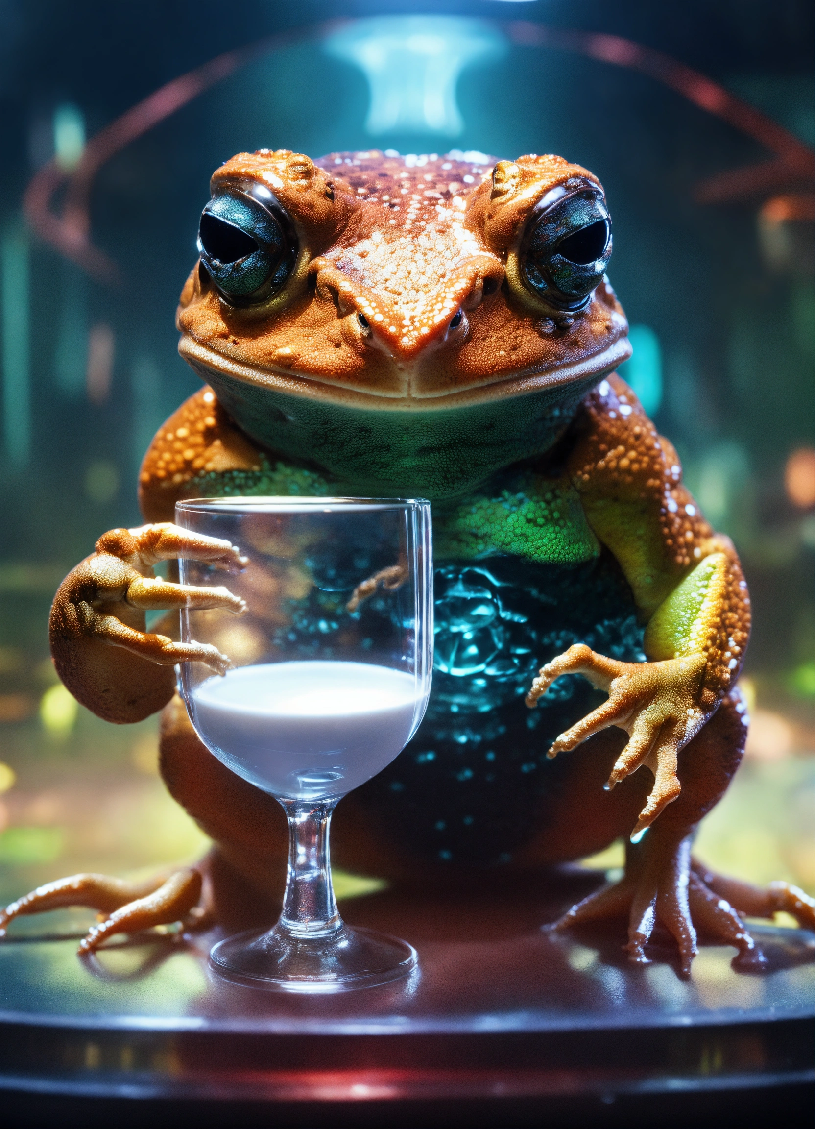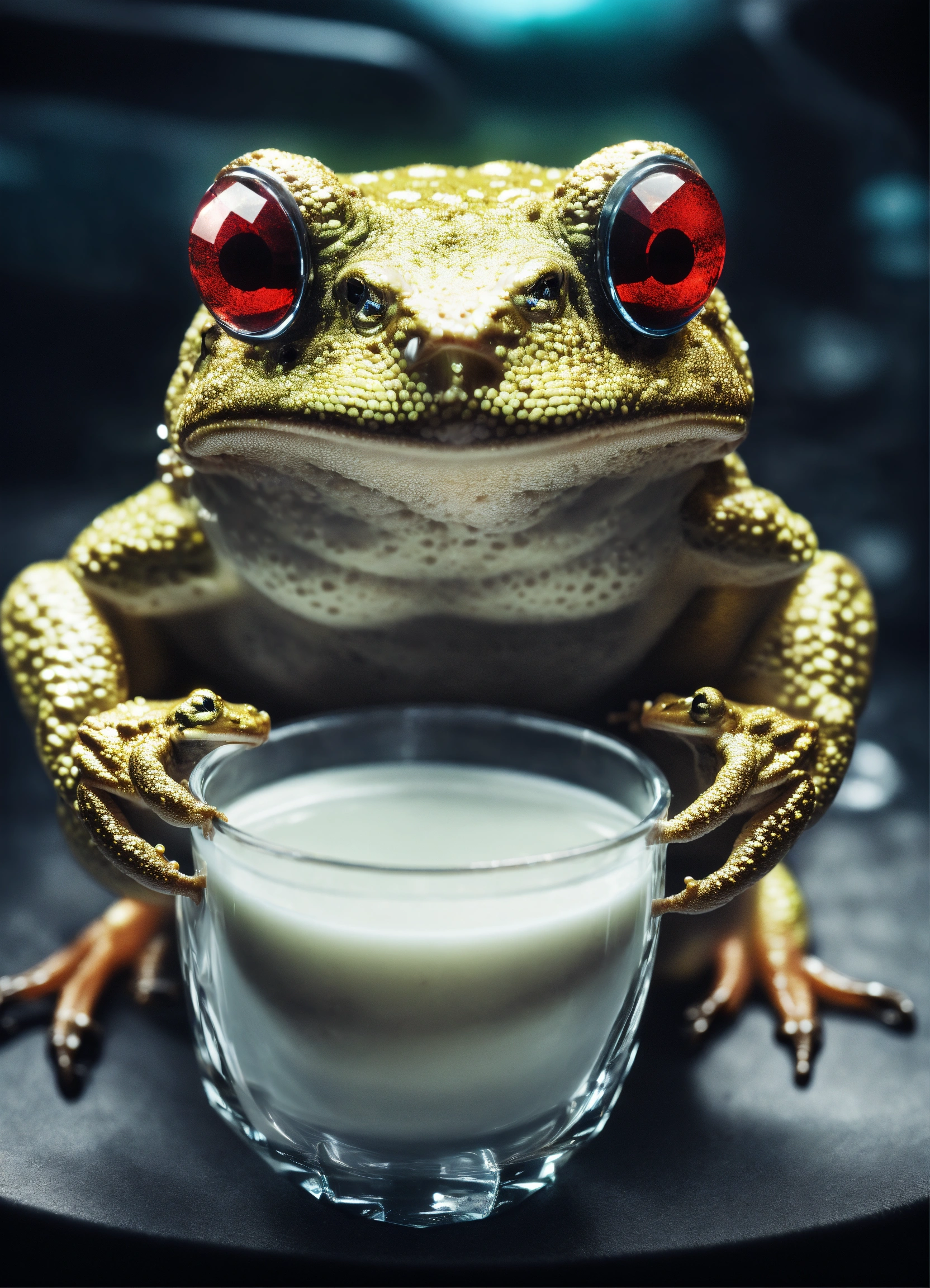 Evil demonic ai god diamond toad holding a glass of milk above a human brain, super advanced technology, futuristic, hyper digital background, extremely detailed and realistic, ominous and eery
