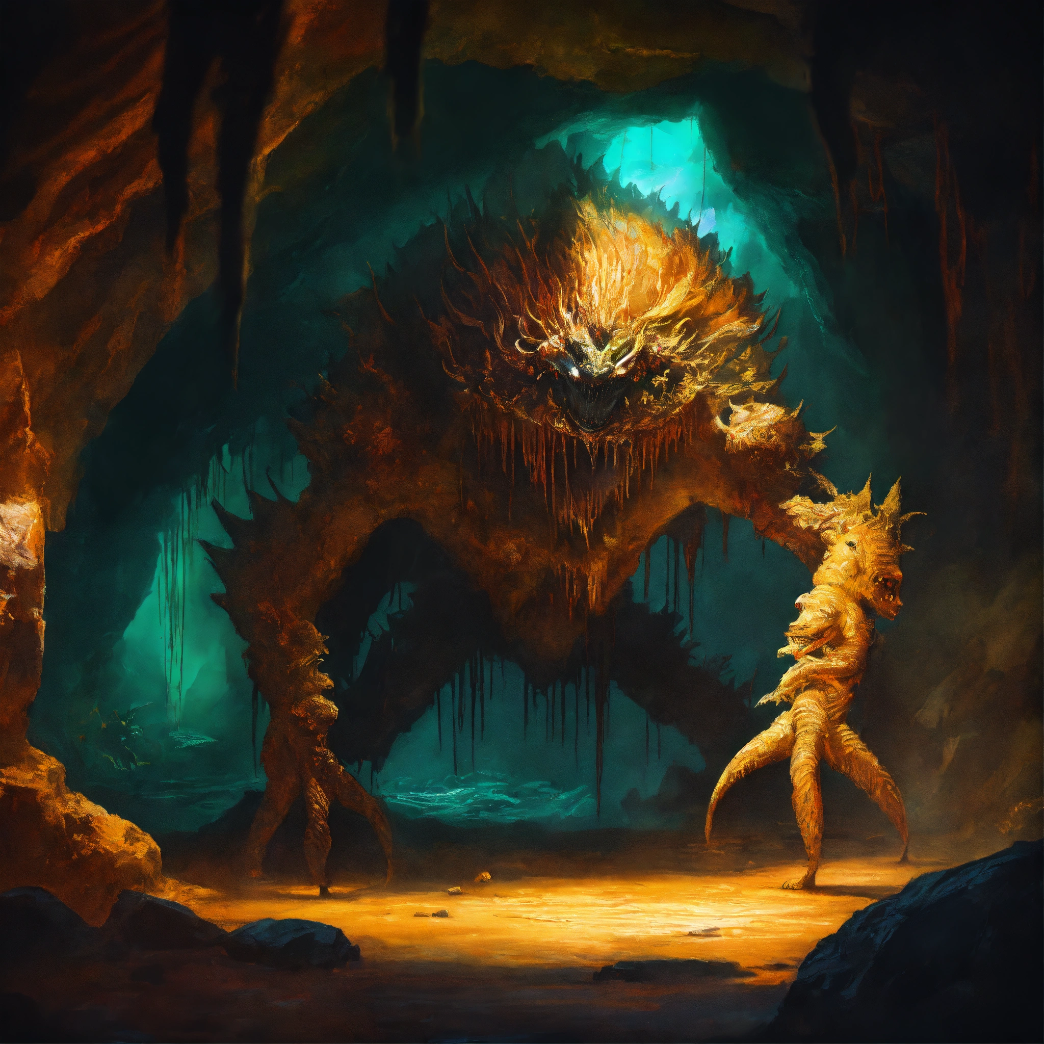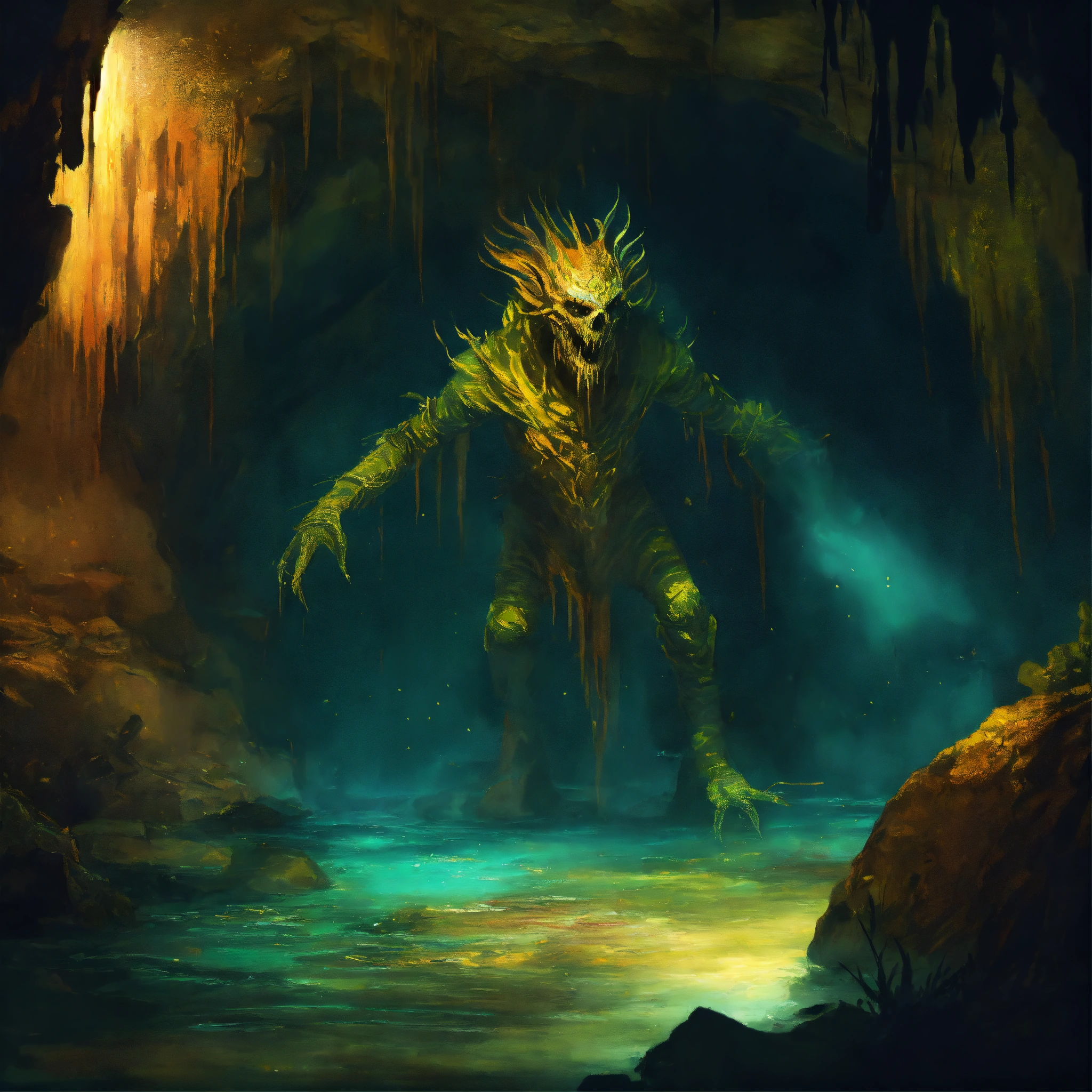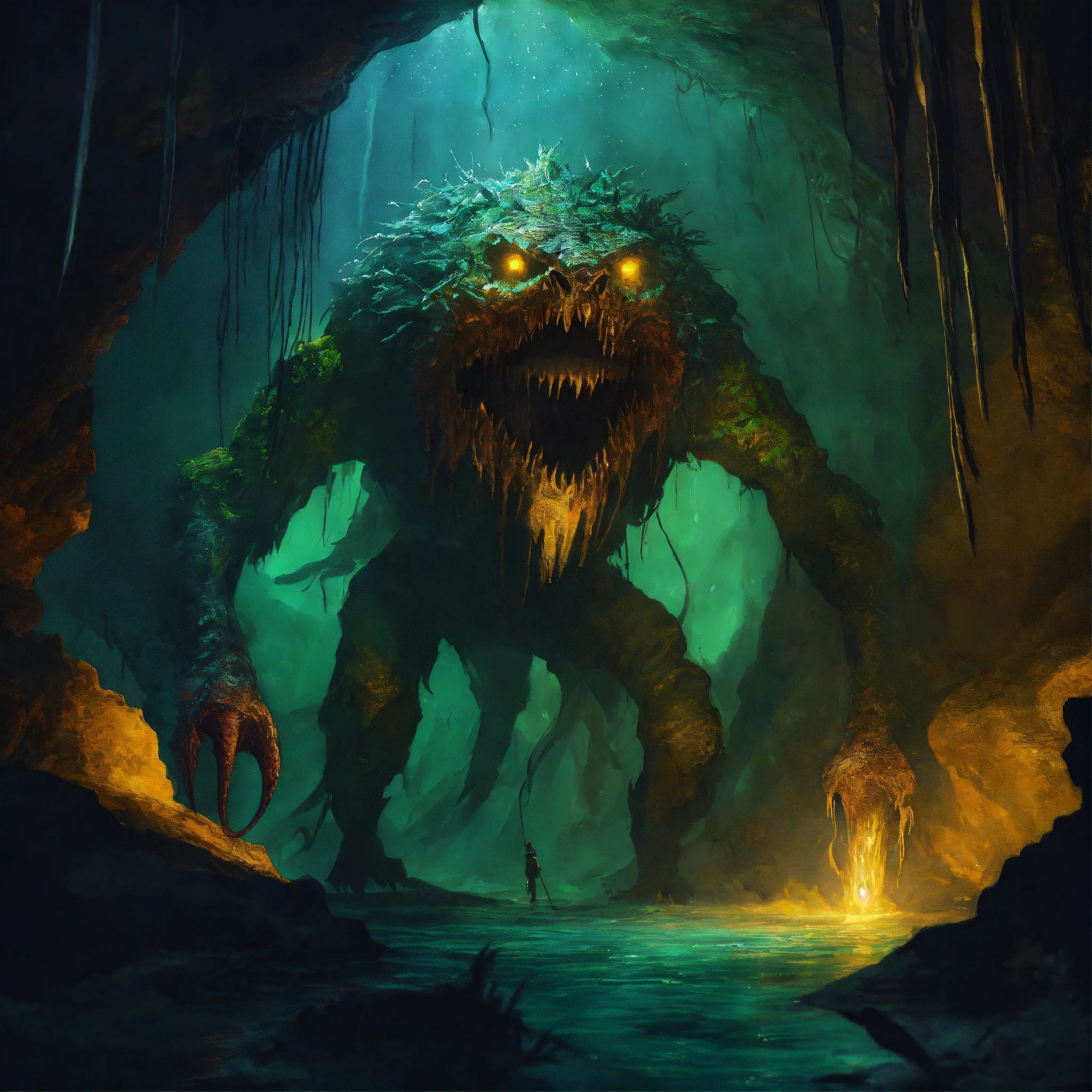Concept art of a scary creature in the dephts of a cave cenote, low light, oil painting style, highly detailed, brush strokes, 8k