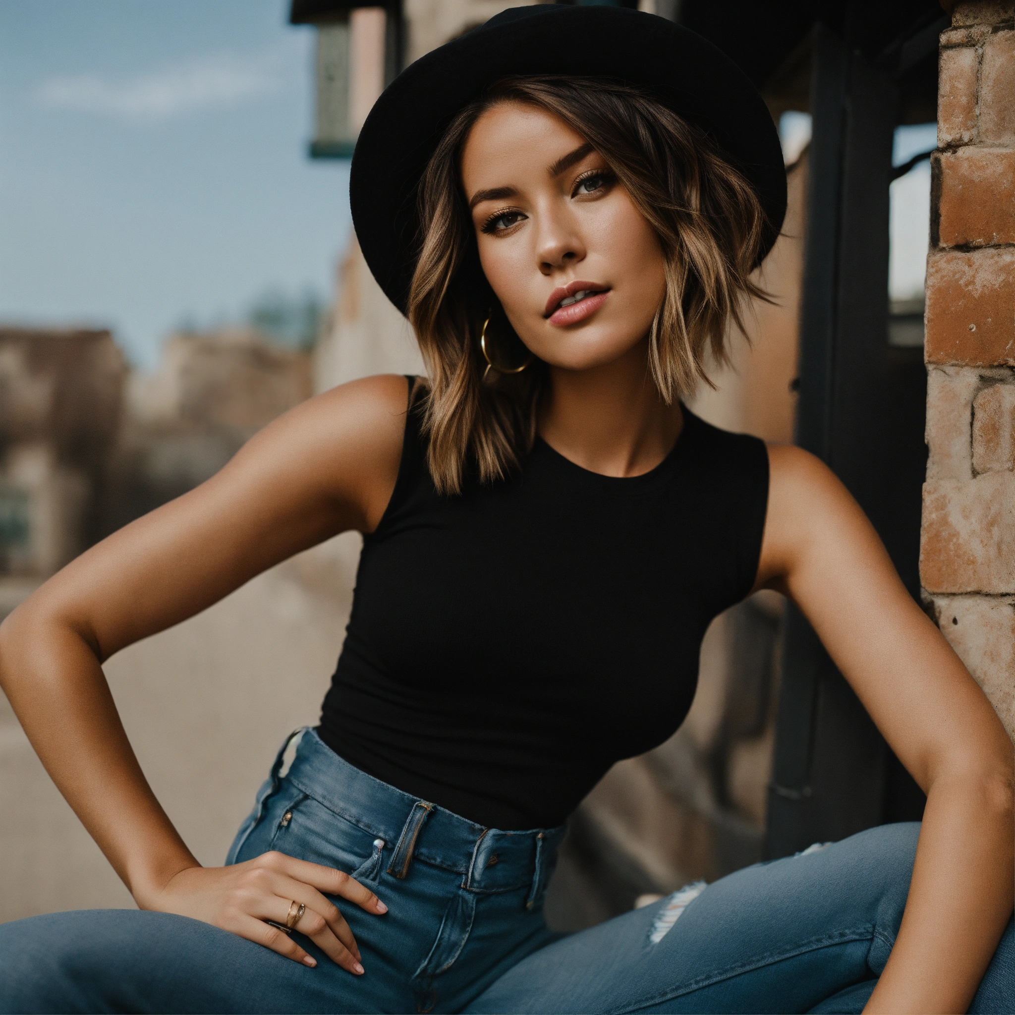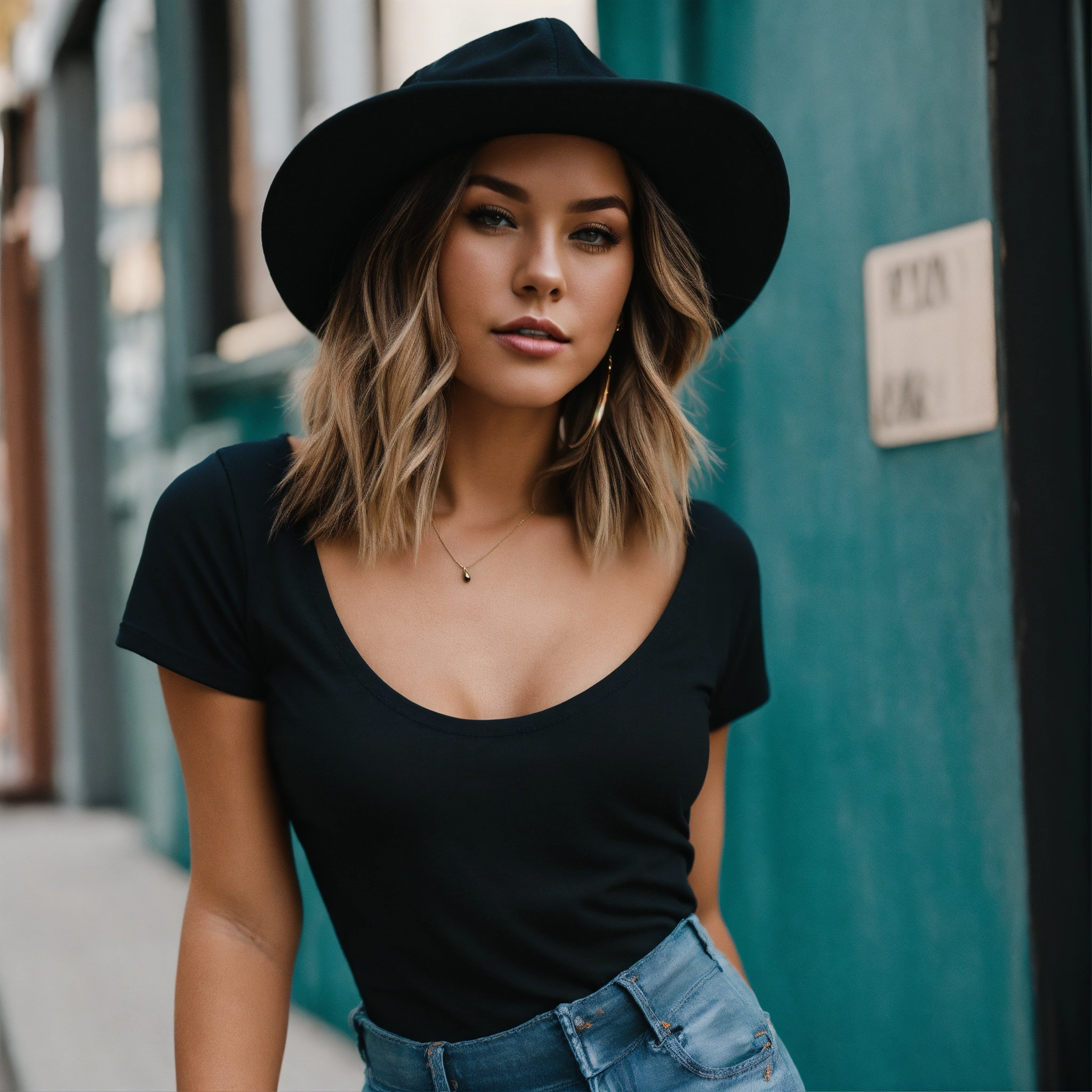 Caucasian woman wearing a fitted basic black short cap sleeve scoop neck bodysuit and jeans for a free people photoshoot