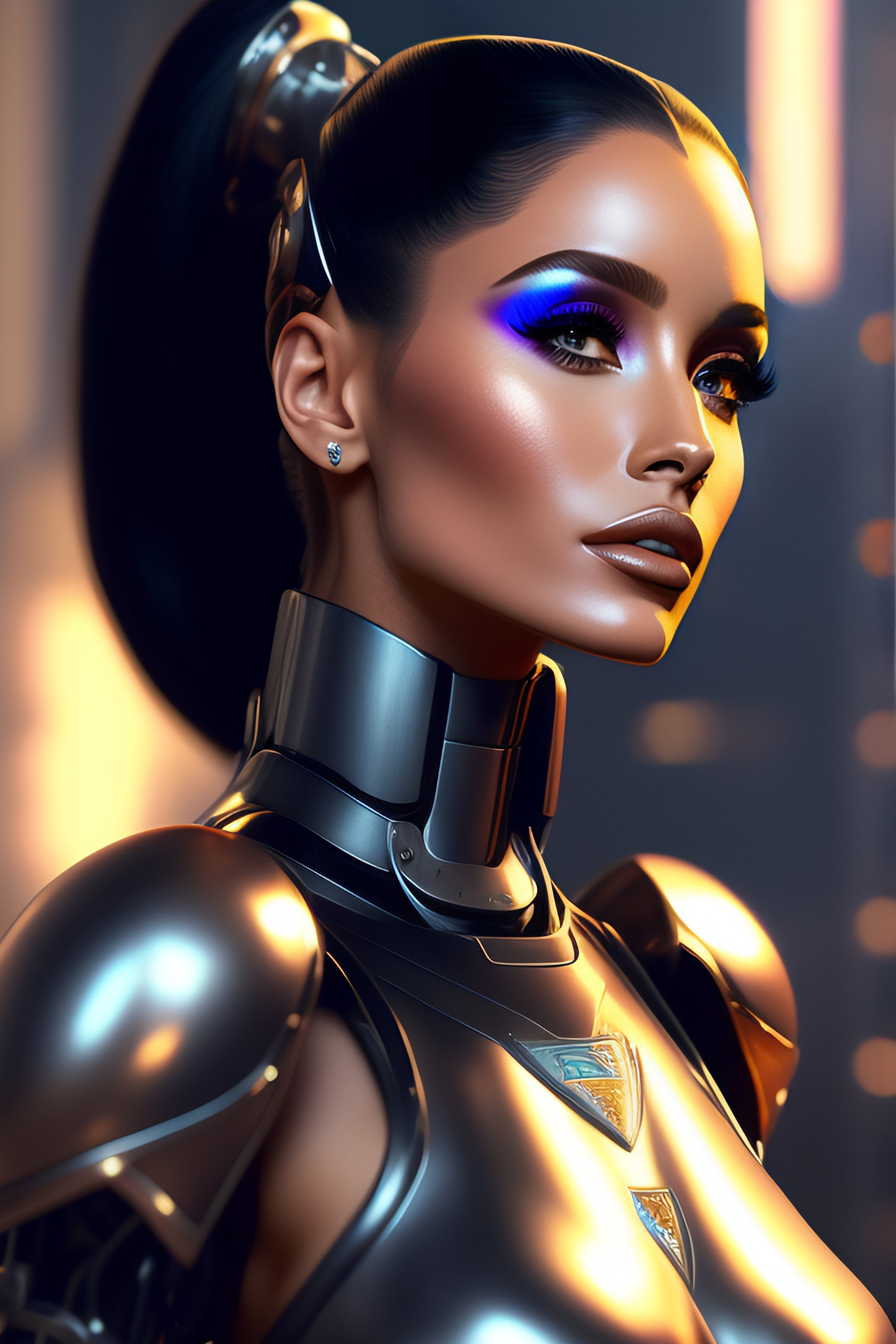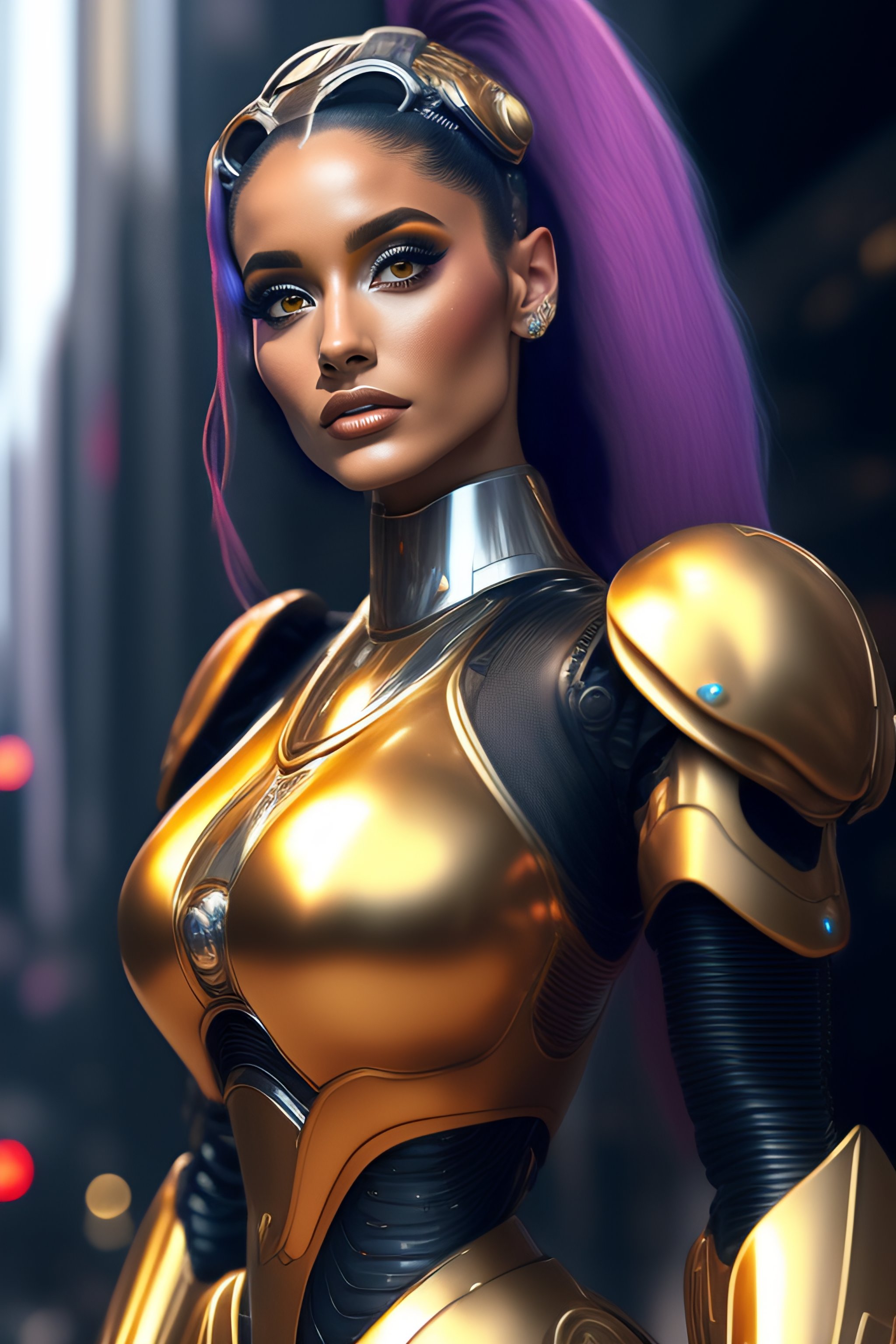 A female robot ariana grande full body realistic scifi cyberpunk power armor robot, detailed, centered, digital painting, artstation, concept art, donato giancola, joseph christian leyendecker, wlop, boris vallejo, 8k resolution, extremely detailed, beautiful, establishing shot, artistic, hyperrealistic, beautiful face, octane render, cinematic lighting, dramatic lighting, masterpiece