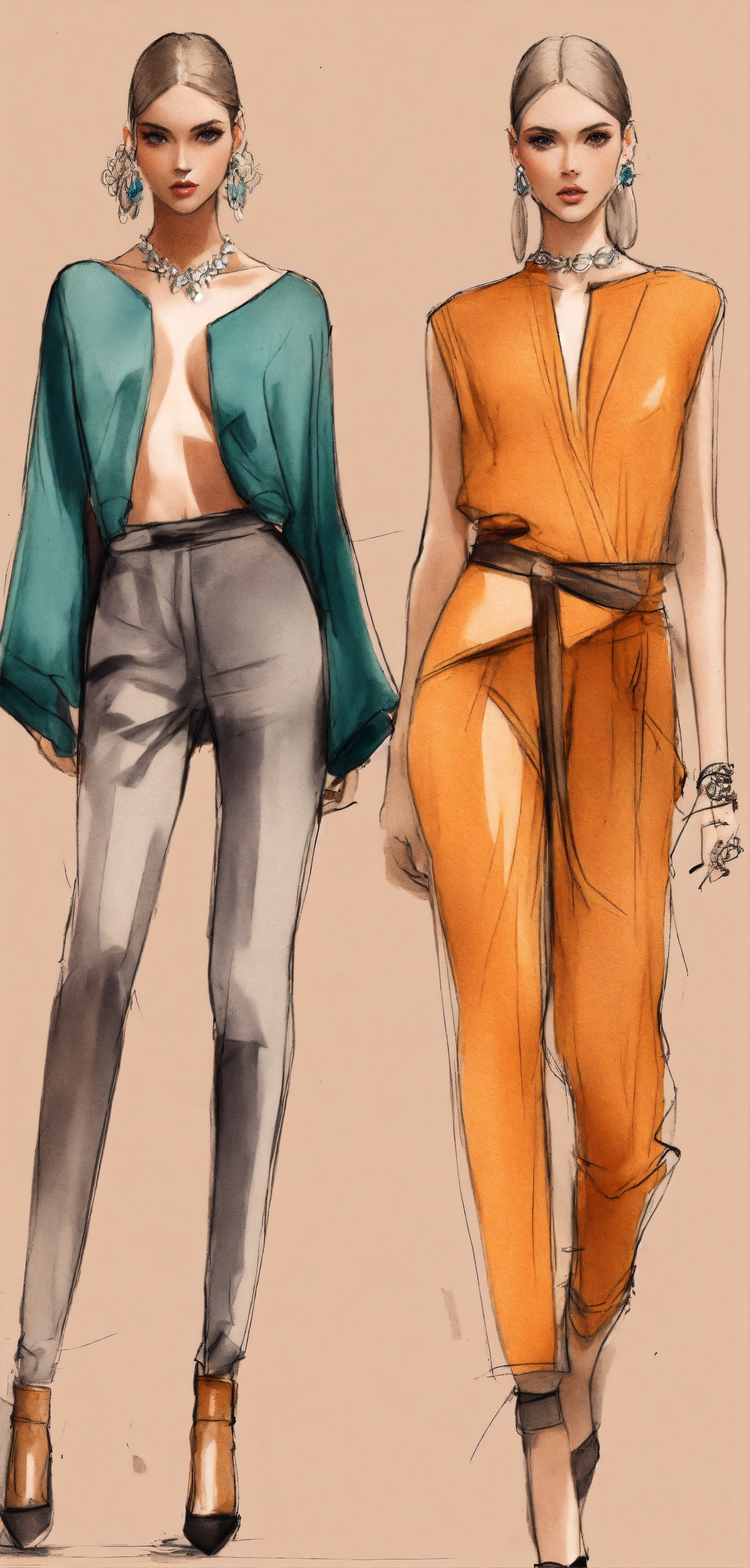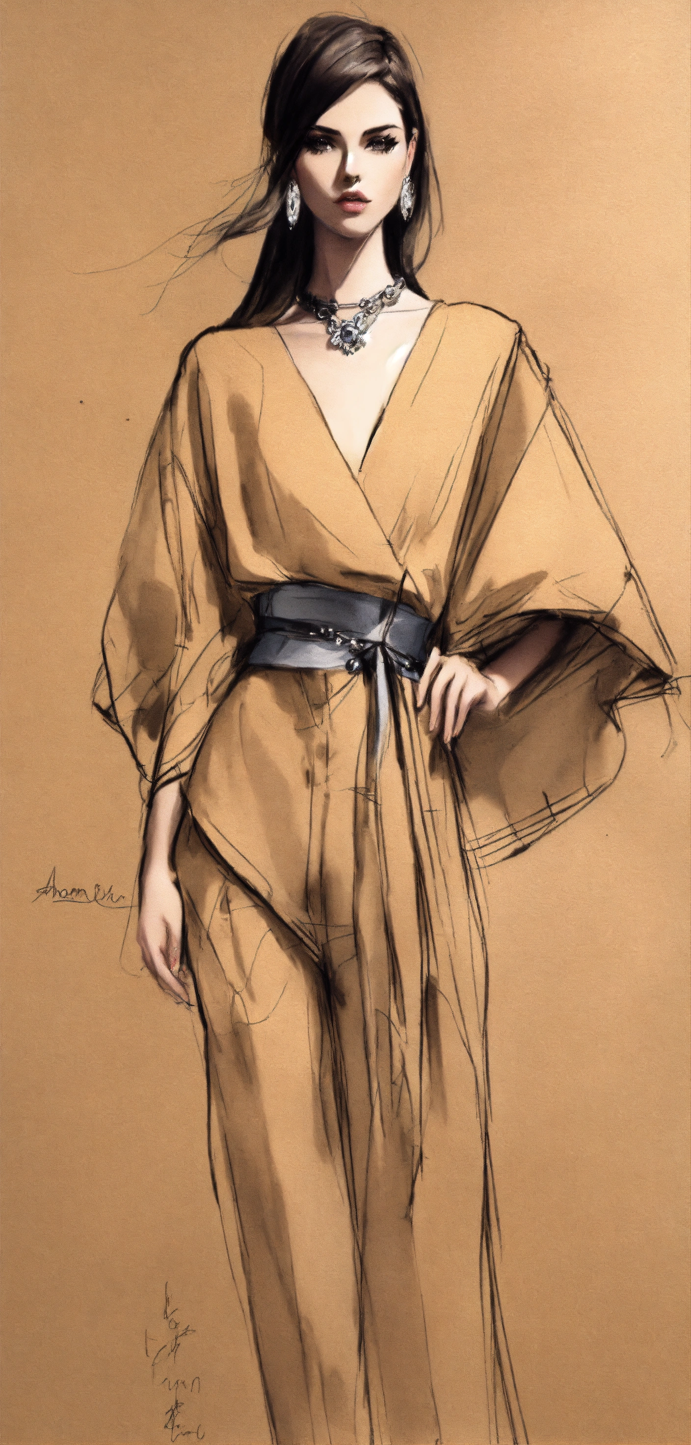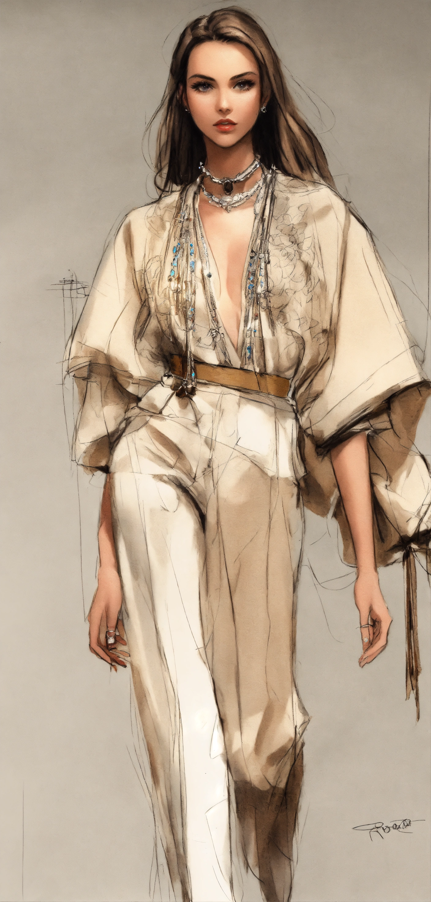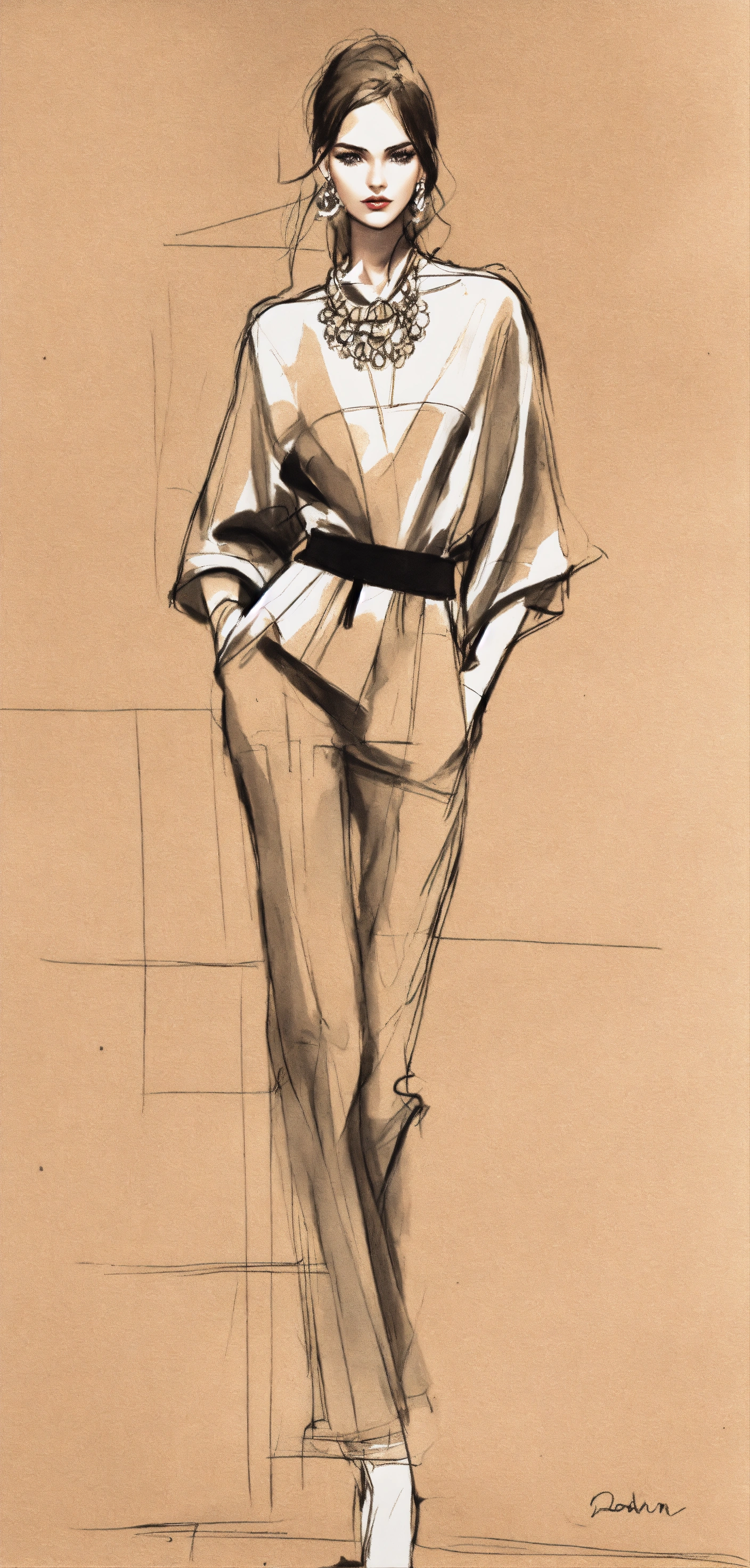 Set designer, rough sketches, fashion illustration, pencil sketches rough, models with jewelry, wearing modern dolman sleeve outfits, 1 sketch