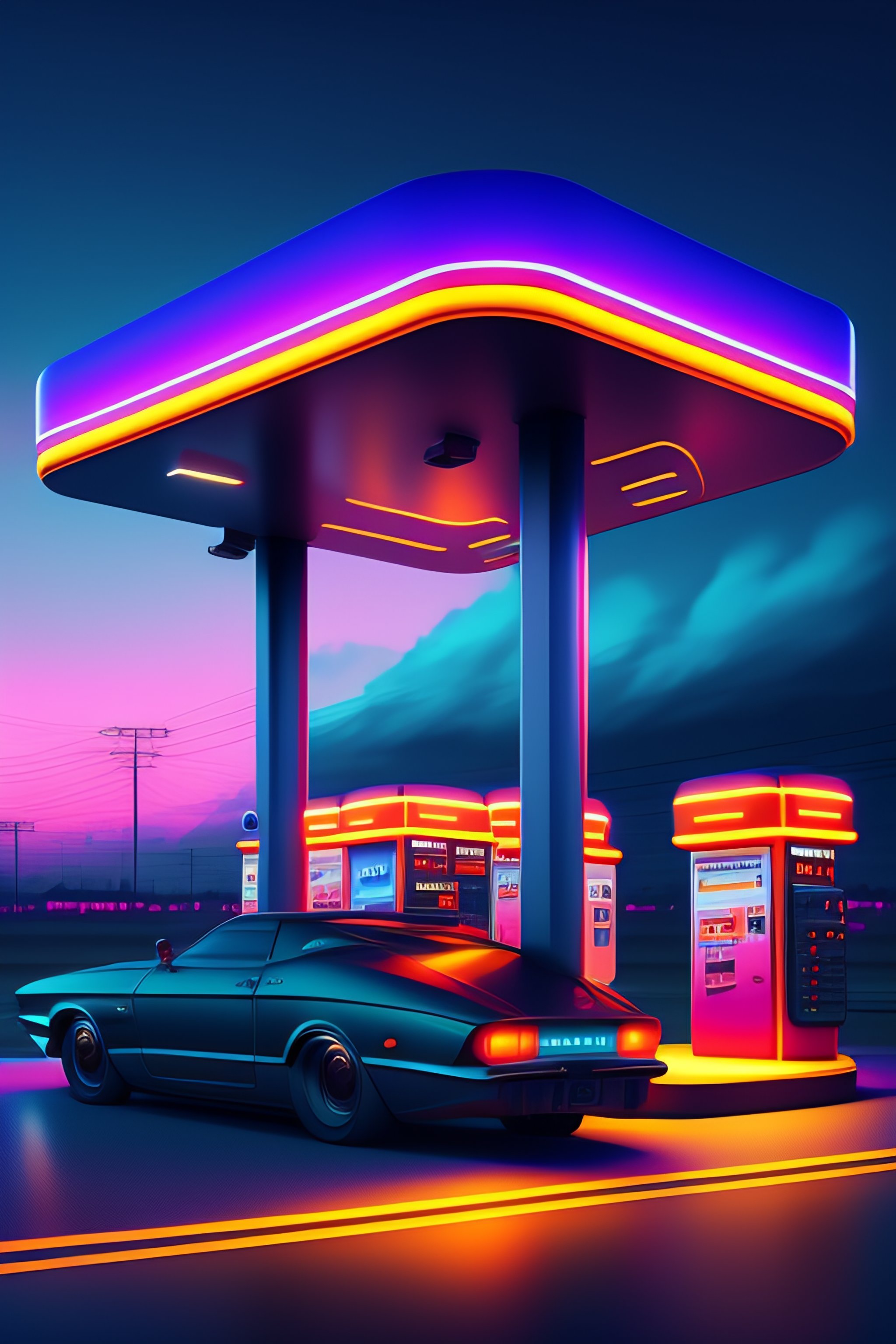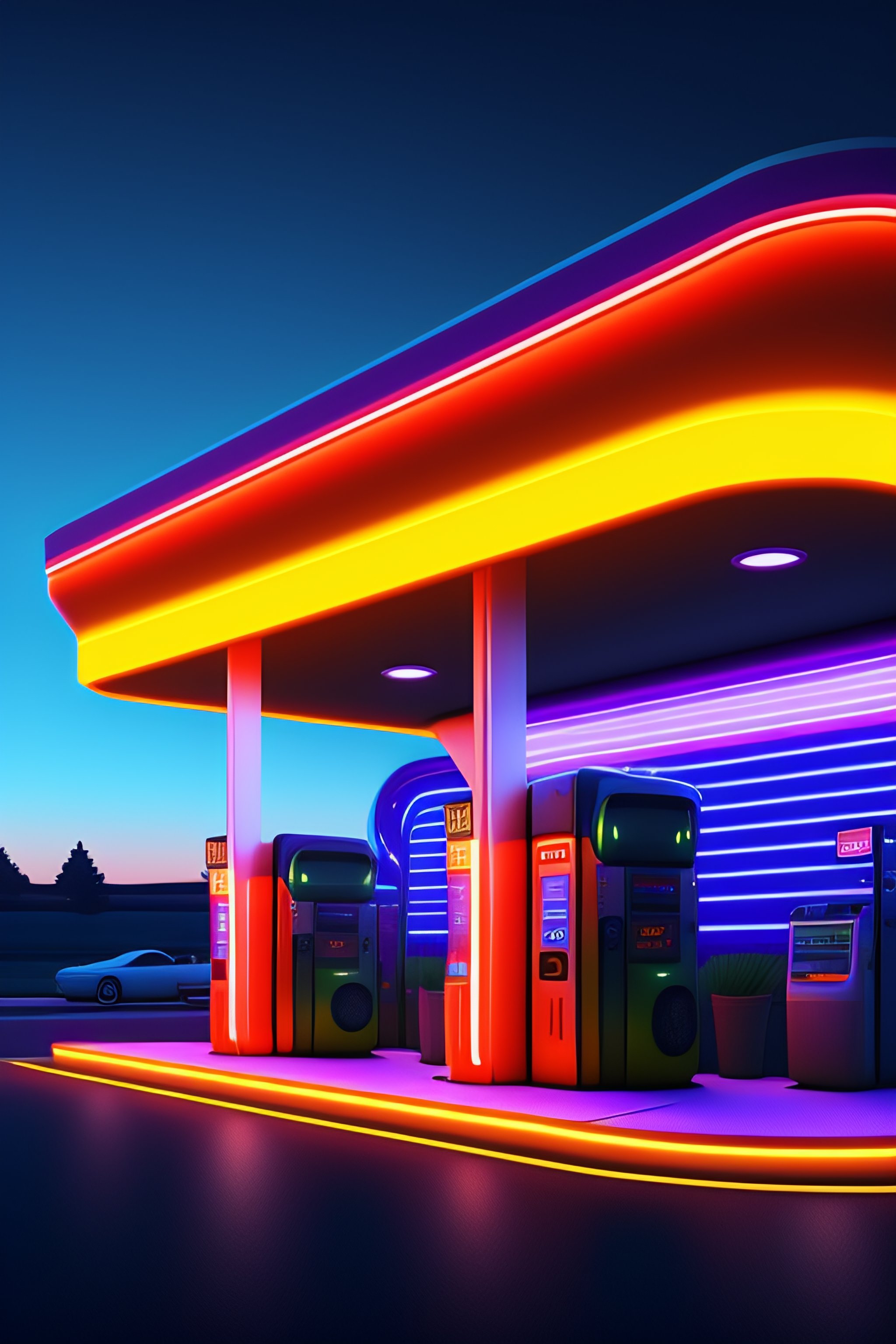 Landscape of a nocturne cyberpunk gas station with neon light and flying cars, digital art, workstation