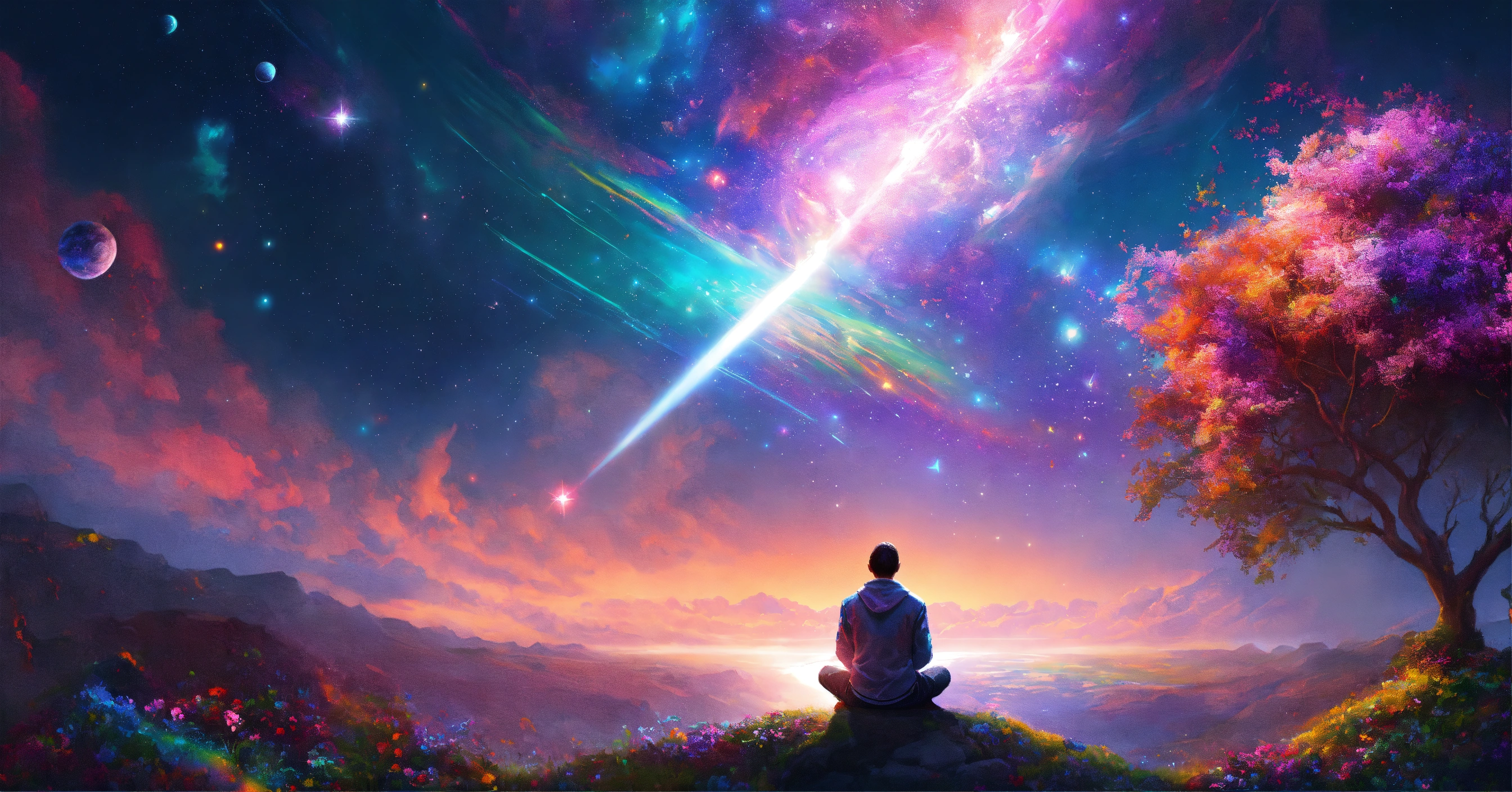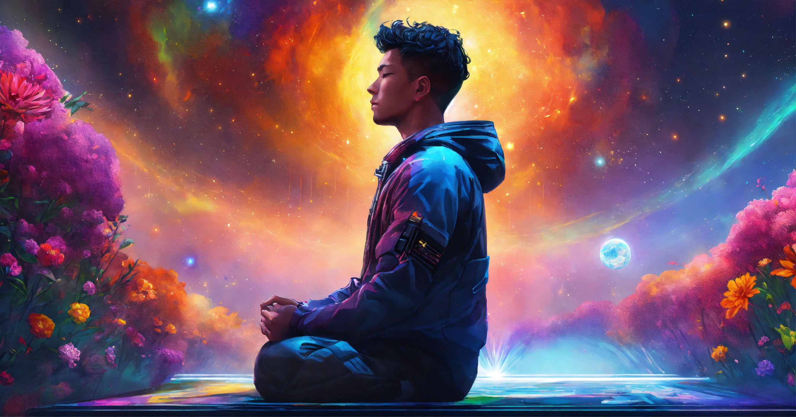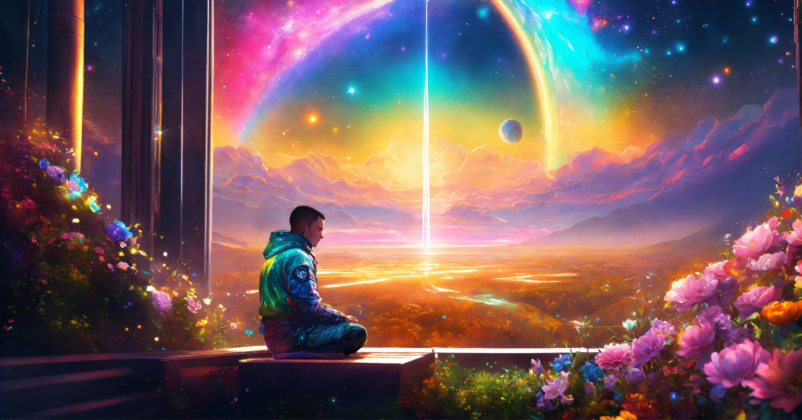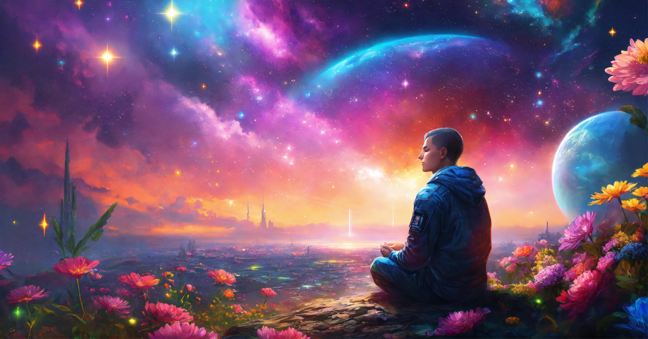 Cyberpunk digital painting of a person praying, in space, meditation, self forgiveness, cosmic space, exuding enlightenment, rainbow colors, flowers everywhere, stars and space, vulmetric lighting, 8k resolution, highly detailed
