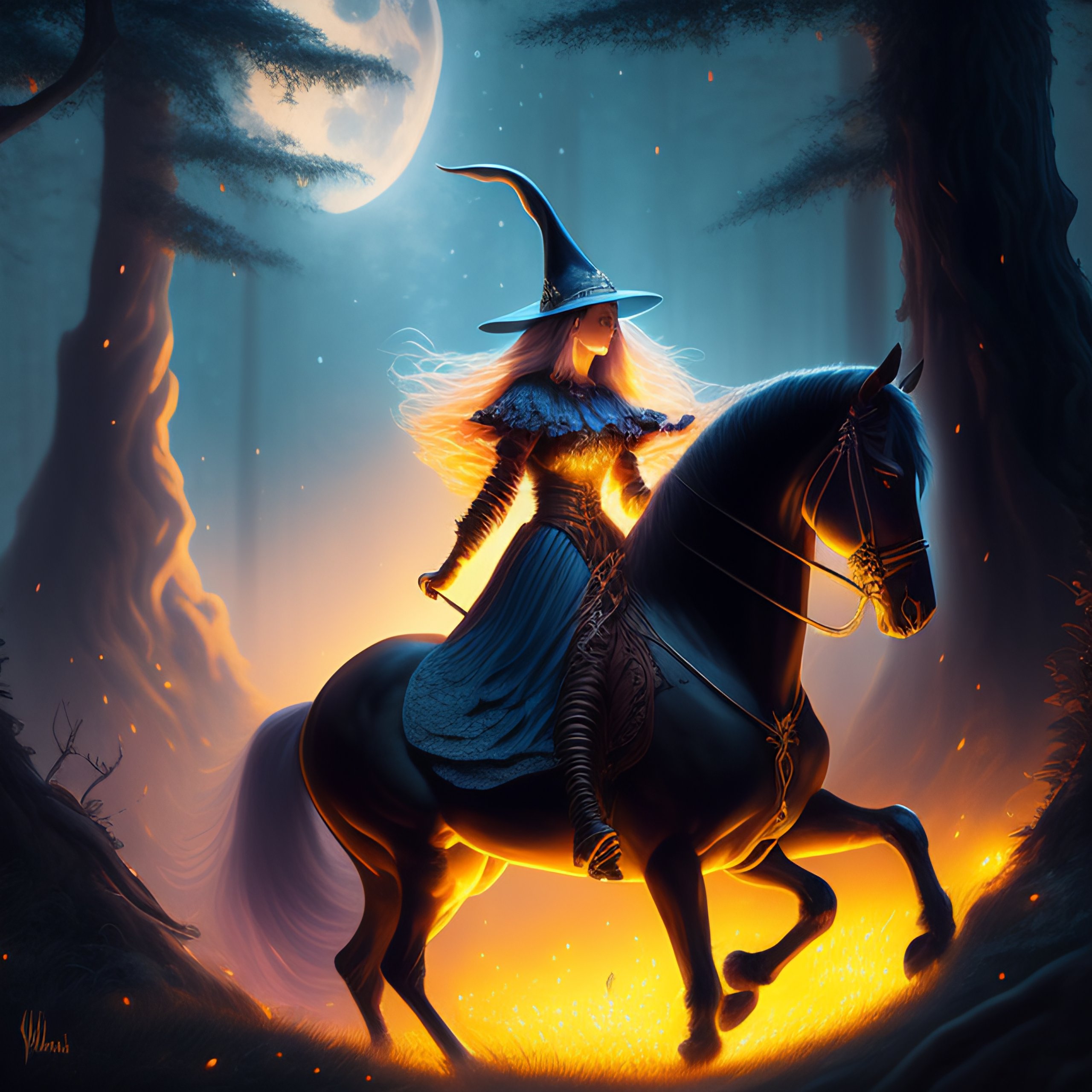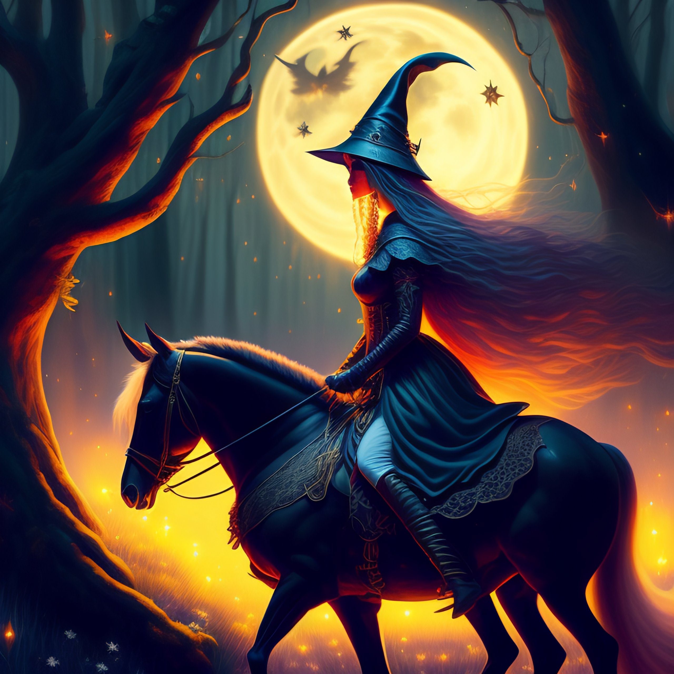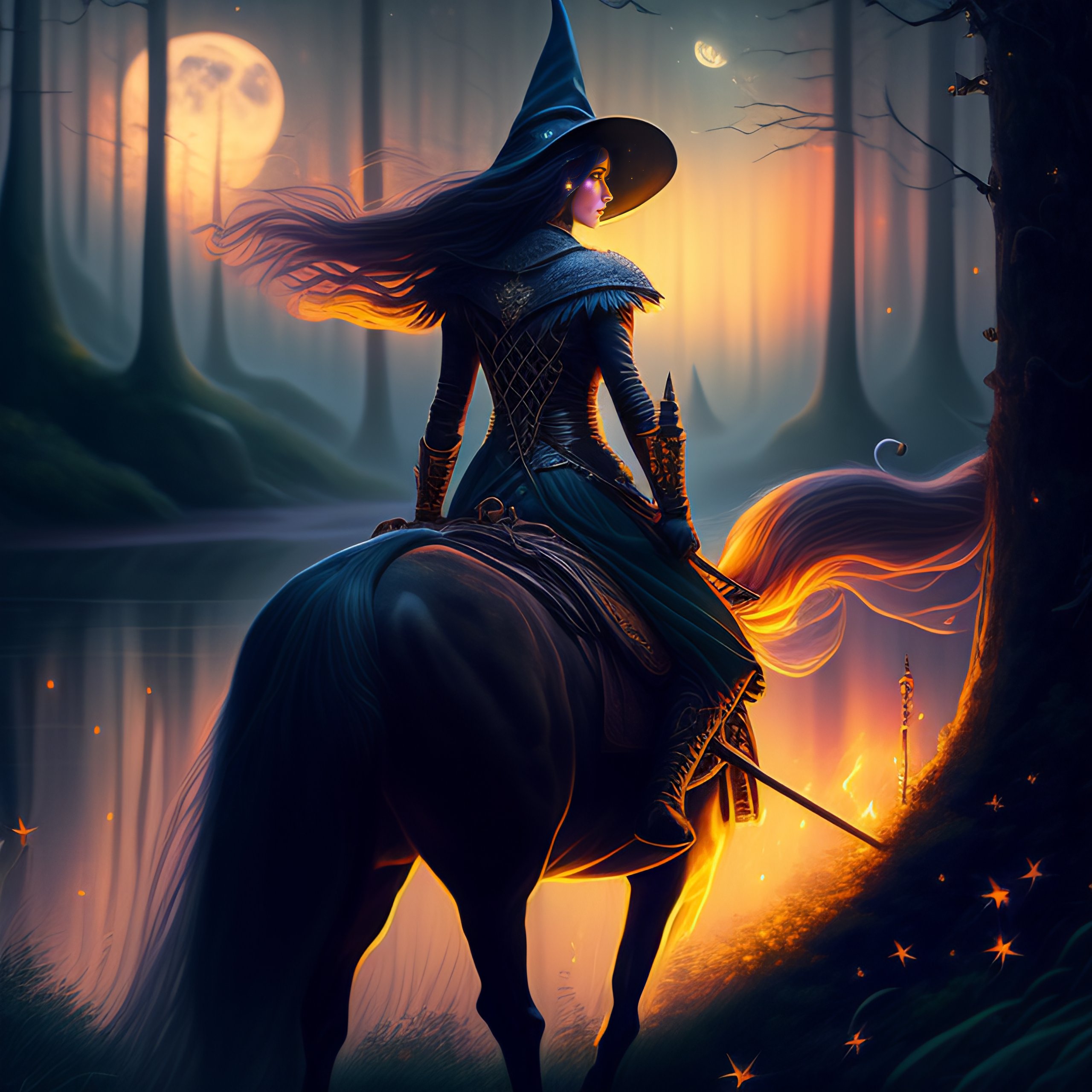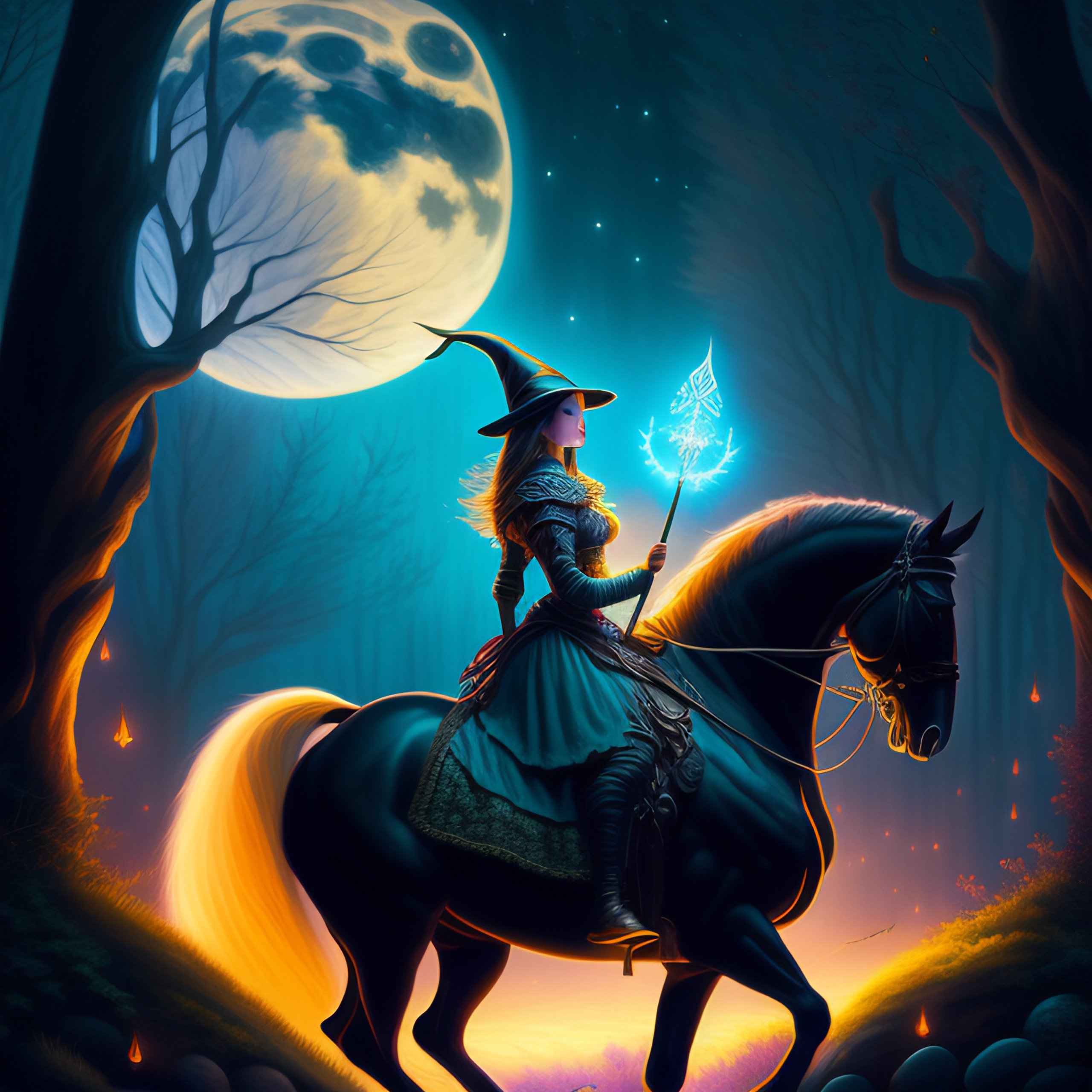 Very very very very highly detailed epic painting of a witch riding under the moonlight with her, wand, fireflies, fairytale forest, dystopian, sci-fi, extremely detailed, digital painting, artstation, concept art, smooth, sharp focus, illustration, intimidating lighting, best of justin maas, pablo picasso, grant wood
