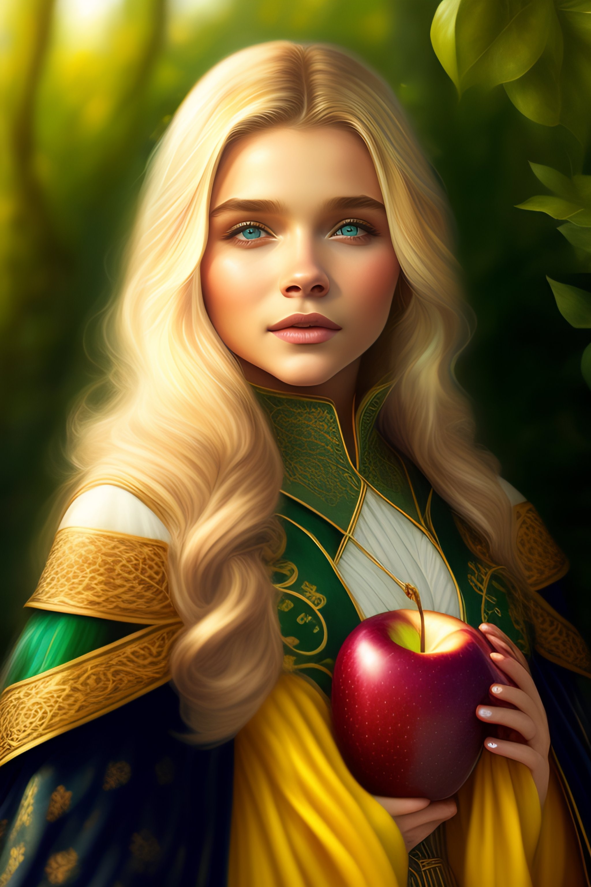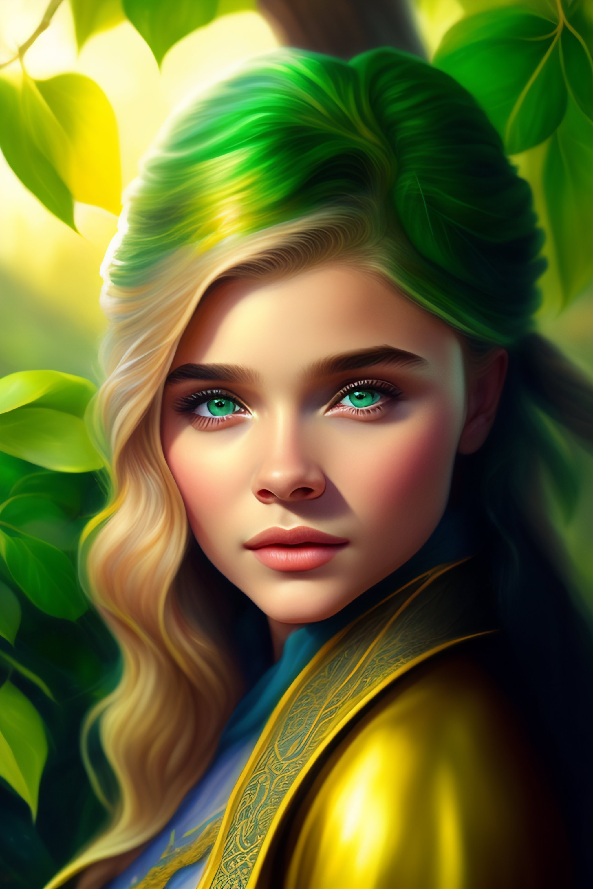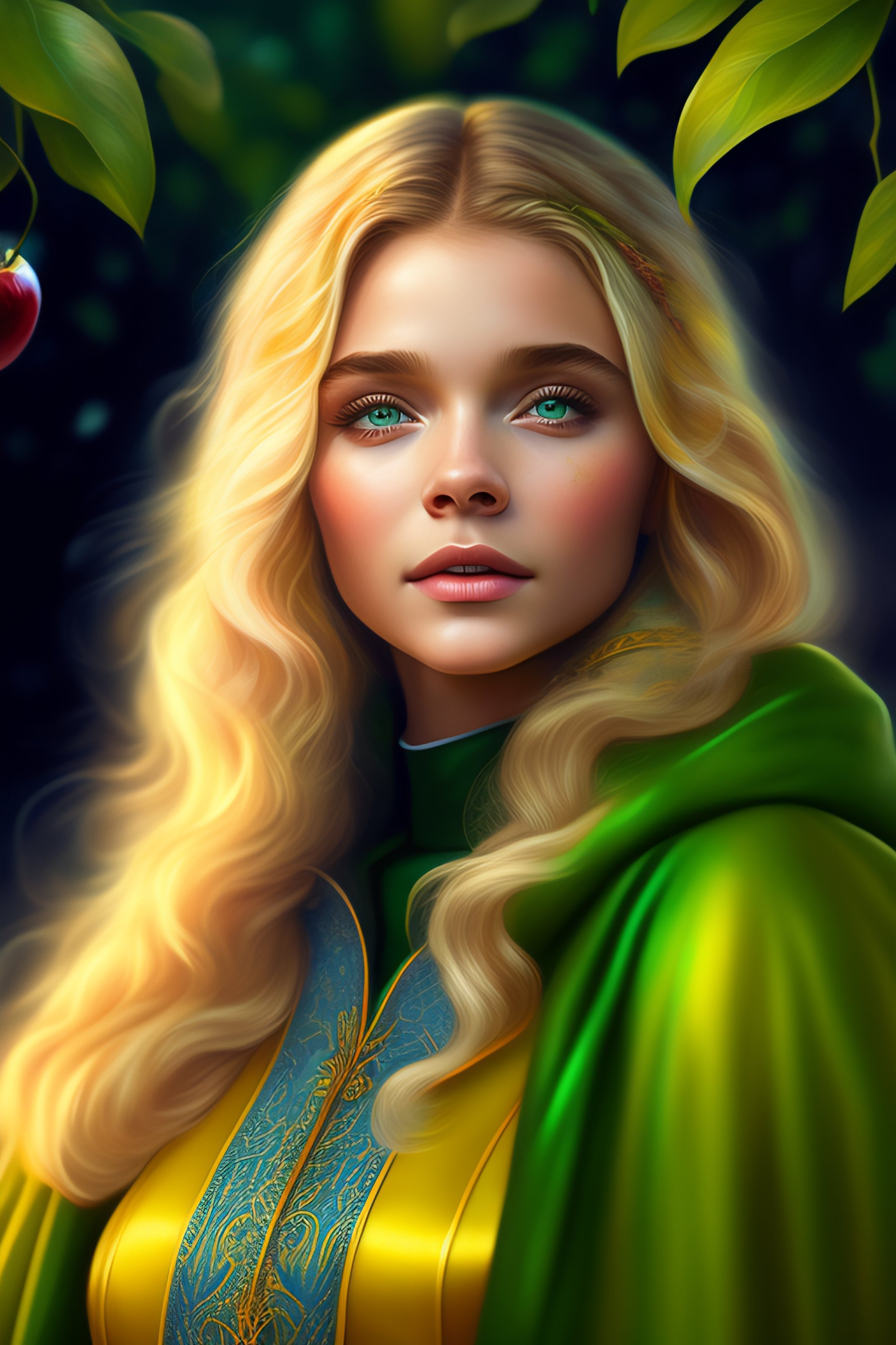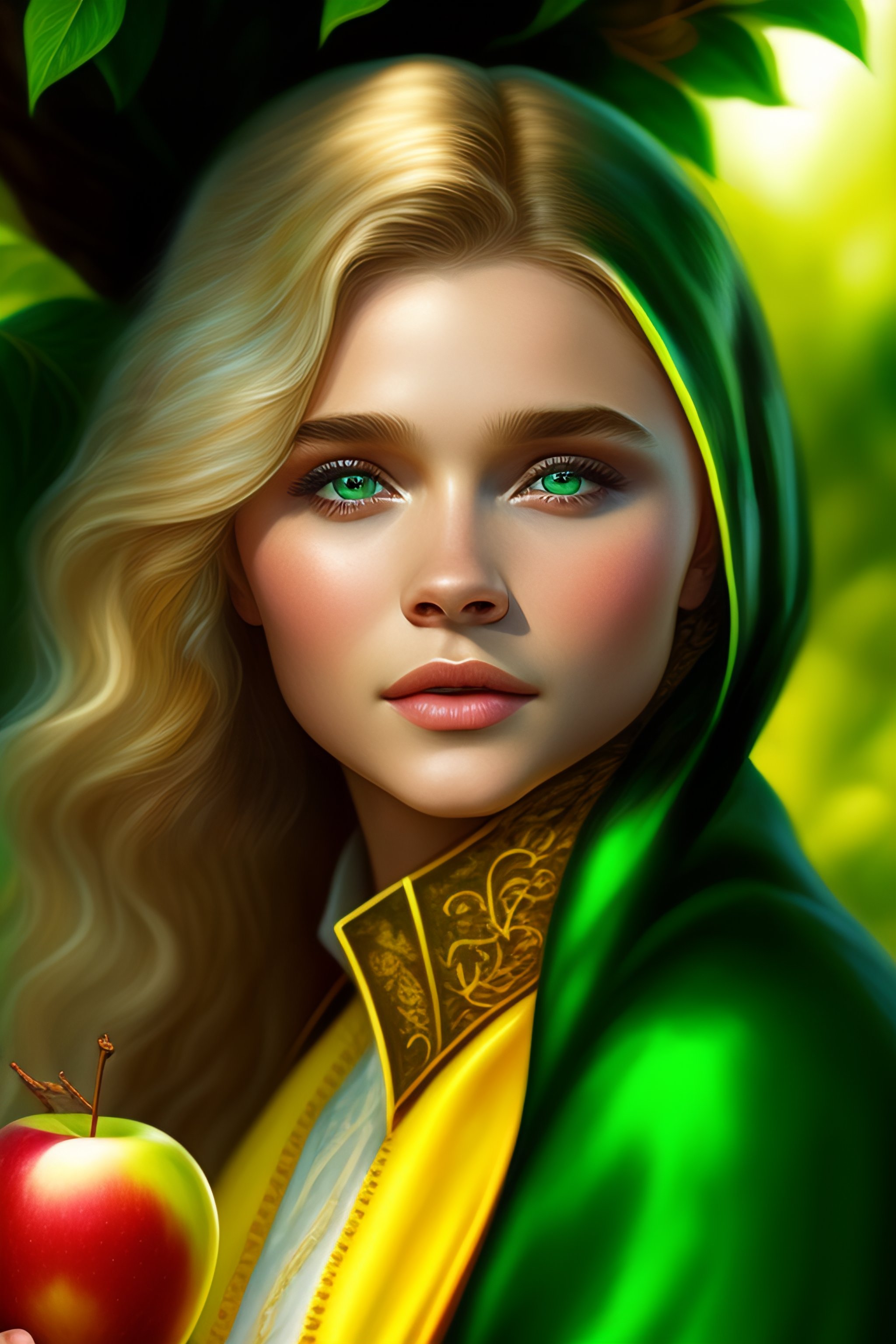 Young mage chloe grace moretz holding an apple, green hair, forest, heavy yellow cloak and chemise, ultra realistic, intricate, elegant, highly detailed, digital painting, artstaion, smooth, sharp, focus, illustration, art by artgerm