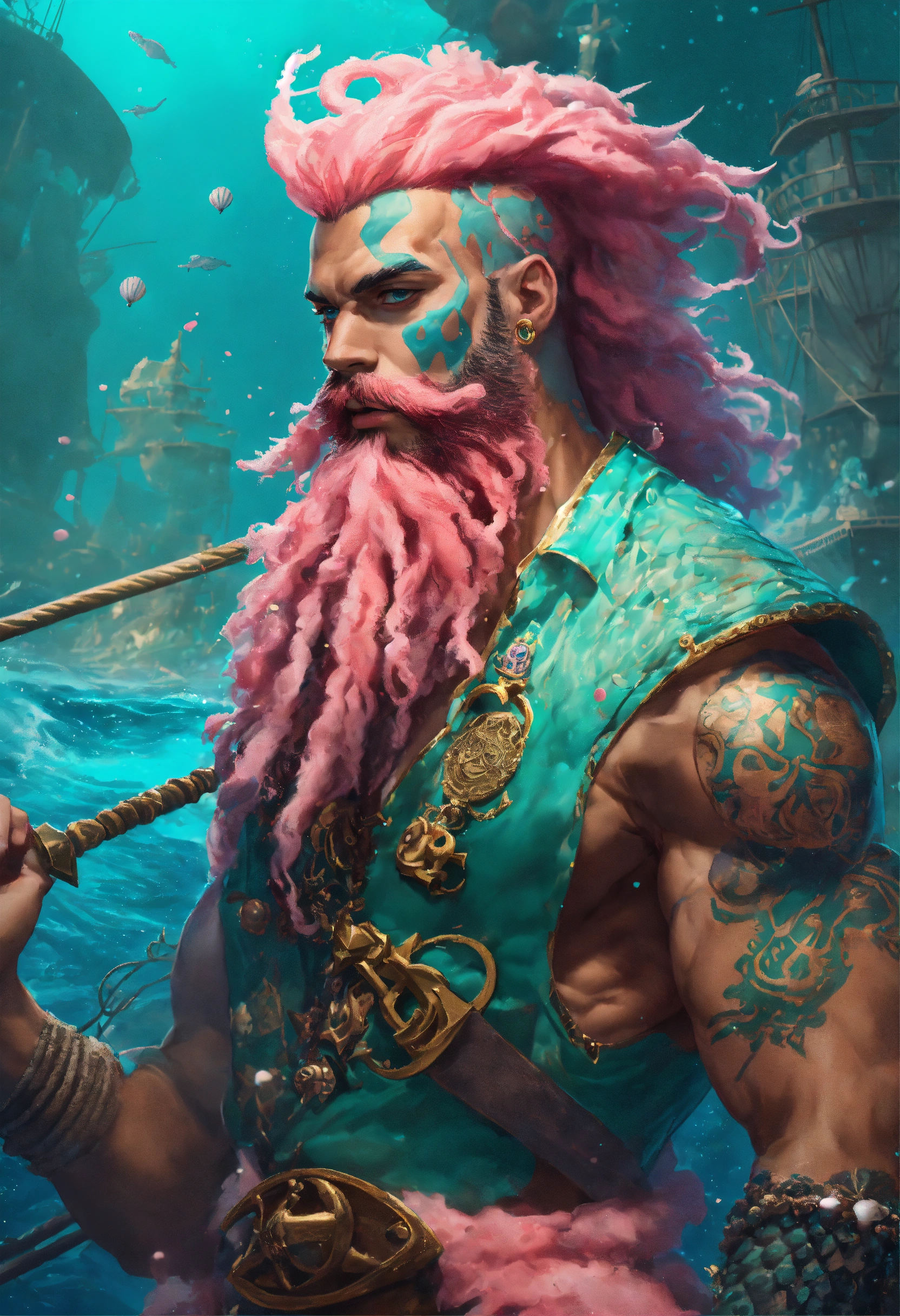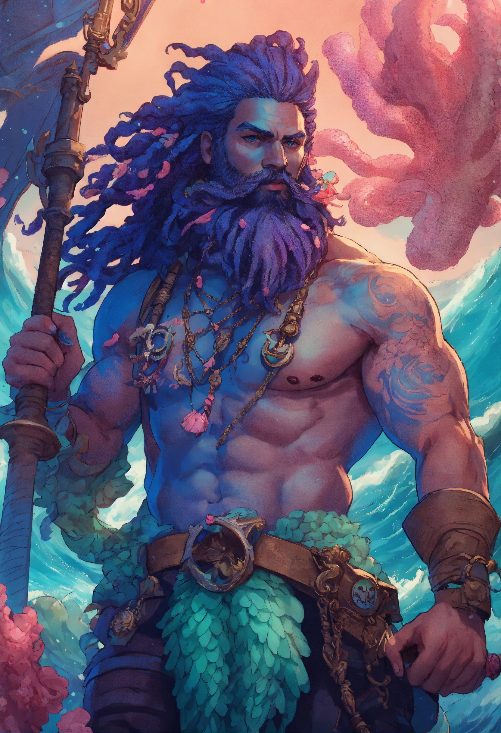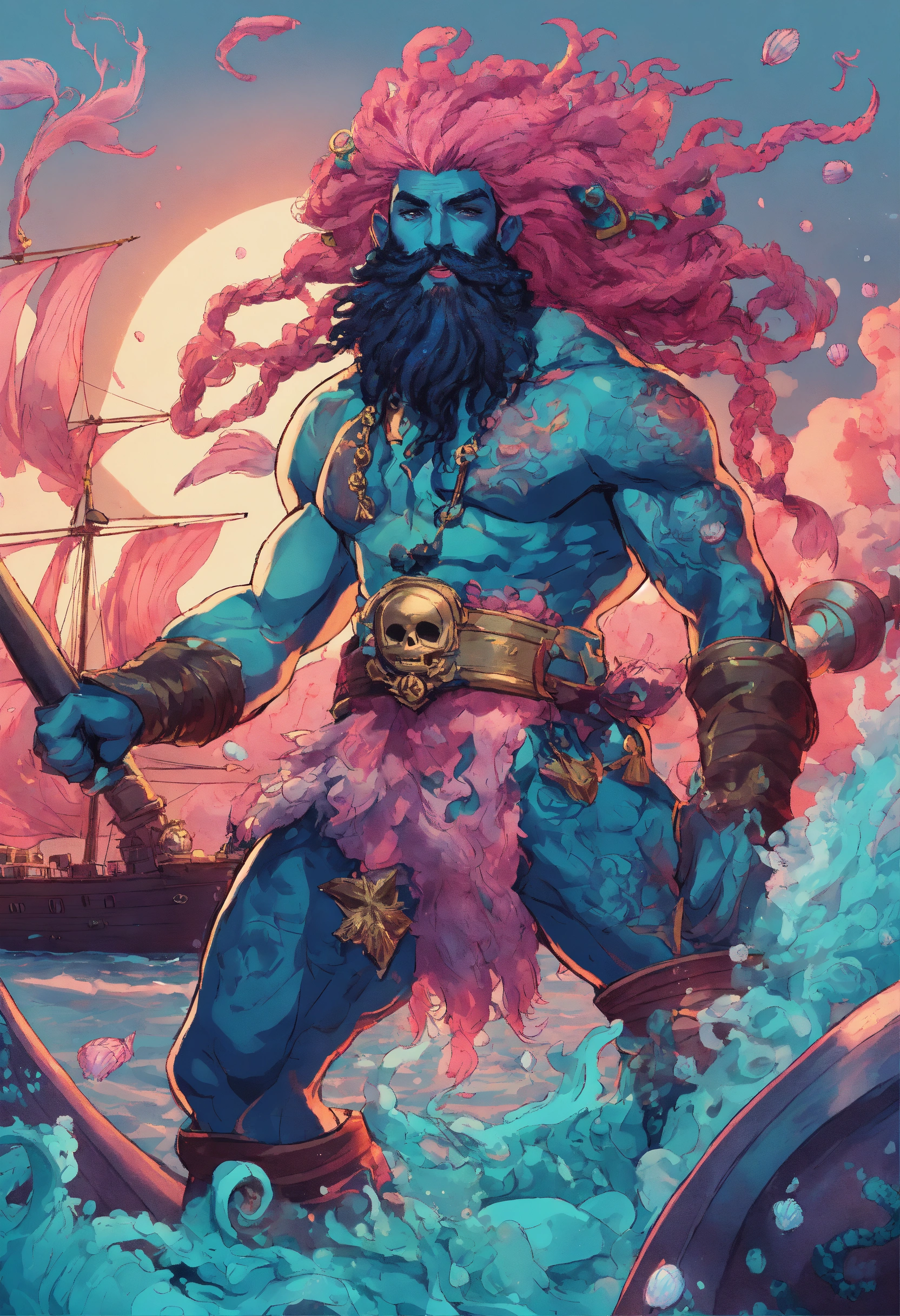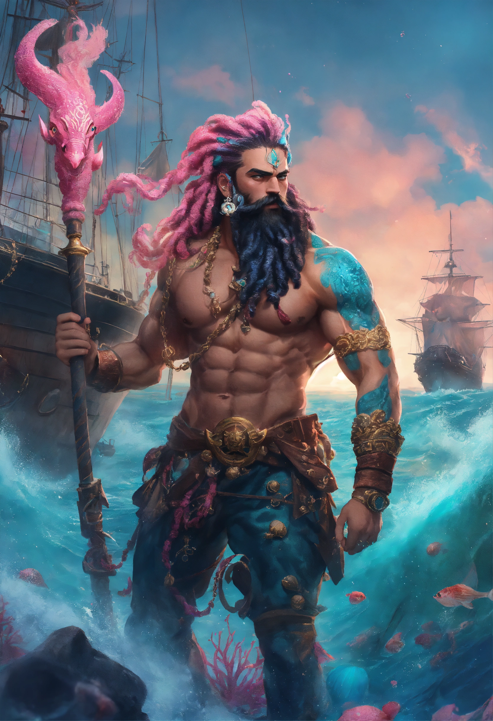 A buff muscular merman pirate captain with scales across his blue skin with pink coral splotches, long seafoam colored dreadlocks with shells in them matching his full beard, he has ornate rings on his hands and is wielding a crackling trident, infectious mirth bubbling from his lips, at the helm of a ship